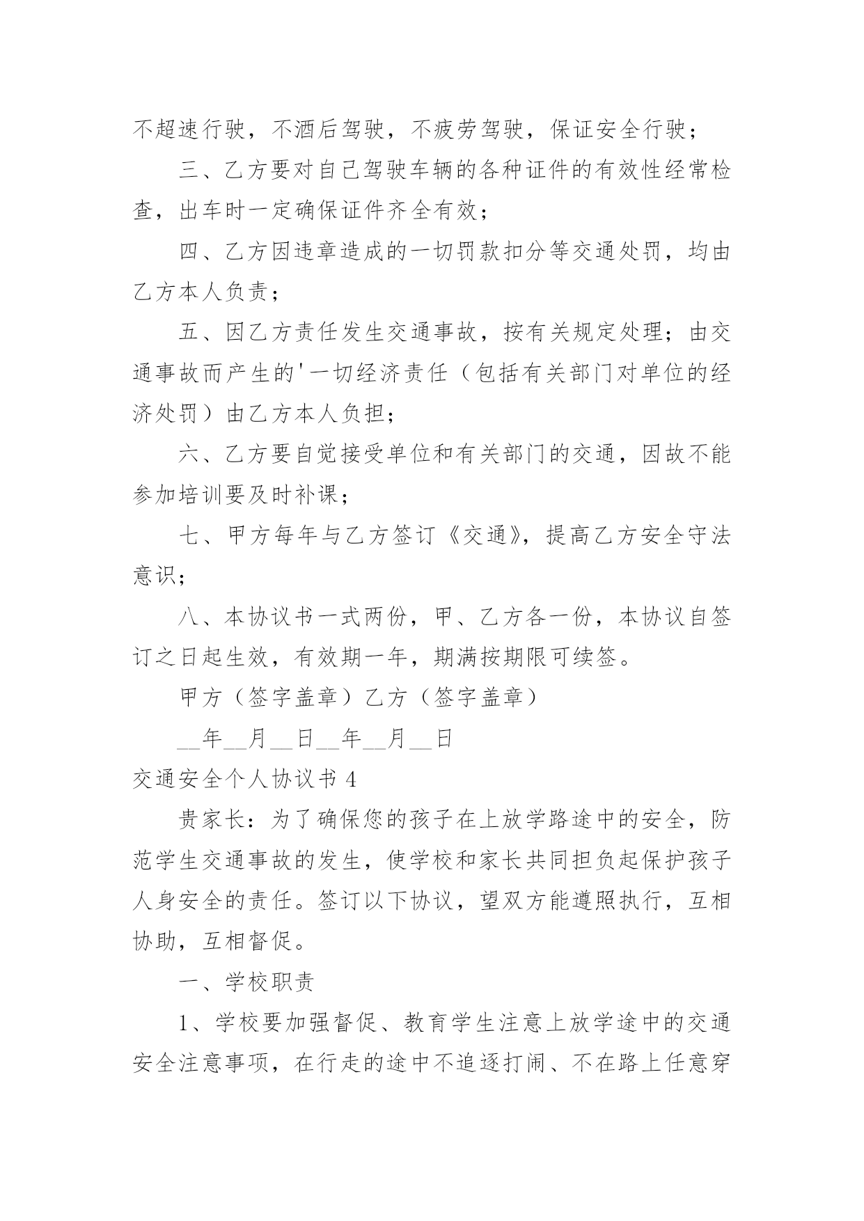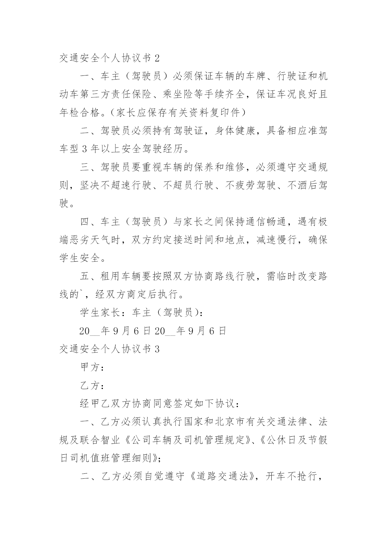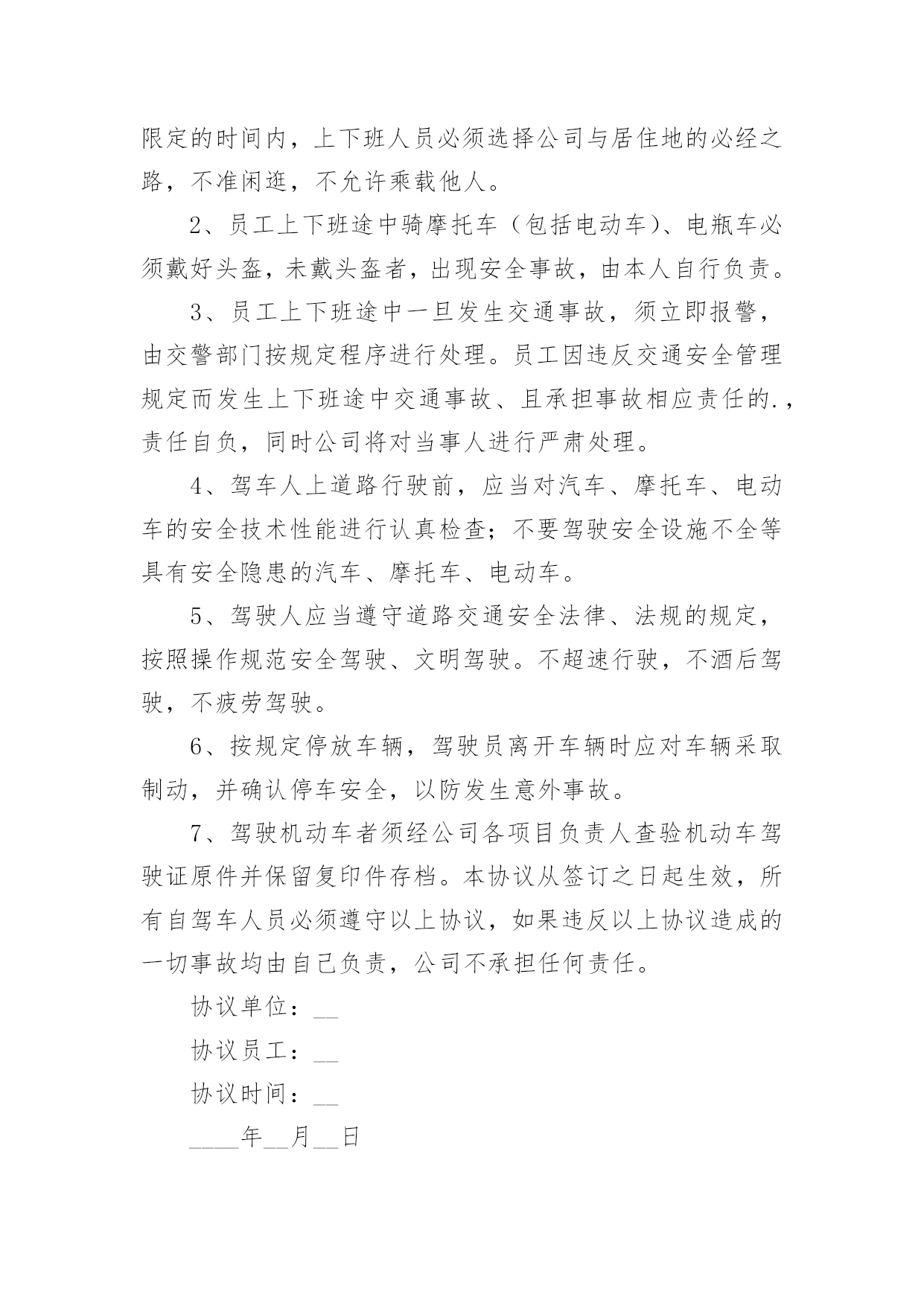 交通安全个人协议书交通安全个人协议书在我们平凡的日常里,我们都跟协议有着直接或间接的联系,签订协议后则有法可依,有据可寻。到底应如何拟定协议呢?以下是小编为大家整理的交通安全个人协议书,希望对大家有所帮助。交通安全个人协议书1为了加强公司对上下班员工交通安全管理,预防和减少不安全事故的发生。按照公司要求公司员工必须签订《员工上下班交通安全协议》,协议内容如下:一、必须遵守公司的《员工上下班交通安全管理规定》,自觉学习《道路交通安全法》、《道路交通安全法实施条例》等法律、法规,提高交通安全意识和安全技能知识,并有接受单位组织安全培训的义务。二、驾驶机动车上下班的,应当依法取得机动车驾驶证,凡自驾车人员必须严格遵守《道路交通安全管理法》的相关规定和要求。三、工作期间不准私自驾车外出吃饭、干私活等,有重要事情需外出的,必须有当值领导的审批。员工上班时间因擅自离岗,发生意外事故的,责任自负。四、《公司员工上下班交通安全管理规定》规定如下:1、员工在上下班途中必须自觉严格遵守交通法规。在限定的时间内,上下班人员必须选择公司与居住地的必经之路,不准闲逛,不允许乘载他人。2、员工上下班途中骑摩托车(包括电动车)、电瓶车必须戴好头盔,未戴头盔者,出现安全事故,由本人自行负责。3、员工上下班途中一旦发生交通事故,须立即报警,由交警部门按规定程序进行处理。员工因违反交通安全管理规定而发生上下班途中交通事故、且承担事故相应责任的.,责任自负,同时公司将对当事人进行严肃处理。4、驾车人上道路行驶前,应当对汽车、摩托车、电动车的安全技术性能进行认真检查;不要驾驶安全设施不全等具有安全隐患的汽车、摩托车、电动车。5、驾驶人应当遵守道路交通安全法律、法规的规定,按照操作规范安全驾驶、文明驾驶。不超速行驶,不酒后驾驶,不疲劳驾驶。6、按规定停放车辆,驾驶员离开车辆时应对车辆采取制动,并确认停车安全,以防发生意外事故。7、驾驶机动车者须经公司各项目负责人查验机动车驾驶证原件并保留复印件存档。本协议从签订之日起生效,所有自驾车人员必须遵守以上协议,如果违反以上协议造成的一切事故均由自己负责,公司不承担任何责任。协议单位:__协议员工:__协议时间:______年__月__日交通安全个人协议书2一、车主(驾驶员)必须保证车辆的车牌、行驶证和机动车第三方责任保险、乘坐险等手续齐全,保证车况良好且年检合格。(家长应保存有关资料复印件)二、驾驶员必须持有驾驶证,身体健康,具备相应准驾车型3年以上安全驾驶经历。三、驾驶员要重视车辆的保养和维修,必须遵守交通规则,坚决不超速行驶、不超员行驶、不疲劳驾驶、不酒后驾驶。四、车主(驾驶员)与家长之间保持通信畅通,遇有极端恶劣天气时,双方约定接送时间和地点,减速慢行,确保学生安全。五、租用车辆要按照双方协商路线行驶,需临时改变路线的`,经双方商定后执行。学生家长:车主(驾驶员):20__年9月6日20__年9月6日交通安全个人协议书3甲方:乙方:经甲乙双方协商同意签定如下协议:一、乙方必须认真执行国家和北京市有关交通法律、法规及联合智业《公司车辆及司机管理规定》、《公休日及节假日司机值班管理细则》;二、乙方必须自觉遵守《道路交通法》,开车不抢行,不超速行驶,不酒后驾驶,不疲劳驾驶,保证安全行驶;三、乙方要对自己驾驶车辆的各种证件的有效性经常检查,出车时一定确保证件齐全有效;四、乙方因违章造成的一切罚款扣分等交通处罚,均由乙方本人负责;五、因乙方责任发生交通事故,按有关规定处理;由交通事故而产生的'一切经济责任(包括有关部门对单位的经济处罚)由乙方本人负担;六、乙方要自觉接受单位和有关部门的交通,因故不能参加培训要及时补课;七、甲方每年与乙方签订《交通》,提高乙方安全守法意识;八、本协议书一式两份,甲、乙方各一份,本协议自签订之日起生效,有效期一年,期满按期限可续签。甲方(签字盖章)乙方(签字盖章)__年__月__日__年__月__日交通安全个人协议书4贵家长:为了确保您的孩子在上放学路途中的安全,防范学生交通事故的发生,使学校和家长共同担负起保护孩子人身安全的责任。签订以下协议,望双方能遵照执行,互相协助,互相督促。一、学校职责1、学校要加强督促、教育学生注意上放学途中的交通安全注意事项,在行走的途中不追逐打闹、不在路上任意穿梭,不戏水,不逗留玩耍,严格遵守交通规则。2、学校要加强管理,本校不提供车辆接送学生上放学,也不提倡、不允许学生骑车或搭乘车辆到校或回家,在路上不与陌生人或不相干的人搭话,以确保学生在行走途中的安全。二、家长职责(一)交通安全1、对于12周岁以下的学生需要家长亲自接送。2、对于距学校较远、家长又不便每天接送的学生,家长可安排学生乘坐经交管部门检查证照齐全、车况良好、符合营运要求的车辆。(二)安全教育1、请教