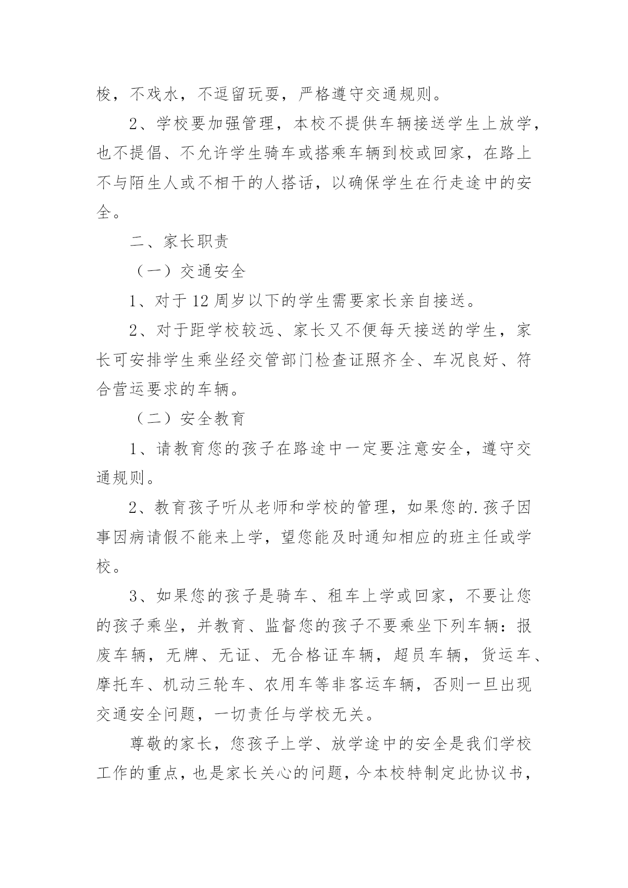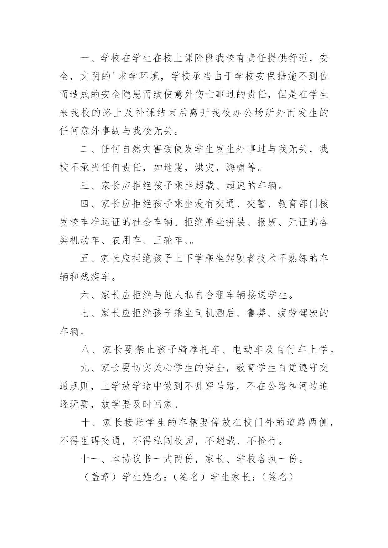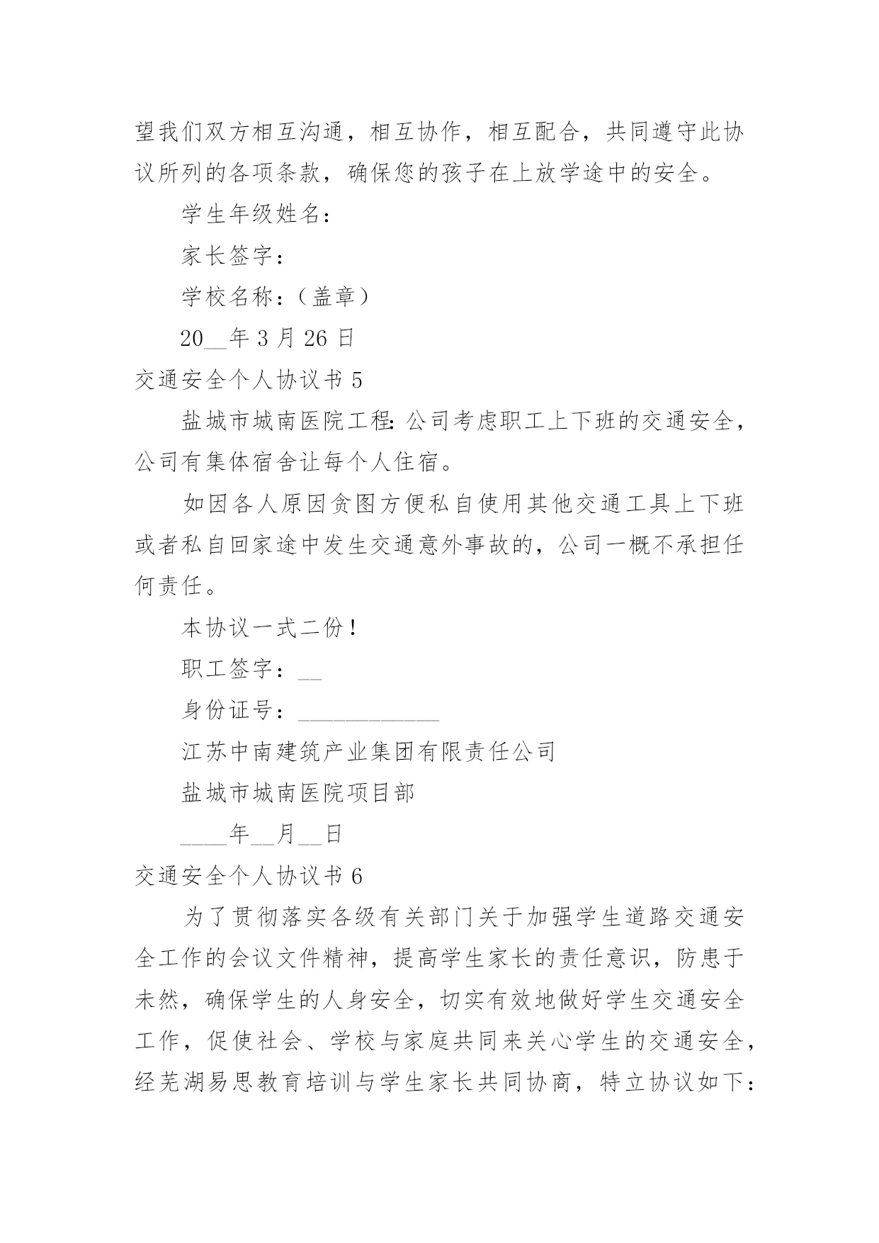 交通安全个人协议书交通安全个人协议书在我们平凡的日常里,我们都跟协议有着直接或间接的联系,签订协议后则有法可依,有据可寻。到底应如何拟定协议呢?以下是小编为大家整理的交通安全个人协议书,希望对大家有所帮助。交通安全个人协议书1为了加强公司对上下班员工交通安全管理,预防和减少不安全事故的发生。按照公司要求公司员工必须签订《员工上下班交通安全协议》,协议内容如下:一、必须遵守公司的《员工上下班交通安全管理规定》,自觉学习《道路交通安全法》、《道路交通安全法实施条例》等法律、法规,提高交通安全意识和安全技能知识,并有接受单位组织安全培训的义务。二、驾驶机动车上下班的,应当依法取得机动车驾驶证,凡自驾车人员必须严格遵守《道路交通安全管理法》的相关规定和要求。三、工作期间不准私自驾车外出吃饭、干私活等,有重要事情需外出的,必须有当值领导的审批。员工上班时间因擅自离岗,发生意外事故的,责任自负。四、《公司员工上下班交通安全管理规定》规定如下:1、员工在上下班途中必须自觉严格遵守交通法规。在限定的时间内,上下班人员必须选择公司与居住地的必经之路,不准闲逛,不允许乘载他人。2、员工上下班途中骑摩托车(包括电动车)、电瓶车必须戴好头盔,未戴头盔者,出现安全事故,由本人自行负责。3、员工上下班途中一旦发生交通事故,须立即报警,由交警部门按规定程序进行处理。员工因违反交通安全管理规定而发生上下班途中交通事故、且承担事故相应责任的.,责任自负,同时公司将对当事人进行严肃处理。4、驾车人上道路行驶前,应当对汽车、摩托车、电动车的安全技术性能进行认真检查;不要驾驶安全设施不全等具有安全隐患的汽车、摩托车、电动车。5、驾驶人应当遵守道路交通安全法律、法规的规定,按照操作规范安全驾驶、文明驾驶。不超速行驶,不酒后驾驶,不疲劳驾驶。6、按规定停放车辆,驾驶员离开车辆时应对车辆采取制动,并确认停车安全,以防发生意外事故。7、驾驶机动车者须经公司各项目负责人查验机动车驾驶证原件并保留复印件存档。本协议从签订之日起生效,所有自驾车人员必须遵守以上协议,如果违反以上协议造成的一切事故均由自己负责,公司不承担任何责任。协议单位:__协议员工:__协议时间:______年__月__日交通安全个人协议书2一、车主(驾驶员)必须保证车辆的车牌、行驶证和机动车第三方责任保险、乘坐险等手续齐全,保证车况良好且年检合格。(家长应保存有关资料复印件)二、驾驶员必须持有驾驶证,身体健康,具备相应准驾车型3年以上安全驾驶经历。三、驾驶员要重视车辆的保养和维修,必须遵守交通规则,坚决不超速行驶、不超员行驶、不疲劳驾驶、不酒后驾驶。四、车主(驾驶员)与家长之间保持通信畅通,遇有极端恶劣天气时,双方约定接送时间和地点,减速慢行,确保学生安全。五、租用车辆要按照双方协商路线行驶,需临时改变路线的`,经双方商定后执行。学生家长:车主(驾驶员):20__年9月6日20__年9月6日交通安全个人协议书3甲方:乙方:经甲乙双方协商同意签定如下协议:一、乙方必须认真执行国家和北京市有关交通法律、法规及联合智业《公司车辆及司机管理规定》、《公休日及节假日司机值班管理细则》;二、乙方必须自觉遵守《道路交通法》,开车不抢行,不超速行驶,不酒后驾驶,不疲劳驾驶,保证安全行驶;三、乙方要对自己驾驶车辆的各种证件的有效性经常检查,出车时一定确保证件齐全有效;四、乙方因违章造成的一切罚款扣分等交通处罚,均由乙方本人负责;五、因乙方责任发生交通事故,按有关规定处理;由交通事故而产生的'一切经济责任(包括有关部门对单位的经济处罚)由乙方本人负担;六、乙方要自觉接受单位和有关部门的交通,因故不能参加培训要及时补课;七、甲方每年与乙方签订《交通》,提高乙方安全守法意识;八、本协议书一式两份,甲、乙方各一份,本协议自签订之日起生效,有效期一年,期满按期限可续签。甲方(签字盖章)乙方(签字盖章)__年__月__日__年__月__日交通安全个人协议书4贵家长:为了确保您的孩子在上放学路途中的安全,防范学生交通事故的发生,使学校和家长共同担负起保护孩子人身安全的责任。签订以下协议,望双方能遵照执行,互相协助,互相督促。一、学校职责1、学校要加强督促、教育学生注意上放学途中的交通安全注意事项,在行走的途中不追逐打闹、不在路上任意穿梭,不戏水,不逗留玩耍,严格遵守交通规则。2、学校要加强管理,本校不提供车辆接送学生上放学,也不提倡、不允许学生骑车或搭乘车辆到校或回家,在路上不与陌生人或不相干的人搭话,以确保学生在行走途中的安全。二、家长职责(一)交通安全1、对于12周岁以下的学生需要家长亲自接送。2、对于距学校较远、家长又不便每天接送的学生,家长可安排学生乘坐经交管部门检查证照齐全、车况良好、符合营运要求的车辆。(二)安全教育1、请教