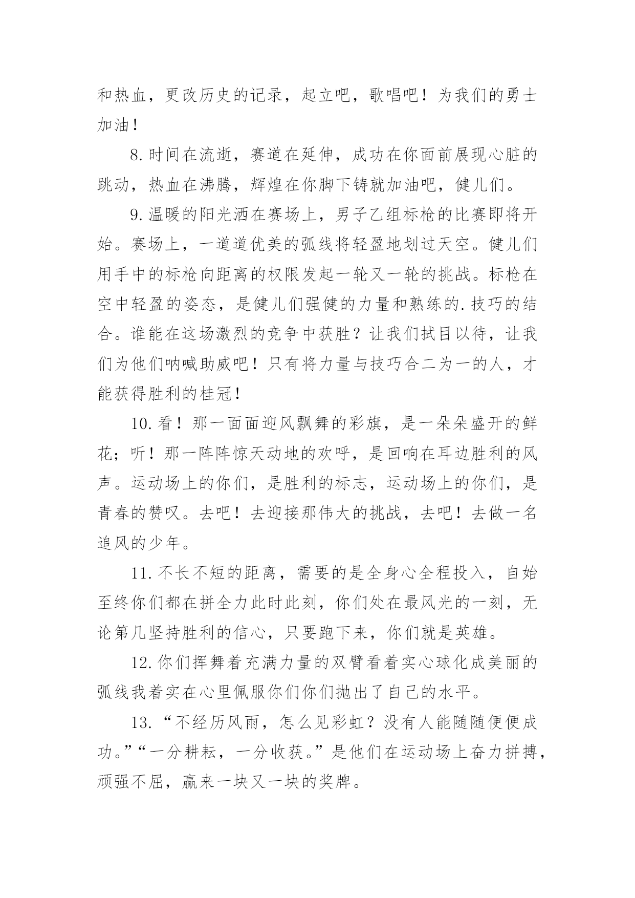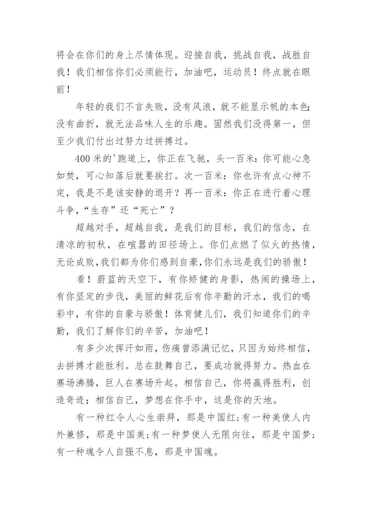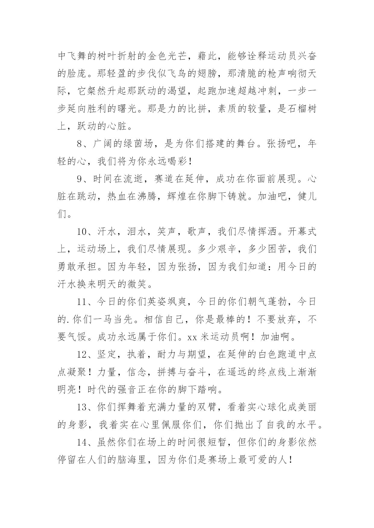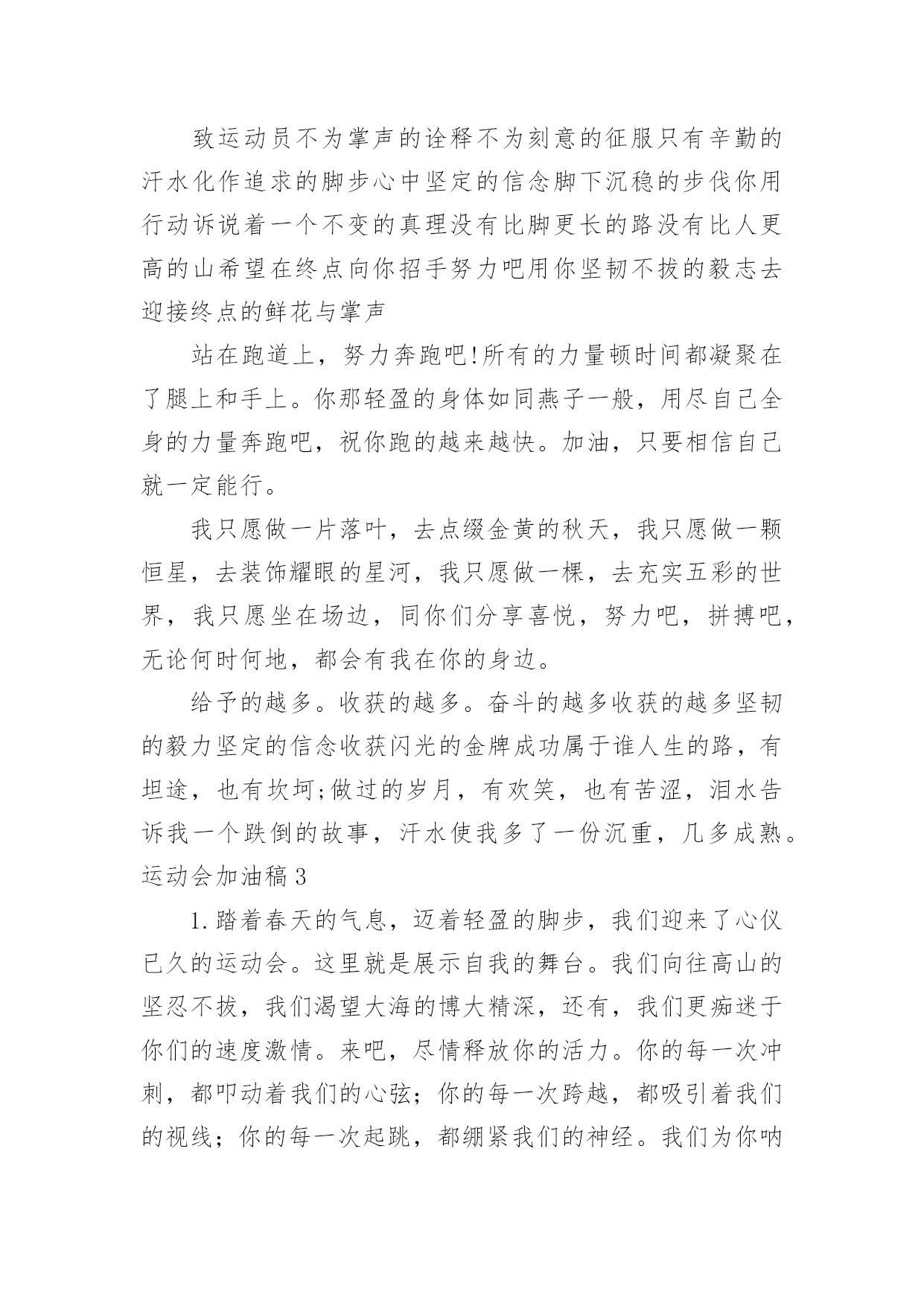 运动会加油稿运动会加油稿15篇【精选】在日新月异的现代社会中,我们可以使用加油稿的机会越来越多,借助加油稿可以激起人的希望,催人奋进。相信很多朋友都对写加油稿感到非常苦恼吧,以下是小编为大家整理的运动会加油稿,希望对大家有所帮助。运动会加油稿11、阳光不会永远灿烂,没有一成不变的幸福,磨难或许是上苍赐予我们的礼物,用来考验我们的意志,如果是这样,就让我们微笑着应对生活。2、相信你会送给我们一个汗水浸湿的微笑!3、人生的路,有坦途,也有坎坷;走过的岁月,有欢笑,也有苦涩,泪水告诉我一个跌倒的故事,汗水使我多了一份沉重,几多成熟。4、顽强拼搏,超越自我,不鸣则已,一鸣惊人5、今日的你们英姿飒爽,今日的你们一马当先。不要放下,不要气馁。相信自己,你是最棒的!6、时值秋暮冬初,虽然已过了金秋十月,然而初冬依然暖阳高照,校运动会在这样风和日丽的天气里如期举行了。7、是体育场上游走的火焰,是来去不息的脚步,是风中飞舞的树叶折射的金色光芒,藉此,能够诠释运动员兴奋的脸庞。那轻盈的步伐似飞鸟的翅膀,那清脆的枪声响彻天际,它粲然升起那跃动的渴望,起跑加速超越冲刺,一步一步延向胜利的曙光。那是力的比拼,素质的较量,是石榴树上,跃动的心脏。8、广阔的绿茵场,是为你们搭建的舞台。张扬吧,年轻的心,我们将为你永远喝彩!9、时间在流逝,赛道在延伸,成功在你面前展现。心脏在跳动,热血在沸腾,辉煌在你脚下铸就。加油吧,健儿们。10、汗水,泪水,笑声,歌声,我们尽情挥洒。开幕式上,运动场上,我们尽情展现。多少艰辛,多少困苦,我们勇敢承担。因为年轻,因为张扬,因为我们知道:用今日的汗水换来明天的微笑。11、今日的你们英姿飒爽,今日的你们朝气蓬勃,今日的.你们一马当先。相信自己,你是最棒的!不要放弃,不要气馁。成功永远属于你们。xx米运动员啊!加油啊。12、坚定,执着,耐力与期望,在延伸的白色跑道中点点凝聚!力量,信念,拼搏与奋斗,在遥远的终点线上渐渐明亮!时代的强音正在你的脚下踏响。13、你们挥舞着充满力量的双臂,看着实心球化成美丽的身影,我着实在心里佩服你们,你们抛出了自我的水平。14、虽然你们在场上的时间很短暂,但你们的身影依然停留在人们的脑海里,因为你们是赛场上最可爱的人!15、坚定,执着,耐力与期望,在延伸的白色跑道中点点凝聚!力量,信念,拼搏与奋斗,在遥远的终点线上渐渐明亮!时代的强音正在你的脚下踏响!运动会加油稿2迎接你的,是800米跑道;等待你的,是漫漫征途。勇敢的冲吧,勇士们!不要畏惧对手的强大,你的对手只有自己。勇敢的冲吧!800米算不得什么,付出的汗水就要得到回报,胜利的泪水就要顺颊而下,秋风会为你喝彩,阳光会为你庆功,掌声就要为你响起。黎明的曙光,照耀着神州。今天,我们修到了这熟悉的气息,熟悉的运动场记录了多少运动健儿的矫健身影,此刻又将留下多少华丽的瞬间。“声声助威,把运动氛围装点。1500米,1500米磨炼的是非凡的毅力,较量的是超常的体力,拼搏的是出类拔萃的耐力。把长长的跑道跑成一段漫漫的征途,听!呼啸的风在为你喝彩,看!猎猎的彩旗在为你加油,加油吧!为了到达终点时那一刻的辉煌!200m的跑道有你们飒爽的英姿,因为有你们的参与,因而显得更加精彩,你们始终是悍的选手,,我们愿意用三分横笛的悠扬,三分木琴的清亮,以及四分古筝的曼妙,凑足十分的热情来祝福你,预祝你在比赛中取得好成绩。枪声伴你踏上征程,你昂着自信的头,带着必胜的信念,冲去,奔去。那一刻时光仿佛都为你停住,你的勇气振动了一切,震撼了每一个人的心灵。终点。你赢了。青春的脚步,青春的速度,青春的活力,青春的活力,将会在你们的身上尽情体现。迎接自我,挑战自我,战胜自我!我们相信你们必须能行,加油吧,运动员!终点就在眼前!年轻的我们不言失败,没有风浪,就不能显示帆的本色;没有曲折,就无法品味人生的乐趣。固然我们没得第一,但至少我们付出过努力过拼搏过。400米的'跑道上,你正在飞驰,头一百米:你可能心急如焚,可心知落后就要挨打。次一百米:你也许有点心神不定,我是不是该安静的退开?再一百米:你正在进行着心理斗争,“生存”还“死亡”?超越对手,超越自我,是我们的目标,我们的信念,在清凉的初秋,在喧嚣的田径场上。你们点燃了似火的热情,无论成败,我们都为你们感到自豪,你们永远是我们的骄傲!看!蔚蓝的天空下,有你矫健的身影,热闹的操场上,有你坚定的步伐,美丽的鲜花后有你辛勤的汗水,我们的喝彩中,有你的自豪与骄傲!体育健儿们,我们知道你们的辛勤,我们了解你们的辛苦,加油吧!有多少次挥汗如雨,伤痛曾添满记忆,只因为始终相信,去拼搏才能胜利。总在鼓舞自己,要成功就得努力。热血在赛场沸腾,巨人在赛场升起。相信自己,你将赢得胜利,创造奇迹;相信自己,梦想在你手中,这是你的天地。有一种红令人心生崇拜,那是