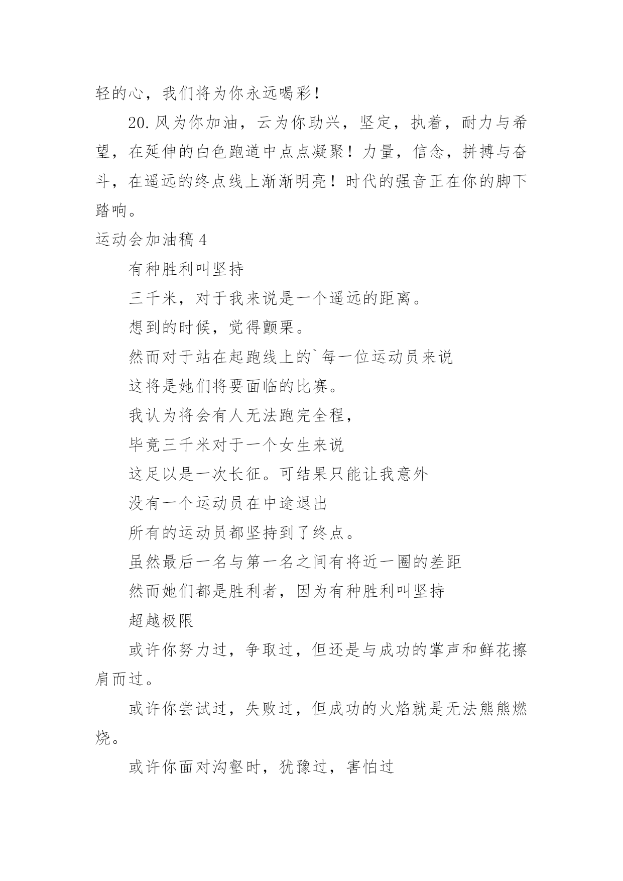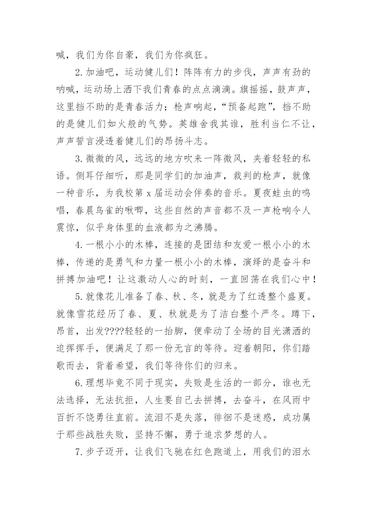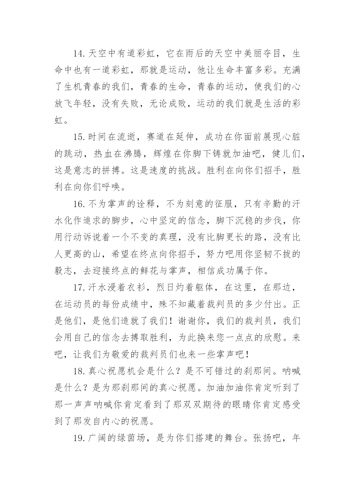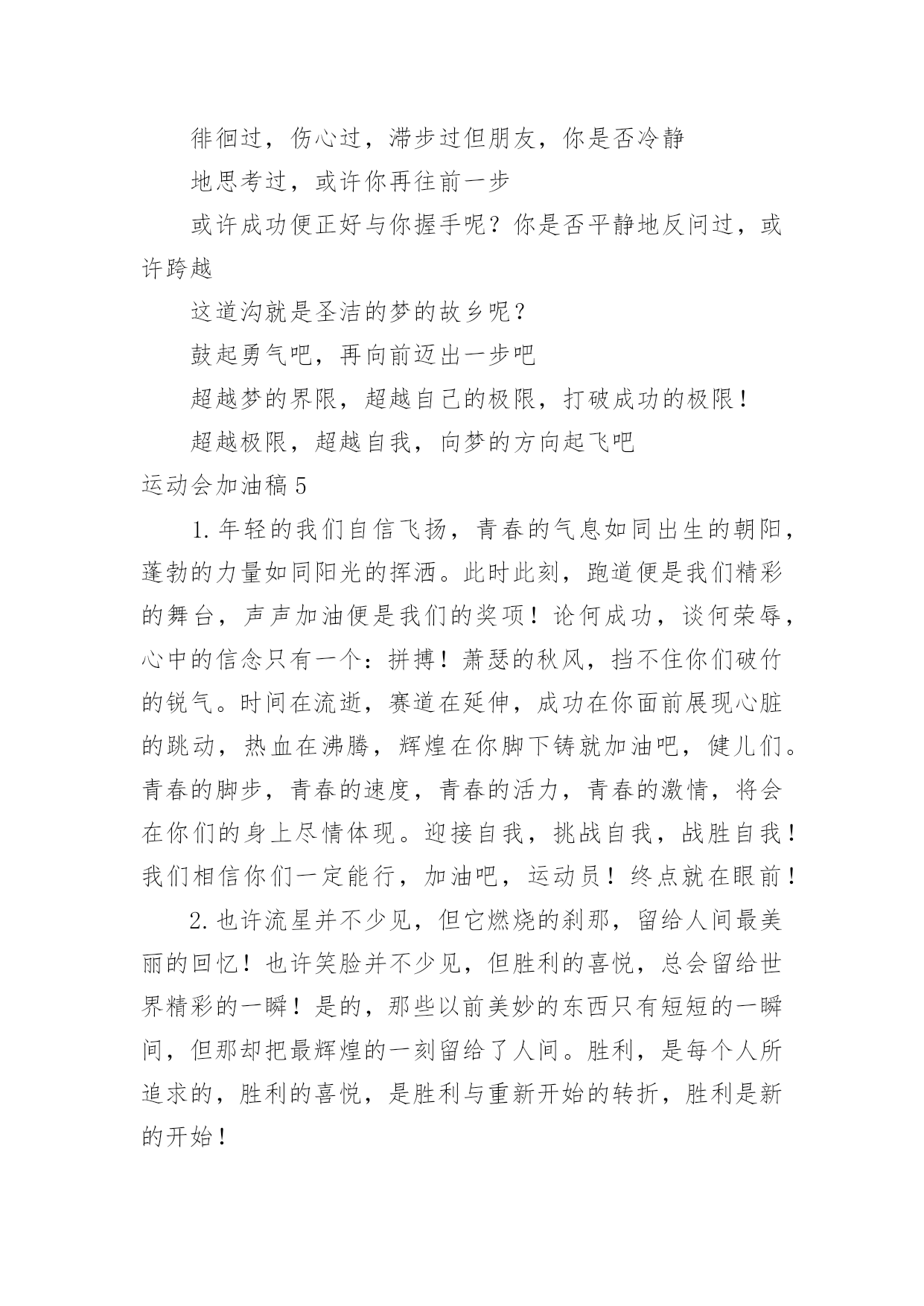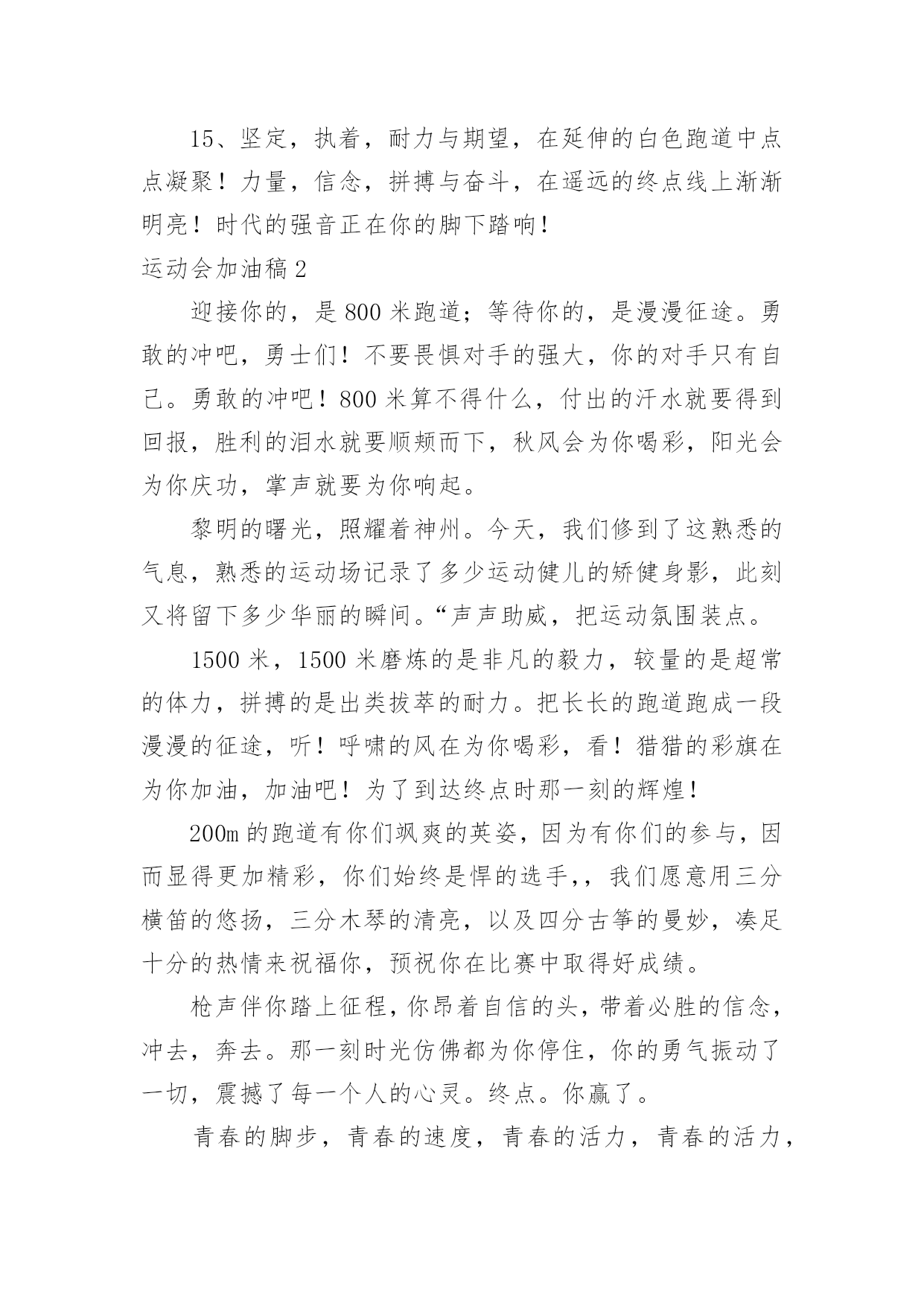运动会加油稿运动会加油稿15篇【精选】在日新月异的现代社会中,我们可以使用加油稿的机会越来越多,借助加油稿可以激起人的希望,催人奋进。相信很多朋友都对写加油稿感到非常苦恼吧,以下是小编为大家整理的运动会加油稿,希望对大家有所帮助。运动会加油稿11、阳光不会永远灿烂,没有一成不变的幸福,磨难或许是上苍赐予我们的礼物,用来考验我们的意志,如果是这样,就让我们微笑着应对生活。2、相信你会送给我们一个汗水浸湿的微笑!3、人生的路,有坦途,也有坎坷;走过的岁月,有欢笑,也有苦涩,泪水告诉我一个跌倒的故事,汗水使我多了一份沉重,几多成熟。4、顽强拼搏,超越自我,不鸣则已,一鸣惊人5、今日的你们英姿飒爽,今日的你们一马当先。不要放下,不要气馁。相信自己,你是最棒的!6、时值秋暮冬初,虽然已过了金秋十月,然而初冬依然暖阳高照,校运动会在这样风和日丽的天气里如期举行了。7、是体育场上游走的火焰,是来去不息的脚步,是风中飞舞的树叶折射的金色光芒,藉此,能够诠释运动员兴奋的脸庞。那轻盈的步伐似飞鸟的翅膀,那清脆的枪声响彻天际,它粲然升起那跃动的渴望,起跑加速超越冲刺,一步一步延向胜利的曙光。那是力的比拼,素质的较量,是石榴树上,跃动的心脏。8、广阔的绿茵场,是为你们搭建的舞台。张扬吧,年轻的心,我们将为你永远喝彩!9、时间在流逝,赛道在延伸,成功在你面前展现。心脏在跳动,热血在沸腾,辉煌在你脚下铸就。加油吧,健儿们。10、汗水,泪水,笑声,歌声,我们尽情挥洒。开幕式上,运动场上,我们尽情展现。多少艰辛,多少困苦,我们勇敢承担。因为年轻,因为张扬,因为我们知道:用今日的汗水换来明天的微笑。11、今日的你们英姿飒爽,今日的你们朝气蓬勃,今日的.你们一马当先。相信自己,你是最棒的!不要放弃,不要气馁。成功永远属于你们。xx米运动员啊!加油啊。12、坚定,执着,耐力与期望,在延伸的白色跑道中点点凝聚!力量,信念,拼搏与奋斗,在遥远的终点线上渐渐明亮!时代的强音正在你的脚下踏响。13、你们挥舞着充满力量的双臂,看着实心球化成美丽的身影,我着实在心里佩服你们,你们抛出了自我的水平。14、虽然你们在场上的时间很短暂,但你们的身影依然停留在人们的脑海里,因为你们是赛场上最可爱的人!15、坚定,执着,耐力与期望,在延伸的白色跑道中点点凝聚!力量,信念,拼搏与奋斗,在遥远的终点线上渐渐明亮!时代的强音正在你的脚下踏响!运动会加油稿2迎接你的,是800米跑道;等待你的,是漫漫征途。勇敢的冲吧,勇士们!不要畏惧对手的强大,你的对手只有自己。勇敢的冲吧!800米算不得什么,付出的汗水就要得到回报,胜利的泪水就要顺颊而下,秋风会为你喝彩,阳光会为你庆功,掌声就要为你响起。黎明的曙光,照耀着神州。今天,我们修到了这熟悉的气息,熟悉的运动场记录了多少运动健儿的矫健身影,此刻又将留下多少华丽的瞬间。“声声助威,把运动氛围装点。1500米,1500米磨炼的是非凡的毅力,较量的是超常的体力,拼搏的是出类拔萃的耐力。把长长的跑道跑成一段漫漫的征途,听!呼啸的风在为你喝彩,看!猎猎的彩旗在为你加油,加油吧!为了到达终点时那一刻的辉煌!200m的跑道有你们飒爽的英姿,因为有你们的参与,因而显得更加精彩,你们始终是悍的选手,,我们愿意用三分横笛的悠扬,三分木琴的清亮,以及四分古筝的曼妙,凑足十分的热情来祝福你,预祝你在比赛中取得好成绩。枪声伴你踏上征程,你昂着自信的头,带着必胜的信念,冲去,奔去。那一刻时光仿佛都为你停住,你的勇气振动了一切,震撼了每一个人的心灵。终点。你赢了。青春的脚步,青春的速度,青春的活力,青春的活力,将会在你们的身上尽情体现。迎接自我,挑战自我,战胜自我!我们相信你们必须能行,加油吧,运动员!终点就在眼前!年轻的我们不言失败,没有风浪,就不能显示帆的本色;没有曲折,就无法品味人生的乐趣。固然我们没得第一,但至少我们付出过努力过拼搏过。400米的'跑道上,你正在飞驰,头一百米:你可能心急如焚,可心知落后就要挨打。次一百米:你也许有点心神不定,我是不是该安静的退开?再一百米:你正在进行着心理斗争,“生存”还“死亡”?超越对手,超越自我,是我们的目标,我们的信念,在清凉的初秋,在喧嚣的田径场上。你们点燃了似火的热情,无论成败,我们都为你们感到自豪,你们永远是我们的骄傲!看!蔚蓝的天空下,有你矫健的身影,热闹的操场上,有你坚定的步伐,美丽的鲜花后有你辛勤的汗水,我们的喝彩中,有你的自豪与骄傲!体育健儿们,我们知道你们的辛勤,我们了解你们的辛苦,加油吧!有多少次挥汗如雨,伤痛曾添满记忆,只因为始终相信,去拼搏才能胜利。总在鼓舞自己,要成功就得努力。热血在赛场沸腾,巨人在赛场升起。相信自己,你将赢得胜利,创造奇迹;相信自己,梦想在你手中,这是你的天地。有一种红令人心生崇拜,那是