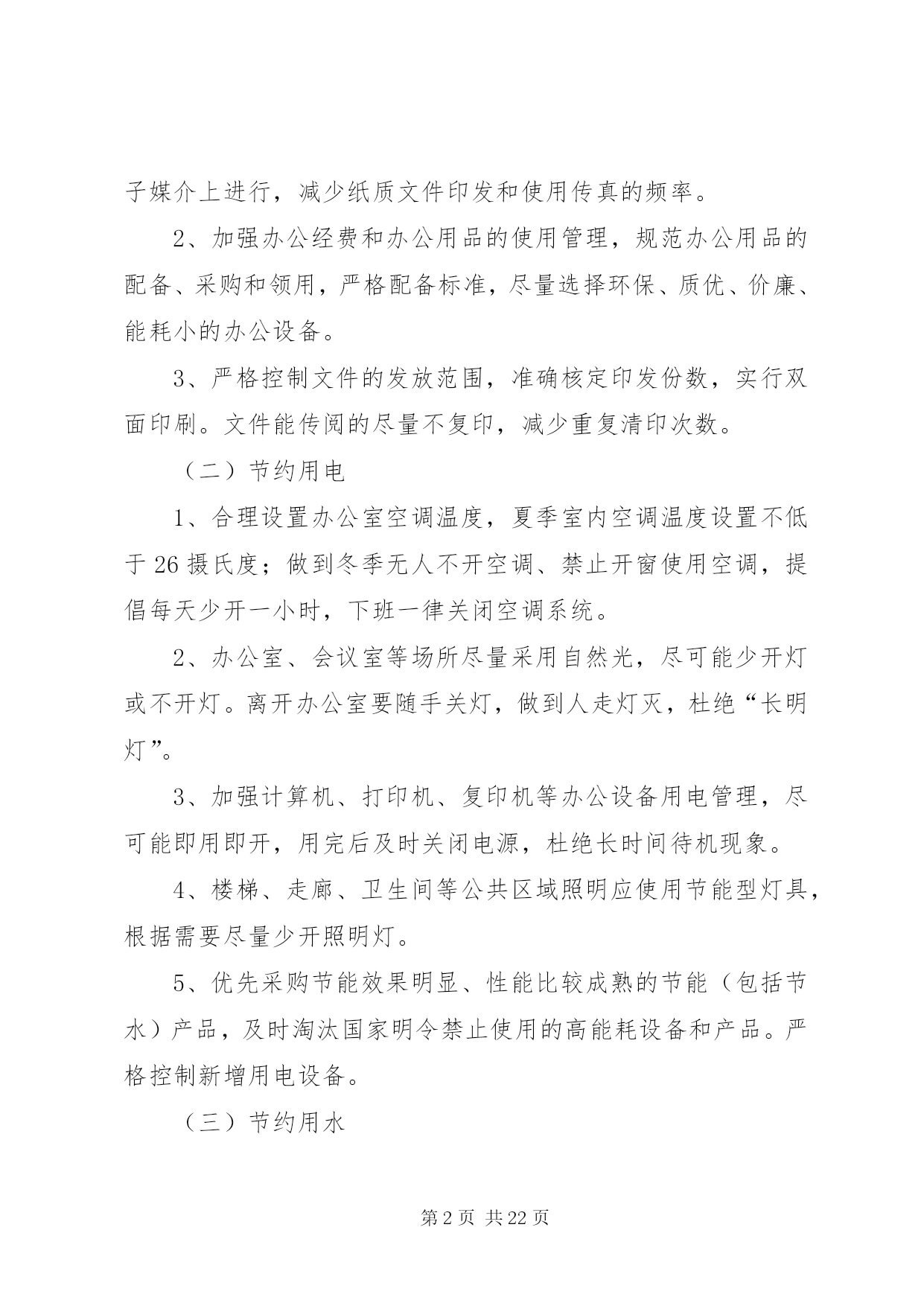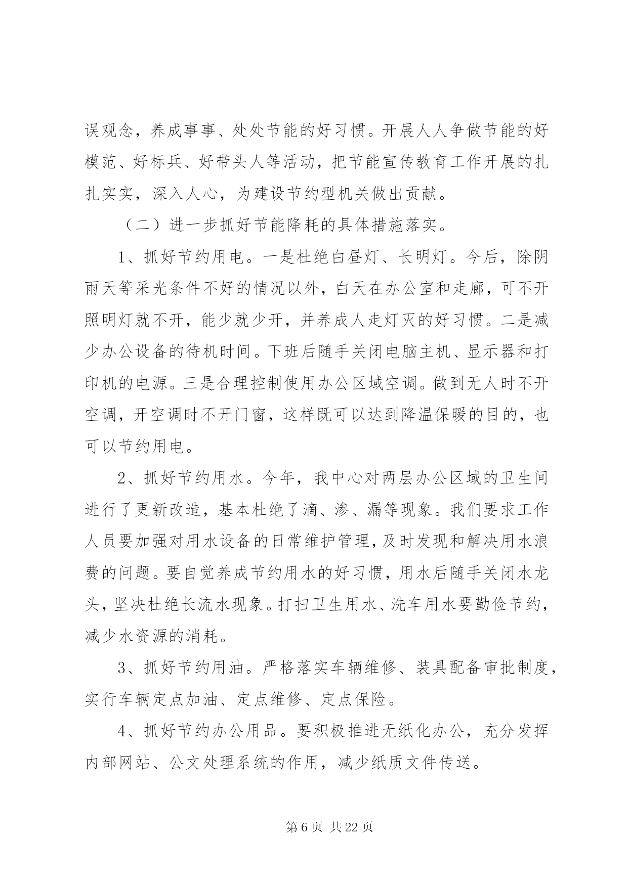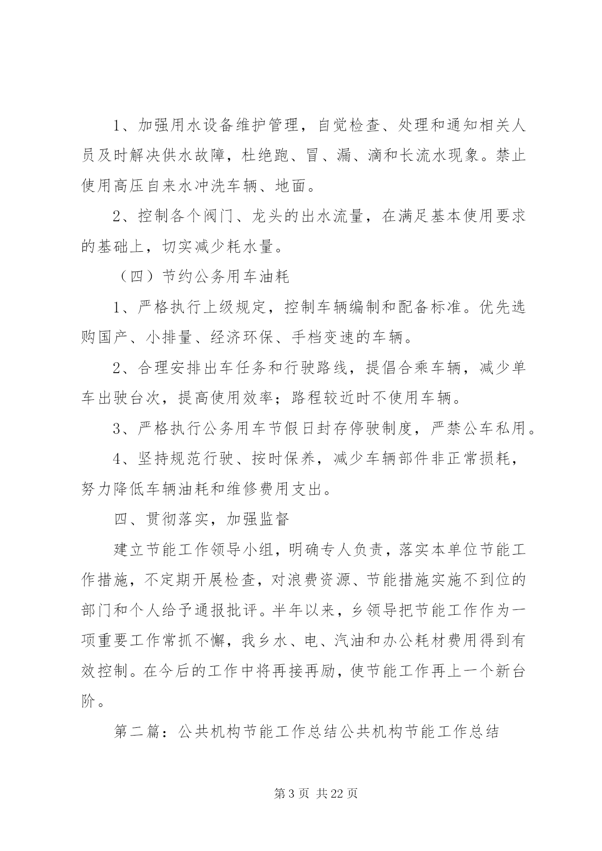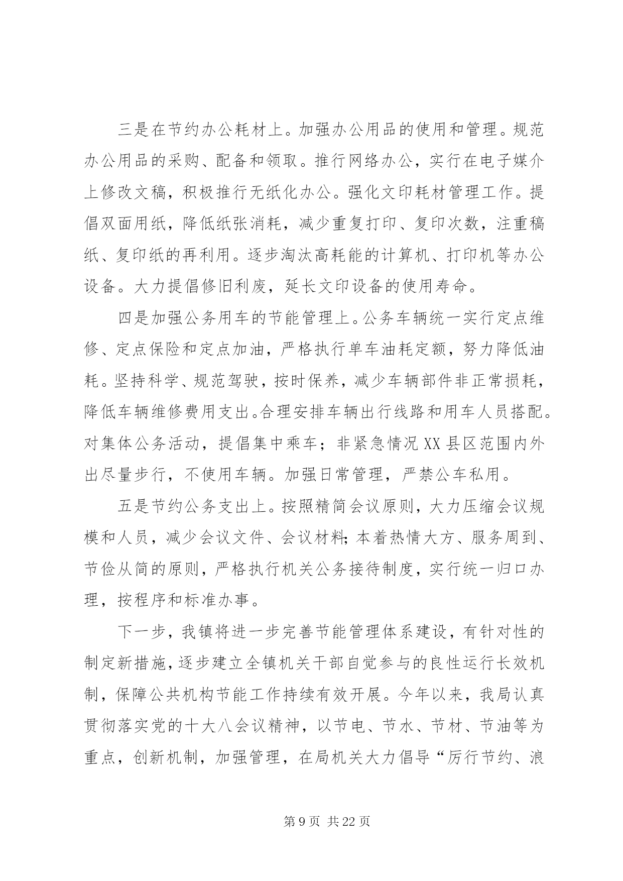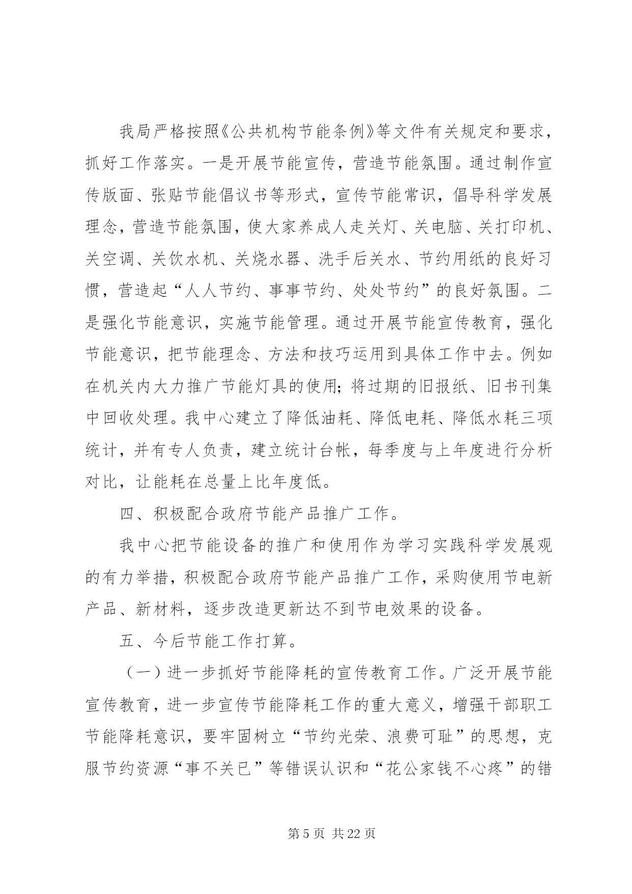 第PAGE\*Arabic\*MERGEFORMAT22页共NUMPAGES\*MERGEFORMAT22页公共机构节能工作半年总结为推进公共机构节能工作的发展,提高能源利用效率和经济效益,我乡为建设资源节约型,环境友好型和谐社会而积极参与。2012年以来,紧紧围绕“节能减排,科学发展”这一主题,采取多种形式,在全体机关干部中开展“践行科学发展观,推进节能降耗”,广泛宣传,营造节能减排工作的良好氛围,现将半年工作总结如下一、提高认识,加强宣传节约资源,保护环境是我国的基本国策。做好节能减排工作,是贯彻落实科学发展观、构建社会主义和谐社会的重大措施,是建设资源节约型、环境友好型社会的必然选择。我乡每月召开一次节能工作会议,组织全体机关工作人员认真学习文件,充分认识到做好减排工作的重要性和紧迫性,切实增强责任感和使命感,把节能减排工作作为重要工作任务来抓。二、成立机构,加强领导成立了节能减排工作领导小组,由乡长xx任组长,办公室主任xx为节能联络员,各部门负责同志任领导小组成员,负责做好本单位资源节约各项工作的指导、协调、督查和考核。三、强化管理,节能降耗(一)节约办公经费1、充分利用网上办公系统,文件起草、修改发放尽量在电子媒介上进行,减少纸质文件印发和使用传真的频率。2、加强办公经费和办公用品的使用管理,规范办公用品的配备、采购和领用,严格配备标准,尽量选择环保、质优、价廉、能耗小的办公设备。3、严格控制文件的发放范围,准确核定印发份数,实行双面印刷。文件能传阅的尽量不复印,减少重复清印次数。(二)节约用电1、合理设置办公室空调温度,夏季室内空调温度设置不低于26摄氏度;做到冬季无人不开空调、禁止开窗使用空调,提倡每天少开一小时,下班一律关闭空调系统。2、办公室、会议室等场所尽量采用自然光,尽可能少开灯或不开灯。离开办公室要随手关灯,做到人走灯灭,杜绝“长明灯”。3、加强计算机、打印机、复印机等办公设备用电管理,尽可能即用即开,用完后及时关闭电源,杜绝长时间待机现象。4、楼梯、走廊、卫生间等公共区域照明应使用节能型灯具,根据需要尽量少开照明灯。5、优先采购节能效果明显、性能比较成熟的节能(包括节水)产品,及时淘汰国家明令禁止使用的高能耗设备和产品。严格控制新增用电设备。(三)节约用水1、加强用水设备维护管理,自觉检查、处理和通知相关人员及时解决供水故障,杜绝跑、冒、漏、滴和长流水现象。禁止使用高压自来水冲洗车辆、地面。2、控制各个阀门、龙头的出水流量,在满足基本使用要求的基础上,切实减少耗水量。(四)节约公务用车油耗1、严格执行上级规定,控制车辆编制和配备标准。优先选购国产、小排量、经济环保、手档变速的车辆。2、合理安排出车任务和行驶路线,提倡合乘车辆,减少单车出驶台次,提高使用效率;路程较近时不使用车辆。3、严格执行公务用车节假日封存停驶制度,严禁公车私用。4、坚持规范行驶、按时保养,减少车辆部件非正常损耗,努力降低车辆油耗和维修费用支出。四、贯彻落实,加强监督建立节能工作领导小组,明确专人负责,落实本单位节能工作措施,不定期开展检查,对浪费资源、节能措施实施不到位的部门和个人给予通报批评。半年以来,乡领导把节能工作作为一项重要工作常抓不懈,我乡水、电、汽油和办公耗材费用得到有效控制。在今后的工作中将再接再励,使节能工作再上一个新台阶。第二篇:公共机构节能工作总结公共机构节能工作总结我中心认真贯彻落实国务院《公共机构节能条例》等法律法规和文件要求,进一步加强节能工作,使节能工作取得了初步成效。现将我中心今年节能降耗工作总结如下:一、领导重视,认识统一,带头做好节能工作。中心领导高度重视节能工作,思想认识统一,带头贯彻《公共机构节能条例》和《厉行节约八项要求》。召开节能专题会议,制定计划,研究部署机关节能工作,会议要求:我中心公共机构节能工作要从领导做起,要从现在做起,要从自身做起,要做到在能源上实行节约减少浪费。要做好节电、节水工作。严格控制空调使用,夏季空调室内温度不低于26度,冬季室内温度不高于18度,不使用空调。办公用电器,人不在时一律要关闭,杜绝只开不关,杜绝长明灯。要使用节能灯泡,节能开关;在节水方面,要杜绝长流水,杜绝滴、渗、漏;在节约办公用纸方面,初始文件能尽量用电子文档传阅,也可使用打印过的废纸出初始文稿和初始文件,这也是节约用纸减少浪费的一个好方法。做好节能的检查工作,发现问题要立即纠正。二、加强组织领导,狠抓责任落实。为大力开展机关节能工作,我中心成立公共机构节能工作领导小组,对我中心节能降耗工作进行指导和检查。制定了节能计划和实施方案,并配备了1名节能联络员,及时汇总填送能源统计报表。三、注重抓好节能制度和有关措施的落实工作。我局严格按照《公共机构节能条例》等文件有关规定和要求