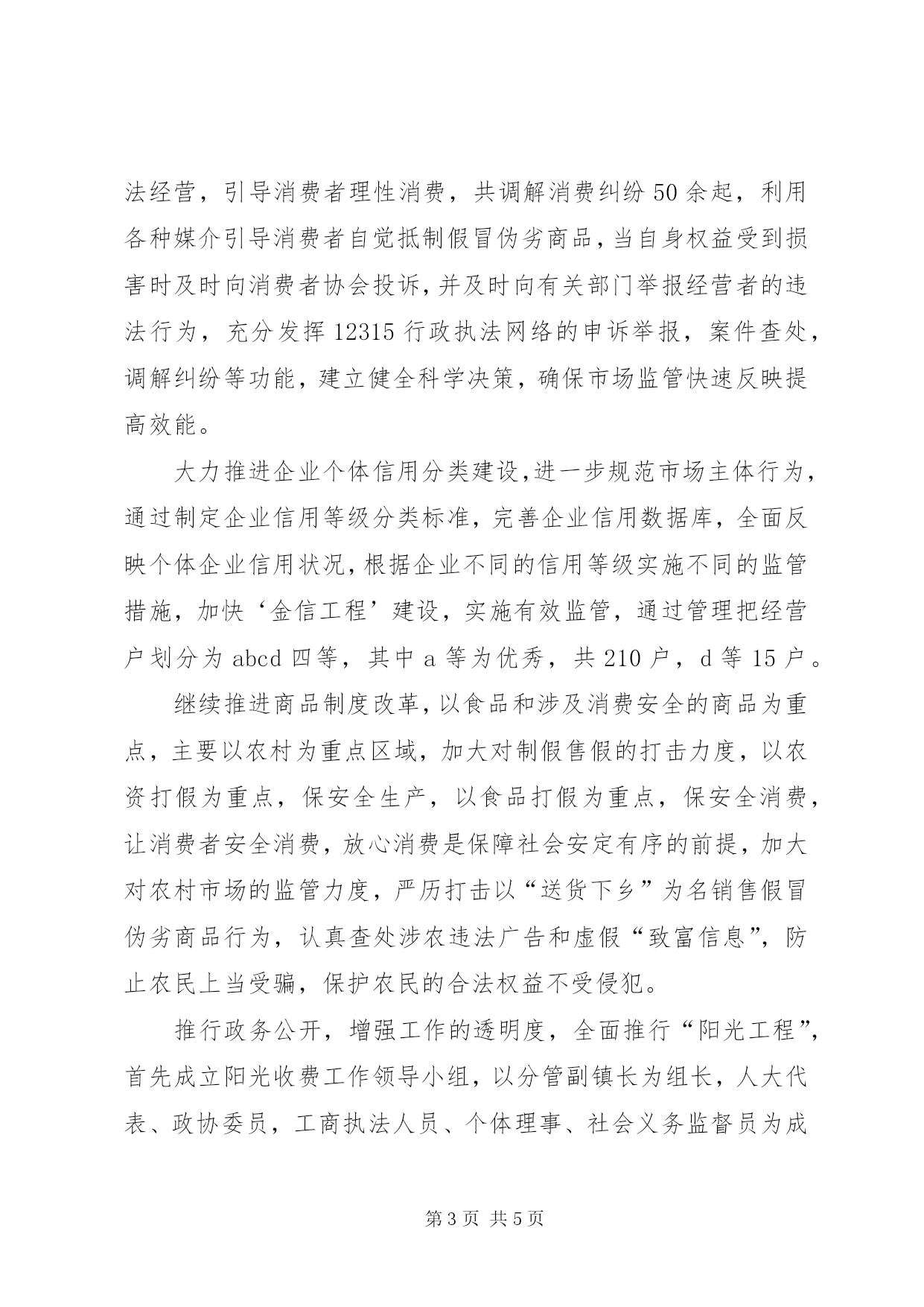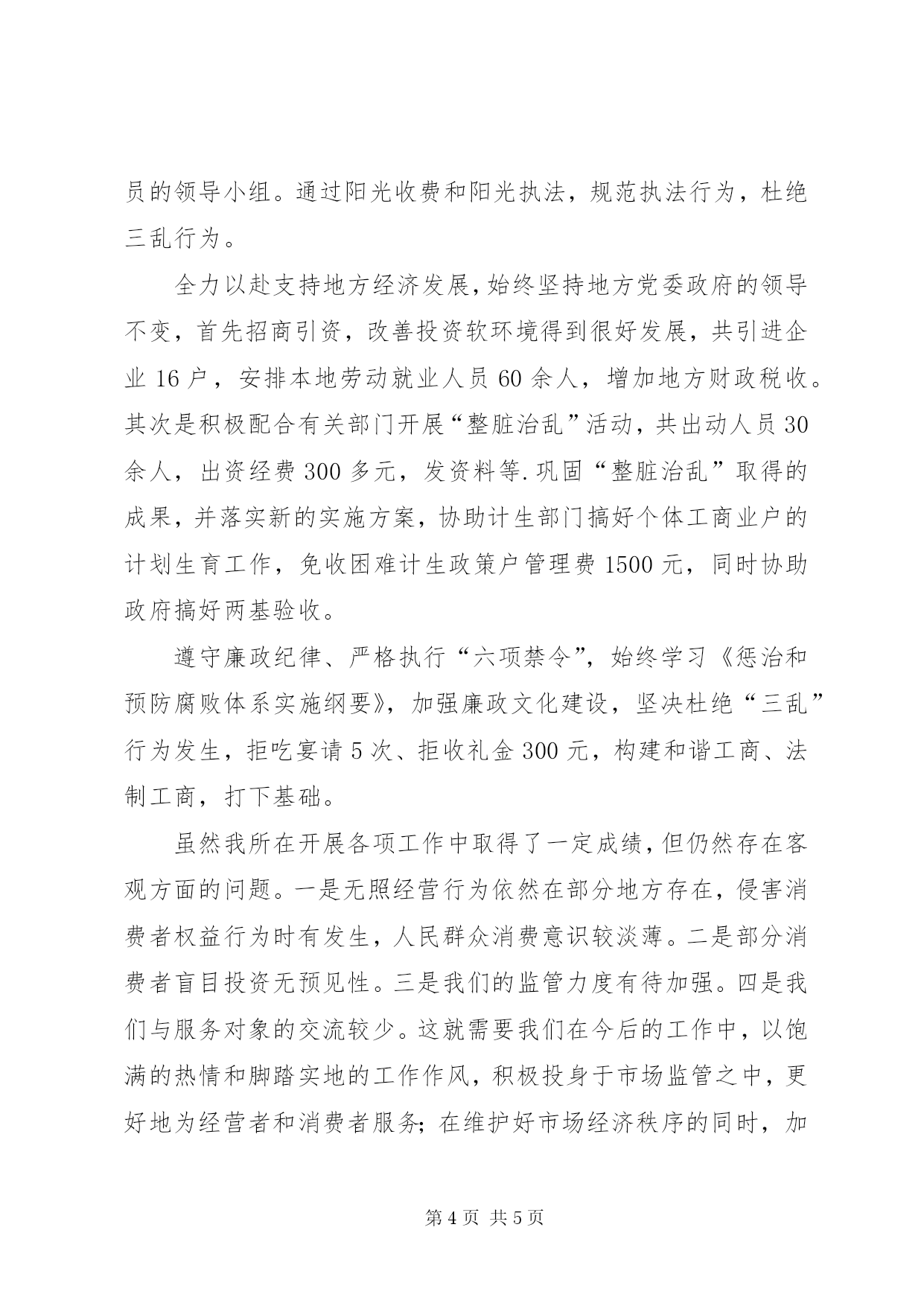 第PAGE\*Arabic\*MERGEFORMAT5页共NUMPAGES\*MERGEFORMAT5页工商所所长述职报告工商机关作为市场监管和行政执法部门,肩负着促进经济发展、维护市场秩序的重任,不断创新市场监管理念,积极营造安全、和谐的消费环境、为促进社会的公平和正义,构建社会主义和谐社会做出应有努力,我所在市场监管中,始终坚持用科学发展观统领各项工作的全局,把促进科学发展作为履行市场监管职责的出发点和落脚点,把握“监管只是手段而不是目的”的原则,尽责尽职抓监管、尽心尽力促发展。首先是积极促进各类市场主体健康发展。发展多种形式的集体经济,支持非公制经济发展,大力支持外商投资企业健康发展,我所共注册个体工商户登记300多户,引导企业注册8户。农业丰则基础强、农民富则国家盛、农村稳则社会安、“三农”问题始终是全党工作的重中之重,是构建社会主义和谐社会的关键所在,我所在镇党委、政府XX县区工商局的领导下,以切实维护农民利益、促进农民增收为着力点,紧紧围绕爱农、护农、帮农行动,铲除坑农、损农、害农行为,以整顿规范市场经济秩序、营造公平竞争的市场环境为切入点,着力解决农民群众最关心、最直接、最现实的利益问题,扎实推进社会主义新农村建设,“红盾护农”行动取得阶段性成果。近几年,共开展“红盾护农”专项行动75次,出动执法人员200多人次;检查农资经营主体82户,查处农资经营案件30多件,罚款5000多元,案值10多万元。积极促进农村经济发展、紧紧抓住“三农”这个工作重心,推进社会主义新农村建设,加强商标注册宣传,引导农民通过注册农产品商标和地理标志。在本辖区内共引导商标注册2户。一是XX县区天然富硒食品开发有限公司的“天赋”商标,二是沿河沙子空心李果园场的“沙子空心”商标,通过商标注册提升了企业知名度,带动了经济发展,实现农民增收,真正实现商标富农,政策支农、权益保农。积极支持发展农村经纪人,以促进农业生产和市场需求的衔接,推动农村经济结构调整,促进农民增收,积极开展合同帮农工作,扶持发展多种形式的订单农业,发挥农业龙头的带动作用,实现农业增效。农民增收,做好登记工作,依法赋予其市场主体合法,以促进农业生产市场化、产业化、规模化发展。积极支持做好就业和再就业工作。在市场准入政策支持、收费减免、提供服务和优化市场环境等方面采取措施,促进经济发展与扩大就业的良性互动,从落实国家优惠政策以来,我所共为下岗失业人员免除登记费2400元,免收个体工商业户管理费36000元,免费登记下岗人员120户。指导行业协会加强自律。以沙子商会为代表,充分发挥行业协会在构建和谐社会中的自律作用,以及政府联系群众的桥梁作用,指导协会努力构筑消费教育和咨询服务,引导教育经营者守法经营,引导消费者理性消费,共调解消费纠纷50余起,利用各种媒介引导消费者自觉抵制假冒伪劣商品,当自身权益受到损害时及时向消费者协会投诉,并及时向有关部门举报经营者的违法行为,充分发挥12315行政执法网络的申诉举报,案件查处,调解纠纷等功能,建立健全科学决策,确保市场监管快速反映提高效能。大力推进企业个体信用分类建设,进一步规范市场主体行为,通过制定企业信用等级分类标准,完善企业信用数据库,全面反映个体企业信用状况,根据企业不同的信用等级实施不同的监管措施,加快‘金信工程’建设,实施有效监管,通过管理把经营户划分为abcd四等,其中a等为优秀,共210户,d等15户。继续推进商品制度改革,以食品和涉及消费安全的商品为重点,主要以农村为重点区域,加大对制假售假的打击力度,以农资打假为重点,保安全生产,以食品打假为重点,保安全消费,让消费者安全消费,放心消费是保障社会安定有序的前提,加大对农村市场的监管力度,严历打击以“送货下乡”为名销售假冒伪劣商品行为,认真查处涉农违法广告和虚假“致富信息”,防止农民上当受骗,保护农民的合法权益不受侵犯。推行政务公开,增强工作的透明度,全面推行“阳光工程”,首先成立阳光收费工作领导小组,以分管副镇长为组长,人大代表、政协委员,工商执法人员、个体理事、社会义务监督员为成员的领导小组。通过阳光收费和阳光执法,规范执法行为,杜绝三乱行为。全力以赴支持地方经济发展,始终坚持地方党委政府的领导不变,首先招商引资,改善投资软环境得到很好发展,共引进企业16户,安排本地劳动就业人员60余人,增加地方财政税收。其次是积极配合有关部门开展“整脏治乱”活动,共出动人员30余人,出资经费300多元,发资料等.巩固“整脏治乱”取得的成果,并落实新的实施方案,协助计生部门搞好个体工商业户的计划生育工作,免收困难计生政策户管理费1500元,同时协助政府搞好两基验收。遵守廉政纪律、严格执行“六项禁令”,始终学习《惩治和预防腐败体系实施纲要》,加强廉政文化建设,坚