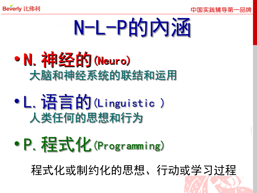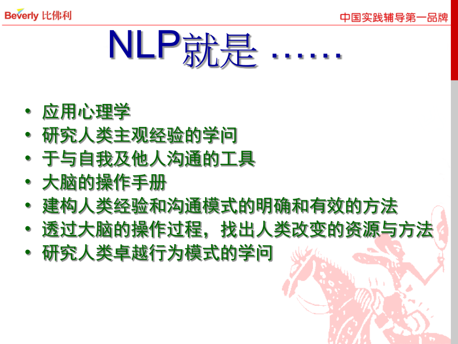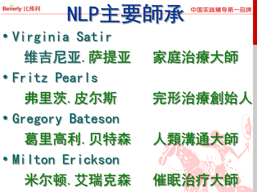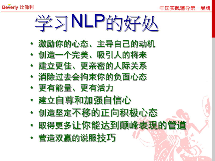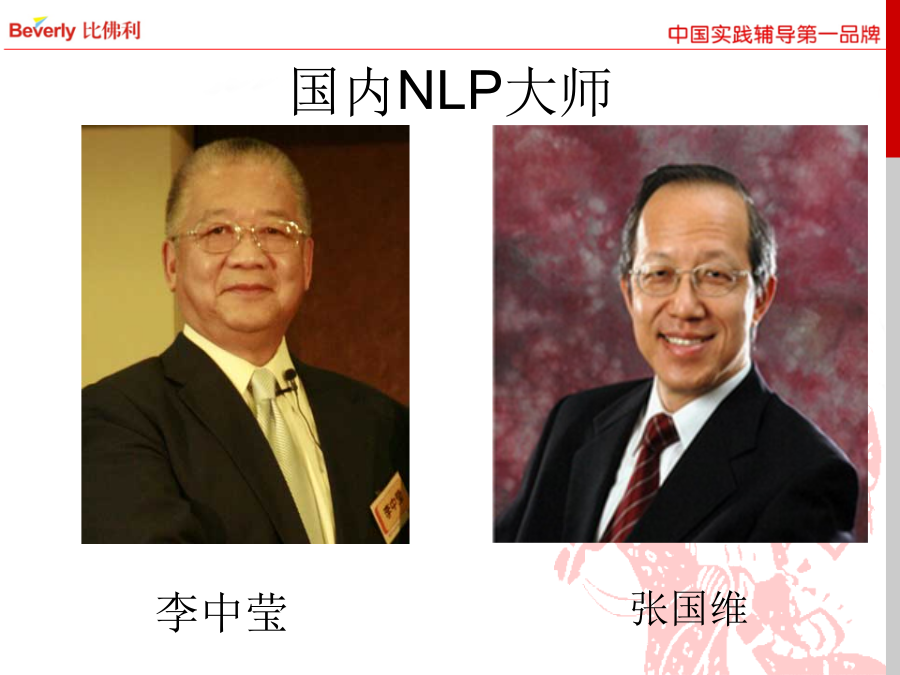 《NLP之概述》关于NLPNLP的主要创建人NLP主要師承N-L-P的內涵NLP就是……NLP的应用范围学习NLP的好处NLP四大智慧支柱国内NLP大师NLP辅导法概述思考:练习心理辅导地图情绪与行为的产生七步契合法NLP理解层次NLP疗法为何快速有效NLP的免疫系统:前提假设8、每一个人都选择给自己最佳利益的行为Everyonechoosesthebestbehavioratthemonment.9、每个人都已经具备使自己成功快乐的资源。Everyonealreadypossessesalltheresourcesneeded.10、在任何一个系统里,最灵活的部分便是最能影响大局的部分。Inanysystem,themostflexiblepersonhasthecontrol.11、没有挫败,只有回应信息。Thereisnofailure,onlyfeedback.12、动机和情绪总不会错,只是行为没有效果而已。Intentionsandemotionsareneverwrong,onlythebehaviorhasnotbeeneffective.NLP疗法为何快速有效NLP疗法为何快速有效信念系统BVR信念:是指事情应该怎样的,是我们所认为的世界维持下去的法则。是解释和支持行动变化或者没有变化的理由,是关于这个世界的种种关系的逻辑。⑴数以百万讲,绝大部分在潜意识里⑵世界的一切应该是这样的-主观⑶信念是绝对的⑷没有任何一个信念在所有情况都绝对有效。⑸来源有:A本人经验-火伤人B他人经验-C接受自已信任的人的话-老师、朋友D自己思想所得-陈总你早(三周问好没反应-明白他嫉妒我能力太强,明天我就按我想的来做了)C、D易生产局限性信念人生需要不断成长成熟价值观找出价值观的提问方式规条信念跟价值的区别:请你选择一件事,最好是你现在感到烦闷的事。很多人在学习这套技巧的时候,喜欢以手上的工作为题目。现在就假定以你的工作为题吧!请准备一张纸和一支笔。(1)请你写下一份理想工作对你的5个价值。若你不明白这道问题,也可以回答下面任何一道问题,它们问的都是同一样东西,然后把答案写下。一份(理想的)工作对你有什么意义?从一份(理想的)工作中你得到些什么?一份(理想的)工作里什么最重要?把想到的写在那张纸上。收入、赞赏、学习机会、挑战、友情等是经常出现的答案。我希望你用自己写下来的答案。(2)写下5个答案后,请按它们的重要性排出次序,最重要的是①,其次是②、接着是③、④、⑤。以下,你将会只用①、②和③3个最重要的价值。(3)现在,请放下笔,把两只手放在眼前,先望着左手手心告诉自己:"假设我决定转工,现在有一份工作,它能给我很充足的①但是②不足。"一面说,一面想象这份工作就在左手手心。然后转去望着右手手心说:"同时又有一份工作,它能给我很多的②,但是①不足。"一面说,一面想象那份工作就在右手的手心。然后来回地望左手心、右手心,让自己的感觉告诉你喜欢哪一份。(在这个时候,不要做理性的判断,最好不要去想"应该怎样","那样不对",而应任由感受浮涌出来。)把感觉的决定写在纸上。(4)接着,用同样的步骤,把刚刚在①与②之间选出来的一个与③比较。例如刚才你选出的是②,现在便是②与③的比较了。用语言摆脱困境(5步脱困法)。例如,一个人说做不到某一件事:①困境:我做不到X,②改写:到现在为止,我尚未能做到x。③因果:因为过去我不懂得--,所以到现在为止,尚未能做到X。④假没:当我学懂--,我便能做到x。⑤未来:我要去学--,我将会做到x。注:第三步因果的"必须是某些本人能控制或有所行动的事。换框法之一:意义换框法换框法之一、意义换框法(因果式的信念最为有效)使他无从挑剔使我提升得更快使他改变对我的态度使我超越创建的标准使我变得更能干使我更快升级,脱离他的管治使我更有能力去另找新工作使我在同事之中受到最少的挑剔,因而更有安全感使我能更早创业我要证明他不能控制我的情绪我要证明我可以做到使我能清静愉快地工作能证明在这种上司之下我仍能胜任能证明我能超越任何压力使其他老板注意我,因而创出转工的机会使我有更优良的表现练习:换框法之二:二者兼得法这样的思想方向是跳出框框、追求突破。其中一个常常出现的突破关系,是把A和B的定义做更清晰的切细,因为很多时候说话的人会用一些虚泛的词语去代表他的需要,不把他的需要弄清楚,往往无法着手把事情解决。以下的练习中,你可以假设自己就是当事人,试用“假若二者可以兼得,我怎样做便能实现它?”的态度去考虑一些可能性。练习一:组长说:"要使质量上去,产量必然减少。"练习二:丈夫说:“为了维持家中安宁,我只得避免和她说话。”练习三:职员说:"每天工作那么忙,哪会有时间去学习