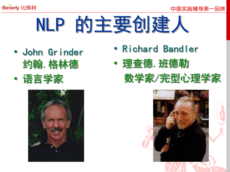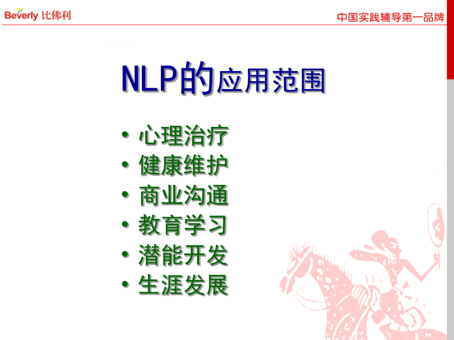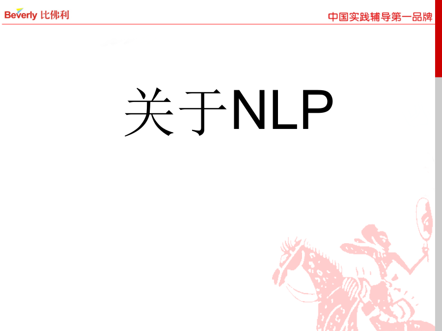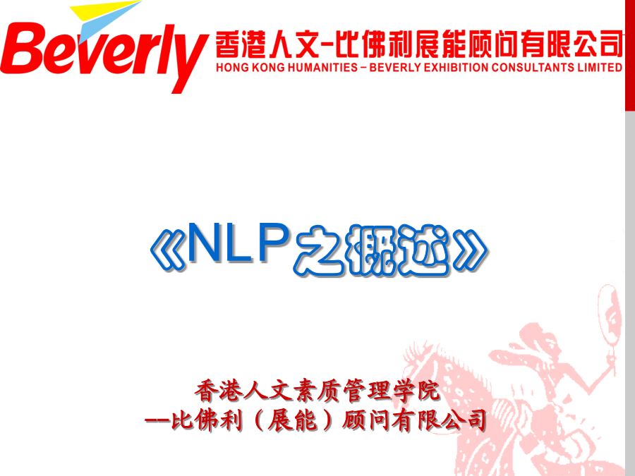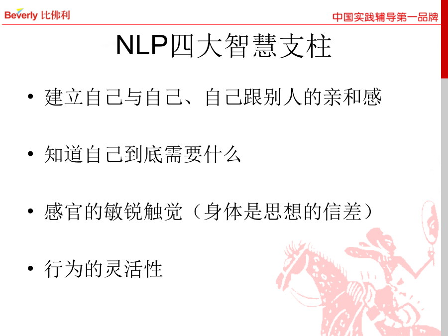 《NLP之概述》关于NLPNLP的主要创建人NLP主要師承N-L-P的內涵NLP就是……NLP的应用范围学习NLP的好处NLP四大智慧支柱国内NLP大师NLP辅导法概述思考:练习心理辅导地图情绪与行为的产生七步契合法NLP理解层次NLP疗法为何快速有效NLP的免疫系统:前提假设8、每一个人都选择给自己最佳利益的行为Everyonechoosesthebestbehavioratthemonment.9、每个人都已经具备使自己成功快乐的资源。Everyonealreadypossessesalltheresourcesneeded.10、在任何一个系统里,最灵活的部分便是最能影响大局的部分。Inanysystem,themostflexiblepersonhasthecontrol.11、没有挫败,只有回应信息。Thereisnofailure,onlyfeedback.12、动机和情绪总不会错,只是行为没有效果而已。Intentionsandemotionsareneverwrong,onlythebehaviorhasnotbeeneffective.NLP疗法为何快速有效NLP疗法为何快速有效信念系统BVR信念:是指事情应该怎样的,是我们所认为的世界维持下去的法则。是解释和支持行动变化或者没有变化的理由,是关于这个世界的种种关系的逻辑。⑴数以百万讲,绝大部分在潜意识里⑵世界的一切应该是这样的-主观⑶信念是绝对的⑷没有任何一个信念在所有情况都绝对有效。⑸来源有:A本人经验-火伤人B他人经验-C接受自已信任的人的话-老师、朋友D自己思想所得-陈总你早(三周问好没反应-明白他嫉妒我能力太强,明天我就按我想的来做了)C、D易生产局限性信念人生需要不断成长成熟价值观找出价值观的提问方式规条信念跟价值的区别:请你选择一件事,最好是你现在感到烦闷的事。很多人在学习这套技巧的时候,喜欢以手上的工作为题目。现在就假定以你的工作为题吧!请准备一张纸和一支笔。(1)请你写下一份理想工作对你的5个价值。若你不明白这道问题,也可以回答下面任何一道问题,它们问的都是同一样东西,然后把答案写下。一份(理想的)工作对你有什么意义?从一份(理想的)工作中你得到些什么?一份(理想的)工作里什么最重要?把想到的写在那张纸上。收入、赞赏、学习机会、挑战、友情等是经常出现的答案。我希望你用自己写下来的答案。(2)写下5个答案后,请按它们的重要性排出次序,最重要的是①,其次是②、接着是③、④、⑤。以下,你将会只用①、②和③3个最重要的价值。(3)现在,请放下笔,把两只手放在眼前,先望着左手手心告诉自己:"假设我决定转工,现在有一份工作,它能给我很充足的①但是②不足。"一面说,一面想象这份工作就在左手手心。然后转去望着右手手心说:"同时又有一份工作,它能给我很多的②,但是①不足。"一面说,一面想象那份工作就在右手的手心。然后来回地望左手心、右手心,让自己的感觉告诉你喜欢哪一份。(在这个时候,不要做理性的判断,最好不要去想"应该怎样","那样不对",而应任由感受浮涌出来。)把感觉的决定写在纸上。(4)接着,用同样的步骤,把刚刚在①与②之间选出来的一个与③比较。例如刚才你选出的是②,现在便是②与③的比较了。用语言摆脱困境(5步脱困法)。例如,一个人说做不到某一件事:①困境:我做不到X,②改写:到现在为止,我尚未能做到x。③因果:因为过去我不懂得--,所以到现在为止,尚未能做到X。④假没:当我学懂--,我便能做到x。⑤未来:我要去学--,我将会做到x。注:第三步因果的"必须是某些本人能控制或有所行动的事。换框法之一:意义换框法换框法之一、意义换框法(因果式的信念最为有效)使他无从挑剔使我提升得更快使他改变对我的态度使我超越创建的标准使我变得更能干使我更快升级,脱离他的管治使我更有能力去另找新工作使我在同事之中受到最少的挑剔,因而更有安全感使我能更早创业我要证明他不能控制我的情绪我要证明我可以做到使我能清静愉快地工作能证明在这种上司之下我仍能胜任能证明我能超越任何压力使其他老板注意我,因而创出转工的机会使我有更优良的表现练习:换框法之二:二者兼得法这样的思想方向是跳出框框、追求突破。其中一个常常出现的突破关系,是把A和B的定义做更清晰的切细,因为很多时候说话的人会用一些虚泛的词语去代表他的需要,不把他的需要弄清楚,往往无法着手把事情解决。以下的练习中,你可以假设自己就是当事人,试用“假若二者可以兼得,我怎样做便能实现它?”的态度去考虑一些可能性。练习一:组长说:"要使质量上去,产量必然减少。"练习二:丈夫说:“为了维持家中安宁,我只得避免和她说话。”练习三:职员说:"每天工作那么忙,哪会有时间去学习