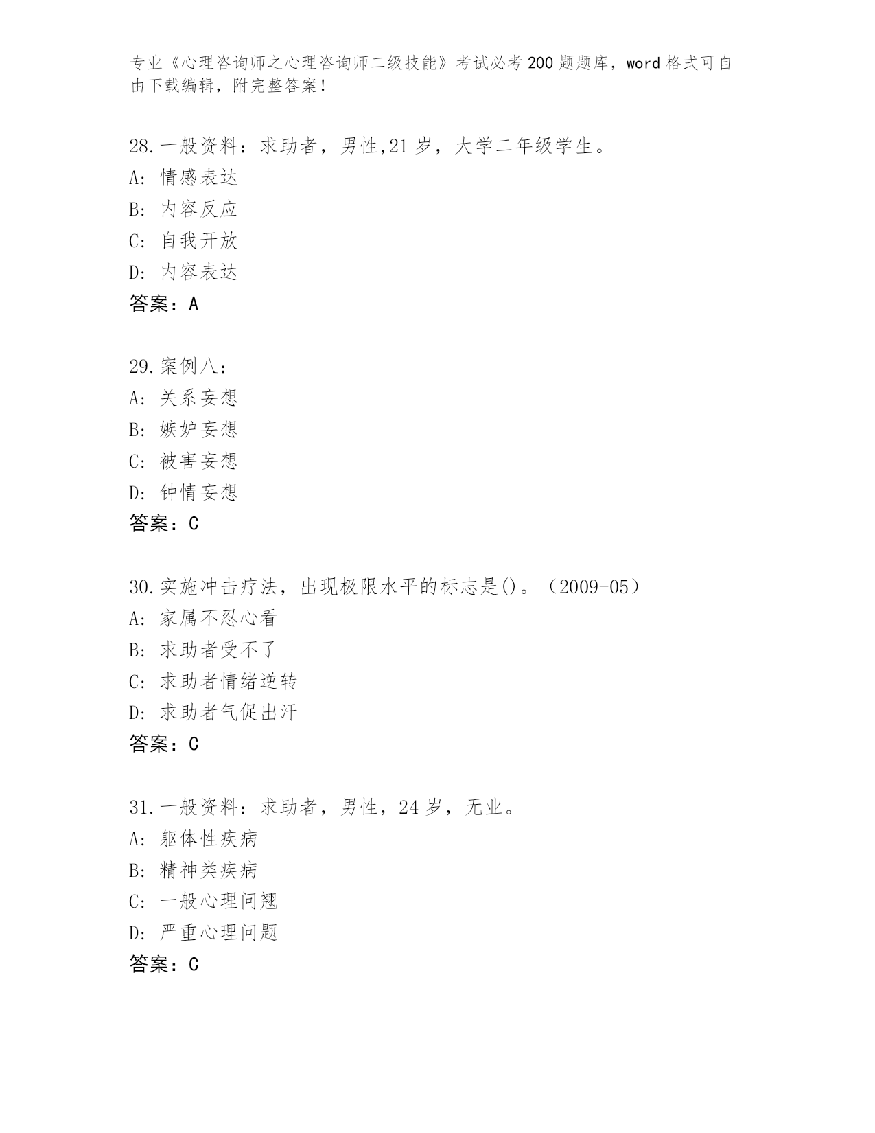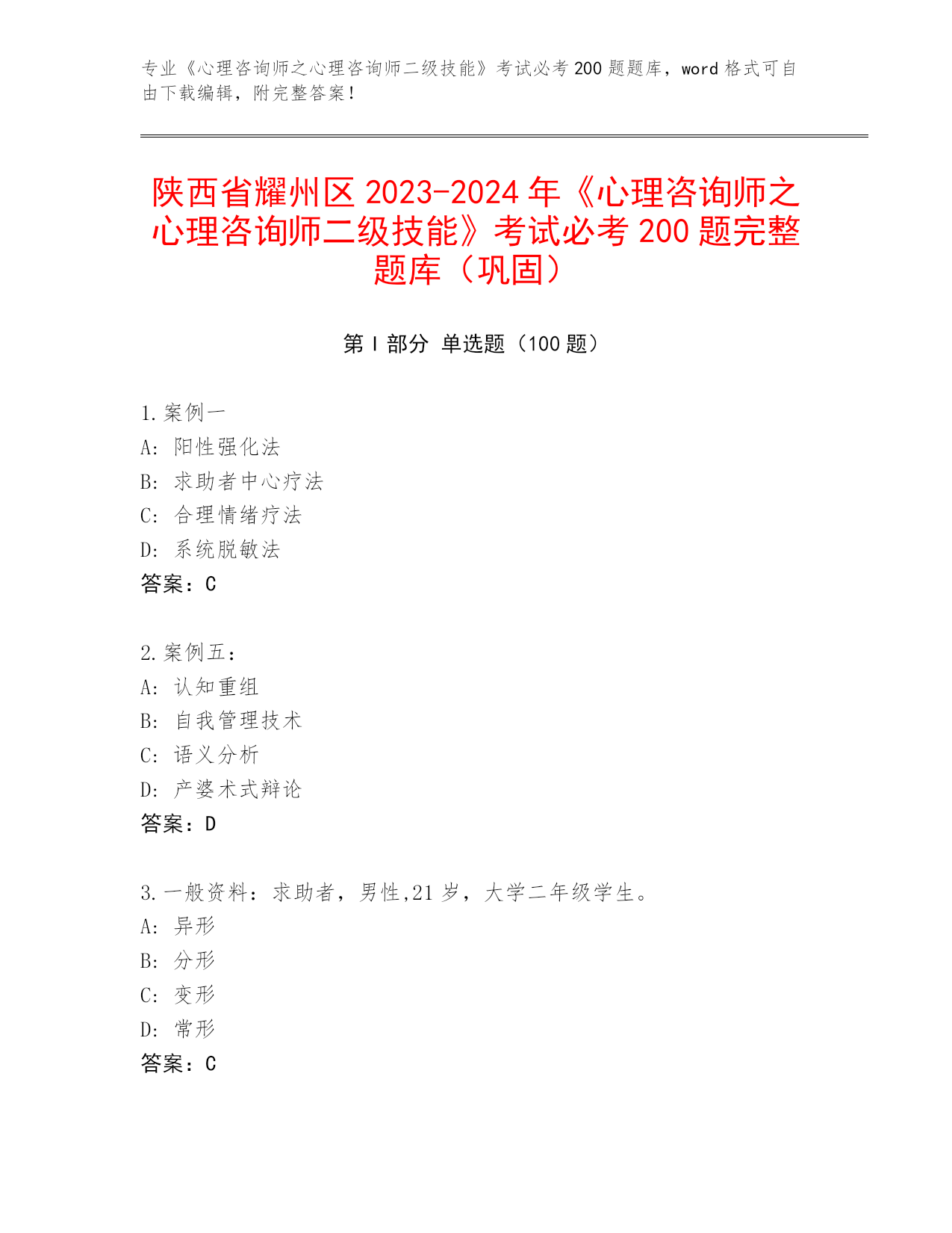 陕西省耀州区2023-2024年《心理咨询师之心理咨询师二级技能》考试必考200题完整题库(巩固)