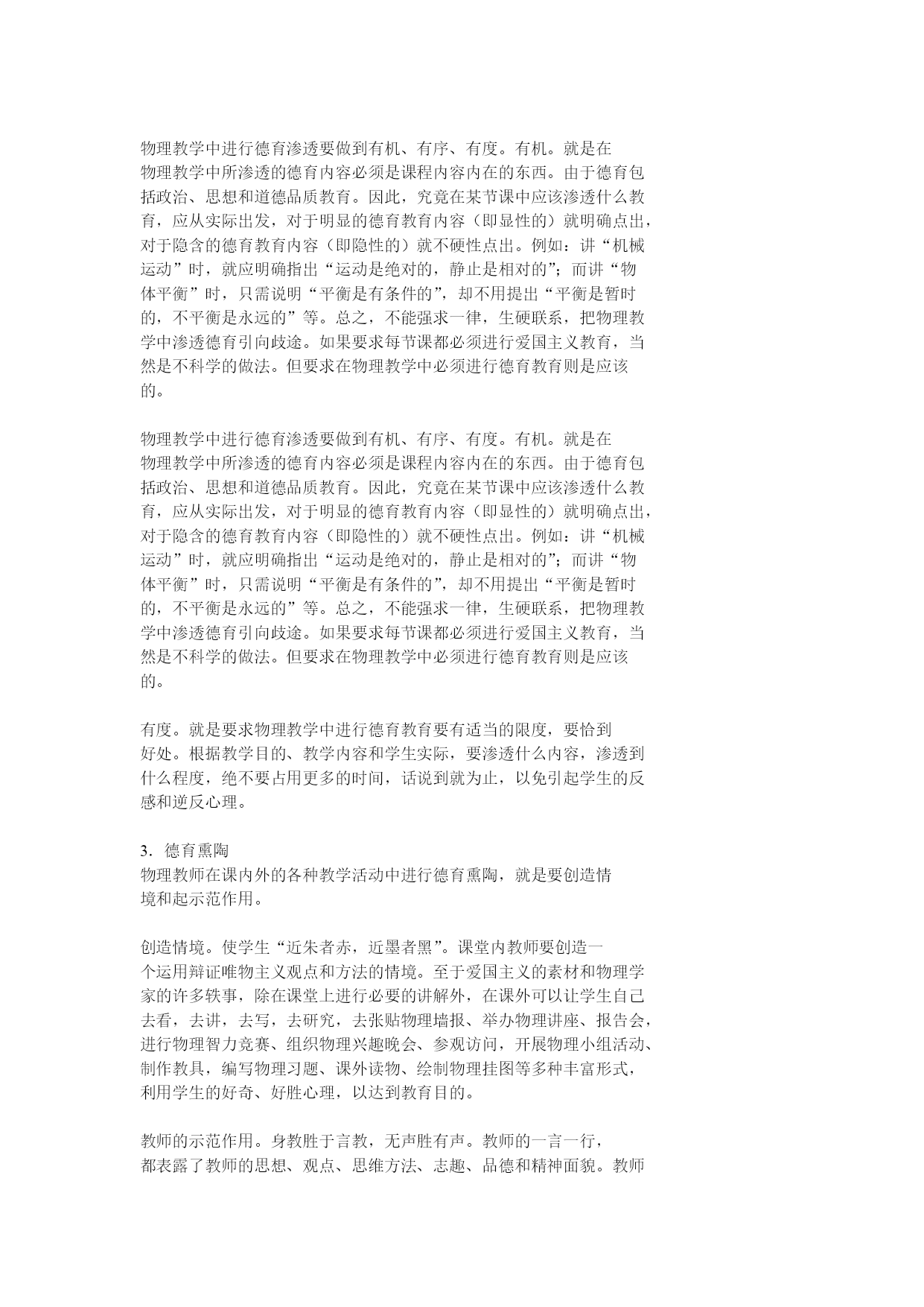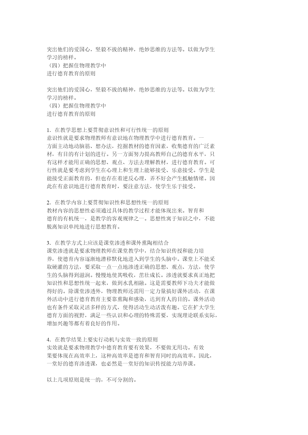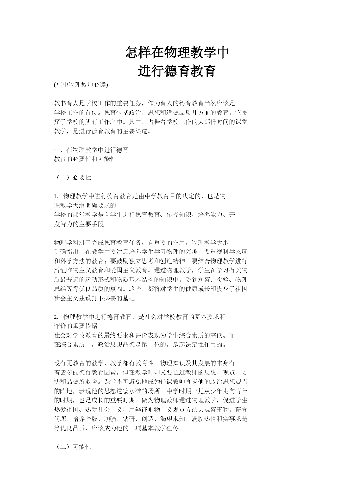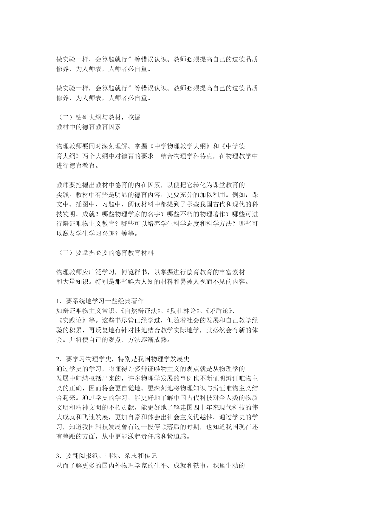 怎样在物理教学中进行德育教育(高中物理教师必读)教书育人是学校工作的重要任务,作为育人的德育教育当然应该是学校工作的首位。德育包括政治、思想和道德品质几方面的教育,它贯穿于学校的所有工作之中。其中,占据着学校工作的大部份时间的课堂教学,是进行德育教育的主要渠道。一、在物理教学中进行德育教育的必要性和可能性(一)必要性1.物理教学中进行德育教育是由中学教育目的决定的,也是物理教学大纲明确要求的学校的课堂教学是向学生进行德育教育、传授知识、培养能力、开发智力的主要手段。物理学科对于完成德育教育任务,有重要的作用。物理教学大纲中明确指出,在教学中要注意培养学生学习物理的兴趣;要重视科学态度和科学方法的教育;要鼓励独立思考和创造精神。要结合物理教学进行辩证唯物主义教育和爱国主义教育。通过物理教学,学生在学习有关物质最普遍的运动形式和物质基本结构的知识中,受到观察、实验、物理思维等等优良品质的熏陶。这些,都将对学生的健康成长和投身于祖国社会主义建设打下必要的基础。2.物理教学中进行德育教育,是社会对学校教育的基本要求和评价的重要依据社会对学校教育的最终要求和评价表现为学生综合素质的高低。而在综合素质中,政治思想品德是第一位的,是起决定性作用的。没有无教育的教学,教学都有教育性。物理知识及其发展的本身有着诸多的德育教育因素,但在教学时却又要通过教师的思想、观点、方法和品德所取舍。课堂不可避免地成为任课教师宣扬他的政治思想观点的阵地,表现他的思想道德水准的场所。中学时期正是从少年走向青年的时期,也是成长的重要时期。做为物理教师通过物理教学,促进学生热爱祖国、热爱社会主义,用辩证唯物主义观点方法去观察事物,研究问题,培养坚毅、顽强、钻研、创造、渴望求知、满腔热情和实事求是等优良品质,应该成为他的一项基本教学任务。(二)可能性1.物理学本身有着德育教育的因素物理知识及物理学的发展都贯穿着大量的德育因素。这不是外加的,而是其内在所具有的功能。的,而是其内在所具有的功能。物理学的发展贯穿着辩证唯物主义的观点和方法。大至宇宙星系,小到基本粒子,从力、热、电、光到原子物理,从实物到场,无不证实自然界的物质性及多种形式的运动及其规律性,从而证实了马克思主义的唯物论;力的相互作用、电磁的统一、原子中的正负电荷、光的波和微粒二象性等揭示了对立统一规律。物态变化、物体运动的临界状态的改变、原子核的转变等等都是量变引起质变规律的实例,人们对光的本性的认识发展等说明否定之否定规律的普遍价值。这些都说明自然界的运动发展是遵循辩证法的。至于物理概念的形成、物理规律的得出、物理模型的建立、物理知识的应用、物理实验的进行,也都充满着辩证唯物主义认识论的观点和方法。(2)我国科技的发展充满了爱国主义和社会主义教育的光辉事例。我国古代科技的卓越贡献,除了四大发明外,还有做为现代文明基础的诸多的发明;我国社会主义现代化建设的科学技术,在短短四十年里走完欧美资本主义几百年走过的路程,一些物理分支已进入世界先进行列,这些成就说明我国有一大批热爱祖国的优秀物理学家和科学技术工作者。以这些事例教育学生会使学生自豪、自信,并坚定其投身社会主义建设的奋斗志向。(3)物理学家的高贵品质是学生学习的典范。物理学家那实事求是的态度、百折不挠的坚强意志、刻苦钻研和探索的精神、只讲奉献不图索取的美德等无数事例和轶事,都是向学生进行教育的好教材。2.物理学提供了进行某些德育教育的条件和方法物理学是一门以实验为基础的自然科学。它重视观察和实验,重视理论联系实际。物理实验的操作,物理现象的观察,为培养学生实事求是的科学态度、树立实践是检验真理的依据的观念等教育提供了条件和方法。物理概念的引入,物理规律的得出,物理理论的研究与应用,为培养学生掌握分析问题、解决问题的方法和树立相信科学、应用科学的观念创造了条件。物理实验的有趣,物理现象的释疑,物理规律的应用,物理计算的巧妙,物理科技的前景,物理故事的阅读,物理学家的轶事,物理教具的创制等又都会激发学生的学习兴趣,以及求知欲望和追求真理的愿望。二、怎样寓德育教育于物理教学之中(一)提高物理教师自身的政治思想品德素质和进行德育教育的自觉性教师要端正教育思想,认清教师不能只是教书匠,而应该是人类灵魂工程师,既教书又育人,应该清除“课内教书,课外育人”、“科任教书,班任育人”、“传授知识技能靠教学,发展能力靠课外活动,思想政治教育靠集中突击”、“只管考分高低,其他一概不管”、“做不做实验一样,会算题就行”等错误认识。教师必须提高自己的道德品质修养,为人师表,人师者必自重。