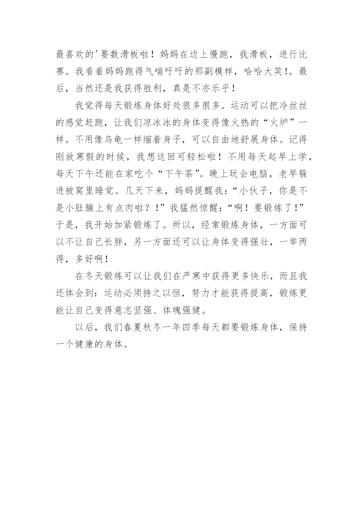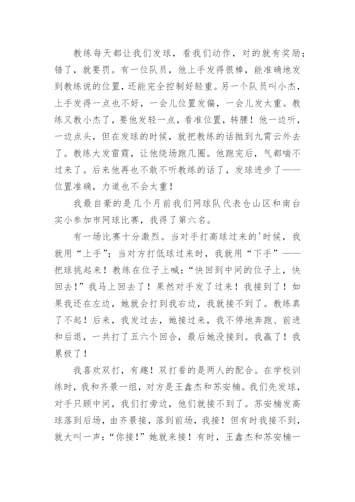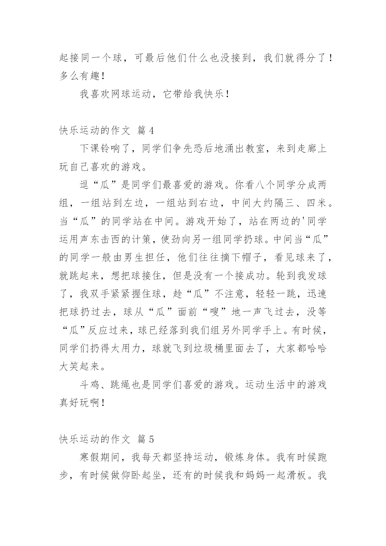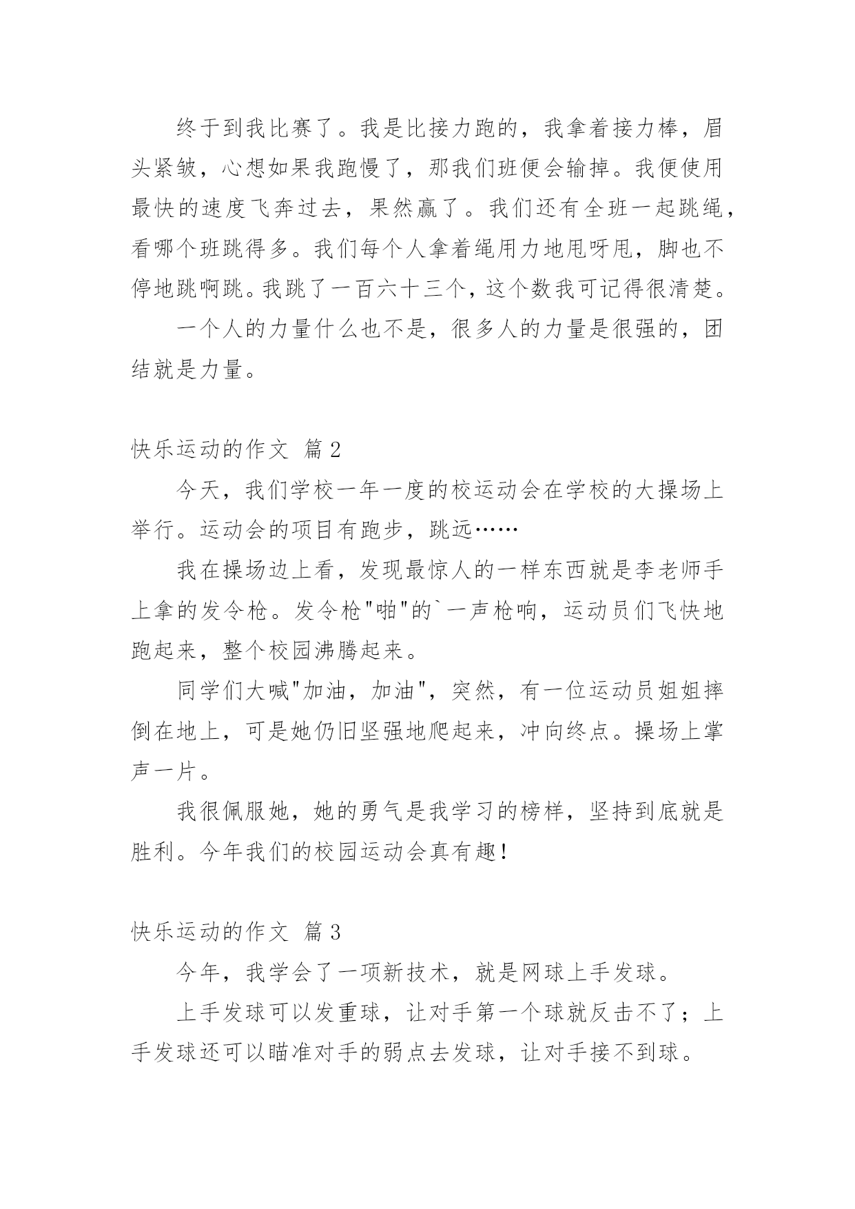 快乐运动的作文快乐运动的作文5篇(经典)在日常学习、工作和生活中,大家都有写作文的经历,对作文很是熟悉吧,作文是人们把记忆中所存储的有关知识、经验和思想用书面形式表达出来的记叙方式。那么一般作文是怎么写的呢?下面是小编为大家整理的快乐运动的作文5篇,欢迎阅读与收藏。快乐运动的作文篇1一天,我和外婆一起出门晨跑。跑着跑着我慢慢地想起了一次学校里的运动会,在这次运动会上我们班得到了全年级第一名。为什么我们能得第一呢?就是因为我们使用了全身的力气来应付这场“战斗”。这才让我们知道,团结就是力量。老师在操场上摆好终点与起点的位置,并且还把赛道画好了。老师他们拿起刷子,沾上那白白的油漆,弯下腰一笔一笔地画在操场上,许许多多的老师不一会一条一条笔直的雪白色线条画好了。老师分好谁去比什么了以后,我们便去到了“战场”上,和别班“战斗”。我们班同学是很拼的`。一位同学一脚踩空滑倒在地上,但他一咕噜跑起来继续三步并两步地跑着。还有一位同学看着别班比我们快了一些,他便使用最快的速度跑了起来,就像一颗陨石一样飞了过去。终于到我比赛了。我是比接力跑的,我拿着接力棒,眉头紧皱,心想如果我跑慢了,那我们班便会输掉。我便使用最快的速度飞奔过去,果然赢了。我们还有全班一起跳绳,看哪个班跳得多。我们每个人拿着绳用力地甩呀甩,脚也不停地跳啊跳。我跳了一百六十三个,这个数我可记得很清楚。一个人的力量什么也不是,很多人的力量是很强的,团结就是力量。快乐运动的作文篇2今天,我们学校一年一度的校运动会在学校的大操场上举行。运动会的项目有跑步,跳远……我在操场边上看,发现最惊人的一样东西就是李老师手上拿的发令枪。发令枪"啪"的`一声枪响,运动员们飞快地跑起来,整个校园沸腾起来。同学们大喊"加油,加油",突然,有一位运动员姐姐摔倒在地上,可是她仍旧坚强地爬起来,冲向终点。操场上掌声一片。我很佩服她,她的勇气是我学习的榜样,坚持到底就是胜利。今年我们的校园运动会真有趣!快乐运动的作文篇3今年,我学会了一项新技术,就是网球上手发球。上手发球可以发重球,让对手第一个球就反击不了;上手发球还可以瞄准对手的弱点去发球,让对手接不到球。教练每天都让我们发球,看我们动作,对的就有奖励;错了,就要罚。有一位队员,他上手发得很棒,能准确地发到教练说的位置,还能完全控制好轻重。另一个队员叫小杰,上手发得一点也不好,一会儿位置发偏,一会儿发太重。教练又教小杰了,要他发轻一点,看准位置,转腰!他一边听,一边点头,但在发球的时候,就把教练的话抛到九霄云外去了。教练大发雷霆,让他绕场跑几圈。他跑完后,气都喘不过来了。后来他再也不敢不听教练的话了,发球进步了——位置准确,力道也不会太重!我最自豪的是几个月前我们网球队代表仓山区和南台实小参加市网球比赛,我得了第六名。有一场比赛十分激烈。当对手打高球过来的'时候,我就用“上手”;当对方打低球过来时,我就用“下手”——把球挑起来!教练在位子上喊:“快回到中间的位子上,快回去!”我马上回去了!果然对手发了过来!我接到了!如果我还在左边,她就会打到我右边,我就接不到了。教练真了不起!后来,我发过去,她接过来,我不停地奔跑、前进和后退,一共打了五六个回合,最后她没接到。我赢了!我累极了!我喜欢双打,有趣!双打看的是两人的配合。在学校训练时,我和齐景一组,对方是王鑫杰和苏安楠。我们先发球,对手只顾中间,我们打旁边,他们就接不到了。苏安楠发高球落到后场,由齐景接,落到前场,我接!但有时我接不到,就大叫一声:“你接!”她就来接!有时,王鑫杰和苏安楠一起接同一个球,可最后他们什么也没接到,我们就得分了!多么有趣!我喜欢网球运动,它带给我快乐!快乐运动的作文篇4下课铃响了,同学们争先恐后地涌出教室,来到走廊上玩自己喜欢的游戏。逗“瓜”是同学们最喜爱的游戏。你看八个同学分成两组,一组站到左边,一组站到右边,中间大约隔三、四米。当“瓜”的同学站在中间。游戏开始了,站在两边的'同学运用声东击西的计策,使劲向另一组同学扔球。中间当“瓜”的同学一般由男生担任,他们往往摘下帽子,看见球来了,就跳起来,想把球接住,但是没有一个接成功。轮到我发球了,我双手紧紧握住球,趁“瓜”不注意,轻轻一跳,迅速把球扔过去,球从“瓜”面前“嗖”地一声飞过去,没等“瓜”反应过来,球已经落到我们组另外同学手上。有时候,同学们扔得太用力,球就飞到垃圾桶里面去了,大家都哈哈大笑起来。斗鸡、跳绳也是同学们喜爱的游戏。运动生活中的游戏真好玩啊!快乐运动的作文篇5寒假期间,我每天都坚持运动,锻炼身体。我有时候跑步,有时候做仰卧起坐,还有的时候我和妈妈一起滑板。我最喜欢的'要数滑板啦!妈妈在边上慢跑,我滑板,进行比赛。我看着妈妈跑得气喘吁吁的那副模样,哈哈大笑!。最后,当然还是我获得胜利,真是不亦乐乎!我觉得每天锻炼身