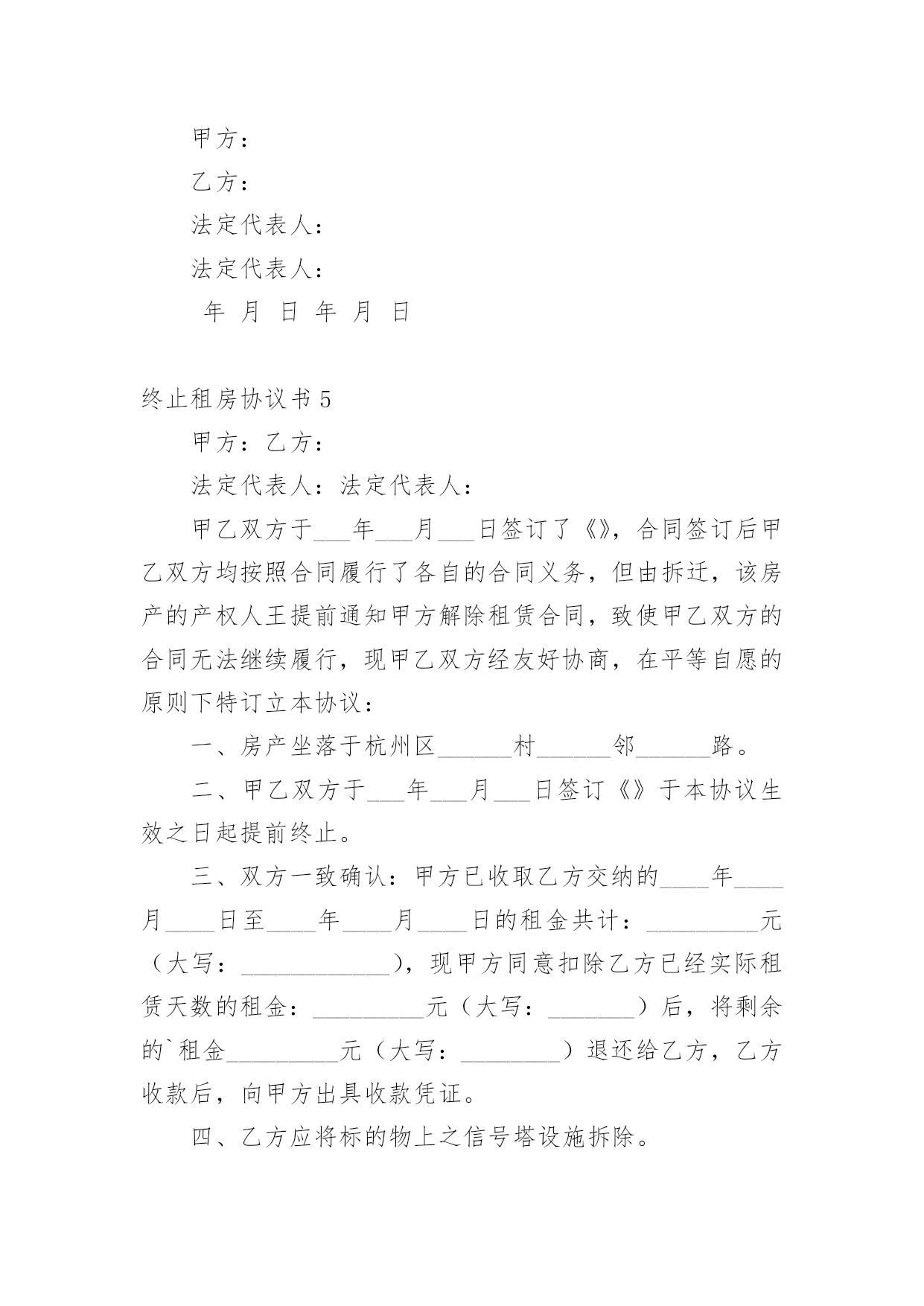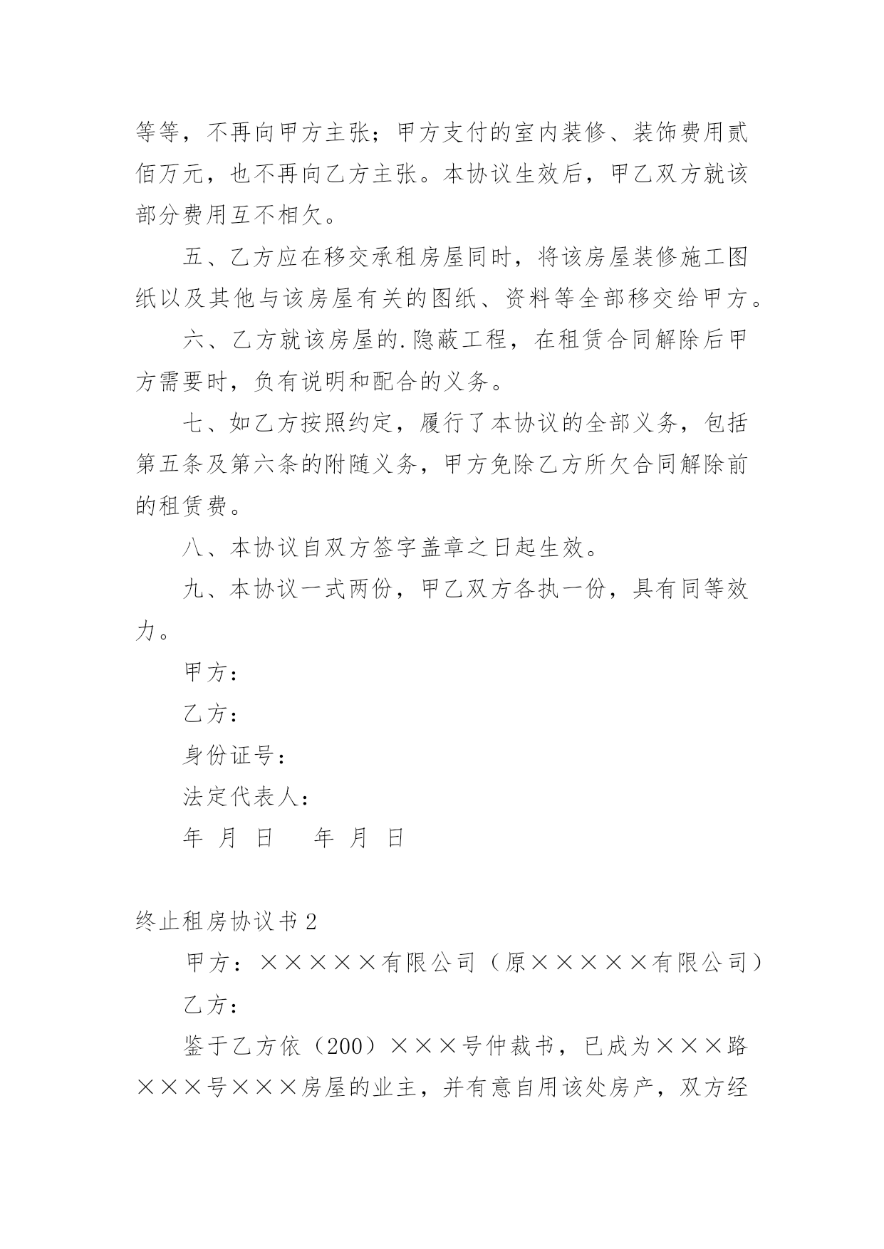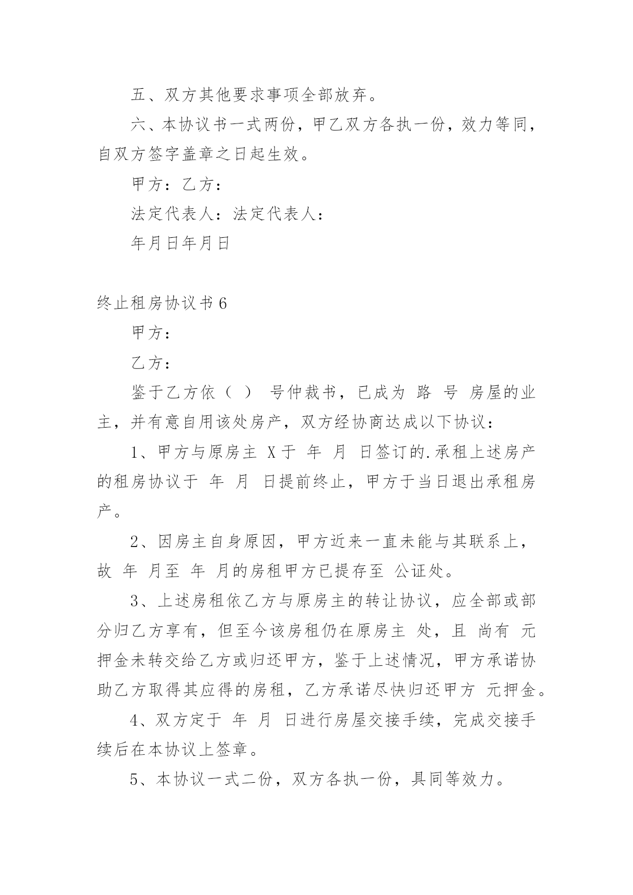终止租房协议书在快速变化和不断变革的今天,协议使用的情况越来越多,协议能够成为双方当事人的合法依据。我敢肯定,大部分人都对拟定协议很是头疼的,以下是小编为大家收集的终止租房协议书,供大家参考借鉴,希望可以帮助到有需要的朋友。终止租房协议书1甲方(出租方)xx乙方(承租方)xxxx有限公司甲乙双方原于xxxx年xx月xx日签订的房屋租赁合同,租赁房屋位于xx市xx区xx街x号楼,总面积约为:10200平方米。现因情势变更无法继续履行合同,经双方协商同意,就解除该房屋租赁合同达成以下条款:一、自本协议生效之日起,以上房屋租赁合同解除。合同解除后,甲乙双方互不追究对方的违约责任。二、乙方应于本协议生效之日起日内,将房屋移交给甲方。移交前,乙方会同甲方验收房屋设施、设备及物品,验收合格后,乙方从承租的房屋内搬走。三、关于该租赁房屋的外装修费用,甲乙双方协商聘请有资质的单位,以该单位审定的结算价格为准,多退少补。四、乙方在管理使用该租赁房屋期间所发生的所有税费,包括:房屋产权税、土地使用税以及室内的装修、装饰费用等等,不再向甲方主张;甲方支付的室内装修、装饰费用贰佰万元,也不再向乙方主张。本协议生效后,甲乙双方就该部分费用互不相欠。五、乙方应在移交承租房屋同时,将该房屋装修施工图纸以及其他与该房屋有关的图纸、资料等全部移交给甲方。六、乙方就该房屋的.隐蔽工程,在租赁合同解除后甲方需要时,负有说明和配合的义务。七、如乙方按照约定,履行了本协议的全部义务,包括第五条及第六条的附随义务,甲方免除乙方所欠合同解除前的租赁费。八、本协议自双方签字盖章之日起生效。九、本协议一式两份,甲乙双方各执一份,具有同等效力。甲方:乙方:身份证号:法定代表人:年月日年月日终止租房协议书2甲方:×××××有限公司(原×××××有限公司)乙方:鉴于乙方依(200)×××号仲裁书,已成为×××路×××号×××房屋的业主,并有意自用该处房产,双方经协商达成以下协议:一、甲方与原房主×××于××××年××月××日签订的承租上述房产的租房协议于××××年××月××日提前终止,甲方于当日退出承租房产。二、因房主自身原因,甲方近来一直未能与其联系上,故××××年××月至××××年××月的房租甲方已提存至公证处。三、上述房租依乙方与原房主的'转让协议,应全部或部分归乙方享有,但至今该房租仍在原房主××××处,且××××尚有××××元押金未转交给乙方或归还甲方,鉴于上述情况,甲方承诺协助乙方取得其应得的房租,乙方承诺尽快归还甲方××元押金。四、双方定于××××年××月××日进行房屋交接手续,完成交接手续后在本协议上签章。五、本协议一式二份,双方各执一份,具同等效力。甲方:×××××有限公司(公章)签约代表:乙方:年月日终止租房协议书3甲方:XX法定代表人:XX乙方:XX法定代表人:XX甲乙双方于XXXX年XX月XX日签订了《XX》,合同签订后甲乙双方均按照合同履行了各自的合同义务,但由拆迁,该房产的.产权人王提前通知甲方解除租赁合同,致使甲乙双方的合同无法继续履行,现甲乙双方经友好协商,在平等自愿的原则下特订立本协议:一、房产坐落于杭州区XX村XX邻XX路。二、甲乙双方于XXXX年XX月XX日签订《XX》于本协议生效之日起提前终止。三、双方一致确认:甲方已收取乙方交纳的XXXX年XX月XX日至XXXX年XX月XX日的租金共计:XX元(大写:XXXX),现甲方同意扣除乙方已经实际租赁天数的租金:XX元(大写:XX)后,将剩余的租金XX元(大写:XX)退还给乙方,乙方收款后,向甲方出具收款凭证。四、乙方应将标的物上之信号塔设施拆除。五、双方其他要求事项全部放弃。六、本协议书一式两份,甲乙双方各执一份,效力等同,自双方签字盖章之日起生效。甲方:XX法定代表人:XXXXXX年XX月XX日乙方:XX法定代表人:XXXXXX年XX月XX日终止租房协议书4甲方:乙方:法定代表人:法定代表人:甲乙双方于___年___月___日签订了《》,合同签订后甲乙双方均按照合同履行了各自的合同义务,但由拆迁,该房产的产权人______提前通知甲方解除租赁合同,致使甲乙双方的合同无法继续履行,现甲乙双方经友好协商,在平等自愿的原则下特订立本协议:一、房产坐落于______区______村______邻______路。二、甲乙双方于___年___月___日签订《》于本协议生效之日起提前终止。三、双方一致确认:甲方已收取乙方交纳的'____年____月____日至____年____月____日的租金共计:_________元(大写:____________),现甲方同意扣除乙方已经实际租赁天数的租金:_________元(大写:_______)后,将剩余的租金_________元(大写:________)退还