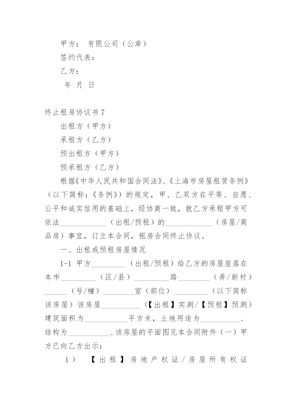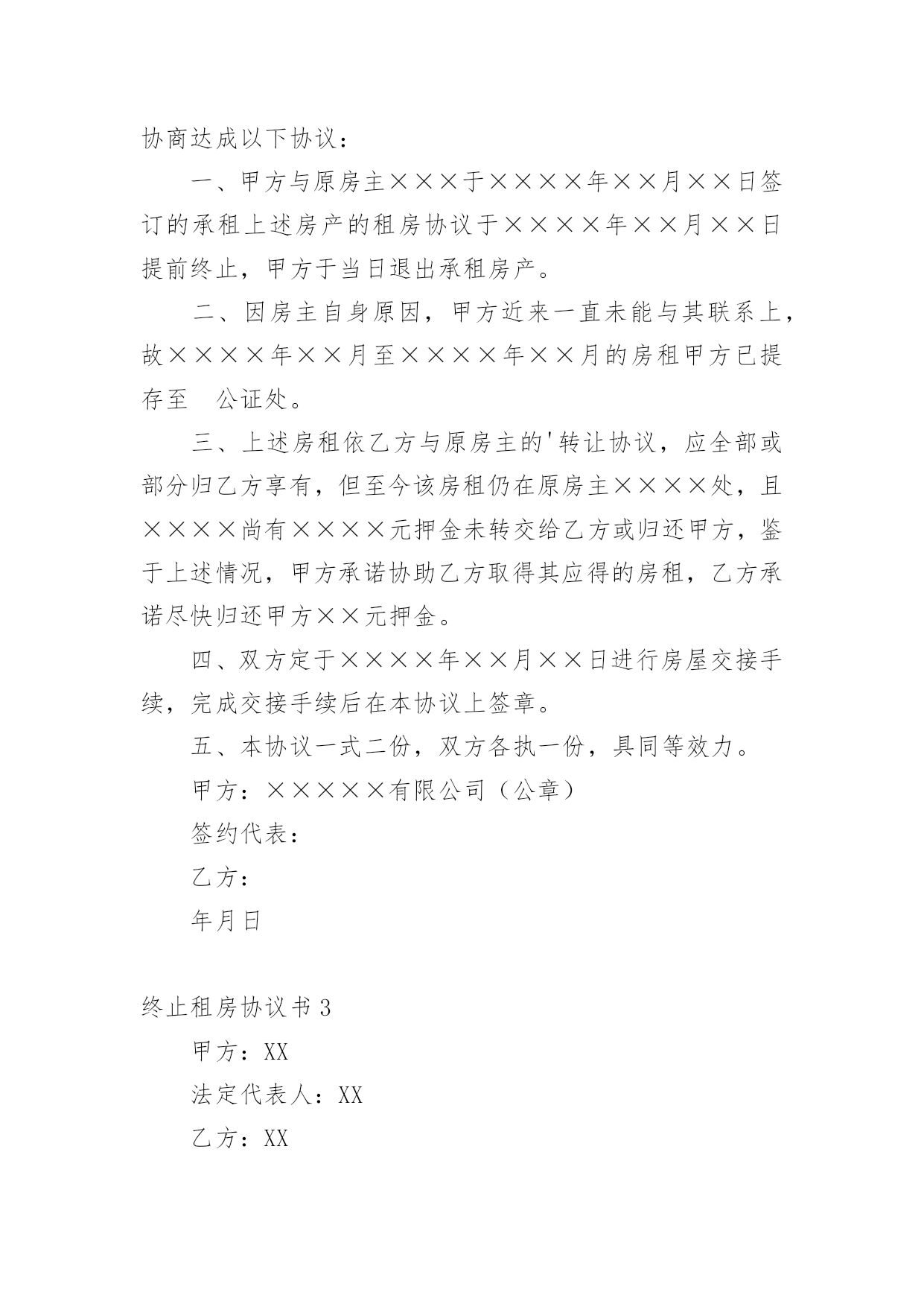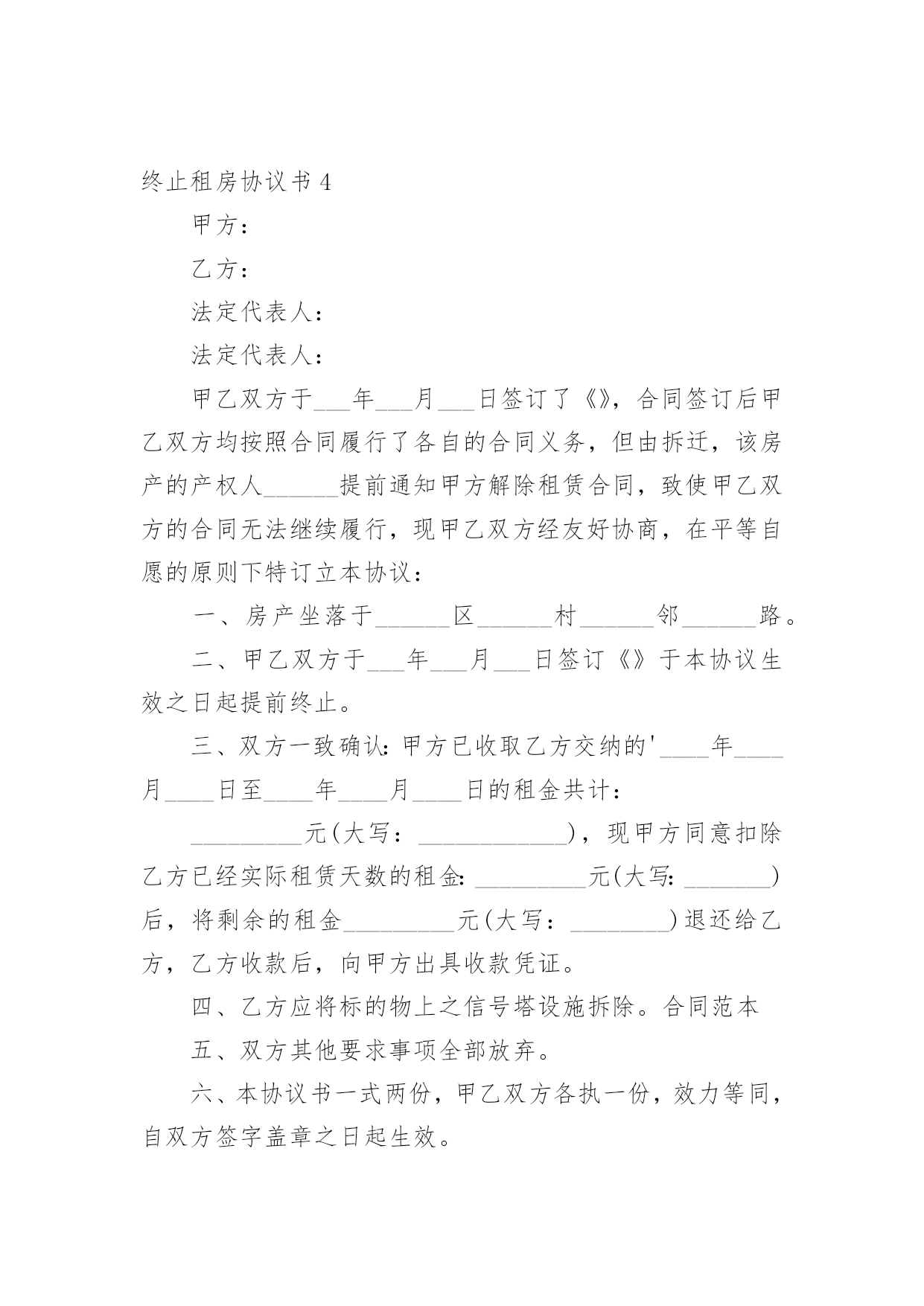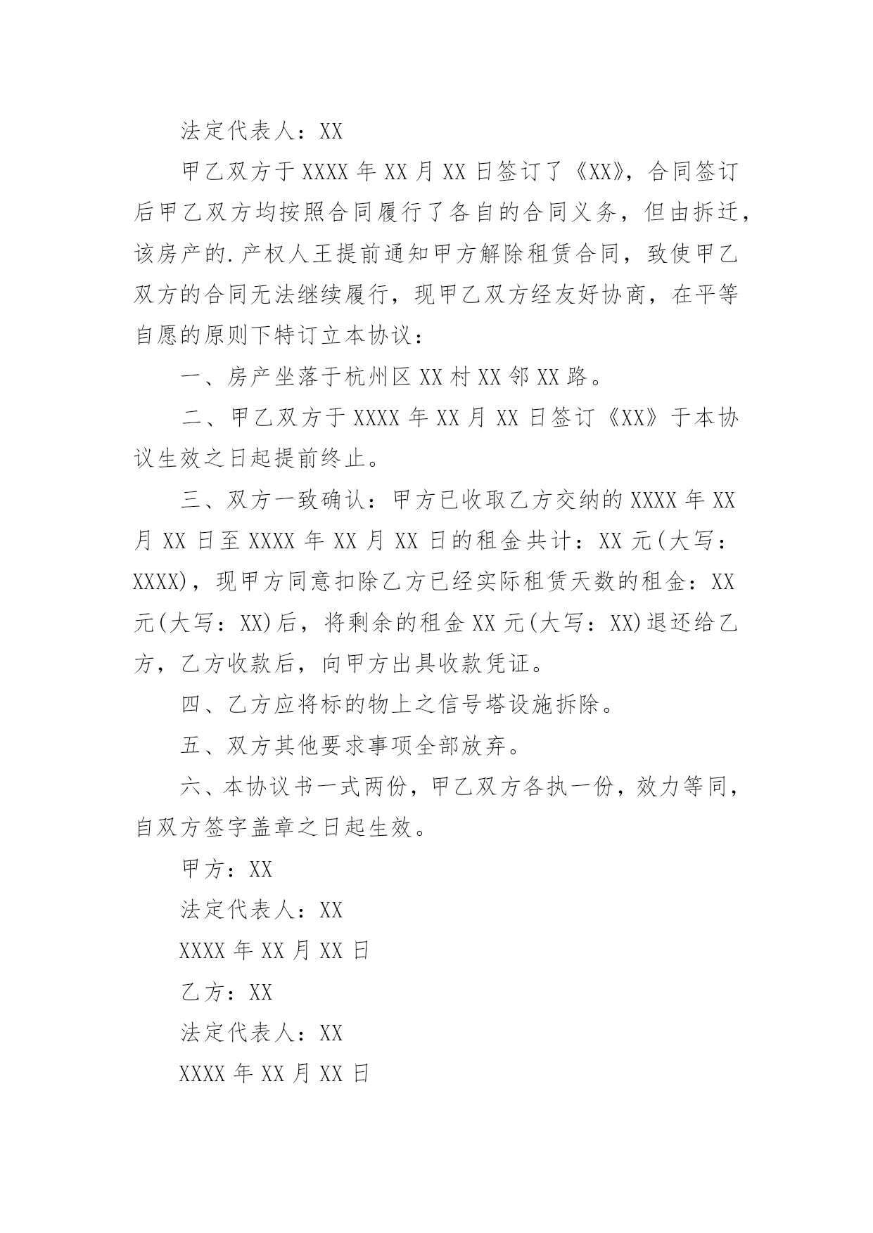 终止租房协议书在快速变化和不断变革的今天,协议使用的情况越来越多,协议能够成为双方当事人的合法依据。我敢肯定,大部分人都对拟定协议很是头疼的,以下是小编为大家收集的终止租房协议书,供大家参考借鉴,希望可以帮助到有需要的朋友。终止租房协议书1甲方(出租方)xx乙方(承租方)xxxx有限公司甲乙双方原于xxxx年xx月xx日签订的房屋租赁合同,租赁房屋位于xx市xx区xx街x号楼,总面积约为:10200平方米。现因情势变更无法继续履行合同,经双方协商同意,就解除该房屋租赁合同达成以下条款:一、自本协议生效之日起,以上房屋租赁合同解除。合同解除后,甲乙双方互不追究对方的违约责任。二、乙方应于本协议生效之日起日内,将房屋移交给甲方。移交前,乙方会同甲方验收房屋设施、设备及物品,验收合格后,乙方从承租的房屋内搬走。三、关于该租赁房屋的外装修费用,甲乙双方协商聘请有资质的单位,以该单位审定的结算价格为准,多退少补。四、乙方在管理使用该租赁房屋期间所发生的所有税费,包括:房屋产权税、土地使用税以及室内的装修、装饰费用等等,不再向甲方主张;甲方支付的室内装修、装饰费用贰佰万元,也不再向乙方主张。本协议生效后,甲乙双方就该部分费用互不相欠。五、乙方应在移交承租房屋同时,将该房屋装修施工图纸以及其他与该房屋有关的图纸、资料等全部移交给甲方。六、乙方就该房屋的.隐蔽工程,在租赁合同解除后甲方需要时,负有说明和配合的义务。七、如乙方按照约定,履行了本协议的全部义务,包括第五条及第六条的附随义务,甲方免除乙方所欠合同解除前的租赁费。八、本协议自双方签字盖章之日起生效。九、本协议一式两份,甲乙双方各执一份,具有同等效力。甲方:乙方:身份证号:法定代表人:年月日年月日终止租房协议书2甲方:×××××有限公司(原×××××有限公司)乙方:鉴于乙方依(200)×××号仲裁书,已成为×××路×××号×××房屋的业主,并有意自用该处房产,双方经协商达成以下协议:一、甲方与原房主×××于××××年××月××日签订的承租上述房产的租房协议于××××年××月××日提前终止,甲方于当日退出承租房产。二、因房主自身原因,甲方近来一直未能与其联系上,故××××年××月至××××年××月的房租甲方已提存至公证处。三、上述房租依乙方与原房主的'转让协议,应全部或部分归乙方享有,但至今该房租仍在原房主××××处,且××××尚有××××元押金未转交给乙方或归还甲方,鉴于上述情况,甲方承诺协助乙方取得其应得的房租,乙方承诺尽快归还甲方××元押金。四、双方定于××××年××月××日进行房屋交接手续,完成交接手续后在本协议上签章。五、本协议一式二份,双方各执一份,具同等效力。甲方:×××××有限公司(公章)签约代表:乙方:年月日终止租房协议书3甲方:XX法定代表人:XX乙方:XX法定代表人:XX甲乙双方于XXXX年XX月XX日签订了《XX》,合同签订后甲乙双方均按照合同履行了各自的合同义务,但由拆迁,该房产的.产权人王提前通知甲方解除租赁合同,致使甲乙双方的合同无法继续履行,现甲乙双方经友好协商,在平等自愿的原则下特订立本协议:一、房产坐落于杭州区XX村XX邻XX路。二、甲乙双方于XXXX年XX月XX日签订《XX》于本协议生效之日起提前终止。三、双方一致确认:甲方已收取乙方交纳的XXXX年XX月XX日至XXXX年XX月XX日的租金共计:XX元(大写:XXXX),现甲方同意扣除乙方已经实际租赁天数的租金:XX元(大写:XX)后,将剩余的租金XX元(大写:XX)退还给乙方,乙方收款后,向甲方出具收款凭证。四、乙方应将标的物上之信号塔设施拆除。五、双方其他要求事项全部放弃。六、本协议书一式两份,甲乙双方各执一份,效力等同,自双方签字盖章之日起生效。甲方:XX法定代表人:XXXXXX年XX月XX日乙方:XX法定代表人:XXXXXX年XX月XX日终止租房协议书4甲方:乙方:法定代表人:法定代表人:甲乙双方于___年___月___日签订了《》,合同签订后甲乙双方均按照合同履行了各自的合同义务,但由拆迁,该房产的产权人______提前通知甲方解除租赁合同,致使甲乙双方的合同无法继续履行,现甲乙双方经友好协商,在平等自愿的原则下特订立本协议:一、房产坐落于______区______村______邻______路。二、甲乙双方于___年___月___日签订《》于本协议生效之日起提前终止。三、双方一致确认:甲方已收取乙方交纳的'____年____月____日至____年____月____日的租金共计:_________元(大写:____________),现甲方同意扣除乙方已经实际租赁天数的租金:_________元(大写:_______)后,将剩余的租金_________元(大写:________)退还