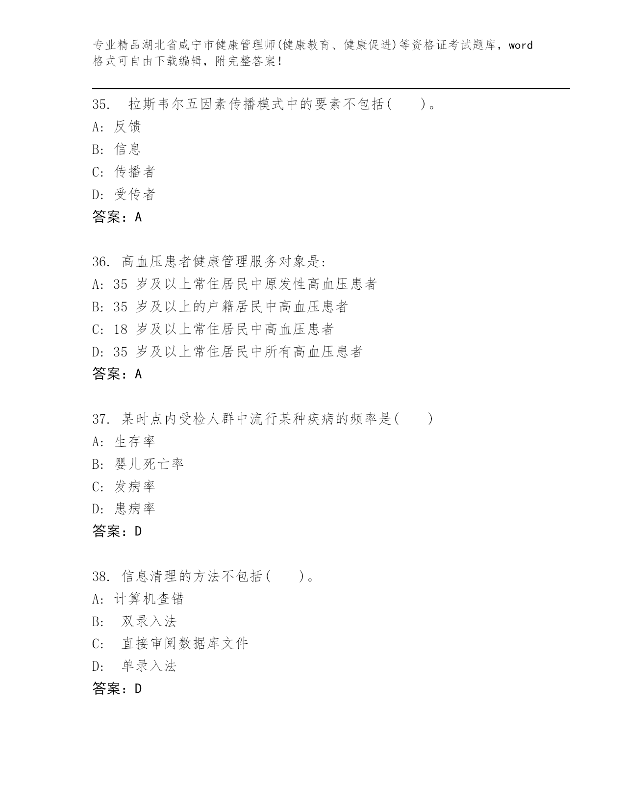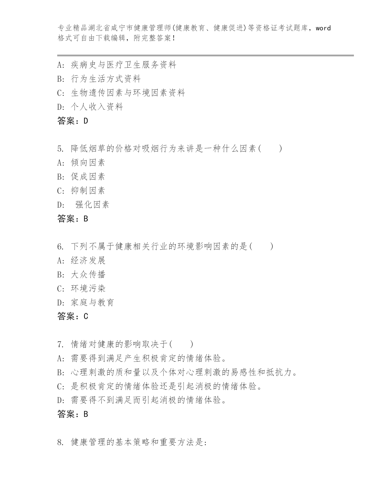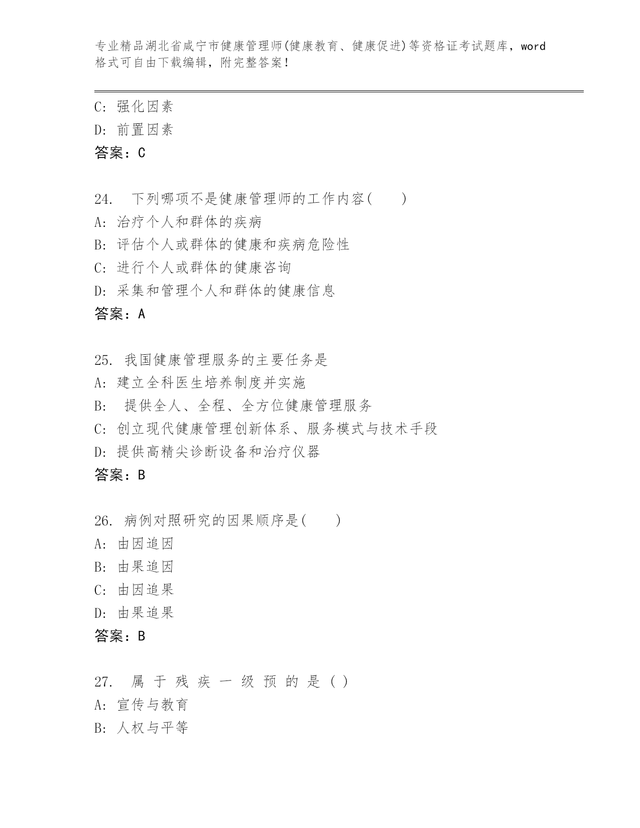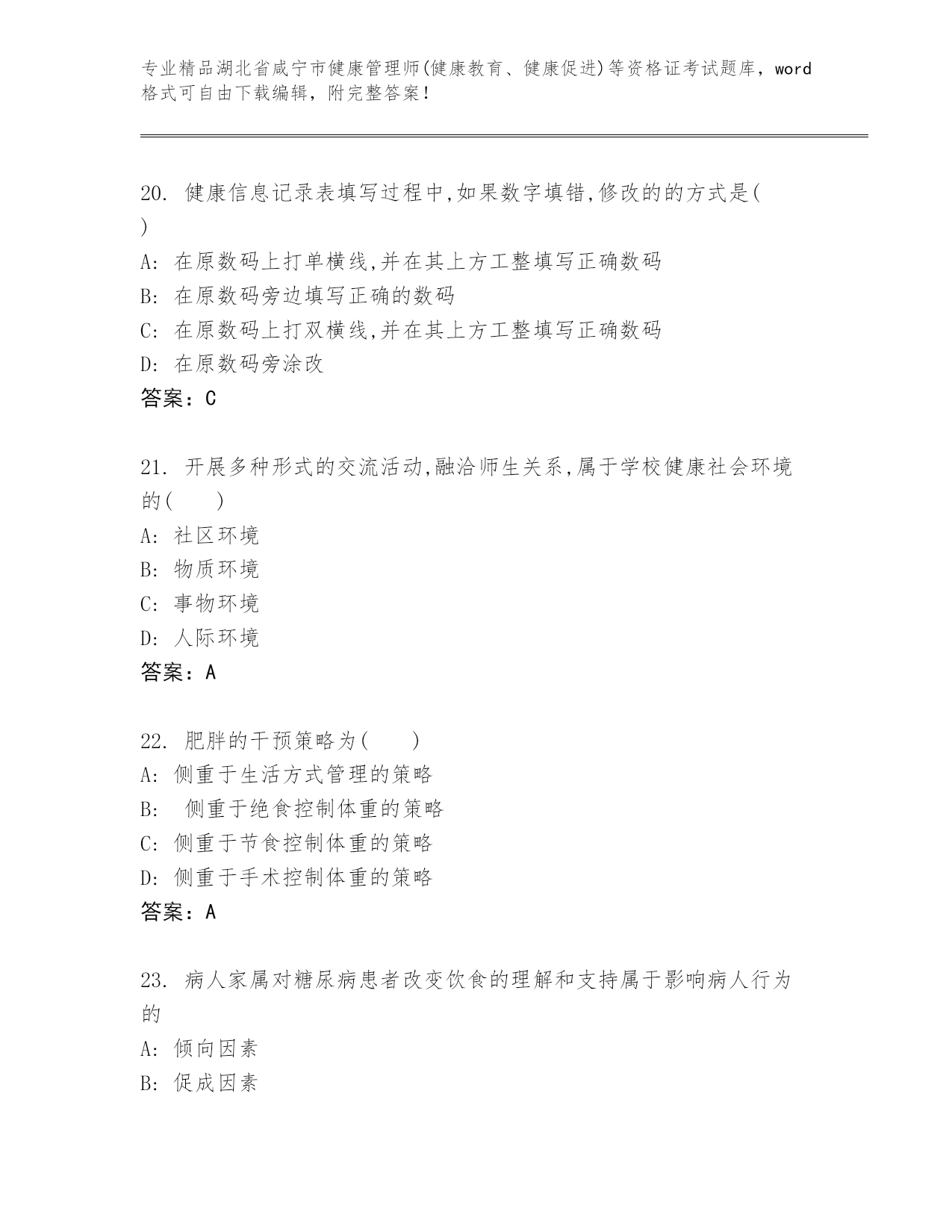 湖北省咸宁市健康管理师(健康教育、健康促进)等资格证考试及答案【真题汇编】.docx