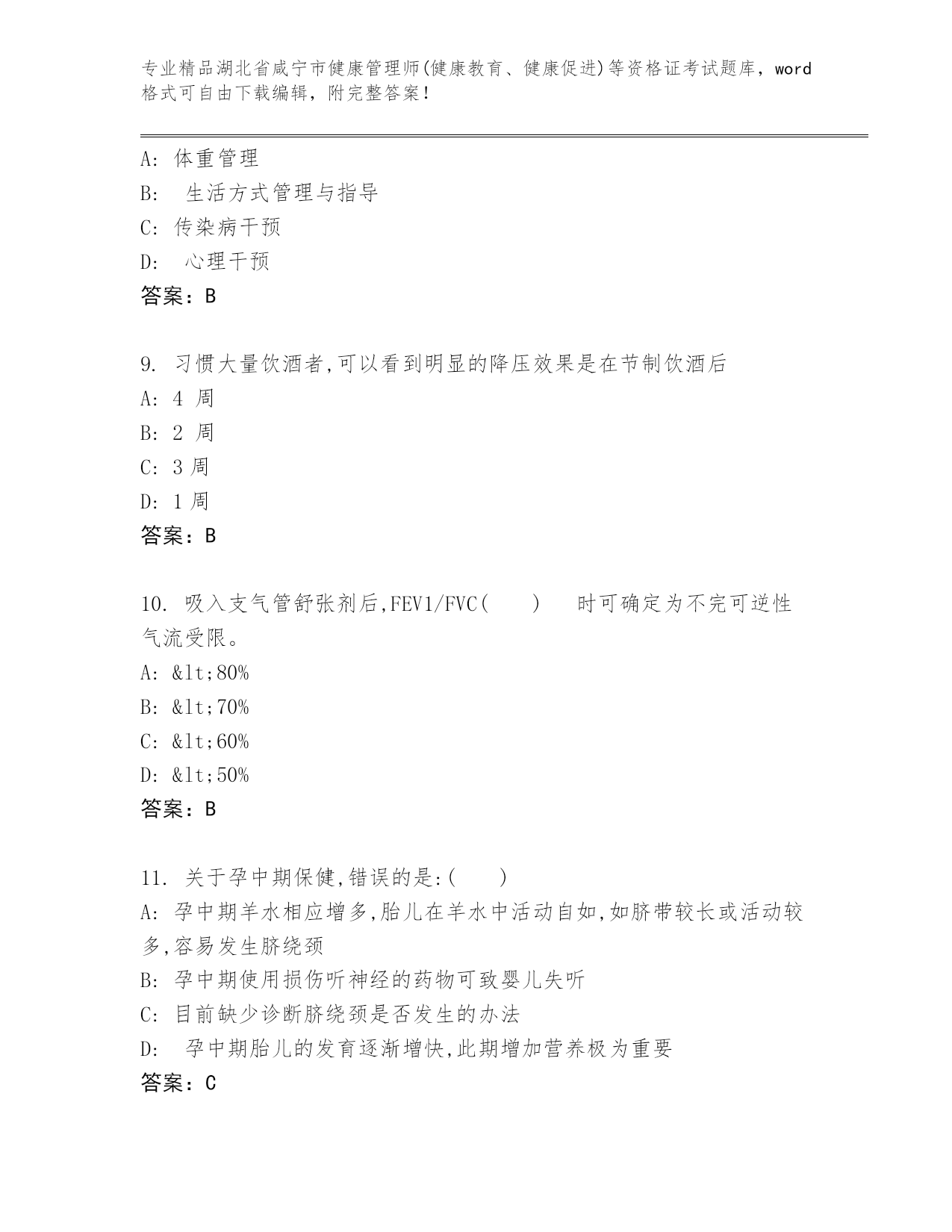 湖北省咸宁市健康管理师(健康教育、健康促进)等资格证考试及答案【真题汇编】