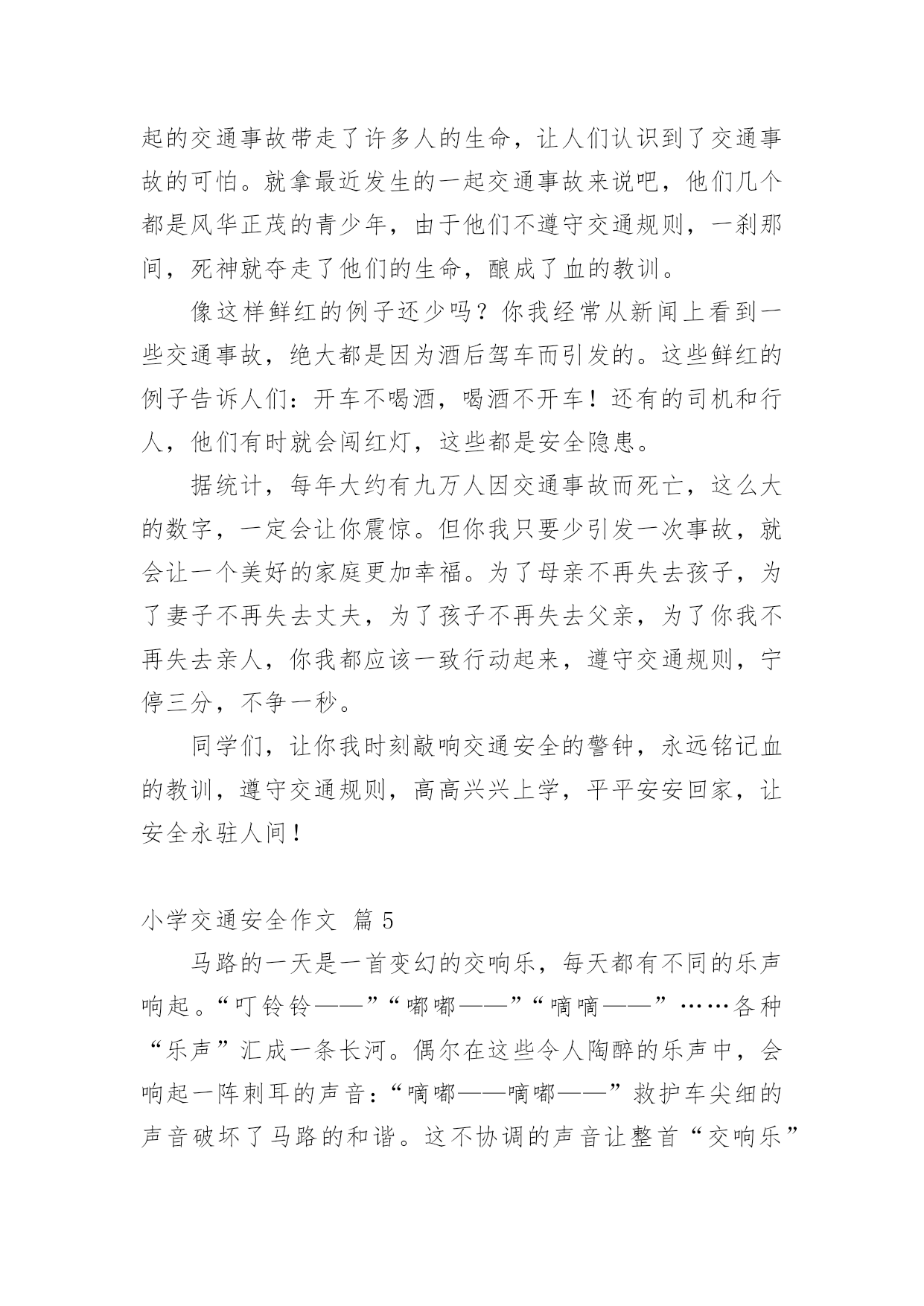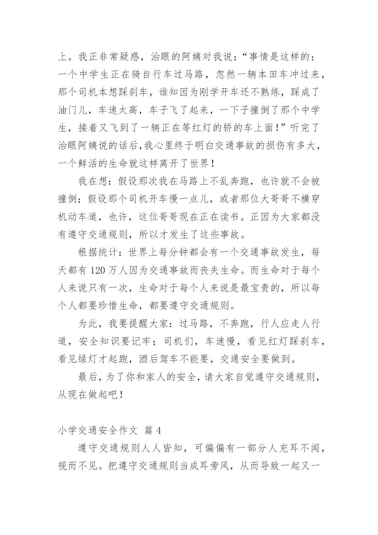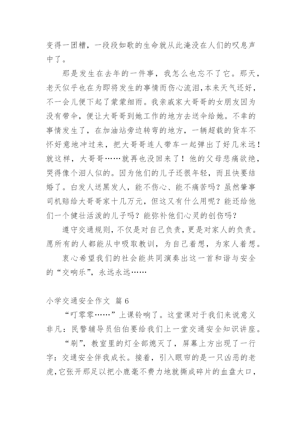 小学交通安全作文【必备】小学交通安全作文汇总6篇在平时的学习、工作或生活中,大家都写过作文吧,借助作文可以宣泄心中的情感,调节自己的心情。如何写一篇有思想、有文采的作文呢?以下是小编帮大家整理的小学交通安全作文6篇,仅供参考,希望能够帮助到大家。小学交通安全作文篇1在北京,有一辆公共自行车很方便。骑自行车,去哪都可以,可以达到千万别骑太快。那样很容易导致发生发展交通安全事故。昨天我就朋要一起。昨天下午我骑自行车去看朋友。在十字路口,红灯处..我下了车,想等绿灯亮过去。这时,一个戴眼镜的年轻人从后面骑过来..他很生气,在十字路口买了一个停车站,然后骑着马走了。突然从右侧路口传来一辆车,年轻人没有注意到,突然撞到了车上..年轻人摔倒了,手断了,眼镜也坏了。大家帮他快起来,骑自行车的人也下车去看他。每个人都松了一口气,因为他还没收了任何伤害。究其原因有很多交通事故,但不遵守交通规则是其中的重要原因之一。这起事故是因为年轻人骑快车,不遵守交通规则造成。为了能够保证城市交通网络安全,大家都要严格遵守交通管理规则。骑自行车时,一定要在自行车道里骑,不要骑得太快。到了一个路口,更要特别需要注意。遇上红路灯时,一定要停下来,等红绿灯了再走。碰到旁边有汽车时,不要跟他比赛。只要满足人们可以遵守交通发展规则,注意交通信息安全,就会通过减少企业事故的。为了你和他人的安全,遵守交通规则..小学交通安全作文篇2在生活中,左右看,不在路上跑和玩,看见红灯停一停,看见绿灯向前行。幼时,爸爸妈妈常常教导我,不要在马路上玩,不要闯红灯,黄灯慢行。长大了,在学校里,老师也常常教育我们,人车各行其道,走路要走人行道,不要闯红灯,要遵守交通法规。学校也经常举行交通安全活动,让我们收获不少。最近,我也有那一幅惊人的交通故事:那一天,我放学回家,在那个十字路口,我正要过马路,啊,绿灯了,我向左右看了看,见没汽车,就向前走去,只听“唔”的一声,我向右边一看,一辆汽车正向我飞奔而来,我进退两难,这辆车好像并没有停下来,显然,他在闯红灯,我往后一退,那辆汽车在我面前绝尘而去,尾气害得我呛了几下,我回头一看,那辆车已无影无踪,好险哪!后来,我又在报纸上看到了几则重大交通事故:8月6日,沪昆高速特大交通事故至17人死亡。8月9日傍晚,在日湖公园旁的人行道上,13岁的蓉蓉被出租车撞了,在昏迷中……现在我已经将交通规则牢牢地记在心上:当我们走在繁忙的大街上,我会拉着爸爸妈妈的手,靠街道的右边走。穿过马路时,我们先左右看再走在斑马线上;有一天,爸爸送我上学,嗨!又是红灯,虽然我心急万分,但还是提醒他不要闯红灯,爸爸也是一个遵守交通的人。朋友们:让我们一起自觉准受交通规则,让明天,更加美好。小学交通安全作文篇3当我们一提起交通安全,我就想起两件令我终生难忘的事情。记得我四岁那年大年初一的早上,父亲和母亲领我去奶奶家,当走到新华路与文化路交口,就要穿过马路中间时,我猛地一下挣脱父亲的`手向前冲去,这时一辆摩托车飞速过来,正好从我身边擦过,把我一下子蹭倒了,那辆摩托车也跟着摔倒了,我吓得哇哇直哭,父亲母亲也吓得脸色苍白,一个劲儿地向司机解释道歉,摩托车司机看了看我是个小孩儿,也就不跟父亲母亲计较,只是两眼狠狠地瞪着我们气愤地说:“咋不看好你们家小孩子呢!”回到奶奶家,父亲看了看我的身上,没伤着还算幸运。但有一位大哥哥却就不那么幸运了。有一年暑假,我去校门口对面的眼保健室治眼,来到学校门前的十字路口时,发现地上躺着一个中学生,旁边流了一摊脑浆加红红的鲜血,一群人围着看,一辆本田小汽车高高地悬在一辆轿的的车顶上。我正非常疑惑,治眼的阿姨对我说:“事情是这样的:一个中学生正在骑自行车过马路,忽然一辆本田车冲过来,那个司机本想踩刹车,谁知因为刚学开车还不熟练,踩成了油门儿,车速太高,车子飞了起来,一下子撞倒了那个中学生,接着又飞到了一辆正在等红灯的轿的车上面!”听完了治眼阿姨说的话后,我心里终于明白交通事故的损伤有多大,一个鲜活的生命就这样离开了世界!我在想:假设那次我在马路上不乱奔跑,也许就不会被撞倒;假设那个司机开车慢一点儿,或者那位大哥哥不横穿机动车道,也许,这位哥哥现在正在读书。正因为大家都没有遵守交通规则,所以才发生了这些事故。根据统计:世界上每分钟都会有一个交通事故发生,每天都有120万人因为交通事故而丧失生命。而生命对于每个人来说只有一次,生命对于每个人来说是最宝贵的,所以每个人都要珍惜生命,都要遵守交通规则。为此,我要提醒大家:过马路,不奔跑,行人应走人行道,安全知识要记牢;司机们,车速慢,看见红灯踩刹车,看见绿灯才起跑,酒后驾车不能要,交通安全要做到。最后,为了你和家人的安全,请大家自觉遵守交通规则,从现在做起吧!小学交通安全作文篇4遵守交通规则人人皆知,可偏偏有一部分人充耳不
