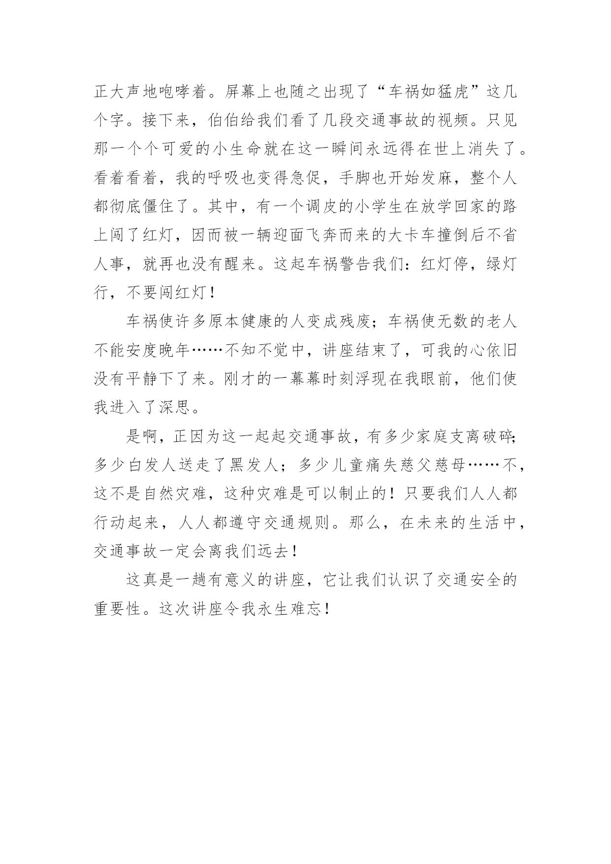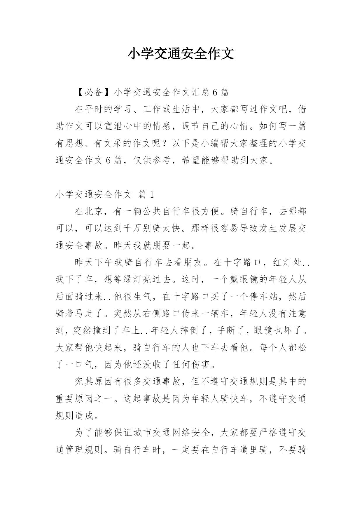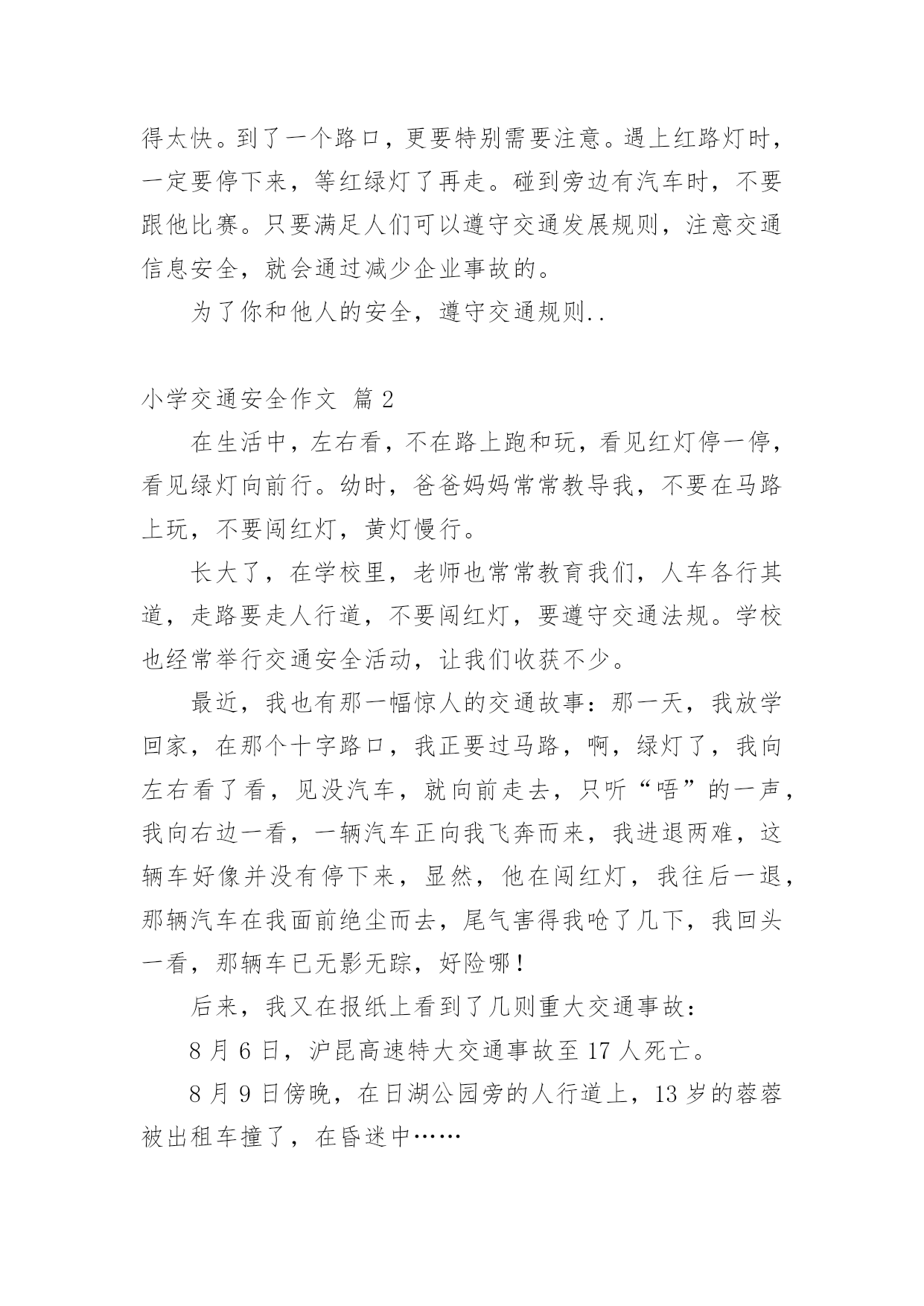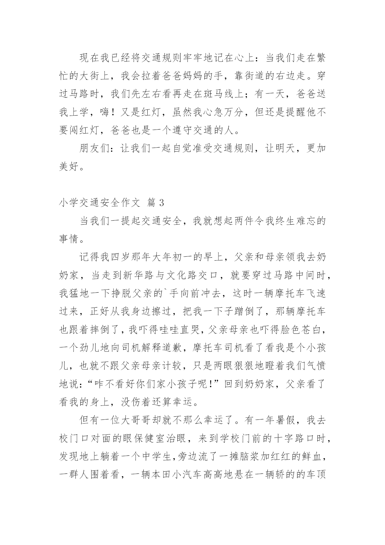 小学交通安全作文【必备】小学交通安全作文汇总6篇在平时的学习、工作或生活中,大家都写过作文吧,借助作文可以宣泄心中的情感,调节自己的心情。如何写一篇有思想、有文采的作文呢?以下是小编帮大家整理的小学交通安全作文6篇,仅供参考,希望能够帮助到大家。小学交通安全作文篇1在北京,有一辆公共自行车很方便。骑自行车,去哪都可以,可以达到千万别骑太快。那样很容易导致发生发展交通安全事故。昨天我就朋要一起。昨天下午我骑自行车去看朋友。在十字路口,红灯处..我下了车,想等绿灯亮过去。这时,一个戴眼镜的年轻人从后面骑过来..他很生气,在十字路口买了一个停车站,然后骑着马走了。突然从右侧路口传来一辆车,年轻人没有注意到,突然撞到了车上..年轻人摔倒了,手断了,眼镜也坏了。大家帮他快起来,骑自行车的人也下车去看他。每个人都松了一口气,因为他还没收了任何伤害。究其原因有很多交通事故,但不遵守交通规则是其中的重要原因之一。这起事故是因为年轻人骑快车,不遵守交通规则造成。为了能够保证城市交通网络安全,大家都要严格遵守交通管理规则。骑自行车时,一定要在自行车道里骑,不要骑得太快。到了一个路口,更要特别需要注意。遇上红路灯时,一定要停下来,等红绿灯了再走。碰到旁边有汽车时,不要跟他比赛。只要满足人们可以遵守交通发展规则,注意交通信息安全,就会通过减少企业事故的。为了你和他人的安全,遵守交通规则..小学交通安全作文篇2在生活中,左右看,不在路上跑和玩,看见红灯停一停,看见绿灯向前行。幼时,爸爸妈妈常常教导我,不要在马路上玩,不要闯红灯,黄灯慢行。长大了,在学校里,老师也常常教育我们,人车各行其道,走路要走人行道,不要闯红灯,要遵守交通法规。学校也经常举行交通安全活动,让我们收获不少。最近,我也有那一幅惊人的交通故事:那一天,我放学回家,在那个十字路口,我正要过马路,啊,绿灯了,我向左右看了看,见没汽车,就向前走去,只听“唔”的一声,我向右边一看,一辆汽车正向我飞奔而来,我进退两难,这辆车好像并没有停下来,显然,他在闯红灯,我往后一退,那辆汽车在我面前绝尘而去,尾气害得我呛了几下,我回头一看,那辆车已无影无踪,好险哪!后来,我又在报纸上看到了几则重大交通事故:8月6日,沪昆高速特大交通事故至17人死亡。8月9日傍晚,在日湖公园旁的人行道上,13岁的蓉蓉被出租车撞了,在昏迷中……现在我已经将交通规则牢牢地记在心上:当我们走在繁忙的大街上,我会拉着爸爸妈妈的手,靠街道的右边走。穿过马路时,我们先左右看再走在斑马线上;有一天,爸爸送我上学,嗨!又是红灯,虽然我心急万分,但还是提醒他不要闯红灯,爸爸也是一个遵守交通的人。朋友们:让我们一起自觉准受交通规则,让明天,更加美好。小学交通安全作文篇3当我们一提起交通安全,我就想起两件令我终生难忘的事情。记得我四岁那年大年初一的早上,父亲和母亲领我去奶奶家,当走到新华路与文化路交口,就要穿过马路中间时,我猛地一下挣脱父亲的`手向前冲去,这时一辆摩托车飞速过来,正好从我身边擦过,把我一下子蹭倒了,那辆摩托车也跟着摔倒了,我吓得哇哇直哭,父亲母亲也吓得脸色苍白,一个劲儿地向司机解释道歉,摩托车司机看了看我是个小孩儿,也就不跟父亲母亲计较,只是两眼狠狠地瞪着我们气愤地说:“咋不看好你们家小孩子呢!”回到奶奶家,父亲看了看我的身上,没伤着还算幸运。但有一位大哥哥却就不那么幸运了。有一年暑假,我去校门口对面的眼保健室治眼,来到学校门前的十字路口时,发现地上躺着一个中学生,旁边流了一摊脑浆加红红的鲜血,一群人围着看,一辆本田小汽车高高地悬在一辆轿的的车顶上。我正非常疑惑,治眼的阿姨对我说:“事情是这样的:一个中学生正在骑自行车过马路,忽然一辆本田车冲过来,那个司机本想踩刹车,谁知因为刚学开车还不熟练,踩成了油门儿,车速太高,车子飞了起来,一下子撞倒了那个中学生,接着又飞到了一辆正在等红灯的轿的车上面!”听完了治眼阿姨说的话后,我心里终于明白交通事故的损伤有多大,一个鲜活的生命就这样离开了世界!我在想:假设那次我在马路上不乱奔跑,也许就不会被撞倒;假设那个司机开车慢一点儿,或者那位大哥哥不横穿机动车道,也许,这位哥哥现在正在读书。正因为大家都没有遵守交通规则,所以才发生了这些事故。根据统计:世界上每分钟都会有一个交通事故发生,每天都有120万人因为交通事故而丧失生命。而生命对于每个人来说只有一次,生命对于每个人来说是最宝贵的,所以每个人都要珍惜生命,都要遵守交通规则。为此,我要提醒大家:过马路,不奔跑,行人应走人行道,安全知识要记牢;司机们,车速慢,看见红灯踩刹车,看见绿灯才起跑,酒后驾车不能要,交通安全要做到。最后,为了你和家人的安全,请大家自觉遵守交通规则,从现在做起吧!小学交通安全作文篇4遵守交通规则人人皆知,可偏偏有一部分人充耳不