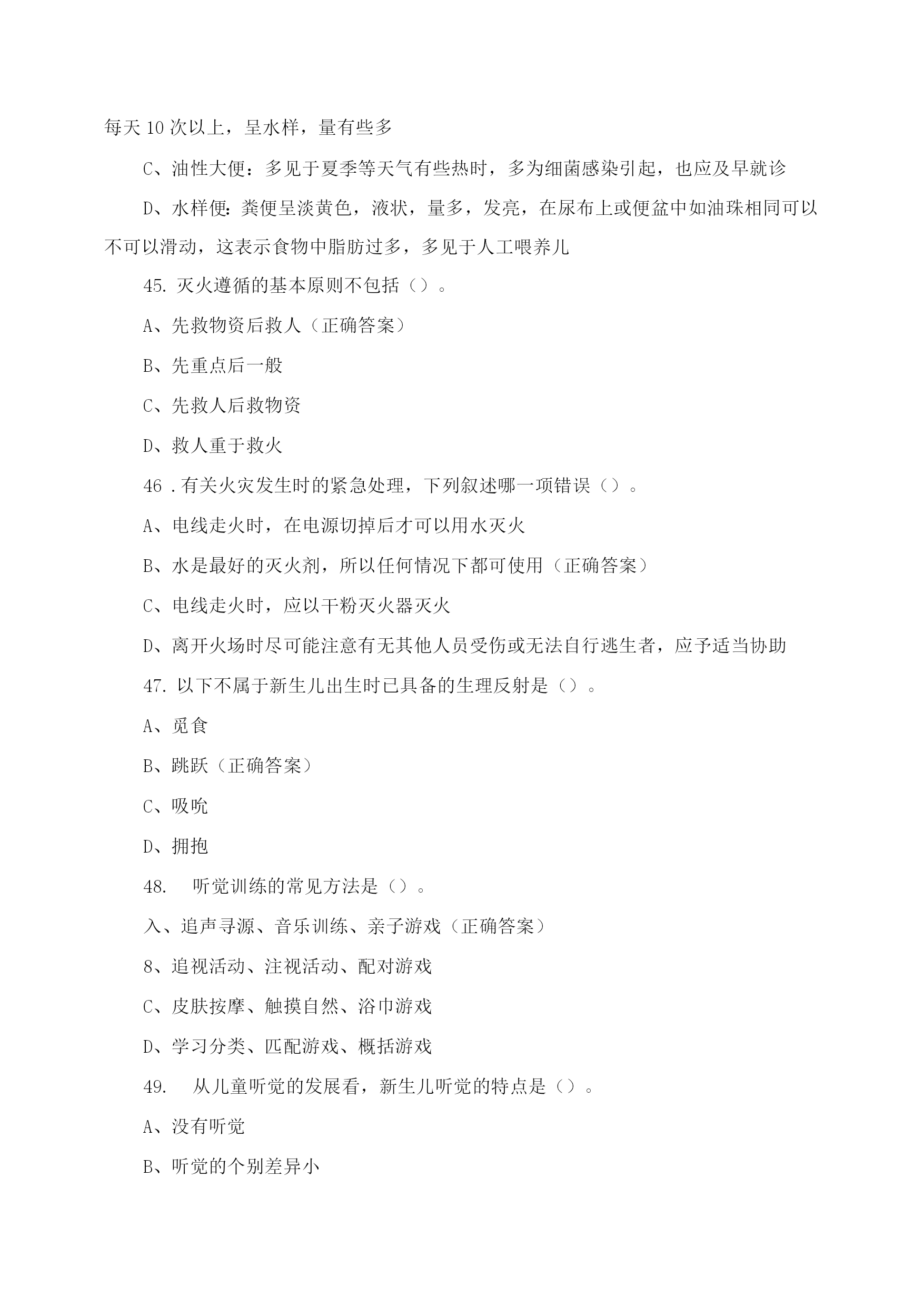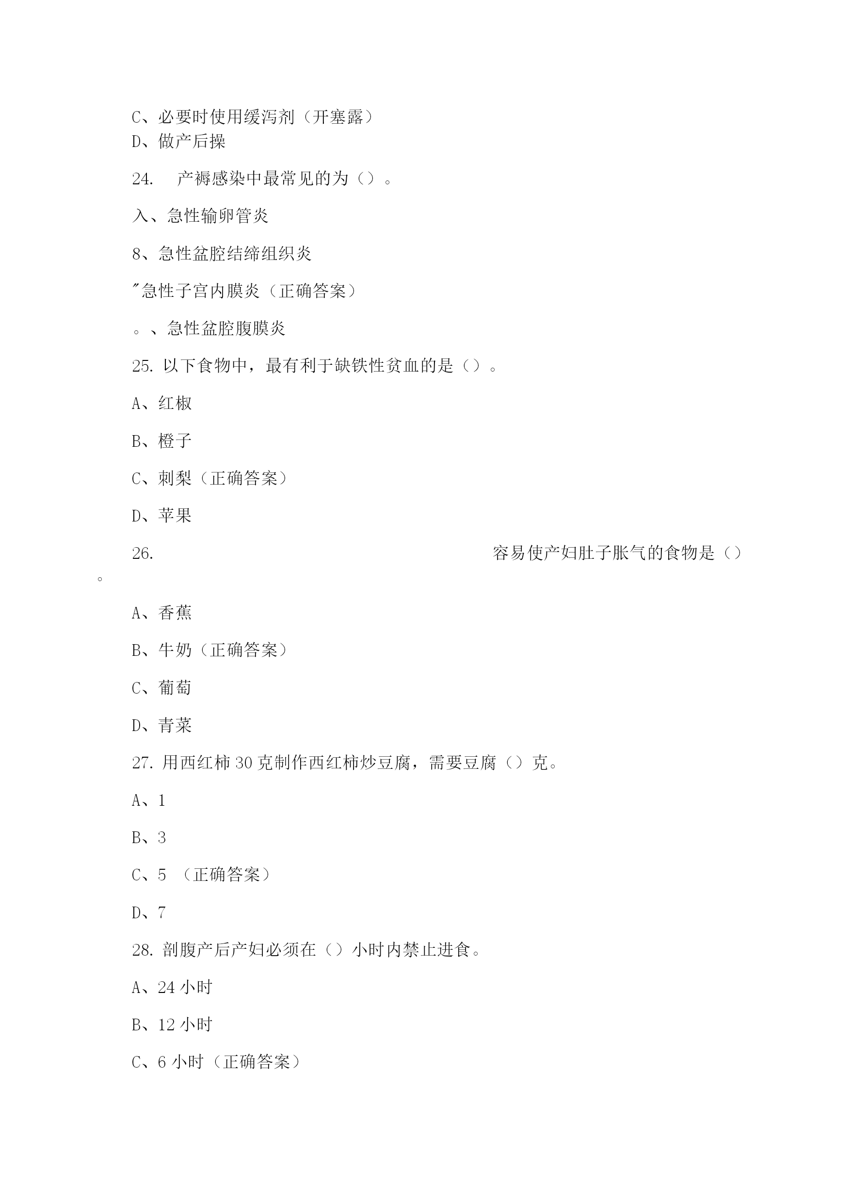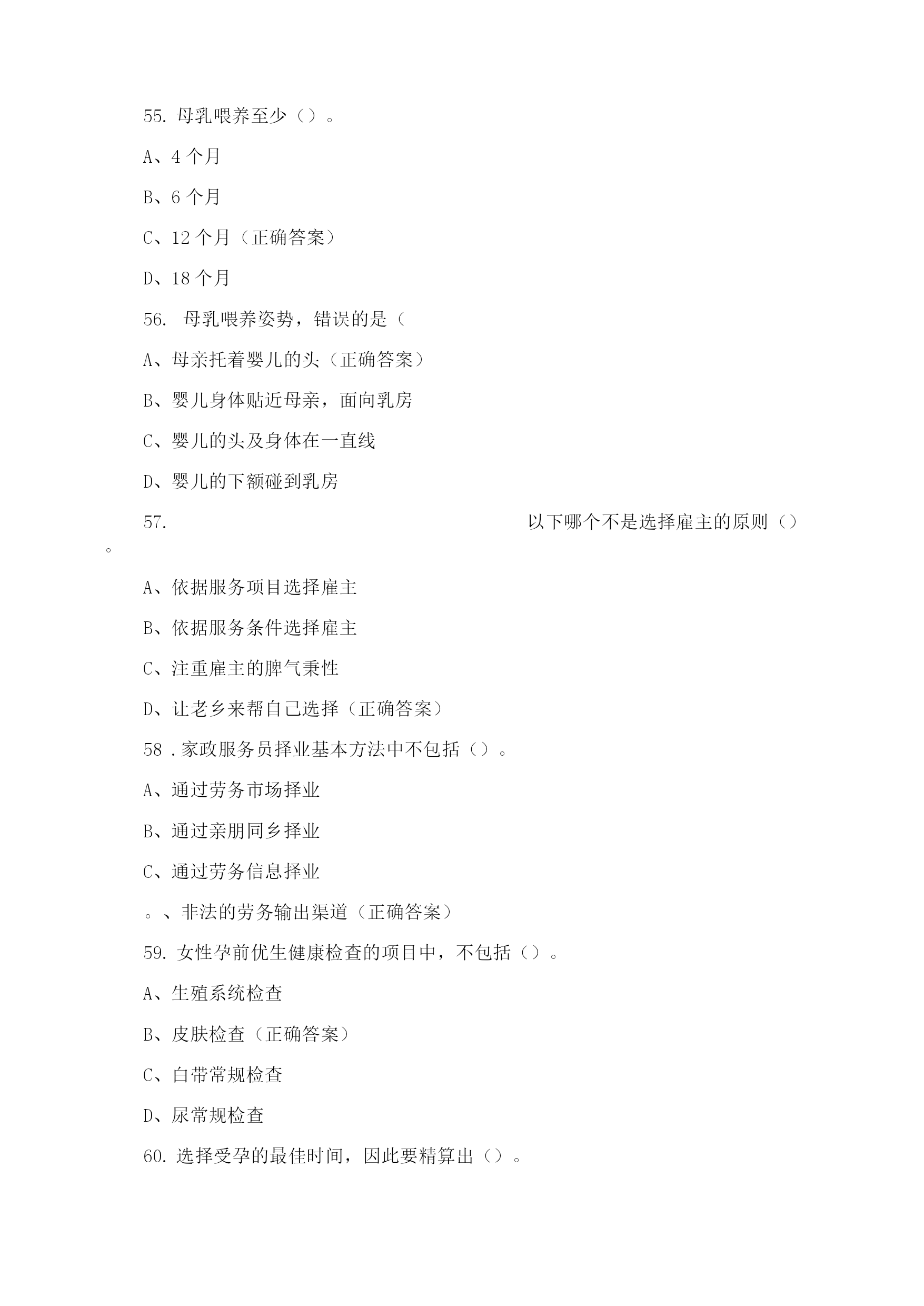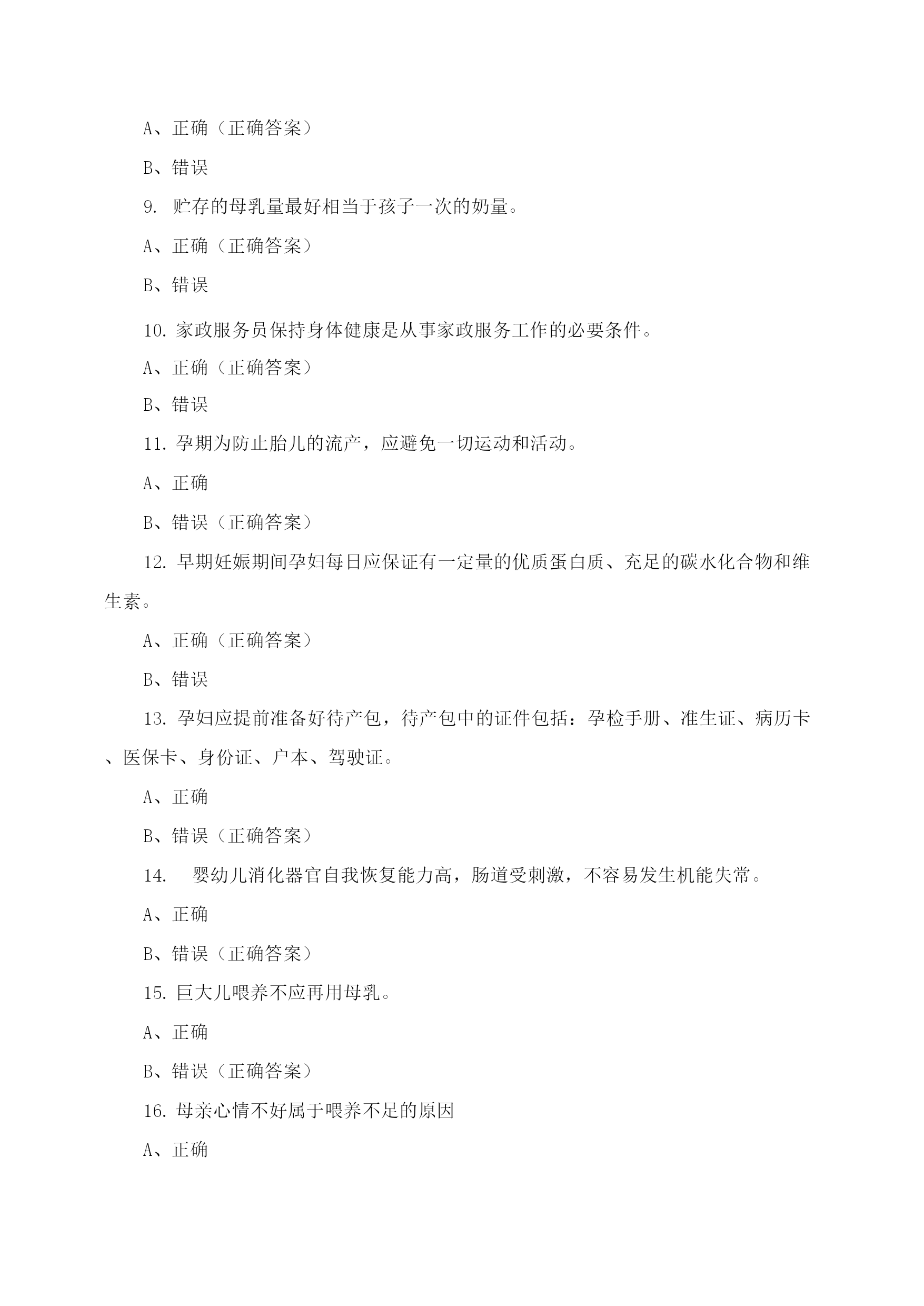 2022年育婴员中级理论试题与答案产后第一天如果妈妈身体虚弱或伤疼,可以采取侧卧位喂奶。对(正确答案)错制作海米烧菜花时,海米挑出虾壳,用清水漂洗干净后,要用2克开水浸泡备用。A、正确(正确答案)B、错误早期妊娠期间孕妇每日应保证有一定量的优质蛋白质、充足的碳水化合物和维生素。A、正确(正确答案)B、错误家庭服务及日常生活中面对不讲礼貌的年轻人可以大声呵斥。A、正确B、错误(正确答案)孕中期孕妇体内激素的增加,使乳腺腺管延长并扩展出分支。A、正确(正确答案)B、错误鱼肝油可以促进钙的吸收。A、正确(正确答案)B、错误触觉训练中可以提供粗糙程度不同的彩纸让幼儿进行抚摸感受。A、正确(正确答案)B、错误加强家政服务员的个人道德修养,关心家庭中每个成员是家政服务员履行职业道德的前提。A、正确(正确答案)B、错误贮存的母乳量最好相当于孩子一次的奶量。A、正确(正确答案)B、错误家政服务员保持身体健康是从事家政服务工作的必要条件。A、正确(正确答案)B、错误孕期为防止胎儿的流产,应避免一切运动和活动。A、正确B、错误(正确答案)早期妊娠期间孕妇每日应保证有一定量的优质蛋白质、充足的碳水化合物和维生素。A、正确(正确答案)B、错误孕妇应提前准备好待产包,待产包中的证件包括:孕检手册、准生证、病历卡、医保卡、身份证、户本、驾驶证。A、正确B、错误(正确答案)婴幼儿消化器官自我恢复能力高,肠道受刺激,不容易发生机能失常。A、正确B、错误(正确答案)巨大儿喂养不应再用母乳。A、正确B、错误(正确答案)母亲心情不好属于喂养不足的原因A、正确B、错误(正确答案)婴幼儿肺炎可有病毒或细菌引起,多由上呼吸道感染或急性支气管炎向下蔓延所致。A、正确(正确答案)B、错误按需哺乳:婴儿有吃奶的愿望,可以随时喂哺。A、正确(正确答案)B、错误(刚装修完的儿童房,只要没有味道就可以入住。A、正确B、错误(正确答案)20.1.5岁以后,婴幼儿说话的积极性开始高涨起来,说出的词也大量增加,到2岁时可达2多个。A、正确(正确答案)B、错误尿潴留最常见的是()。A、神经原性膀胱尿潴留B、梗阻性尿潴留(正确答案)C、药物性尿潴留D、精神性尿潴留产后恢复操一般在产后()练习。A、出院就能做B、一周C、两周D、至少三周后(正确答案)23.对于产后便秘的护理措施错误的是()。A、多吃含膳食纤维的食物B、减少下床活动(正确答案)C、必要时使用缓泻剂(开塞露)D、做产后操产褥感染中最常见的为()。入、急性输卵管炎8、急性盆腔结缔组织炎"急性子宫内膜炎(正确答案)。、急性盆腔腹膜炎以下食物中,最有利于缺铁性贫血的是()。A、红椒B、橙子C、刺梨(正确答案)D、苹果容易使产妇肚子胀气的食物是()。A、香蕉B、牛奶(正确答案)C、葡萄D、青菜用西红柿30克制作西红柿炒豆腐,需要豆腐()克。TOC\o"1-5"\h\zA、1B、3C、5(正确答案)D、7剖腹产后产妇必须在()小时内禁止进食。A、24小时B、12小时C、6小时(正确答案)D、10小时具有下奶的食物是(A、母鸡B、燕麦C、猪蹄(正确答案)D、啤酒TOC\o"1-5"\h\z产妇喝红糖水,不宜超过()。A、15天(正确答案)B、20天C、25天D、30天煲汤应猛火煲滚后转为()。A、小火(正确答案)B、旺火C、中火D、关火如果恶露不下,下列食物可首选的是()。A、三七粥(正确答案)B、当归羊肉羹C、黄芪羊肉汤。、大豆汤接听电话下列哪一项错误()。A、打电话,先报自己姓名B、接听长者电话,要先等长者挂断电话"亲自打电话给长者,不委请他人代打D、接电话,先安静不语,听听是谁(正确答案)客人进房后,通常请宾客坐上位,是指离()较远的位子。A、卧室B、窗户C、房门(正确答案)D、家具35.()是家政服务员的美德。入、自由散漫B、守时守信(正确答案)C、多劳少得D、不计报酬36.作为家政服务员,()才是正确的做法。A、买菜时尽量避免使用一次性塑料袋(正确答案)B、经常使用一次性餐盒,省去清洗的麻烦C、白天也要打开室内灯,增加室内亮度D、夏天空调尽量调低,以抵挡炎热37.有过()的孕妇,做乳头伸展牵拉练习要特别注意。A、流产、不孕史B、流产、早产史(正确答案)C、早产、不孕史D、不孕、早产史38.孕期的恐惧心理中尤以()心理比较普遍。A、怕畸胎和怕难产(正确答案)B、怕流产和怕难产C、怕畸胎和怕流产D、怕流产和怕顺产孕妇数胎动时