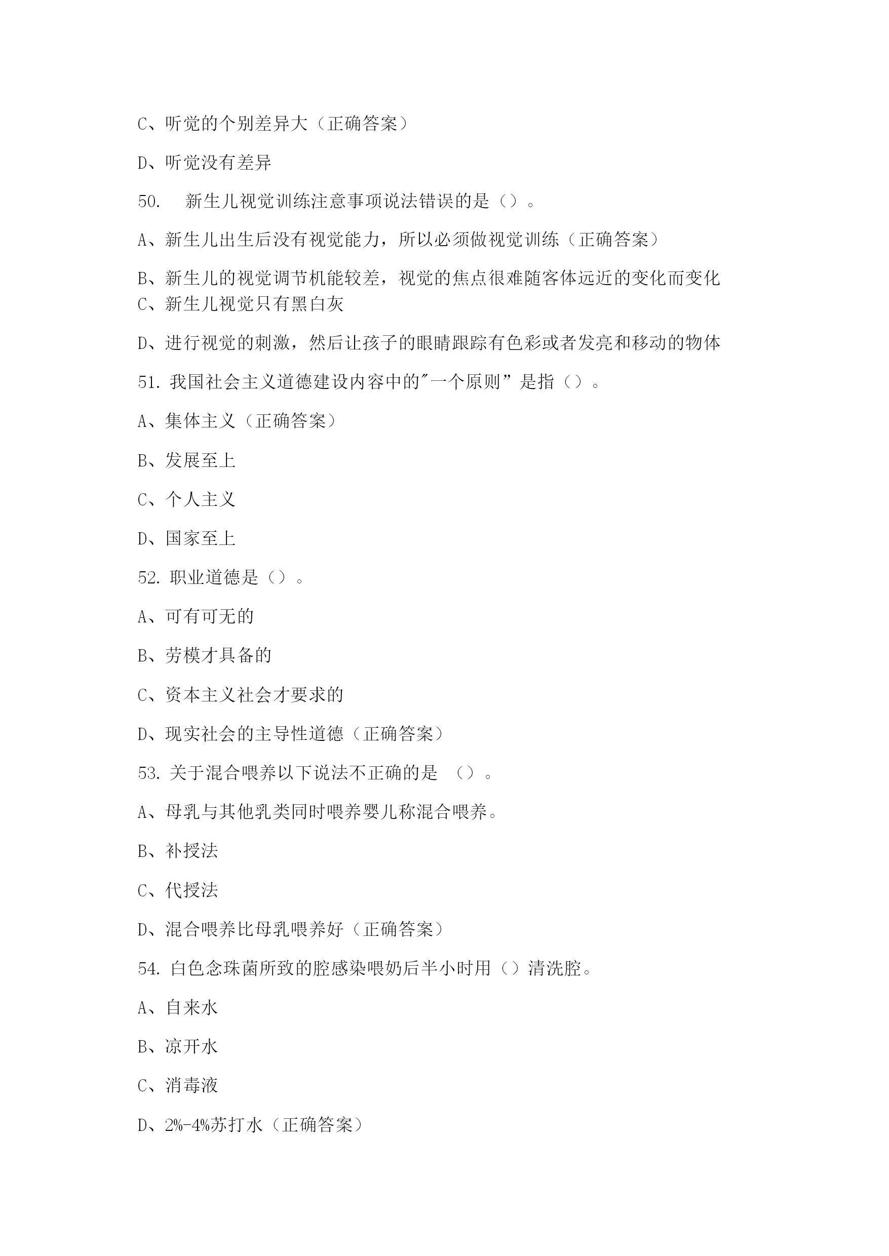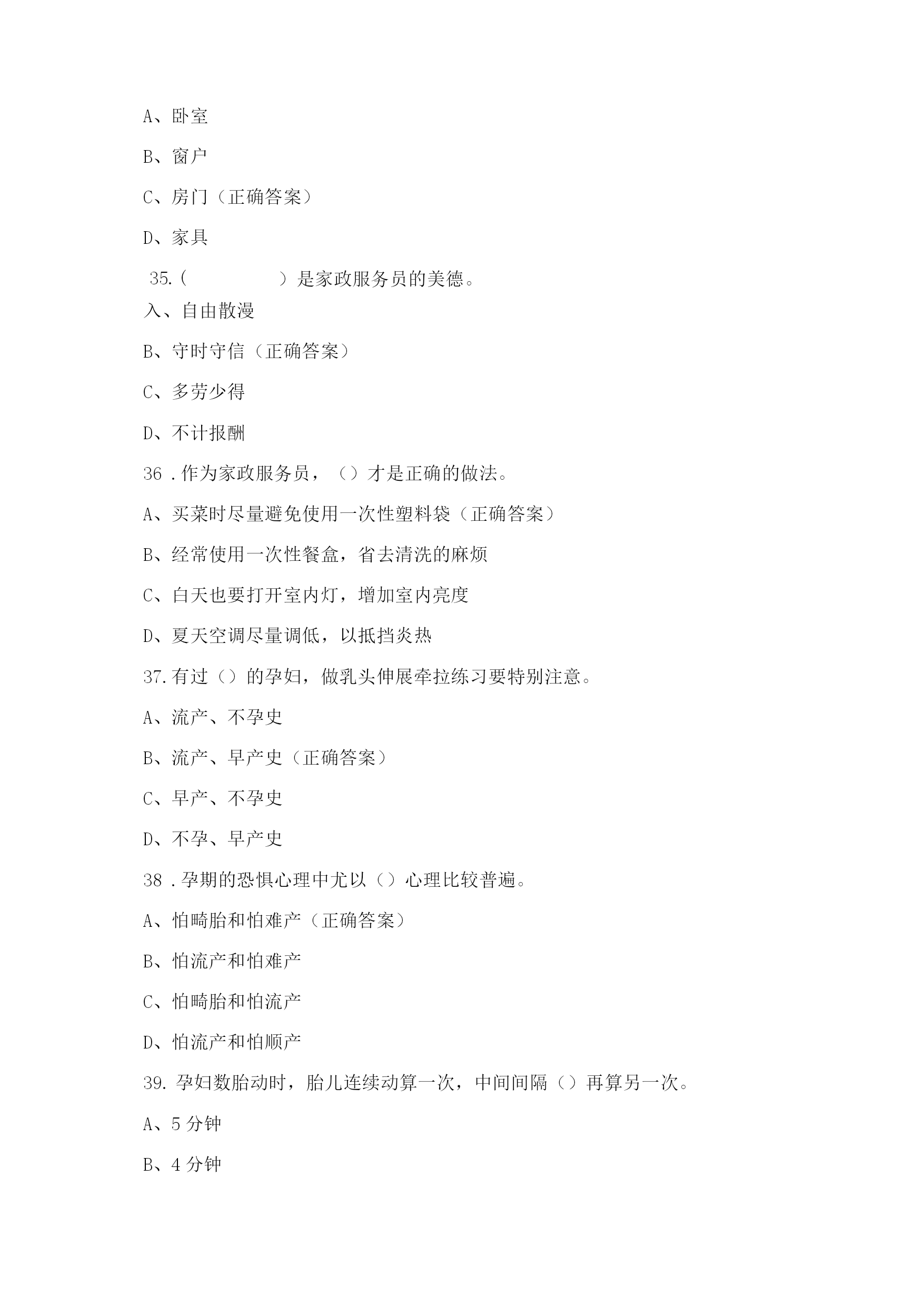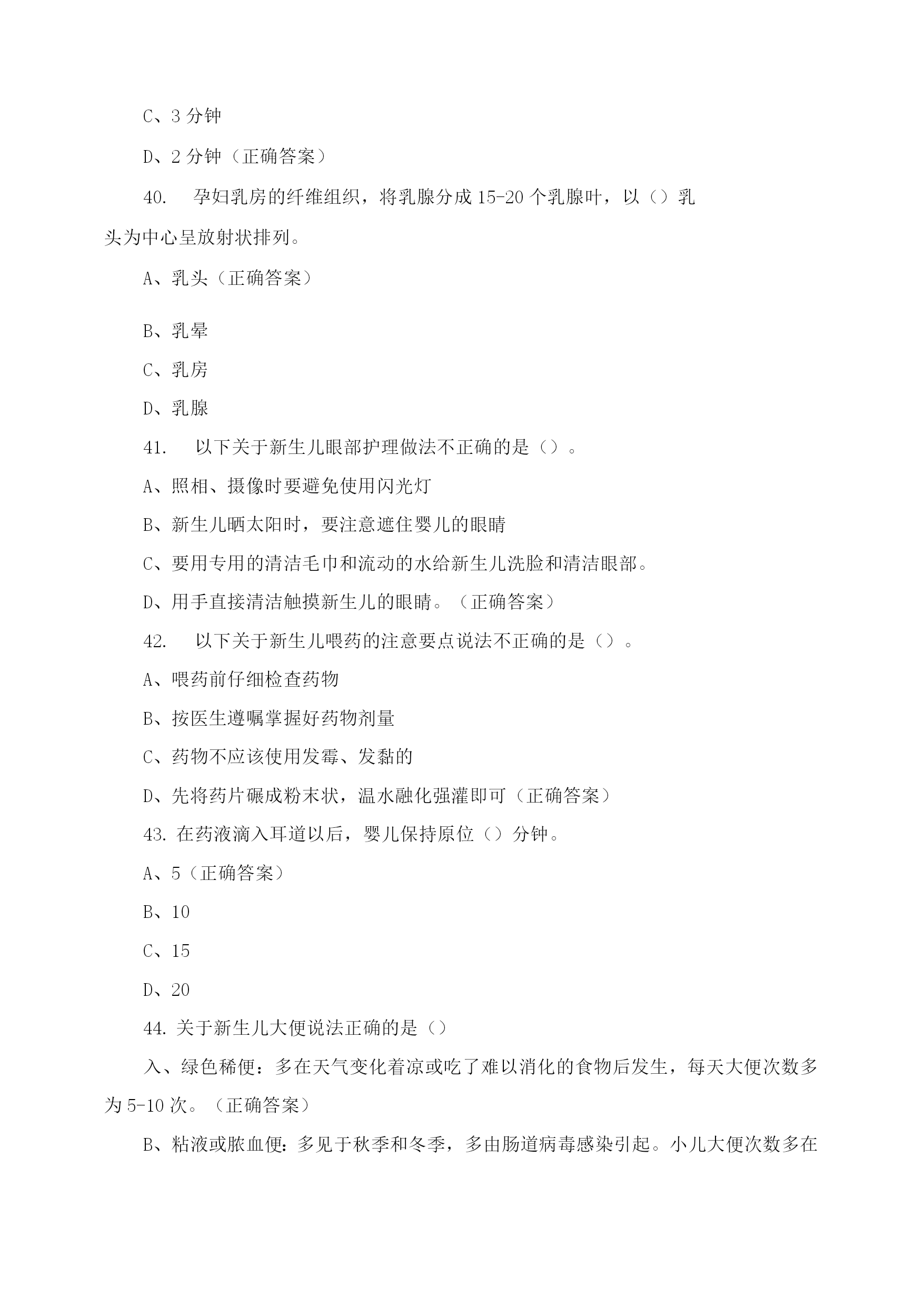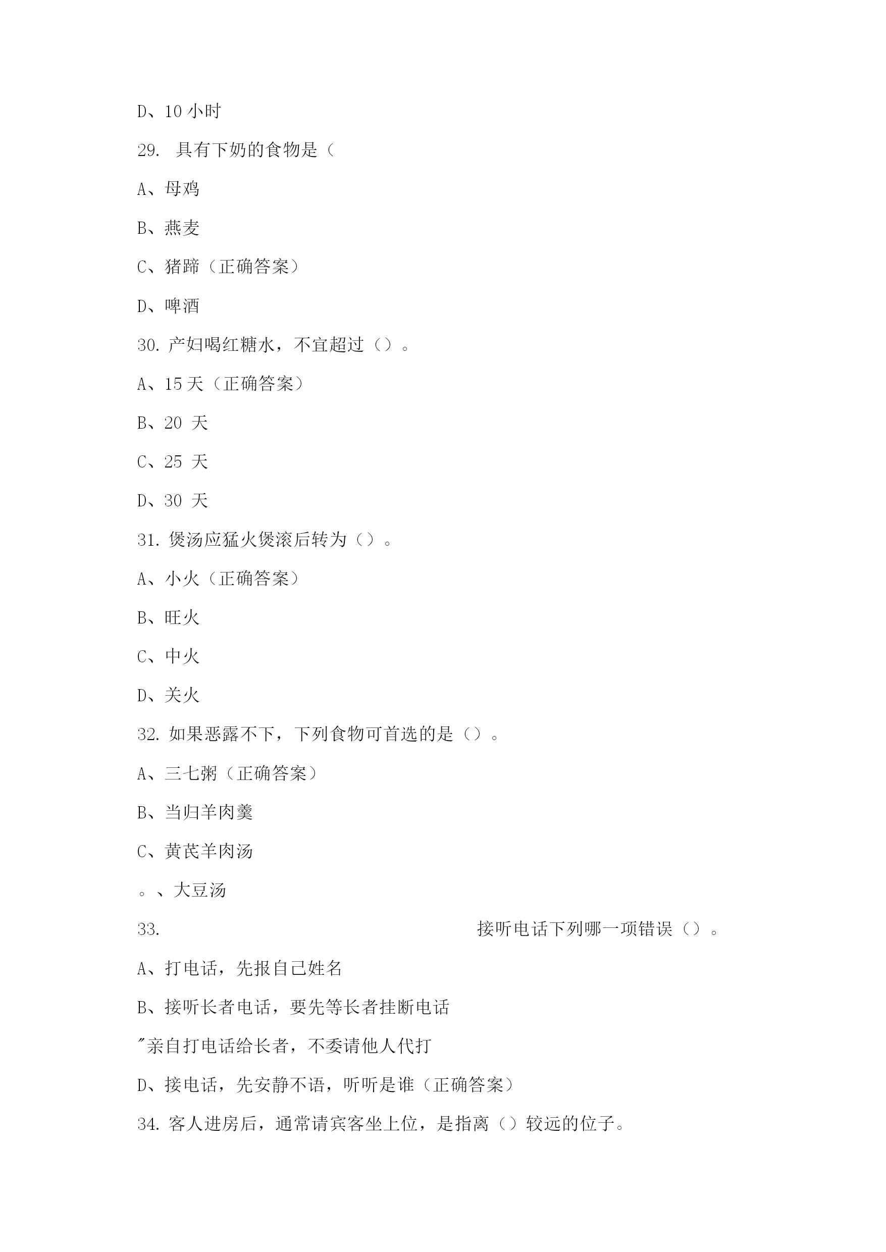 2022年育婴员中级理论试题与答案产后第一天如果妈妈身体虚弱或伤疼,可以采取侧卧位喂奶。对(正确答案)错制作海米烧菜花时,海米挑出虾壳,用清水漂洗干净后,要用2克开水浸泡备用。A、正确(正确答案)B、错误早期妊娠期间孕妇每日应保证有一定量的优质蛋白质、充足的碳水化合物和维生素。A、正确(正确答案)B、错误家庭服务及日常生活中面对不讲礼貌的年轻人可以大声呵斥。A、正确B、错误(正确答案)孕中期孕妇体内激素的增加,使乳腺腺管延长并扩展出分支。A、正确(正确答案)B、错误鱼肝油可以促进钙的吸收。A、正确(正确答案)B、错误触觉训练中可以提供粗糙程度不同的彩纸让幼儿进行抚摸感受。A、正确(正确答案)B、错误加强家政服务员的个人道德修养,关心家庭中每个成员是家政服务员履行职业道德的前提。A、正确(正确答案)B、错误贮存的母乳量最好相当于孩子一次的奶量。A、正确(正确答案)B、错误家政服务员保持身体健康是从事家政服务工作的必要条件。A、正确(正确答案)B、错误孕期为防止胎儿的流产,应避免一切运动和活动。A、正确B、错误(正确答案)早期妊娠期间孕妇每日应保证有一定量的优质蛋白质、充足的碳水化合物和维生素。A、正确(正确答案)B、错误孕妇应提前准备好待产包,待产包中的证件包括:孕检手册、准生证、病历卡、医保卡、身份证、户本、驾驶证。A、正确B、错误(正确答案)婴幼儿消化器官自我恢复能力高,肠道受刺激,不容易发生机能失常。A、正确B、错误(正确答案)巨大儿喂养不应再用母乳。A、正确B、错误(正确答案)母亲心情不好属于喂养不足的原因A、正确B、错误(正确答案)婴幼儿肺炎可有病毒或细菌引起,多由上呼吸道感染或急性支气管炎向下蔓延所致。A、正确(正确答案)B、错误按需哺乳:婴儿有吃奶的愿望,可以随时喂哺。A、正确(正确答案)B、错误(刚装修完的儿童房,只要没有味道就可以入住。A、正确B、错误(正确答案)20.1.5岁以后,婴幼儿说话的积极性开始高涨起来,说出的词也大量增加,到2岁时可达2多个。A、正确(正确答案)B、错误尿潴留最常见的是()。A、神经原性膀胱尿潴留B、梗阻性尿潴留(正确答案)C、药物性尿潴留D、精神性尿潴留产后恢复操一般在产后()练习。A、出院就能做B、一周C、两周D、至少三周后(正确答案)23.对于产后便秘的护理措施错误的是()。A、多吃含膳食纤维的食物B、减少下床活动(正确答案)C、必要时使用缓泻剂(开塞露)D、做产后操产褥感染中最常见的为()。入、急性输卵管炎8、急性盆腔结缔组织炎"急性子宫内膜炎(正确答案)。、急性盆腔腹膜炎以下食物中,最有利于缺铁性贫血的是()。A、红椒B、橙子C、刺梨(正确答案)D、苹果容易使产妇肚子胀气的食物是()。A、香蕉B、牛奶(正确答案)C、葡萄D、青菜用西红柿30克制作西红柿炒豆腐,需要豆腐()克。TOC\o"1-5"\h\zA、1B、3C、5(正确答案)D、7剖腹产后产妇必须在()小时内禁止进食。A、24小时B、12小时C、6小时(正确答案)D、10小时具有下奶的食物是(A、母鸡B、燕麦C、猪蹄(正确答案)D、啤酒TOC\o"1-5"\h\z产妇喝红糖水,不宜超过()。A、15天(正确答案)B、20天C、25天D、30天煲汤应猛火煲滚后转为()。A、小火(正确答案)B、旺火C、中火D、关火如果恶露不下,下列食物可首选的是()。A、三七粥(正确答案)B、当归羊肉羹C、黄芪羊肉汤。、大豆汤接听电话下列哪一项错误()。A、打电话,先报自己姓名B、接听长者电话,要先等长者挂断电话"亲自打电话给长者,不委请他人代打D、接电话,先安静不语,听听是谁(正确答案)客人进房后,通常请宾客坐上位,是指离()较远的位子。A、卧室B、窗户C、房门(正确答案)D、家具35.()是家政服务员的美德。入、自由散漫B、守时守信(正确答案)C、多劳少得D、不计报酬36.作为家政服务员,()才是正确的做法。A、买菜时尽量避免使用一次性塑料袋(正确答案)B、经常使用一次性餐盒,省去清洗的麻烦C、白天也要打开室内灯,增加室内亮度D、夏天空调尽量调低,以抵挡炎热37.有过()的孕妇,做乳头伸展牵拉练习要特别注意。A、流产、不孕史B、流产、早产史(正确答案)C、早产、不孕史D、不孕、早产史38.孕期的恐惧心理中尤以()心理比较普遍。A、怕畸胎和怕难产(正确答案)B、怕流产和怕难产C、怕畸胎和怕流产D、怕流产和怕顺产孕妇数胎动时