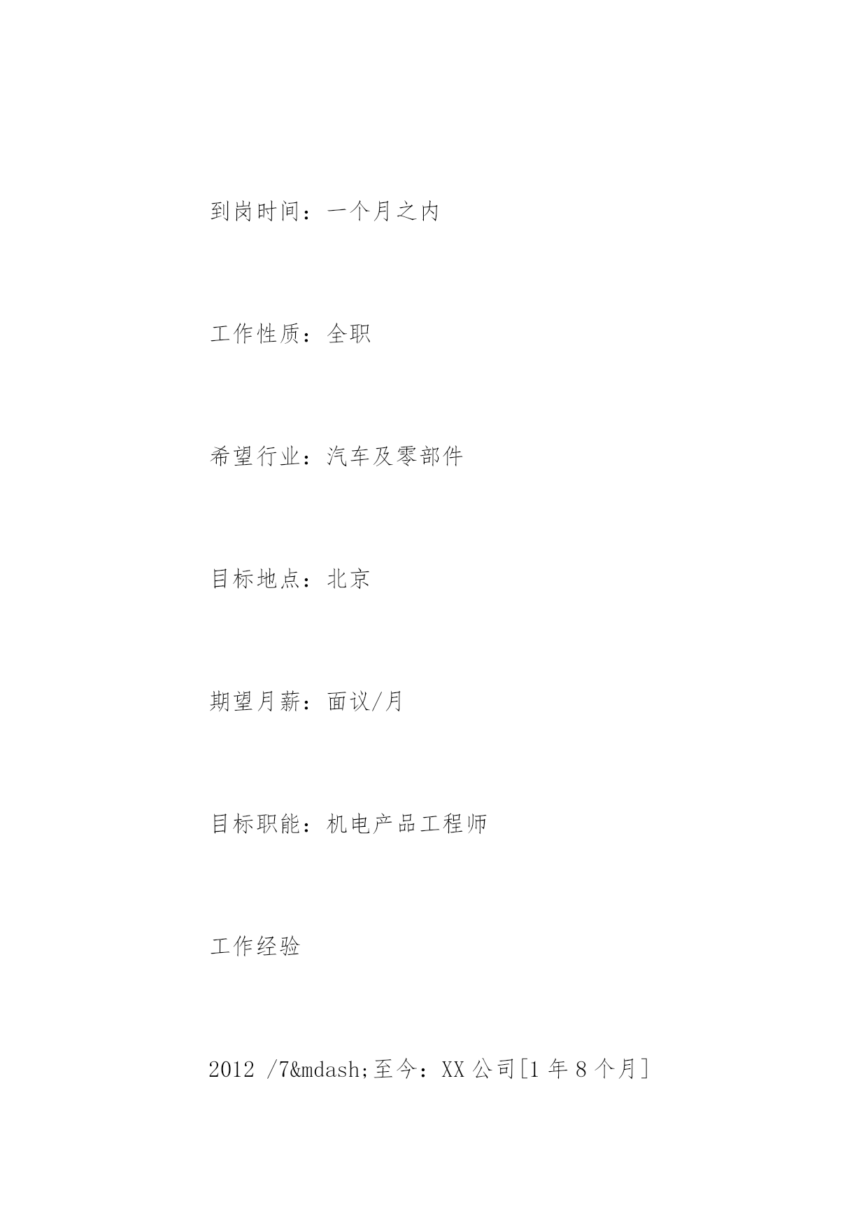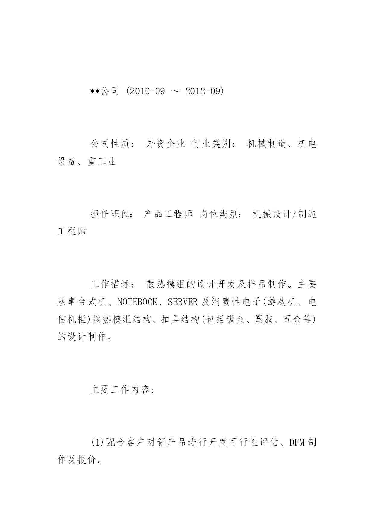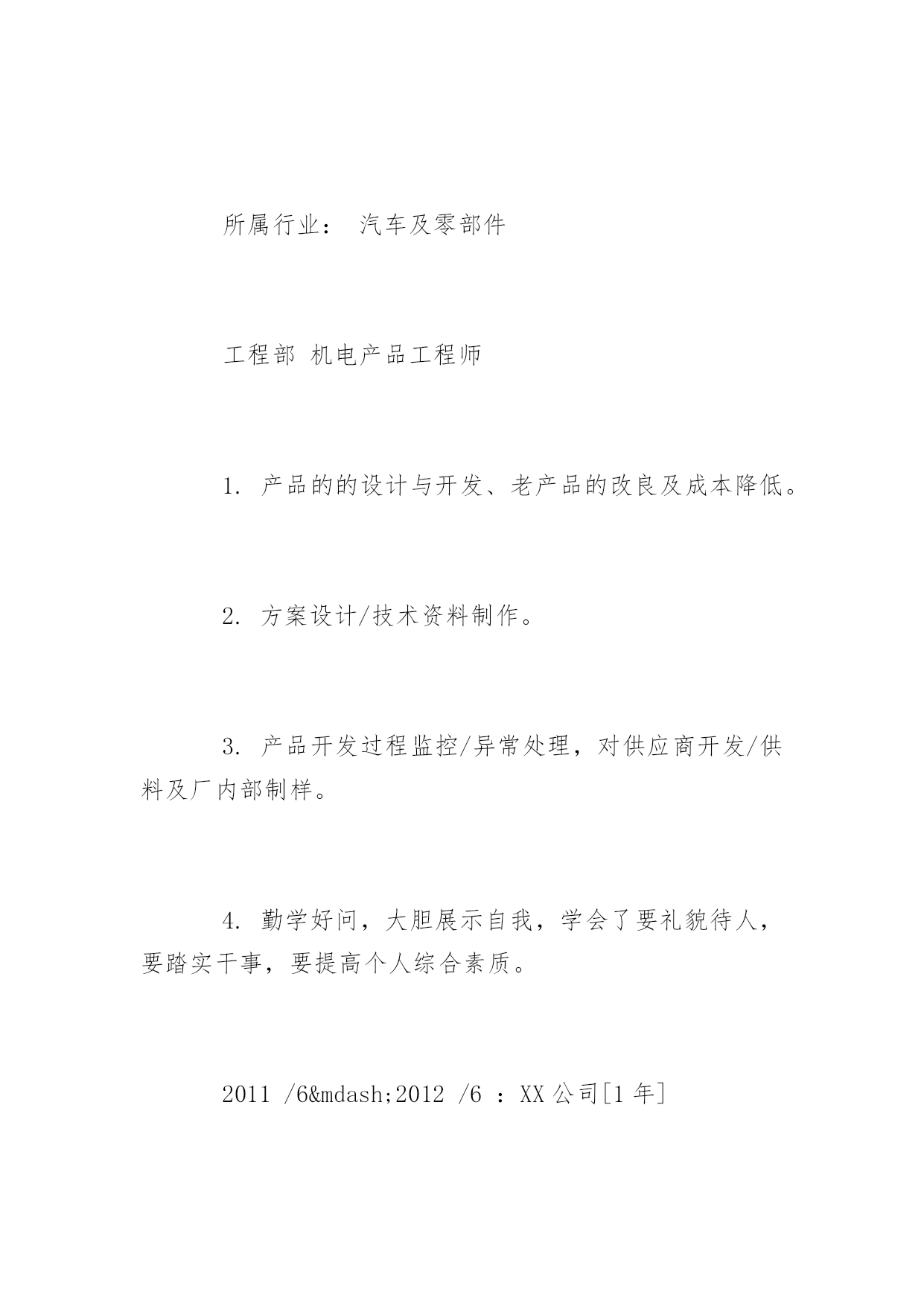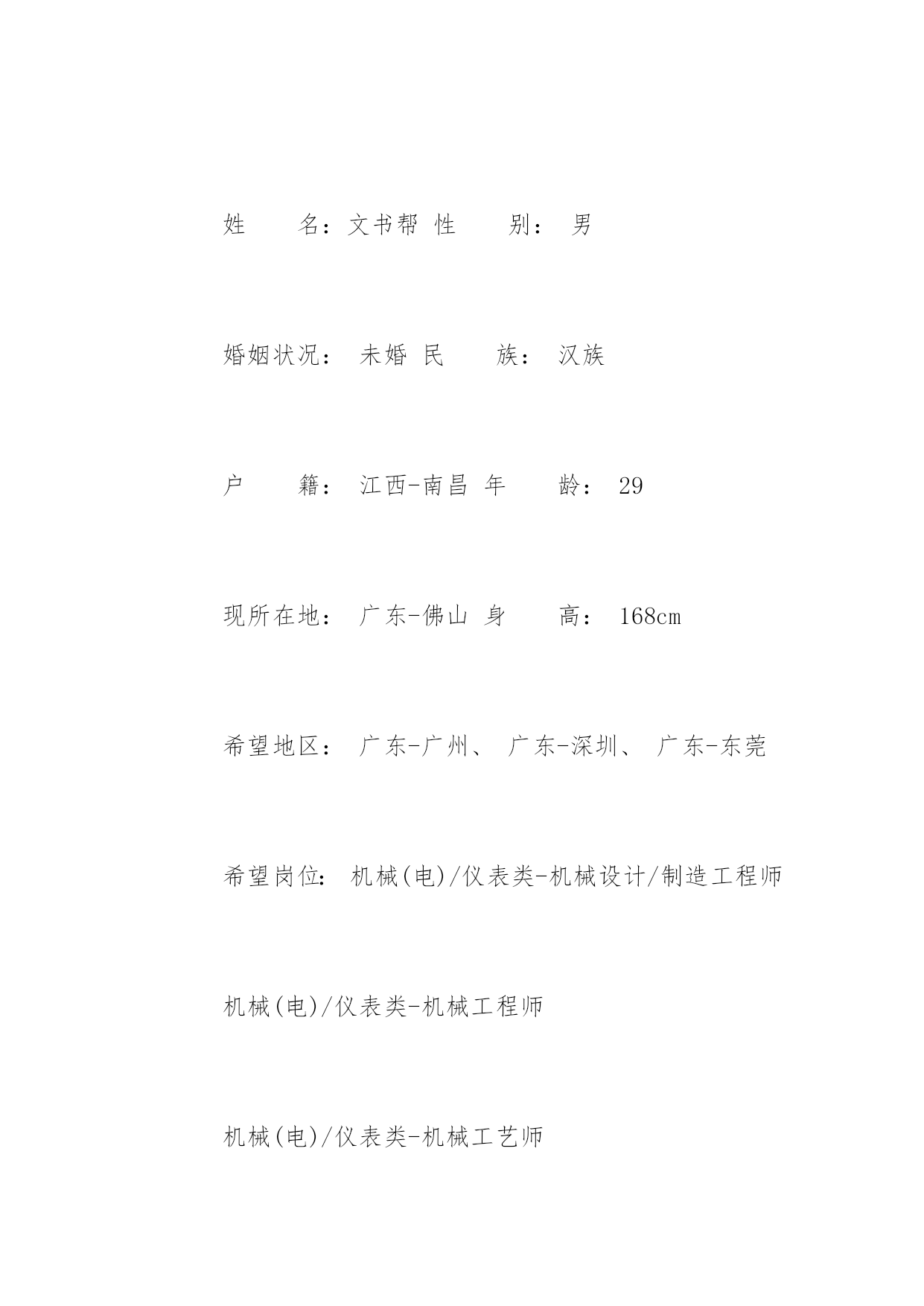 机电产品工程师专业简历机电产品工程师专业简历模板机电产品工程师简历样本姓名:文书帮三年以上工作经验|男|26岁(1987年10月16日)居住地:上海电话:139********(手机)E-mail:www.wenshubang.com最近工作[1年8个月]公司:XX公司行业:汽车及零部件职位:机电产品工程师最高学历学历:本科专业:机电一体化工程学校:XX职业学院求职意向到岗时间:一个月之内工作性质:全职希望行业:汽车及零部件目标地点:北京期望月薪:面议/月目标职能:机电产品工程师工作经验2012/7—至今:XX公司[1年8个月]所属行业:汽车及零部件工程部机电产品工程师1.产品的的设计与开发、老产品的改良及成本降低。2.方案设计/技术资料制作。3.产品开发过程监控/异常处理,对供应商开发/供料及厂内部制样。4.勤学好问,大胆展示自我,学会了要礼貌待人,要踏实干事,要提高个人综合素质。2011/6—2012/6:XX公司[1年]所属行业:汽车及零部件工程部产品助工1.模治具制作/验收、零部件加工及产品组装、出货。2.对整个产品开发过程进行管控;保证项目顺利进行。教育经历2007/9—2011/6XX职业学院机电一体化工程本科证书2009/6大学英语四级2008/12大学英语四级语言能力英语(良好)听说(良好),读写(良好)自我评价生活中尊敬家人,养成良好的生活习惯和正派的作风。工作中服从领导安排,做事认真踏实,一步一个脚印的前进此外,对时间观念十分重视。平时待人友好,与人相处十分融洽,对工作就应该严谨、实事求是;以解决问题、对事不对人、和谐高效配合、结果导向为工作原则,以客户最终真实需求为工作目的。机电产品工程师简历样本姓名:文书帮性别:男婚姻状况:未婚民族:汉族户籍:江西-南昌年龄:29现所在地:广东-佛山身高:168cm希望地区:广东-广州、广东-深圳、广东-东莞希望岗位:机械(电)/仪表类-机械设计/制造工程师机械(电)/仪表类-机械工程师机械(电)/仪表类-机械工艺师寻求职位:机械设计/制造、机械制图、汽车工程师教育经历2005-09~2007-07南昌大学科技技术学院机械制造及控制本科2002-09~2005-07江西机电学院机械设计制造及其自动化大专培训经历2006-09~2006-11南昌大学机电学院培训UG2004-08~2004-09南昌大学机电学院培训PRO/E**公司(2010-09~2012-09)公司性质:外资企业行业类别:机械制造、机电设备、重工业担任职位:产品工程师岗位类别:机械设计/制造工程师工作描述:散热模组的设计开发及样品制作。主要从事台式机、NOTEBOOK、SERVER及消费性电子(游戏机、电信机柜)散热模组结构、扣具结构(包括钣金、塑胶、五金等)的设计制作。主要工作内容:(1)配合客户对新产品进行开发可行性评估、DFM制作及报价。(2)产品规格的拟定,新产品整体结构及零件的设计。(3)使用Flotherm7.1对产品进行CFD模拟测试。(4)协调各部门对新产品进行制造性可行性评估。(5)样品的制作及测试。(6)模具、治具的开发及进度管控。找个人简历模板参考,就访问个人简历网http://www.geren-jianli.com(7)工作图面、产品BOM、包装规范的'设计和制作。(8)新产品的量产导入、工程变更及量产问题的检讨。离职原因:与公司的发展方向不一,欲寻找更好的发展空间**公司(2007-07~2010-09)公司性质:私营企业行业类别:家具、家电、工艺品、玩具担任职位:岗位类别:机械工程师工作描述:铝型材氧化电泳生产线相关设备的开发和设计及制造(包括轨道车、三排车及双桥式起重机)。(1)铝型材氧化电泳生产线原理设计及图纸绘制。(2)双桥式起重机结构设计。(3)贮存罐及非标设计。(4)工装治具的设计。(5)现场协调和指导设备的制作及安装。离职原因:想换个工作环境**公司(2006-08~2006-09)公司性质:国有企业行业类别:机械制造、机电设备、重工业担任职位:实习岗位类别:工作描述:在中国(洛阳)第一拖拉机厂和洛阳轴承厂参观实习,了解其产品的实现过程,加工零件的工装夹具和一些组合夹具结构设计,工程机械制造流程,如连杆、曲轴、油嘴的螺旋加工过程、轴承内圈的加工方法及整个产品装配过程。技能专长专业职称:中级钳工计算机水平:高校非计算机专业二级计算机详细技能:能够熟练使用计算机,对OFFICE、CAD、PRO/E等软件操作熟练技能专长:具有一定的项目管理与协调