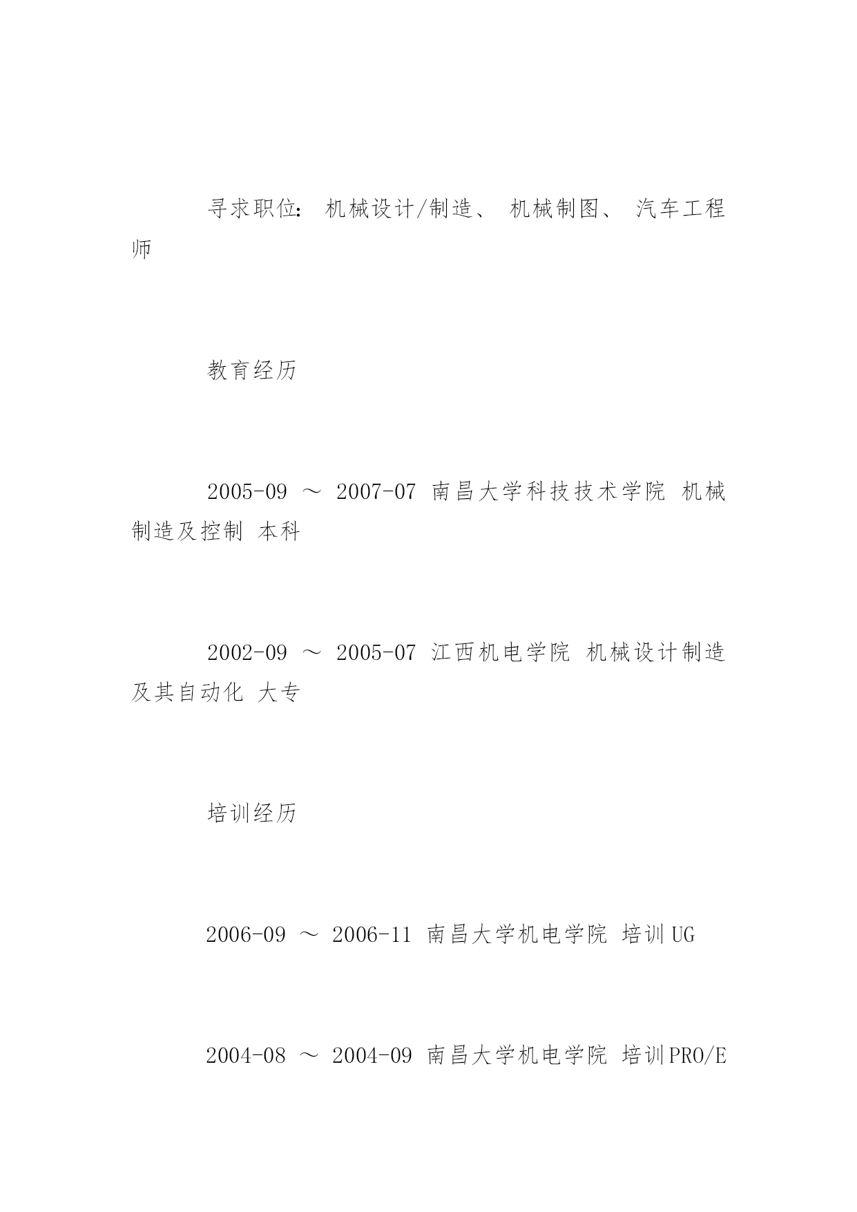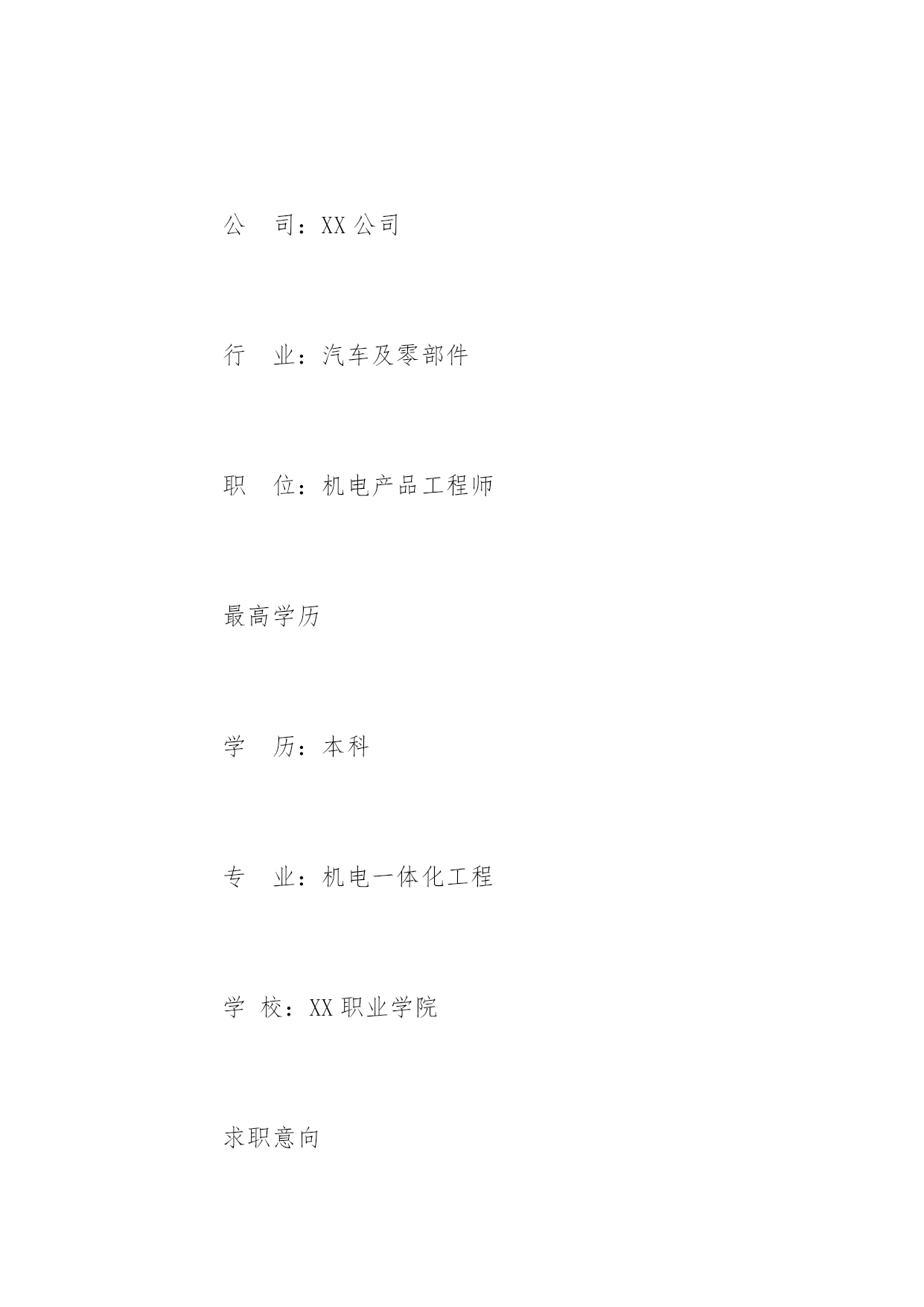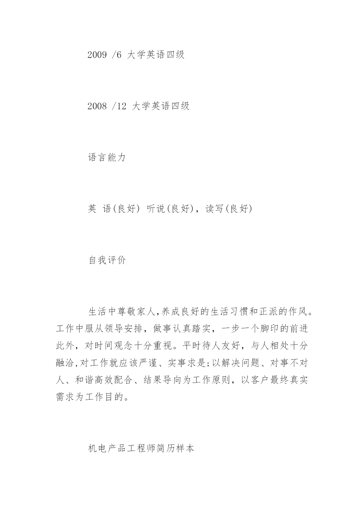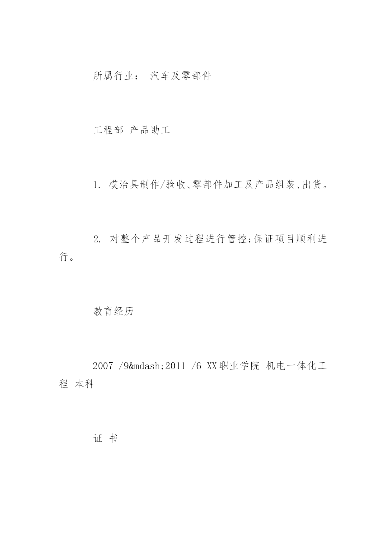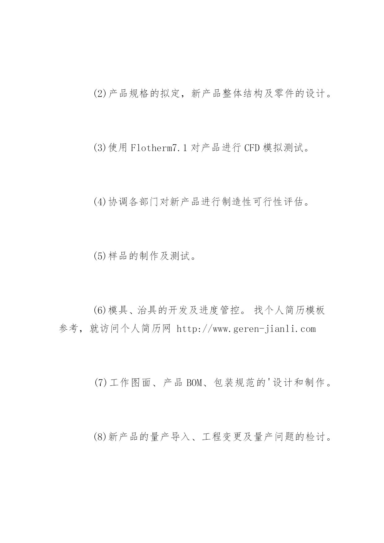 机电产品工程师专业简历机电产品工程师专业简历模板机电产品工程师简历样本姓名:文书帮三年以上工作经验|男|26岁(1987年10月16日)居住地:上海电话:139********(手机)E-mail:www.wenshubang.com最近工作[1年8个月]公司:XX公司行业:汽车及零部件职位:机电产品工程师最高学历学历:本科专业:机电一体化工程学校:XX职业学院求职意向到岗时间:一个月之内工作性质:全职希望行业:汽车及零部件目标地点:北京期望月薪:面议/月目标职能:机电产品工程师工作经验2012/7—至今:XX公司[1年8个月]所属行业:汽车及零部件工程部机电产品工程师1.产品的的设计与开发、老产品的改良及成本降低。2.方案设计/技术资料制作。3.产品开发过程监控/异常处理,对供应商开发/供料及厂内部制样。4.勤学好问,大胆展示自我,学会了要礼貌待人,要踏实干事,要提高个人综合素质。2011/6—2012/6:XX公司[1年]所属行业:汽车及零部件工程部产品助工1.模治具制作/验收、零部件加工及产品组装、出货。2.对整个产品开发过程进行管控;保证项目顺利进行。教育经历2007/9—2011/6XX职业学院机电一体化工程本科证书2009/6大学英语四级2008/12大学英语四级语言能力英语(良好)听说(良好),读写(良好)自我评价生活中尊敬家人,养成良好的生活习惯和正派的作风。工作中服从领导安排,做事认真踏实,一步一个脚印的前进此外,对时间观念十分重视。平时待人友好,与人相处十分融洽,对工作就应该严谨、实事求是;以解决问题、对事不对人、和谐高效配合、结果导向为工作原则,以客户最终真实需求为工作目的。机电产品工程师简历样本姓名:文书帮性别:男婚姻状况:未婚民族:汉族户籍:江西-南昌年龄:29现所在地:广东-佛山身高:168cm希望地区:广东-广州、广东-深圳、广东-东莞希望岗位:机械(电)/仪表类-机械设计/制造工程师机械(电)/仪表类-机械工程师机械(电)/仪表类-机械工艺师寻求职位:机械设计/制造、机械制图、汽车工程师教育经历2005-09~2007-07南昌大学科技技术学院机械制造及控制本科2002-09~2005-07江西机电学院机械设计制造及其自动化大专培训经历2006-09~2006-11南昌大学机电学院培训UG2004-08~2004-09南昌大学机电学院培训PRO/E**公司(2010-09~2012-09)公司性质:外资企业行业类别:机械制造、机电设备、重工业担任职位:产品工程师岗位类别:机械设计/制造工程师工作描述:散热模组的设计开发及样品制作。主要从事台式机、NOTEBOOK、SERVER及消费性电子(游戏机、电信机柜)散热模组结构、扣具结构(包括钣金、塑胶、五金等)的设计制作。主要工作内容:(1)配合客户对新产品进行开发可行性评估、DFM制作及报价。(2)产品规格的拟定,新产品整体结构及零件的设计。(3)使用Flotherm7.1对产品进行CFD模拟测试。(4)协调各部门对新产品进行制造性可行性评估。(5)样品的制作及测试。(6)模具、治具的开发及进度管控。找个人简历模板参考,就访问个人简历网http://www.geren-jianli.com(7)工作图面、产品BOM、包装规范的'设计和制作。(8)新产品的量产导入、工程变更及量产问题的检讨。离职原因:与公司的发展方向不一,欲寻找更好的发展空间**公司(2007-07~2010-09)公司性质:私营企业行业类别:家具、家电、工艺品、玩具担任职位:岗位类别:机械工程师工作描述:铝型材氧化电泳生产线相关设备的开发和设计及制造(包括轨道车、三排车及双桥式起重机)。(1)铝型材氧化电泳生产线原理设计及图纸绘制。(2)双桥式起重机结构设计。(3)贮存罐及非标设计。(4)工装治具的设计。(5)现场协调和指导设备的制作及安装。离职原因:想换个工作环境**公司(2006-08~2006-09)公司性质:国有企业行业类别:机械制造、机电设备、重工业担任职位:实习岗位类别:工作描述:在中国(洛阳)第一拖拉机厂和洛阳轴承厂参观实习,了解其产品的实现过程,加工零件的工装夹具和一些组合夹具结构设计,工程机械制造流程,如连杆、曲轴、油嘴的螺旋加工过程、轴承内圈的加工方法及整个产品装配过程。技能专长专业职称:中级钳工计算机水平:高校非计算机专业二级计算机详细技能:能够熟练使用计算机,对OFFICE、CAD、PRO/E等软件操作熟练技能专长:具有一定的项目管理与协调