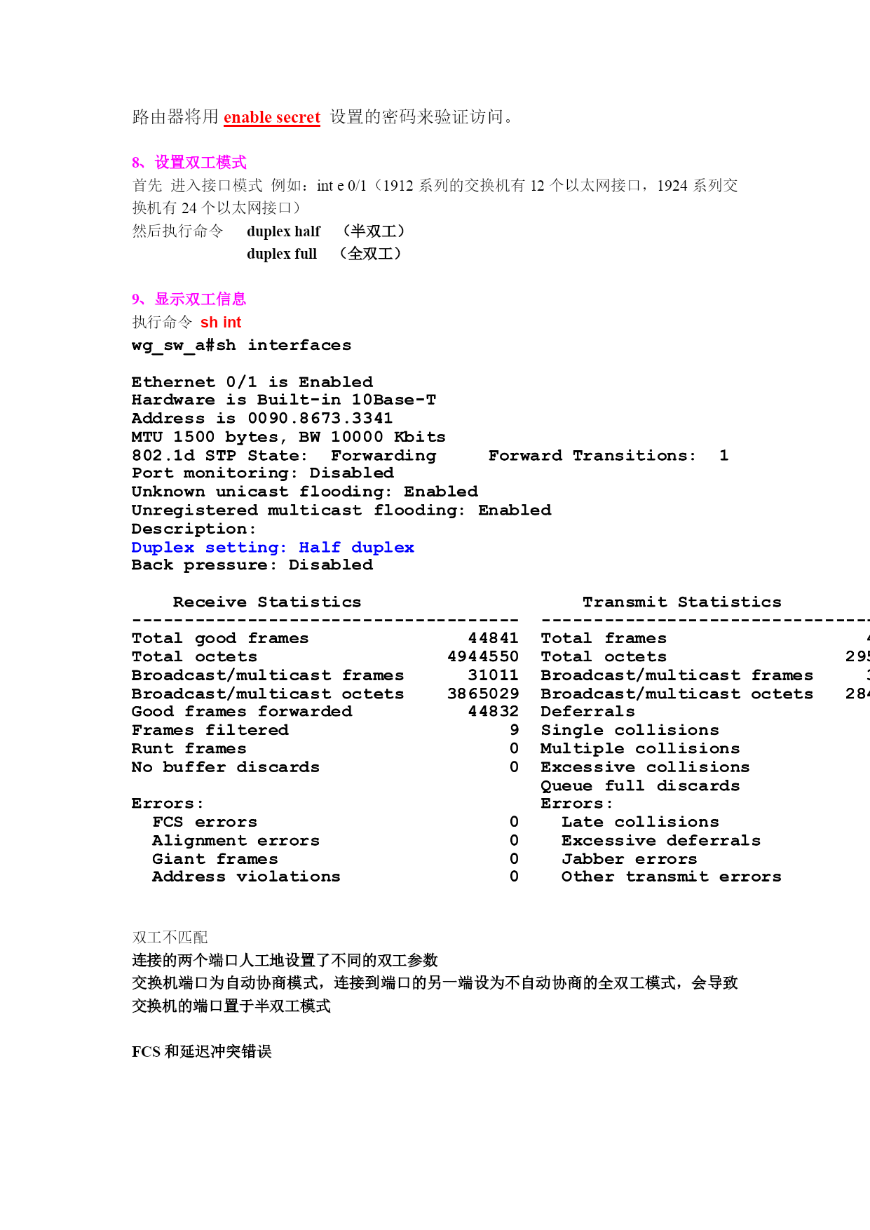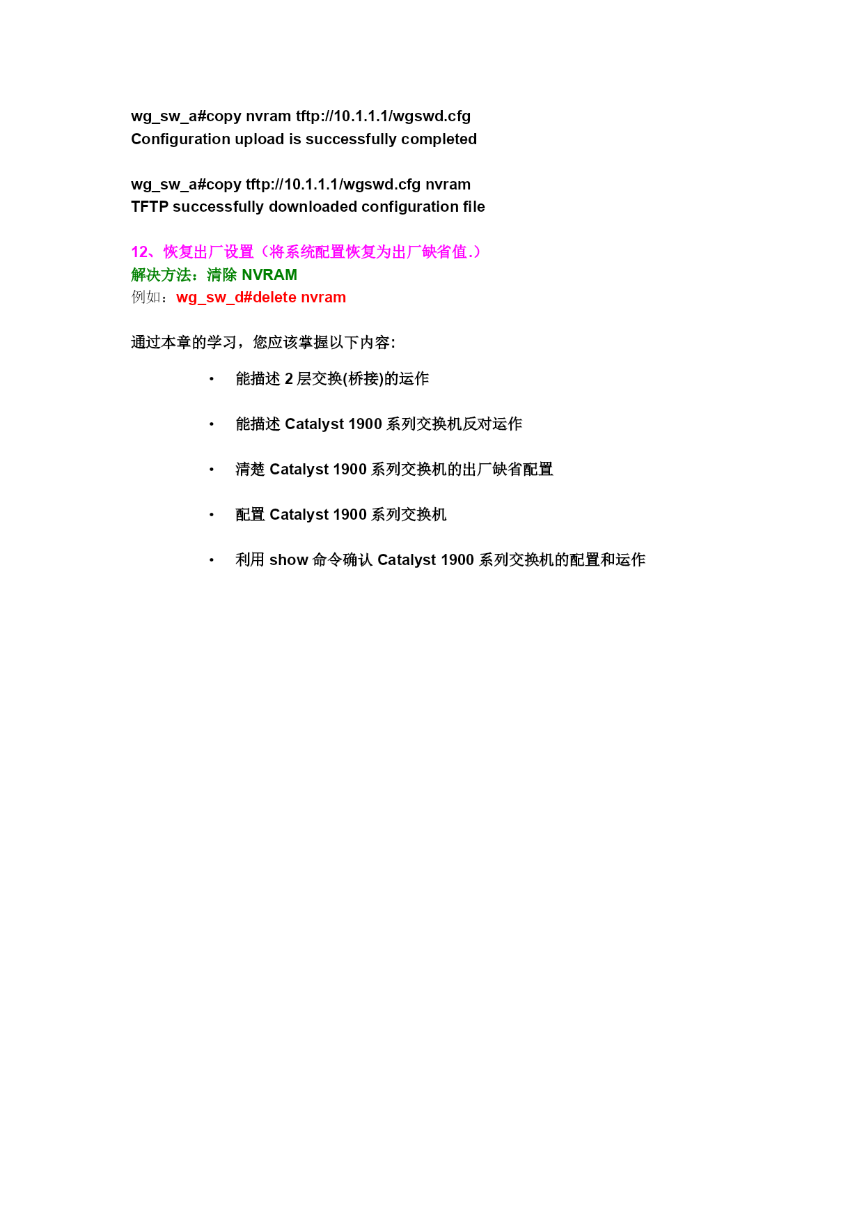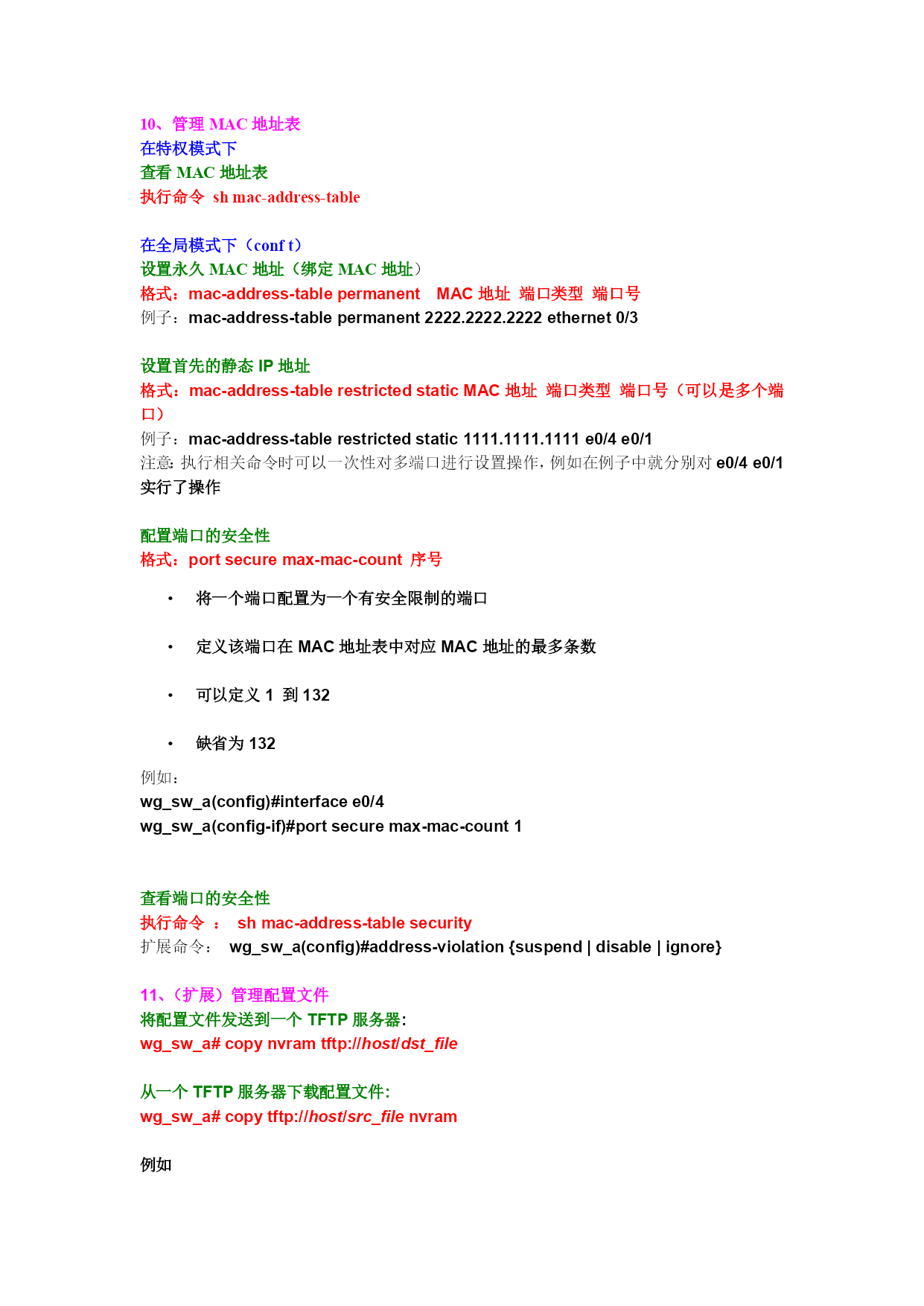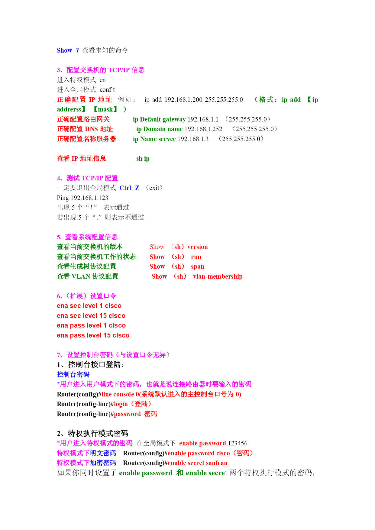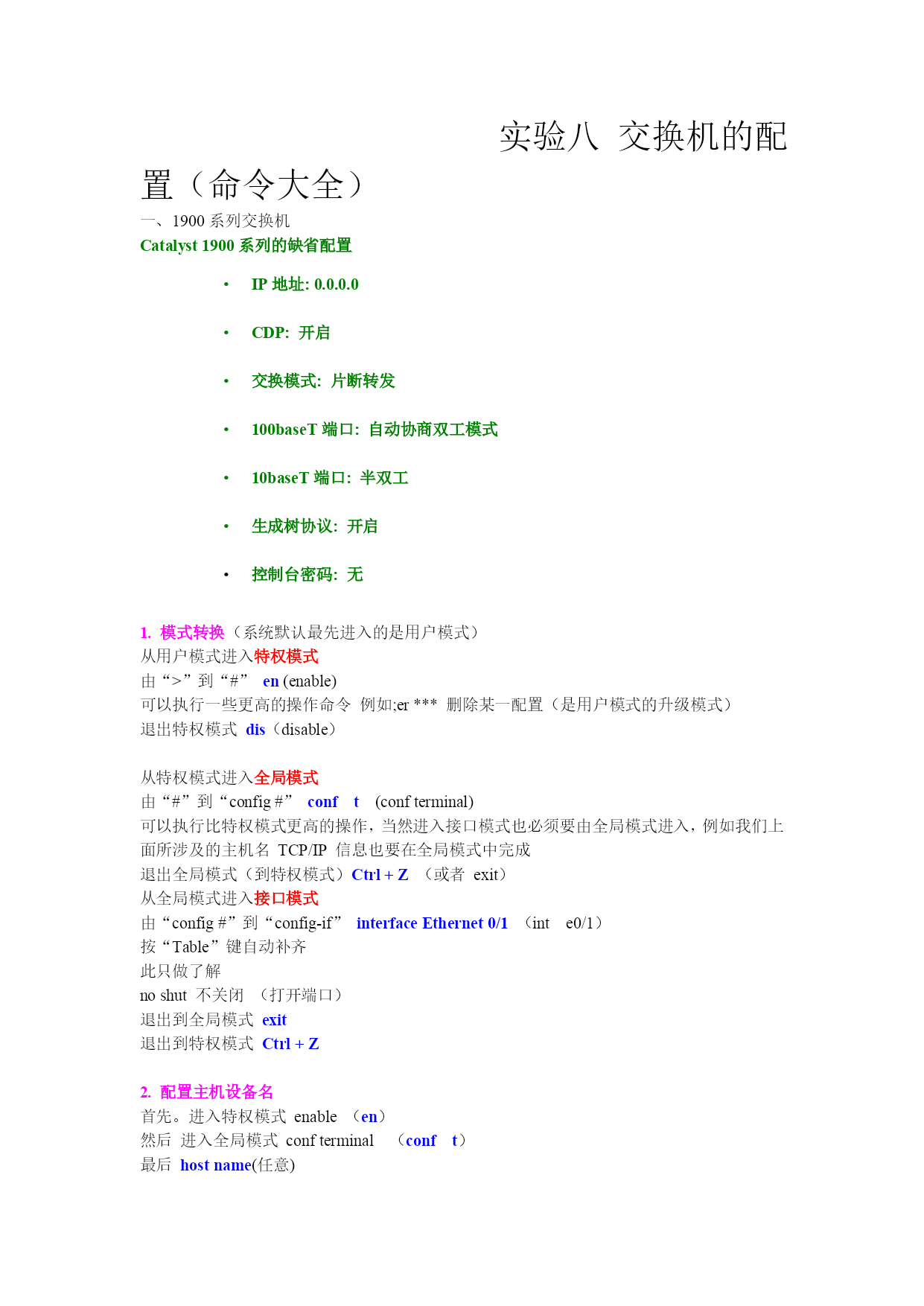 实验八交换机的配置(命令大全)一、1900系列交换机Catalyst1900系列的缺省配置IP地址:0.0.0.0CDP:开启交换模式:片断转发100baseT端口:自动协商双工模式10baseT端口:半双工生成树协议:开启控制台密码:无1.模式转换(系统默认最先进入的是用户模式)从用户模式进入特权模式由“>”到“#”en(enable)可以执行一些更高的操作命令例如;er***删除某一配置(是用户模式的升级模式)退出特权模式dis(disable)从特权模式进入全局模式由“#”到“config#”conft(confterminal)可以执行比特权模式更高的操作,当然进入接口模式也必须要由全局模式进入,例如我们上面所涉及的主机名TCP/IP信息也要在全局模式中完成退出全局模式(到特权模式)Ctrl+Z(或者exit)从全局模式进入接口模式由“config#”到“config-if”interfaceEthernet0/1(inte0/1)按“Table”键自动补齐此只做了解noshut不关闭(打开端口)退出到全局模式exit退出到特权模式Ctrl+Z2.配置主机设备名首先。进入特权模式enable(en)然后进入全局模式confterminal(conft)最后hostname(任意)Show?查看未知的命令3、配置交换机的TCP/IP信息进入特权模式en进入全局模式conft正确配置IP地址例如:ipadd192.168.1.200255.255.255.0(格式:ipadd【ipaddrerss】【mask】)正确配置路由网关ipDefaultgateway192.168.1.1(255.255.255.0)正确配置DNS地址ipDomainname192.168.1.252(255.255.255.0)正确配置名称服务器ipNameserver192.168.1.3(255.255.255.0)查看IP地址信息ship4、测试TCP/IP配置一定要退出全局模式Ctrl+Z(exit)Ping192.168.1.123出现5个“!”表示通过若出现5个“.”则表示不通过5.查看系统配置信息查看当前交换机的版本Show(sh)version查看当前交换机工作的状态Show(sh)run查看生成树协议配置Show(sh)span查看VLAN协议配置Show(sh)vlan-membership6、(扩展)设置口令enaseclevel1ciscoenaseclevel15ciscoenapasslevel1ciscoenapasslevel15cisco7、设置控制台密码(与设置口令无异)1、控制台接口登陆:控制台密码*用户进入用户模式下的密码,也就是说连接路由器时要输入的密码Router(config)#lineconsole0(系统默认进入的主控制台口号为0)Router(config-line)#login(登陆)Router(config-line)#password密码2、特权执行模式密码*用户进入特权模式的密码在全局模式下enablepassword123456特权模式下明文密码Router(config)#enablepasswordcisco(密码)特权模式下加密密码Router(config)#enablesecretsanfran如果你同时设置了enablepassword和enablesecret两个特权执行模式的密码,路由器将用enablesecret设置的密码来验证访问。8、设置双工模式首先进入接口模式例如:inte0/1(1912系列的交换机有12个以太网接口,1924系列交换机有24个以太网接口)然后执行命令duplexhalf(半双工)duplexfull(全双工)9、显示双工信息执行命令shint双工不匹配连接的两个端口人工地设置了不同的双工参数交换机端口为自动协商模式,连接到端口的另一端设为不自动协商的全双工模式,会导致交换机的端口置于半双工模式FCS和延迟冲突错误10、管理MAC地址表在特权模式下查看MAC地址表执行命令shmac-address-table在全局模式下(conft)设置永久MAC地址(绑定MAC地址)格式:mac-address-tablepermanentMAC地址端口类型端口号例子:mac-address-tablepermanent2222.2222.2222ethernet0/3设置首先的静态IP地址格式:mac-address-tablerestricted