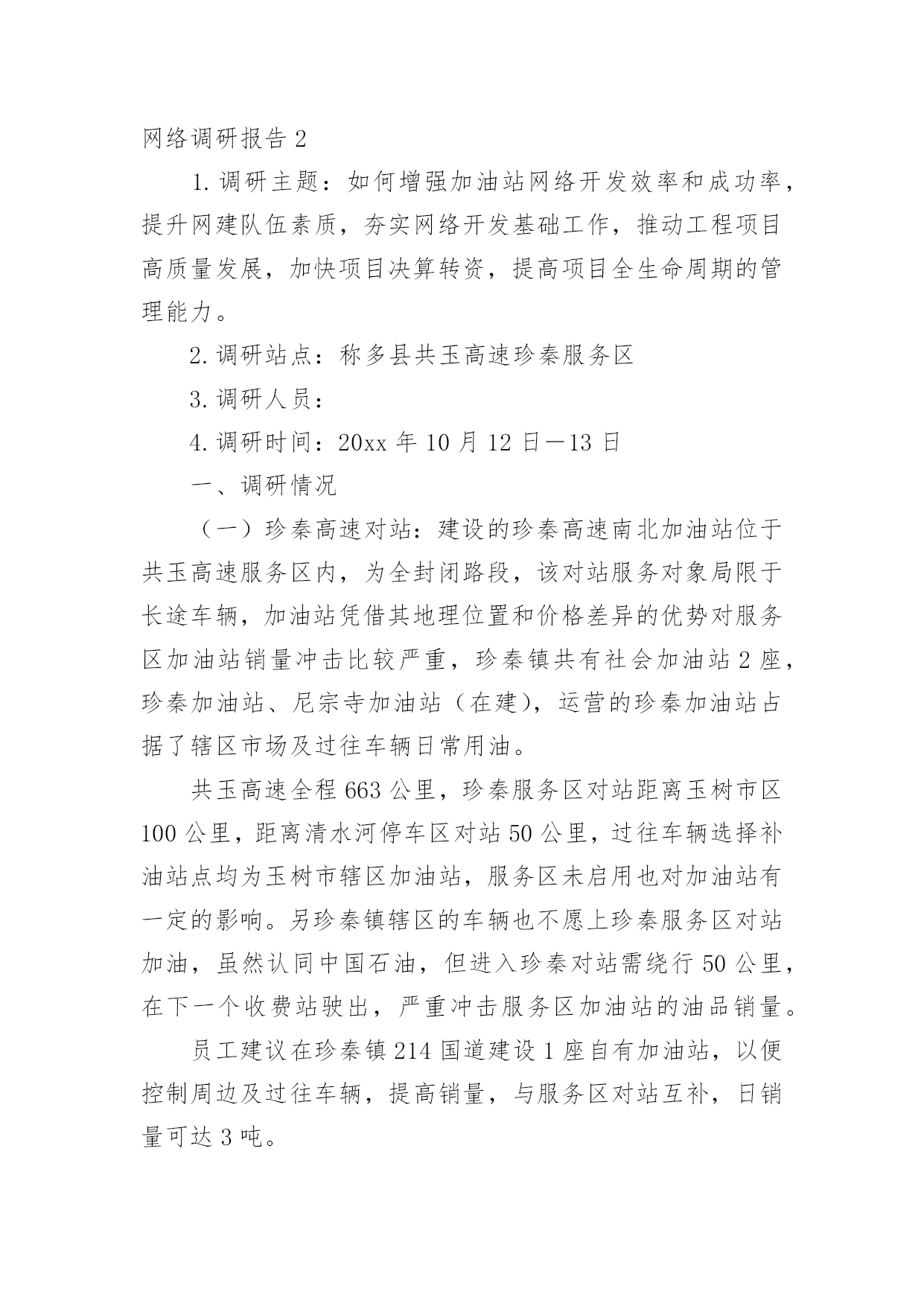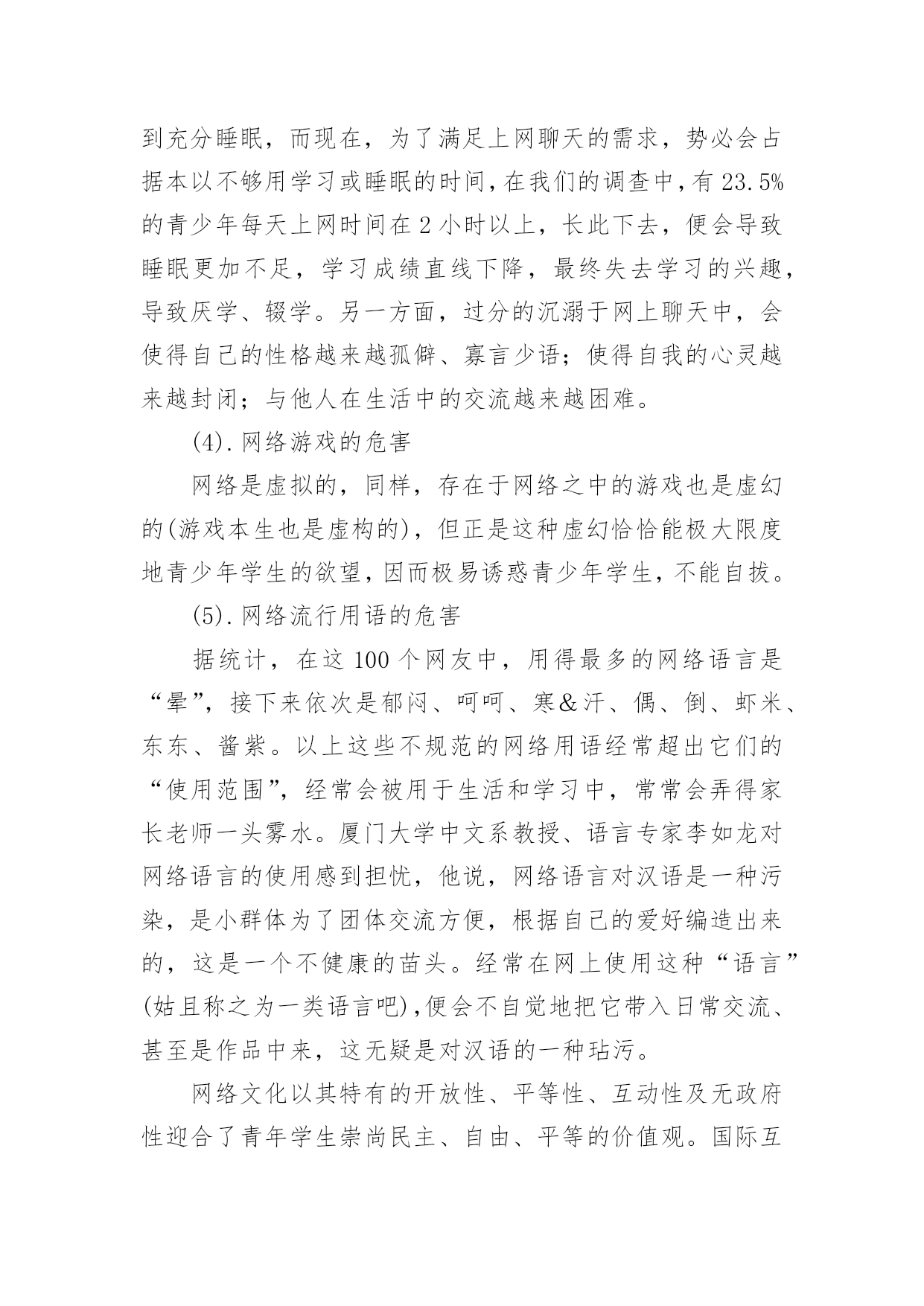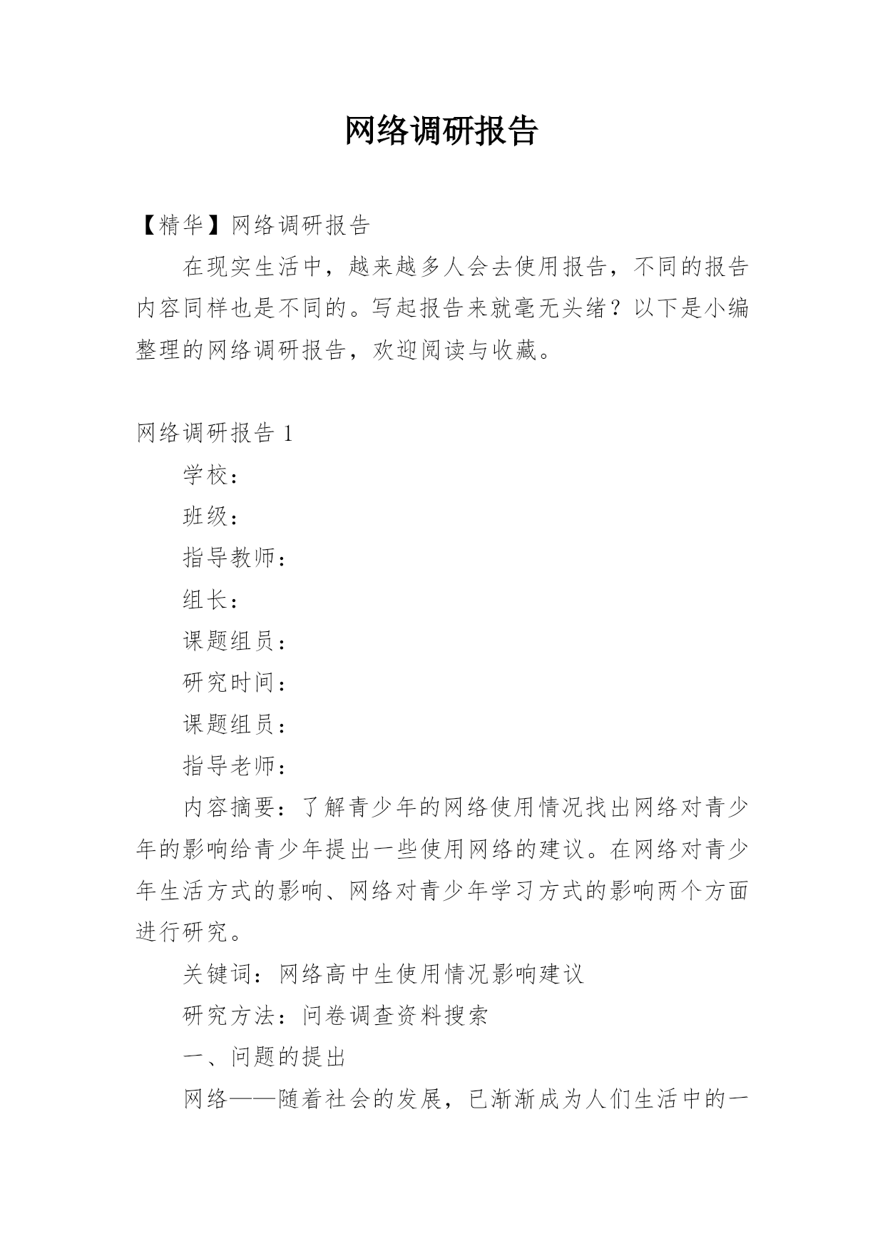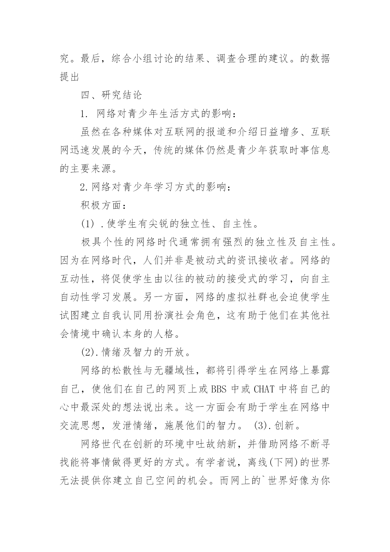 网络调研报告【精华】网络调研报告在现实生活中,越来越多人会去使用报告,不同的报告内容同样也是不同的。写起报告来就毫无头绪?以下是小编整理的网络调研报告,欢迎阅读与收藏。网络调研报告1学校:班级:指导教师:组长:课题组员:研究时间:课题组员:指导老师:内容摘要:了解青少年的网络使用情况找出网络对青少年的影响给青少年提出一些使用网络的建议。在网络对青少年生活方式的影响、网络对青少年学习方式的影响两个方面进行研究。关键词:网络高中生使用情况影响建议研究方法:问卷调查资料搜索一、问题的提出网络——随着社会的发展,已渐渐成为人们生活中的一部分。据统计,在现在的大城市中,已有76.7%的学生家庭购置了电脑,其中家中联网计算机占到69.2%,这说明随着城市居民生活水平的提高,电脑已成为家庭学习和休闲的主要家电。在电脑成为我们不可缺少的一部分时,网络对于我们青少年的影响也是不容忽视的!现在有许多青少年,上网无非就是玩游戏,聊天等娱乐性的目的。并不能真正利用好网络。互联网络极大地开阔了青少年的视野,给青少年的学习、生活带来了巨大的便利和乐趣。但由于互联网络空前的开放和自由,但也会使青少年找到了精神的寄托,解脱了束缚,在网络的海洋里尽情的放任自己。网络对青少年的负面影响也是有目共睹的。有许多学生为了上网彻夜不归,为了上网荒废了学业,这一件件的事实,让我们不得不对网络对青少年的影响重视!!上网已经成为当今人们生活密不可分的活动,那么上网是否影响人们的生活,网络对青少年的影响又有多大呢?为了让青少年更多的了解网络对他们的危害,并培养青少年的是非判辩能力。因此,我们出展了研究工作。二、研究目标:1.了解青少年的网络使用情况;2.找出网络对青少年的影响;3.给青少年提出一些使用网络的建议。三、计划及过程:通过问卷调查、查阅资料等方式,在网络对青少年生活方式的影响、网络对青少年学习方式的影响两个方面进行研究。最后,综合小组讨论的结果、调查合理的建议。的数据提出四、研究结论1.网络对青少年生活方式的影响:虽然在各种媒体对互联网的报道和介绍日益增多、互联网迅速发展的今天,传统的媒体仍然是青少年获取时事信息的主要来源。2.网络对青少年学习方式的影响:积极方面:(1).使学生有尖锐的独立性、自主性。极具个性的网络时代通常拥有强烈的独立性及自主性。因为在网络时代,人们并非是被动式的资讯接收者。网络的互动性,将促使学生由以往的被动的接受式的学习,向自主自动性学习发展。另一方面,网络的虚拟社群也会迫使学生试图建立自我认同用扮演社会角色,这有助于他们在其他社会情境中确认本身的人格。(2).情绪及智力的开放。网络的松散性与无疆域性,都将引得学生在网络上暴露自己,使他们在自己的网页上或BBS中或CHAT中将自己的心中最深处的想法说出来。这一方面会有助于学生在网络中交流思想,发泄情绪,施展他们的智力。(3).创新。网络世代在创新的环境中吐故纳新,并借助网络不断寻找能将事情做得更好的方式。有学者说,离线(下网)的世界无法提供你建立自己空间的机会。而网上的`世界好像为你支起空的帐篷一般。网络时代的学生对于新媒体及新科技抱开放自然的态度,将使得他们成为首群接受并参与本身文化创作的族群。他们轻松面对的心态,使自己有更大的空间容纳新事物新活动。(4).完善现有的教学方式。在我们调查中,有一部分同学认为运用网络、多媒体教学可以把枯燥难懂的知识变得生动、形象。比如:运用多媒体制作课件、进行授课;通过FLASH制作一些在理想状态下才能够很好地完成的实验,这样使学生可以更直观、更形象地观察出实验的效果,由此取代一味由老师口述,学生死记传统方式。(5).使学生学习由被动向主动转变,使教育中心由老师向学生转变。新的媒体学习,让学习的中心由传授者转至个人本身。更进一步地,以学生为中心的教育更能激发学生学习的动机。学习和娱乐因此产生交集。由以老师为中心转变为以学生为中的教育,并不意味着教师的变得无足轻重。实际上恰恰相反。老师以学习活动协助者的身分出现,而不是指导型的传播者,老师充分让学生自行建立自己的知识,是学生的资源的顾问但不是学生问题的解答者。教师将肩负起引导学生从众多的信息中取其精华,剔其糟粕,并促进学生的综合内化,建立学生自己的学习构架。除此之外,作为教师也有责任引导学生抵制网路上色情的威害,保护学生的身心健康。以学生为中心的学习,着眼于学生学习的能力、学习方法、社会内涵和其他会影响学习的各种因素的作用。这样的教育方式会大规模地使用电脑软件,让学生能够构建和积累自己的学习经验,也让上课方式更为活泼,学生可以针对特定主题充分讨论、争辩、研究和合作。消极方面:(1).过多的“其他”信息一方面我们看到互联网的丰富性为我们解决自身信息需求提供了便利途径,但另一方面,过大的信息数量并不能包括足够的“含