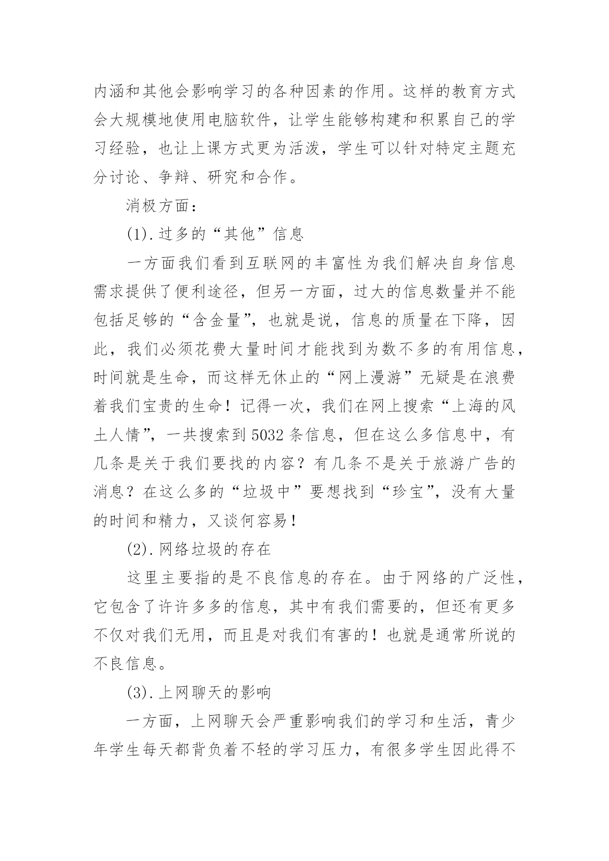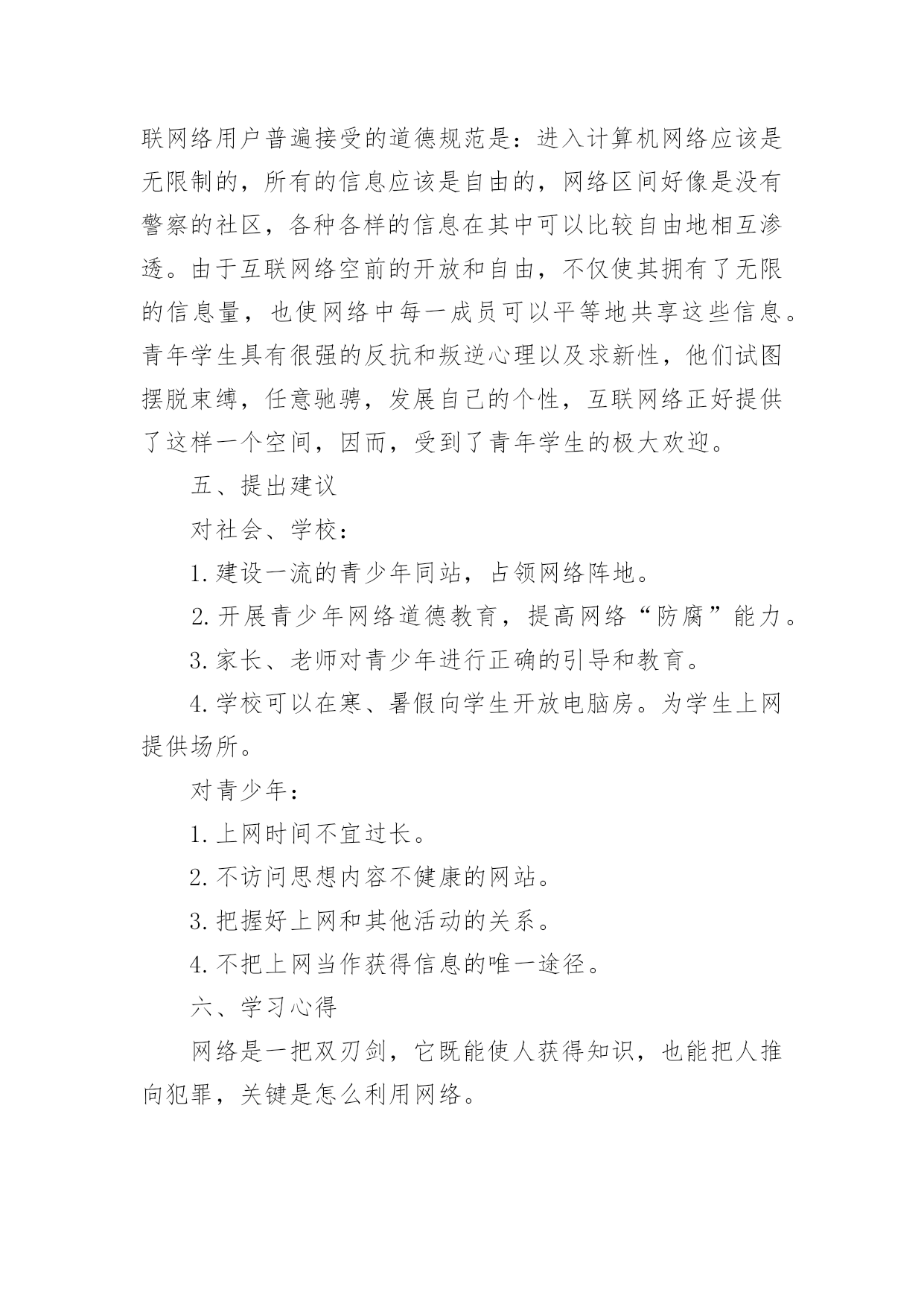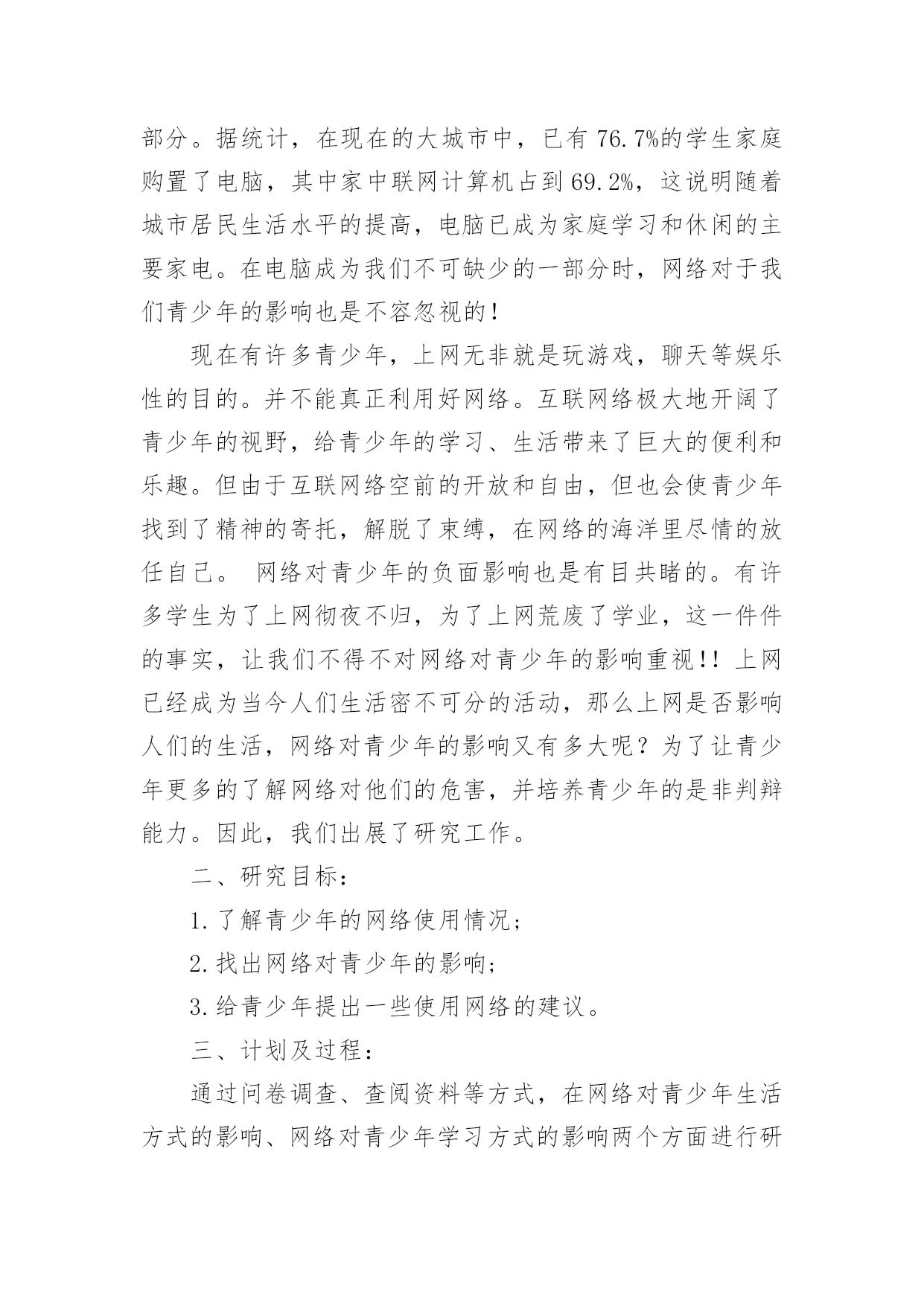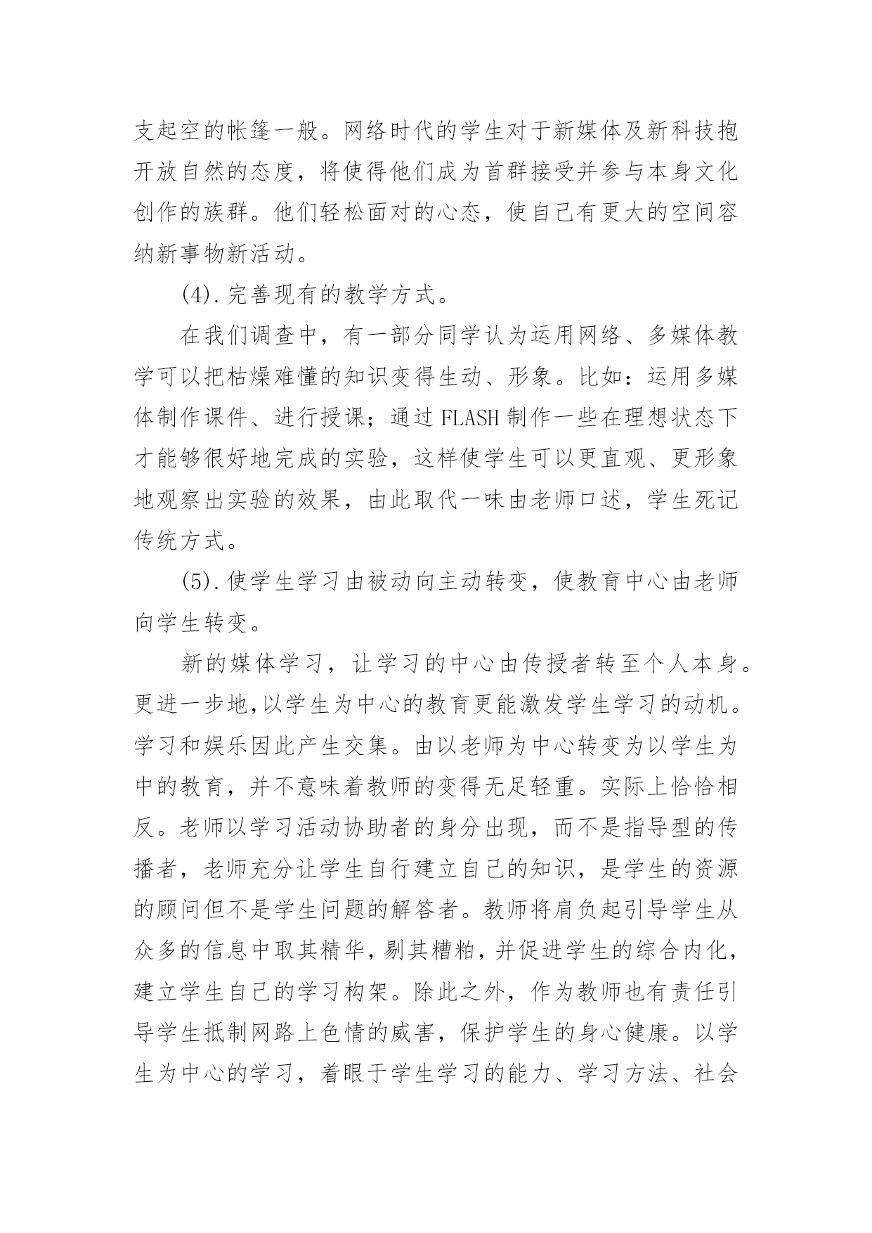 网络调研报告【精华】网络调研报告在现实生活中,越来越多人会去使用报告,不同的报告内容同样也是不同的。写起报告来就毫无头绪?以下是小编整理的网络调研报告,欢迎阅读与收藏。网络调研报告1学校:班级:指导教师:组长:课题组员:研究时间:课题组员:指导老师:内容摘要:了解青少年的网络使用情况找出网络对青少年的影响给青少年提出一些使用网络的建议。在网络对青少年生活方式的影响、网络对青少年学习方式的影响两个方面进行研究。关键词:网络高中生使用情况影响建议研究方法:问卷调查资料搜索一、问题的提出网络——随着社会的发展,已渐渐成为人们生活中的一部分。据统计,在现在的大城市中,已有76.7%的学生家庭购置了电脑,其中家中联网计算机占到69.2%,这说明随着城市居民生活水平的提高,电脑已成为家庭学习和休闲的主要家电。在电脑成为我们不可缺少的一部分时,网络对于我们青少年的影响也是不容忽视的!现在有许多青少年,上网无非就是玩游戏,聊天等娱乐性的目的。并不能真正利用好网络。互联网络极大地开阔了青少年的视野,给青少年的学习、生活带来了巨大的便利和乐趣。但由于互联网络空前的开放和自由,但也会使青少年找到了精神的寄托,解脱了束缚,在网络的海洋里尽情的放任自己。网络对青少年的负面影响也是有目共睹的。有许多学生为了上网彻夜不归,为了上网荒废了学业,这一件件的事实,让我们不得不对网络对青少年的影响重视!!上网已经成为当今人们生活密不可分的活动,那么上网是否影响人们的生活,网络对青少年的影响又有多大呢?为了让青少年更多的了解网络对他们的危害,并培养青少年的是非判辩能力。因此,我们出展了研究工作。二、研究目标:1.了解青少年的网络使用情况;2.找出网络对青少年的影响;3.给青少年提出一些使用网络的建议。三、计划及过程:通过问卷调查、查阅资料等方式,在网络对青少年生活方式的影响、网络对青少年学习方式的影响两个方面进行研究。最后,综合小组讨论的结果、调查合理的建议。的数据提出四、研究结论1.网络对青少年生活方式的影响:虽然在各种媒体对互联网的报道和介绍日益增多、互联网迅速发展的今天,传统的媒体仍然是青少年获取时事信息的主要来源。2.网络对青少年学习方式的影响:积极方面:(1).使学生有尖锐的独立性、自主性。极具个性的网络时代通常拥有强烈的独立性及自主性。因为在网络时代,人们并非是被动式的资讯接收者。网络的互动性,将促使学生由以往的被动的接受式的学习,向自主自动性学习发展。另一方面,网络的虚拟社群也会迫使学生试图建立自我认同用扮演社会角色,这有助于他们在其他社会情境中确认本身的人格。(2).情绪及智力的开放。网络的松散性与无疆域性,都将引得学生在网络上暴露自己,使他们在自己的网页上或BBS中或CHAT中将自己的心中最深处的想法说出来。这一方面会有助于学生在网络中交流思想,发泄情绪,施展他们的智力。(3).创新。网络世代在创新的环境中吐故纳新,并借助网络不断寻找能将事情做得更好的方式。有学者说,离线(下网)的世界无法提供你建立自己空间的机会。而网上的`世界好像为你支起空的帐篷一般。网络时代的学生对于新媒体及新科技抱开放自然的态度,将使得他们成为首群接受并参与本身文化创作的族群。他们轻松面对的心态,使自己有更大的空间容纳新事物新活动。(4).完善现有的教学方式。在我们调查中,有一部分同学认为运用网络、多媒体教学可以把枯燥难懂的知识变得生动、形象。比如:运用多媒体制作课件、进行授课;通过FLASH制作一些在理想状态下才能够很好地完成的实验,这样使学生可以更直观、更形象地观察出实验的效果,由此取代一味由老师口述,学生死记传统方式。(5).使学生学习由被动向主动转变,使教育中心由老师向学生转变。新的媒体学习,让学习的中心由传授者转至个人本身。更进一步地,以学生为中心的教育更能激发学生学习的动机。学习和娱乐因此产生交集。由以老师为中心转变为以学生为中的教育,并不意味着教师的变得无足轻重。实际上恰恰相反。老师以学习活动协助者的身分出现,而不是指导型的传播者,老师充分让学生自行建立自己的知识,是学生的资源的顾问但不是学生问题的解答者。教师将肩负起引导学生从众多的信息中取其精华,剔其糟粕,并促进学生的综合内化,建立学生自己的学习构架。除此之外,作为教师也有责任引导学生抵制网路上色情的威害,保护学生的身心健康。以学生为中心的学习,着眼于学生学习的能力、学习方法、社会内涵和其他会影响学习的各种因素的作用。这样的教育方式会大规模地使用电脑软件,让学生能够构建和积累自己的学习经验,也让上课方式更为活泼,学生可以针对特定主题充分讨论、争辩、研究和合作。消极方面:(1).过多的“其他”信息一方面我们看到互联网的丰富性为我们解决自身信息需求提供了便利途径,但另一方面,过大的信息数量并不能包括足够的“含