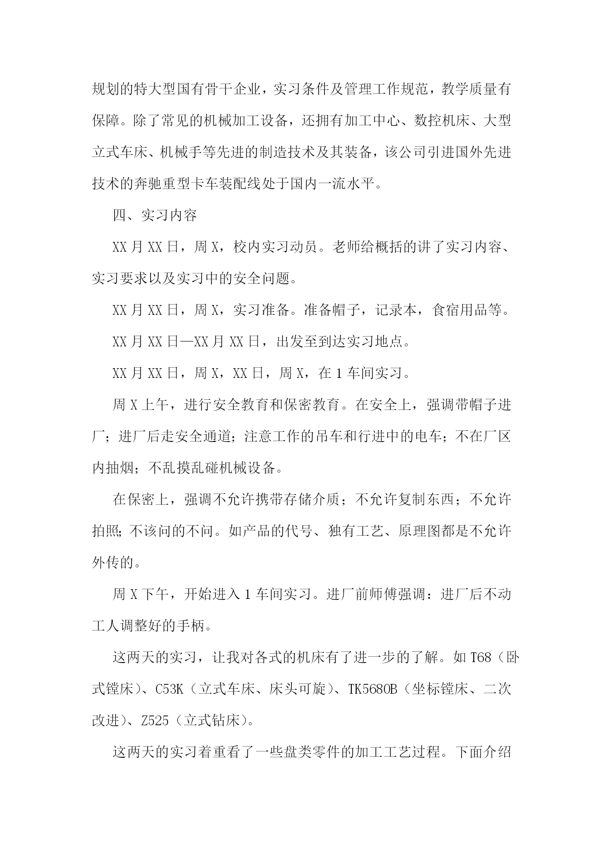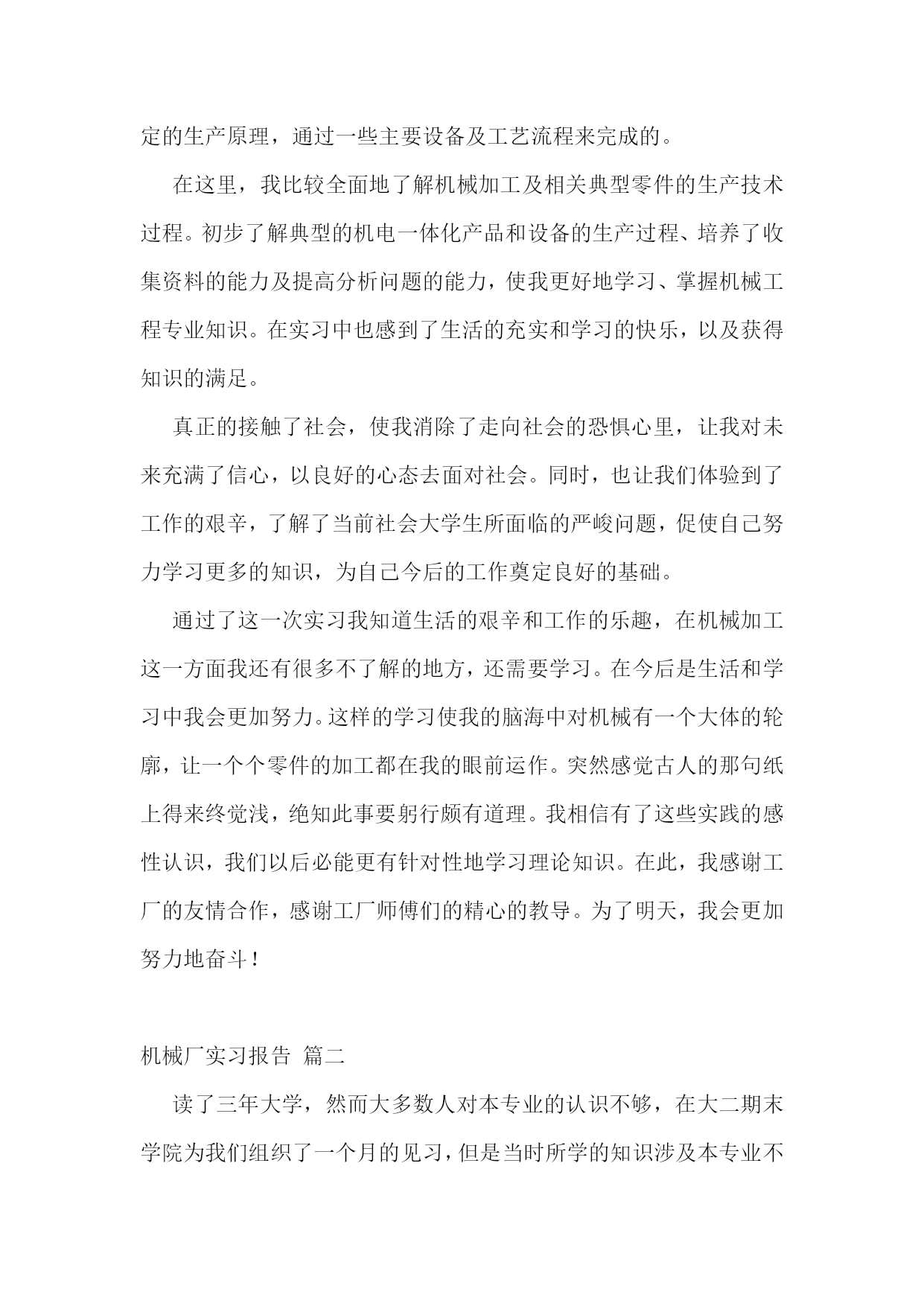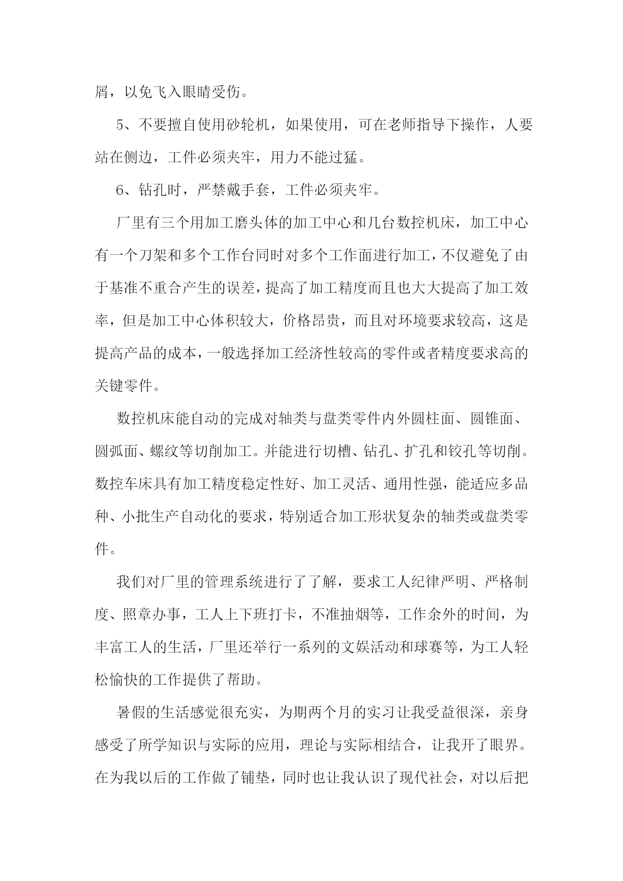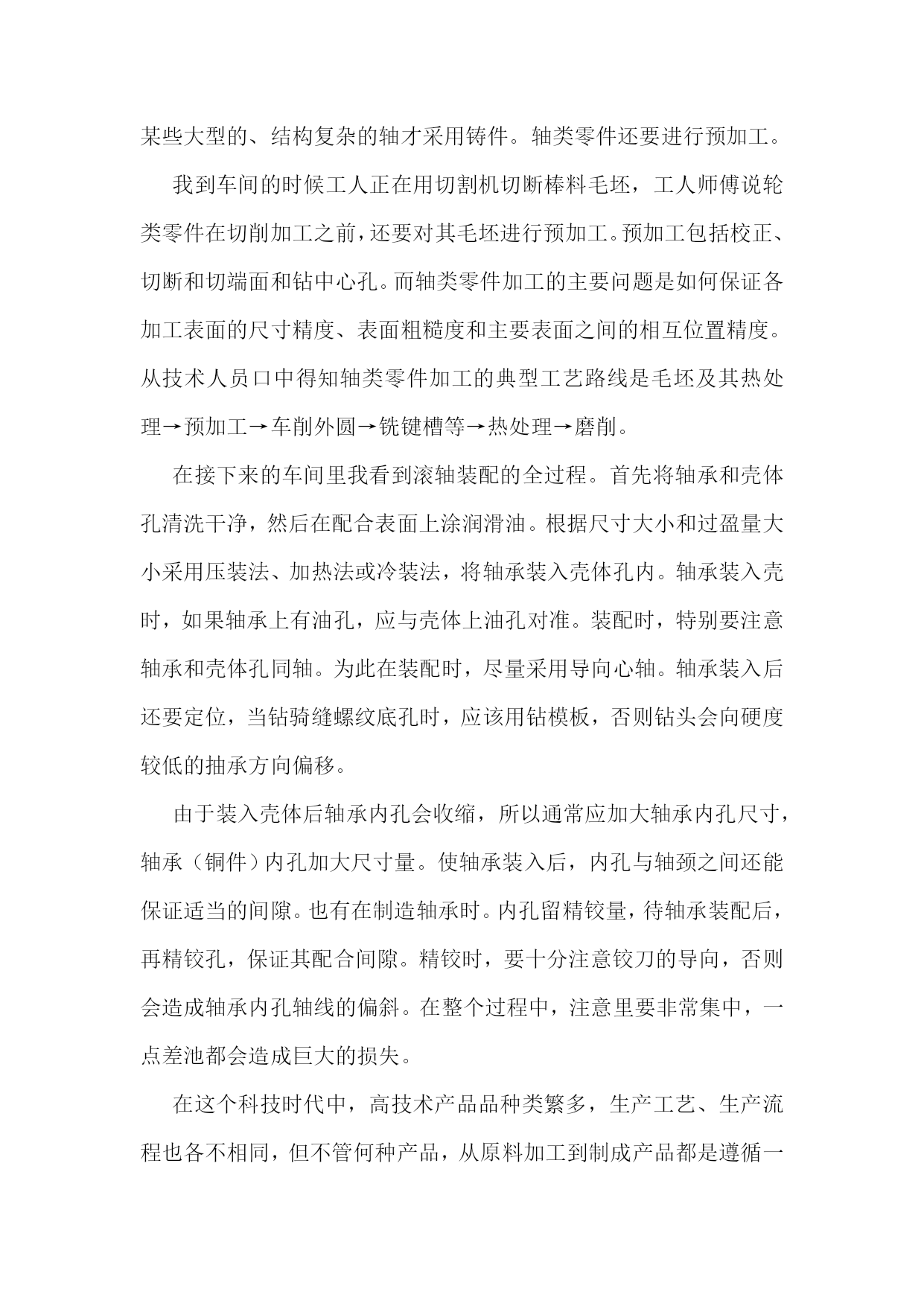 机械的实习报告【7篇】机械专业实习报告篇一在这一次的认知实习过程中,我是第一次到机械厂实习,没有什么准备,只是看了一下零件的加工。第一个车间是箱体零件加工的车间,伴随着车间中空中吊车的游走声,穿过那挂着破碎门帘的陈旧大门。且不说车间的一切,首先让我一惊的是车间上方的两个横幅:多浪费一分钱,就少一分钱和今天工作不努力,明天努力找工作。或许这样的口号对我们这些大学生来说,有点老调和乏味。但我却能感觉到这七,八十年代那些拥有热火朝天的干劲的工人师傅们俭朴的本质和如火的热情。在这里,技术工人告诉我箱体加工工艺路线的安排车床主轴箱要求加工的表面很多。在这些加工表面中,平面加工精度比孔的加工精度容易保证,于是,箱体中主轴孔(主要孔)的加工精度、孔系加工精度就成为工艺关键问题。这里的工人还告诉我在工艺路线的安排中应注意三个问题:1、工件的时效处理箱体结构复杂壁厚不均匀,铸造内应力较大。由于内应力会引起变形,因此铸造后应安排人工时效处理以消除内应力减少变形。一般精度要求的箱体,可利用粗、精加工工序之间的自然停放和运输时间,得到自然时效的效果。但自然时效需要的时间较长,否则会影响箱体精度的稳定性。对于特别精密的箱体,在粗加工和精加工工序间还应安排一次人工时效,迅速充分地消除内应力,提高精度的稳定性。2、安排加工工艺的顺序时应先面后孔由于平面面积较大定位稳定可靠,有利与简化夹具结构检少安装变形。从加工难度来看,平面比孔加工容易。先加工批平面,把铸件表面的凹凸不平和夹砂等缺陷切除,在加工分布在平面上的孔时,对便于孔的加工和保证孔的加工精度都是有利的。因此,一般均应先加工平面。3、粗、精加工阶段要分开箱体均为铸件,加工余量较大,而在粗加工中切除的金属较多,因而夹紧力、切削力都较大,切削热也较多。加之粗加工后,工件内应力重新分布也会引起工件变形,因此,对加工精度影响较大。为此,把粗精加工分开进行,有利于把已加工后由于各种原因引起的工件变形充分暴露出来,然后在精加工中将其消除。接下来参观了轴类零件的加工过程合理选用材料和规定热处理的技术要求,对提高轴类零件的强度和使用寿命有重要意义,同时,对于轴的加工过程有极大的影响。一般轴类零件常用45钢,根据不同的工作条件采用不同的热处理规范(如正火、调质、淬火等),以获得一定的强度、韧性和耐磨性。对中等精度而转速较高的轴类零件,可选用40Cr等合金钢。这类钢经调质和表面淬火处理后,具有较高的综合力学件能。精度较高的轴,有时还用轴承钢GCrls和弹簧钢65Mn等材料,它们通过调质和表面淬火处理后,具有更高耐磨性和耐疲劳性能。对于高转速、重载荷等条件下工作的轴,可选用20CrMnTi、20MnZB、20Cr等低碳含金钢或38CrMoAIA氮化钢。低碳合金钢经渗碳淬火处理后,具有很高的表面硬度、抗冲击韧性和心部强度,热处理变形却很小。处于对经济的考虑,轴类零件的毛坯最常用的是圆棒料和锻件,只有某些大型的、结构复杂的轴才采用铸件。轴类零件还要进行预加工。我到车间的时候工人正在用切割机切断棒料毛坯,工人师傅说轮类零件在切削加工之前,还要对其毛坯进行预加工。预加工包括校正、切断和切端面和钻中心孔。而轴类零件加工的主要问题是如何保证各加工表面的尺寸精度、表面粗糙度和主要表面之间的相互位置精度。从技术人员口中得知轴类零件加工的典型工艺路线是毛坯及其热处理→预加工→车削外圆→铣键槽等→热处理→磨削。在接下来的车间里我看到滚轴装配的全过程。首先将轴承和壳体孔清洗干净,然后在配合表面上涂润滑油。根据尺寸大小和过盈量大小采用压装法、加热法或冷装法,将轴承装入壳体孔内。轴承装入壳时,如果轴承上有油孔,应与壳体上油孔对准。装配时,特别要注意轴承和壳体孔同轴。为此在装配时,尽量采用导向心轴。轴承装入后还要定位,当钻骑缝螺纹底孔时,应该用钻模板,否则钻头会向硬度较低的抽承方向偏移。由于装入壳体后轴承内孔会收缩,所以通常应加大轴承内孔尺寸,轴承(铜件)内孔加大尺寸量。使轴承装入后,内孔与轴颈之间还能保证适当的间隙。也有在制造轴承时。内孔留精铰量,待轴承装配后,再精铰孔,保证其配合间隙。精铰时,要十分注意铰刀的导向,否则会造成轴承内孔轴线的偏斜。在整个过程中,注意里要非常集中,一点差池都会造成巨大的损失。在这个科技时代中,高技术产品品种类繁多,生产工艺、生产流程也各不相同,但不管何种产品,从原料加工到制成产品都是遵循一定的生产原理,通过一些主要设备及工艺流程来完成的。在这里,我比较全面地了解机械加工及相关典型零件的生产技术过程。初步了解典型的机电一体化产品和设备的生产过程、培养了收集资料的能力及提高分析问题的能力,使我更好地学习、掌握机械工程专业知识。在实习中也感到了生活的充实和学习的快乐,以及获得知识的满足。真正的接触了