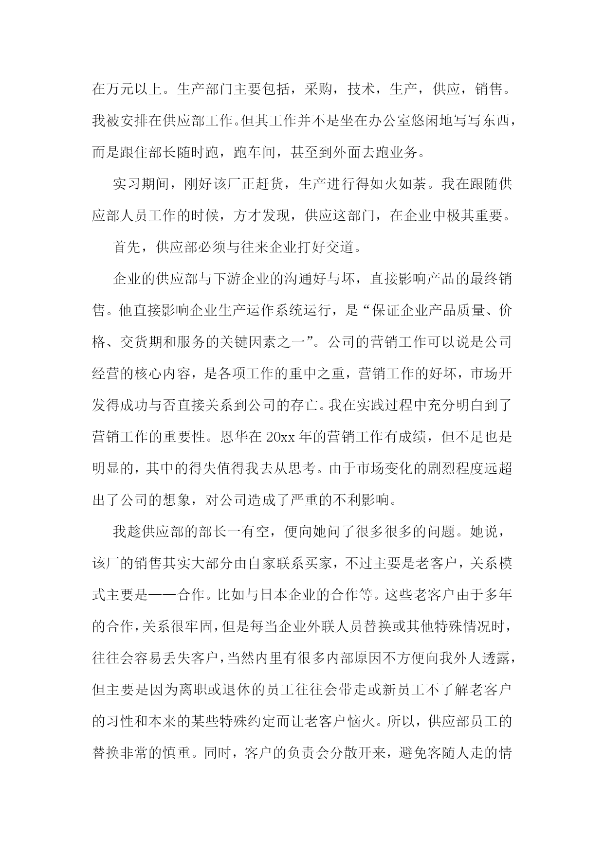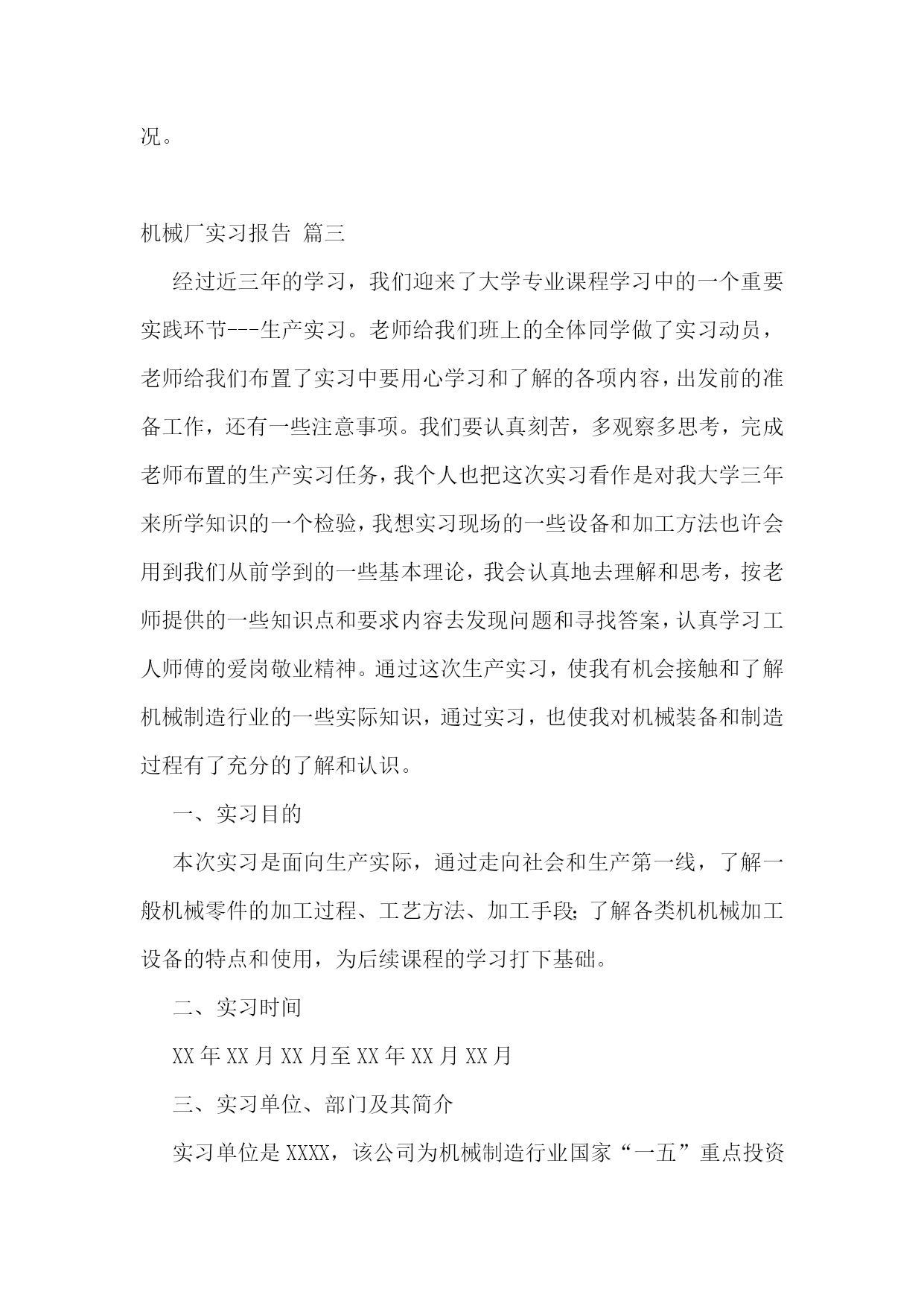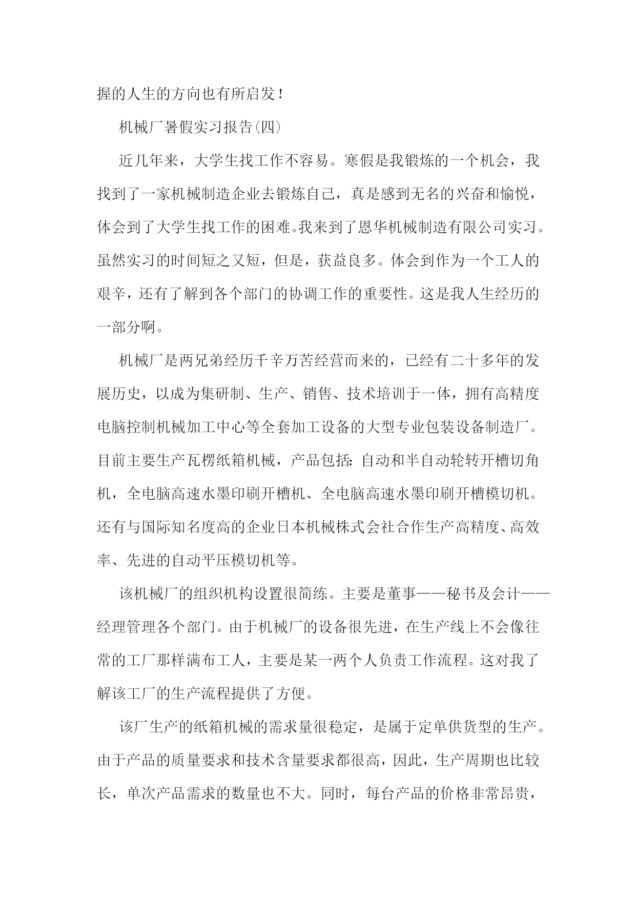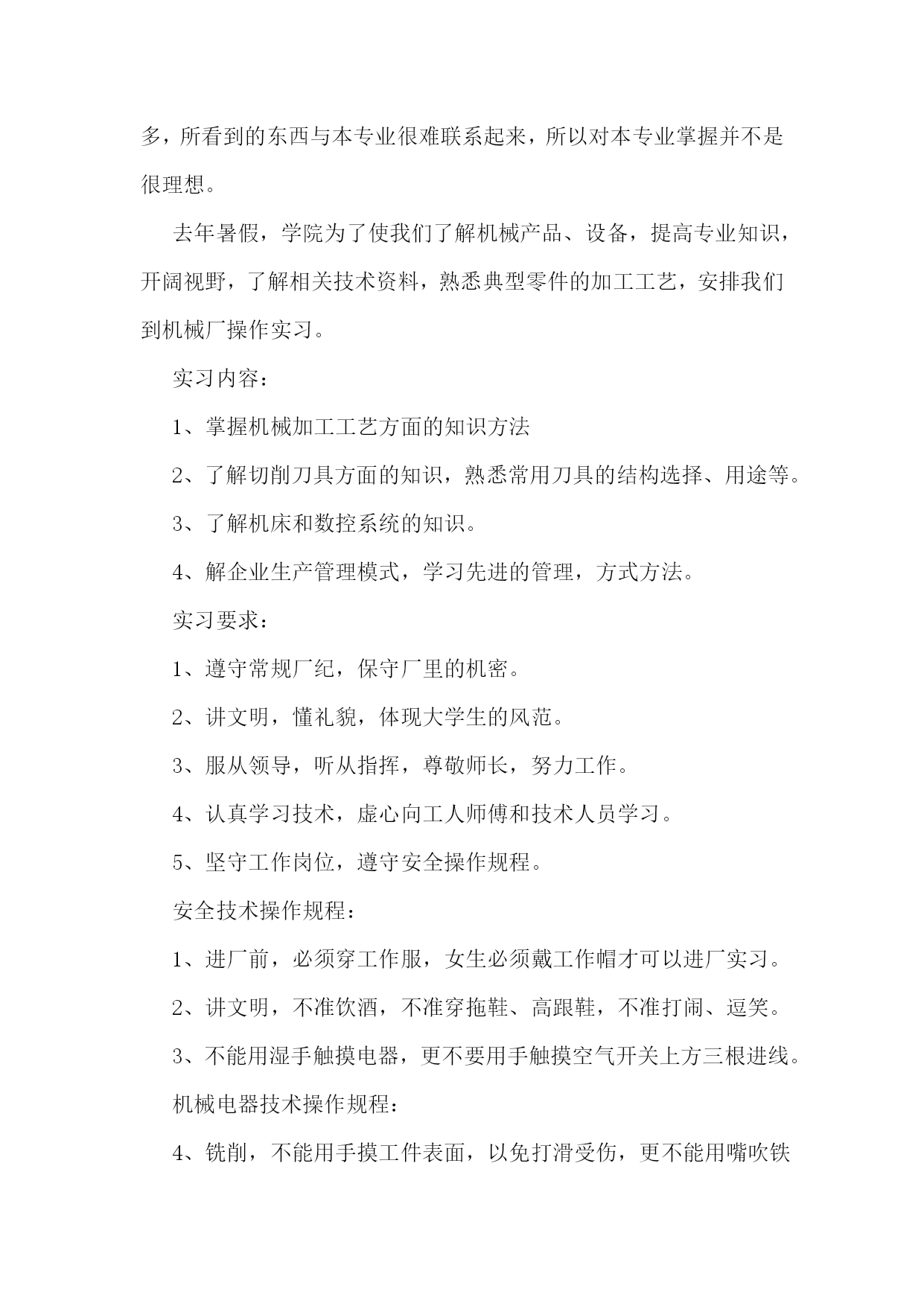 机械的实习报告【7篇】机械专业实习报告篇一在这一次的认知实习过程中,我是第一次到机械厂实习,没有什么准备,只是看了一下零件的加工。第一个车间是箱体零件加工的车间,伴随着车间中空中吊车的游走声,穿过那挂着破碎门帘的陈旧大门。且不说车间的一切,首先让我一惊的是车间上方的两个横幅:多浪费一分钱,就少一分钱和今天工作不努力,明天努力找工作。或许这样的口号对我们这些大学生来说,有点老调和乏味。但我却能感觉到这七,八十年代那些拥有热火朝天的干劲的工人师傅们俭朴的本质和如火的热情。在这里,技术工人告诉我箱体加工工艺路线的安排车床主轴箱要求加工的表面很多。在这些加工表面中,平面加工精度比孔的加工精度容易保证,于是,箱体中主轴孔(主要孔)的加工精度、孔系加工精度就成为工艺关键问题。这里的工人还告诉我在工艺路线的安排中应注意三个问题:1、工件的时效处理箱体结构复杂壁厚不均匀,铸造内应力较大。由于内应力会引起变形,因此铸造后应安排人工时效处理以消除内应力减少变形。一般精度要求的箱体,可利用粗、精加工工序之间的自然停放和运输时间,得到自然时效的效果。但自然时效需要的时间较长,否则会影响箱体精度的稳定性。对于特别精密的箱体,在粗加工和精加工工序间还应安排一次人工时效,迅速充分地消除内应力,提高精度的稳定性。2、安排加工工艺的顺序时应先面后孔由于平面面积较大定位稳定可靠,有利与简化夹具结构检少安装变形。从加工难度来看,平面比孔加工容易。先加工批平面,把铸件表面的凹凸不平和夹砂等缺陷切除,在加工分布在平面上的孔时,对便于孔的加工和保证孔的加工精度都是有利的。因此,一般均应先加工平面。3、粗、精加工阶段要分开箱体均为铸件,加工余量较大,而在粗加工中切除的金属较多,因而夹紧力、切削力都较大,切削热也较多。加之粗加工后,工件内应力重新分布也会引起工件变形,因此,对加工精度影响较大。为此,把粗精加工分开进行,有利于把已加工后由于各种原因引起的工件变形充分暴露出来,然后在精加工中将其消除。接下来参观了轴类零件的加工过程合理选用材料和规定热处理的技术要求,对提高轴类零件的强度和使用寿命有重要意义,同时,对于轴的加工过程有极大的影响。一般轴类零件常用45钢,根据不同的工作条件采用不同的热处理规范(如正火、调质、淬火等),以获得一定的强度、韧性和耐磨性。对中等精度而转速较高的轴类零件,可选用40Cr等合金钢。这类钢经调质和表面淬火处理后,具有较高的综合力学件能。精度较高的轴,有时还用轴承钢GCrls和弹簧钢65Mn等材料,它们通过调质和表面淬火处理后,具有更高耐磨性和耐疲劳性能。对于高转速、重载荷等条件下工作的轴,可选用20CrMnTi、20MnZB、20Cr等低碳含金钢或38CrMoAIA氮化钢。低碳合金钢经渗碳淬火处理后,具有很高的表面硬度、抗冲击韧性和心部强度,热处理变形却很小。处于对经济的考虑,轴类零件的毛坯最常用的是圆棒料和锻件,只有某些大型的、结构复杂的轴才采用铸件。轴类零件还要进行预加工。我到车间的时候工人正在用切割机切断棒料毛坯,工人师傅说轮类零件在切削加工之前,还要对其毛坯进行预加工。预加工包括校正、切断和切端面和钻中心孔。而轴类零件加工的主要问题是如何保证各加工表面的尺寸精度、表面粗糙度和主要表面之间的相互位置精度。从技术人员口中得知轴类零件加工的典型工艺路线是毛坯及其热处理→预加工→车削外圆→铣键槽等→热处理→磨削。在接下来的车间里我看到滚轴装配的全过程。首先将轴承和壳体孔清洗干净,然后在配合表面上涂润滑油。根据尺寸大小和过盈量大小采用压装法、加热法或冷装法,将轴承装入壳体孔内。轴承装入壳时,如果轴承上有油孔,应与壳体上油孔对准。装配时,特别要注意轴承和壳体孔同轴。为此在装配时,尽量采用导向心轴。轴承装入后还要定位,当钻骑缝螺纹底孔时,应该用钻模板,否则钻头会向硬度较低的抽承方向偏移。由于装入壳体后轴承内孔会收缩,所以通常应加大轴承内孔尺寸,轴承(铜件)内孔加大尺寸量。使轴承装入后,内孔与轴颈之间还能保证适当的间隙。也有在制造轴承时。内孔留精铰量,待轴承装配后,再精铰孔,保证其配合间隙。精铰时,要十分注意铰刀的导向,否则会造成轴承内孔轴线的偏斜。在整个过程中,注意里要非常集中,一点差池都会造成巨大的损失。在这个科技时代中,高技术产品品种类繁多,生产工艺、生产流程也各不相同,但不管何种产品,从原料加工到制成产品都是遵循一定的生产原理,通过一些主要设备及工艺流程来完成的。在这里,我比较全面地了解机械加工及相关典型零件的生产技术过程。初步了解典型的机电一体化产品和设备的生产过程、培养了收集资料的能力及提高分析问题的能力,使我更好地学习、掌握机械工程专业知识。在实习中也感到了生活的充实和学习的快乐,以及获得知识的满足。真正的接触了