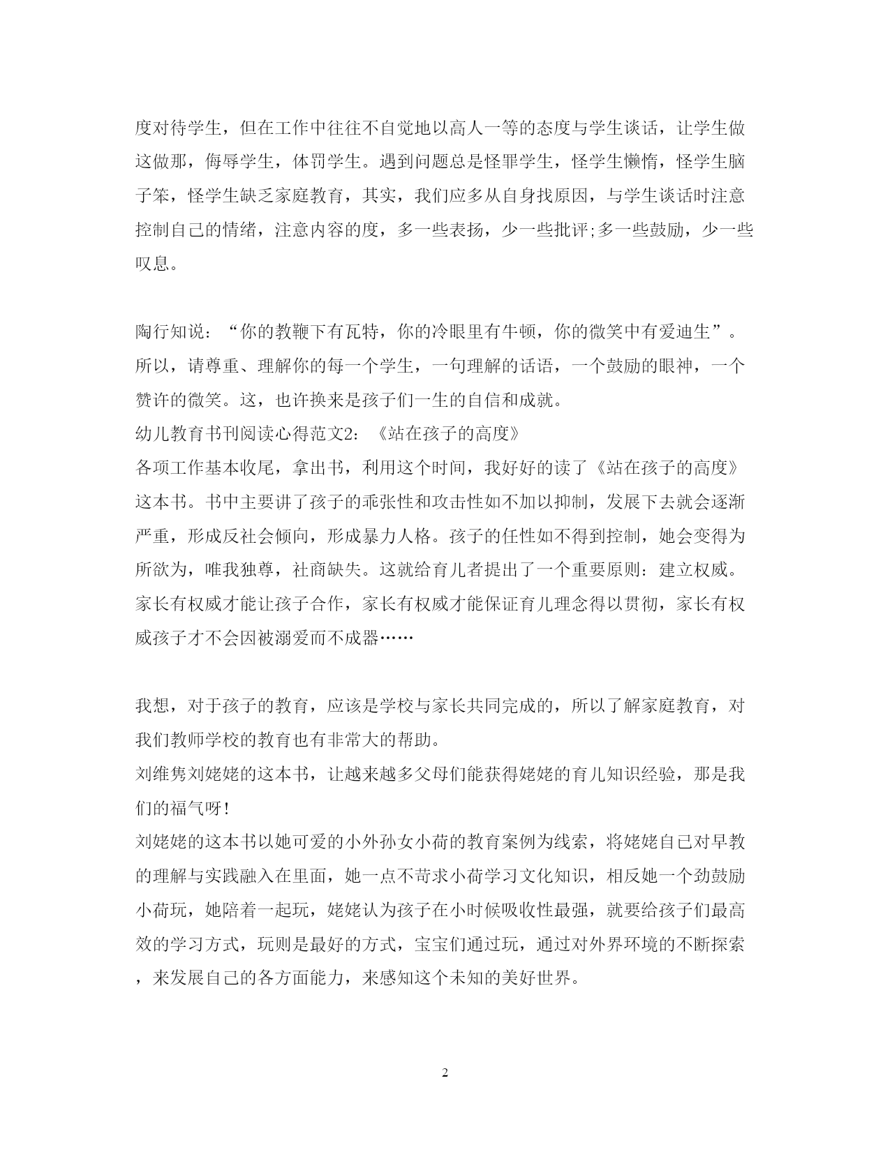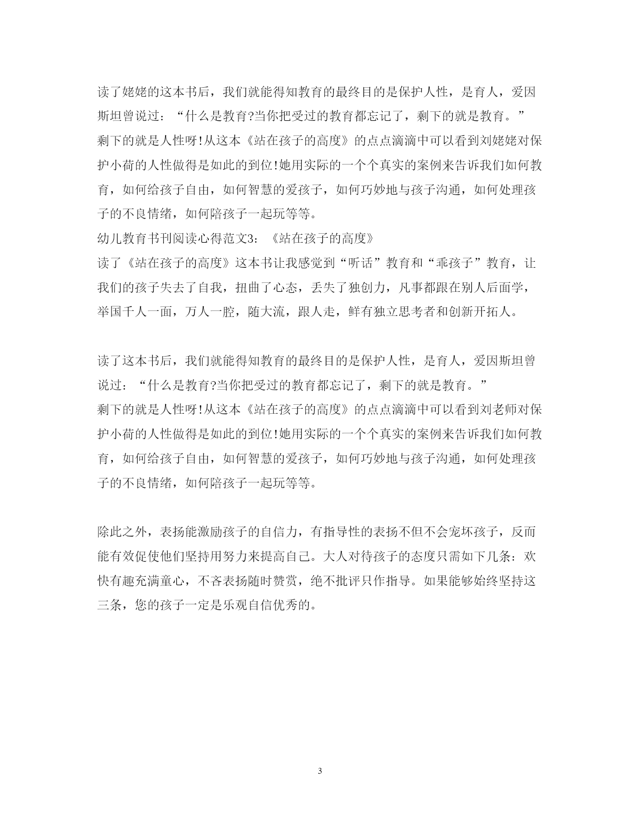 此资料由网络收集而来,如有侵权请告知上传者立即删除。资料共分享,我们负责传递知识。PAGEPAGE3幼儿教育书刊阅读心得3篇幼儿教育价值取向,就是对幼儿教育价值的一种自觉选择,幼儿教育书刊对教师是有很多的帮助的,下面是范文网为大家带来的幼儿教育书刊阅读心得,希望可以帮助大家。幼儿教育书刊阅读心得范文1:《用尊重成就孩子的一生》中国自古就有尊老爱幼的传统,人们尊重老人,尊重有成就的人,尊重权威,尊重大官,这是社会的普遍心态和世俗民风。而对小孩子,施以爱就可以了。殊不知,尊重是能否培养出有思想、有能力、独立自主、笑对人生的人才的关键之一。漓江出版社最近推出了旅美作家、三个孩子的母亲蔡真妮的新著《用尊重成就孩子的一生》,她结合自己三个孩子的养育经历,以及发生在身边的美国家庭和学校里的感人有趣的故事,用生动幽默的语言向我们揭示出美国素质教育的核心理念——尊重、理解与宽容,同时,也令我们深刻领悟到家庭教育的真谛——用尊重成就孩子的一生!书中在介绍美国先进的教育理念和经验的同时,也从比较教育的角度,深入浅出地探讨了不同的文化背景和教育体制给中美教育的差异,从家长的角度提出了弥补不足,缩小差距的方法与措施,具有较强的启发性和可借鉴性。在他们看来,让学生学会去尊重别人,这比学习成绩更重要。从小就受到尊重,在尊重的环境中成长,孩子会学会自尊自爱,也会养成尊重他人的习惯。这就是美国学校教育和家庭教育的核心之一。尊重和良好的成长是相伴相生的,在今天的教育环境里,要想培养一个心理健康、有思想、有能力的孩子,必须使“尊重”这种在我们的教育里面还十分稀有的元素,变得丰富起来。相信很多老师都听过学生与老师谈完话后、受罚后自尊心受伤自杀的新闻,也以此为戒。作为老师,我们知道教师与学生是平等的,要以平等、诚挚、友善的态度对待学生,但在工作中往往不自觉地以高人一等的态度与学生谈话,让学生做这做那,侮辱学生,体罚学生。遇到问题总是怪罪学生,怪学生懒惰,怪学生脑子笨,怪学生缺乏家庭教育,其实,我们应多从自身找原因,与学生谈话时注意控制自己的情绪,注意内容的度,多一些表扬,少一些批评;多一些鼓励,少一些叹息。陶行知说:“你的教鞭下有瓦特,你的冷眼里有牛顿,你的微笑中有爱迪生”。所以,请尊重、理解你的每一个学生,一句理解的话语,一个鼓励的眼神,一个赞许的微笑。这,也许换来是孩子们一生的自信和成就。幼儿教育书刊阅读心得范文2:《站在孩子的高度》各项工作基本收尾,拿出书,利用这个时间,我好好的读了《站在孩子的高度》这本书。书中主要讲了孩子的乖张性和攻击性如不加以抑制,发展下去就会逐渐严重,形成反社会倾向,形成暴力人格。孩子的任性如不得到控制,她会变得为所欲为,唯我独尊,社商缺失。这就给育儿者提出了一个重要原则:建立权威。家长有权威才能让孩子合作,家长有权威才能保证育儿理念得以贯彻,家长有权威孩子才不会因被溺爱而不成器……我想,对于孩子的教育,应该是学校与家长共同完成的,所以了解家庭教育,对我们教师学校的教育也有非常大的帮助。刘维隽刘姥姥的这本书,让越来越多父母们能获得姥姥的育儿知识经验,那是我们的福气呀!刘姥姥的这本书以她可爱的小外孙女小荷的教育案例为线索,将姥姥自已对早教的理解与实践融入在里面,她一点不苛求小荷学习文化知识,相反她一个劲鼓励小荷玩,她陪着一起玩,姥姥认为孩子在小时候吸收性最强,就要给孩子们最高效的学习方式,玩则是最好的方式,宝宝们通过玩,通过对外界环境的不断探索,来发展自己的各方面能力,来感知这个未知的美好世界。读了姥姥的这本书后,我们就能得知教育的最终目的是保护人性,是育人,爱因斯坦曾说过:“什么是教育?当你把受过的教育都忘记了,剩下的就是教育。”剩下的就是人性呀!从这本《站在孩子的高度》的点点滴滴中可以看到刘姥姥对保护小荷的人性做得是如此的到位!她用实际的一个个真实的案例来告诉我们如何教育,如何给孩子自由,如何智慧的爱孩子,如何巧妙地与孩子沟通,如何处理孩子的不良情绪,如何陪孩子一起玩等等。幼儿教育书刊阅读心得范文3:《站在孩子的高度》读了《站在孩子的高度》这本书让我感觉到“听话”教育和“乖孩子”教育,让我们的孩子失去了自我,扭曲了心态,丢失了独创力,凡事都跟在别人后面学,举国千人一面,万人一腔,随大流,跟人走,鲜有独立思考者和创新开拓人。读了这本书后,我们就能得知教育的最终目的是保护人性,是育人,爱因斯坦曾说过:“什么是教育?当你把受过的教育都忘记了,剩下的就是教育。”剩下的就是人性呀!从这本《站在孩子的高度》的点点滴滴中可以看到刘老师对保护小荷的人性做得是如此的到位!她用实际的一个个真实的案例来告诉我们如何教育,如何给孩子自由,如何智慧的爱孩子,如何巧妙地与孩子沟通,如何处理孩子的不良情绪,如何陪孩子一起
