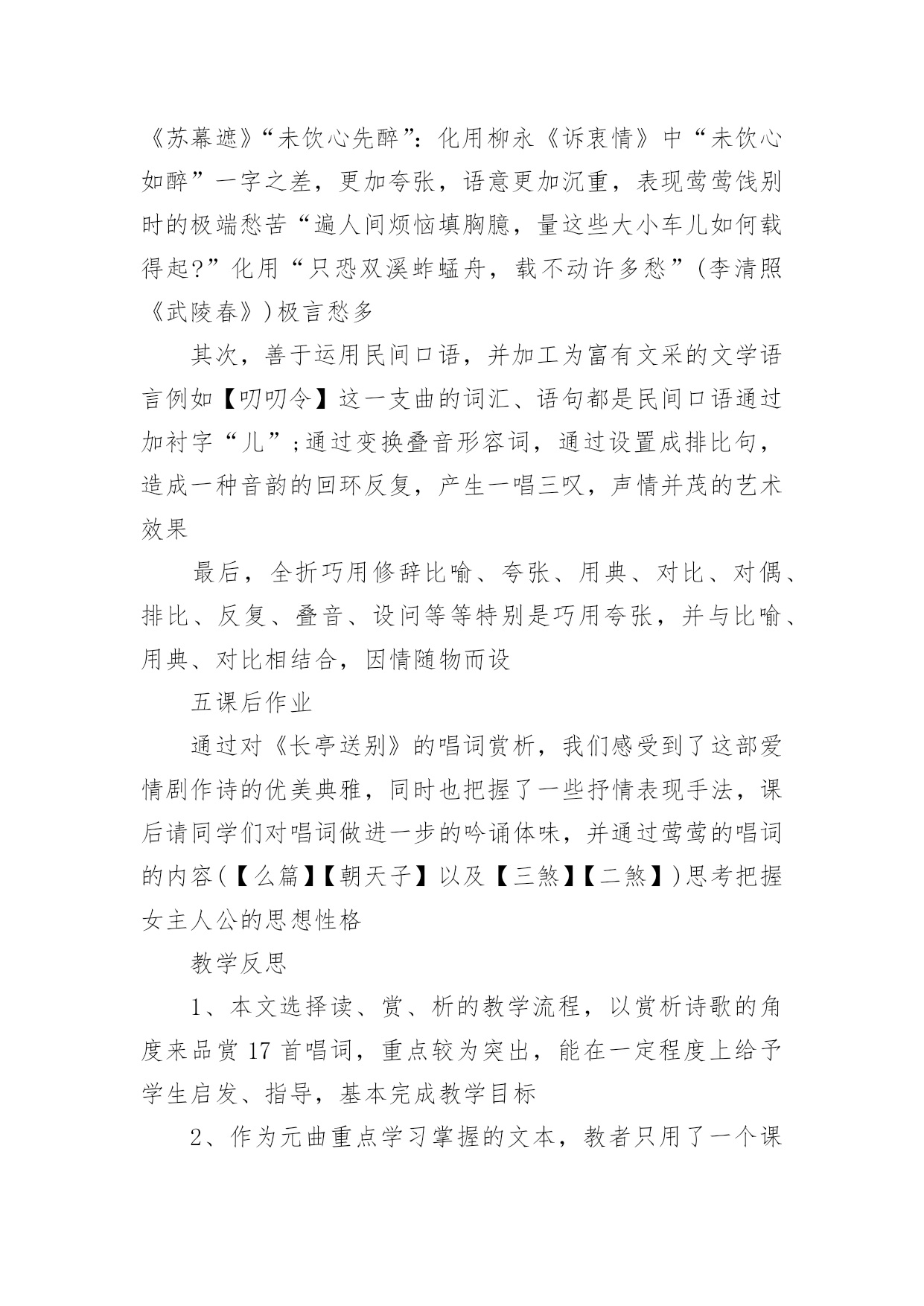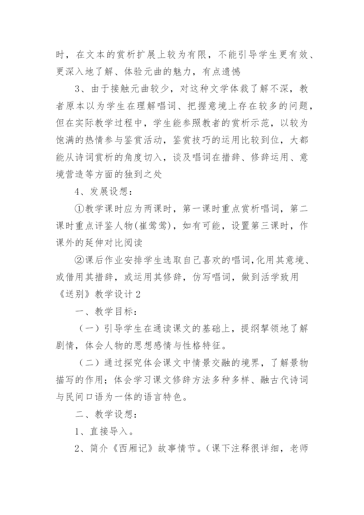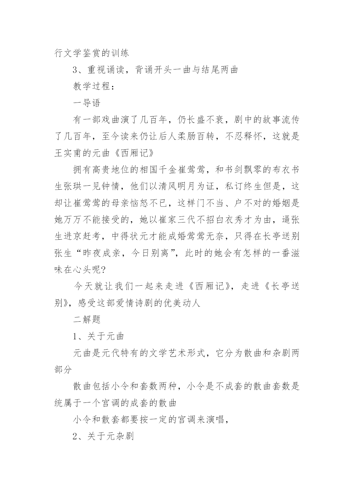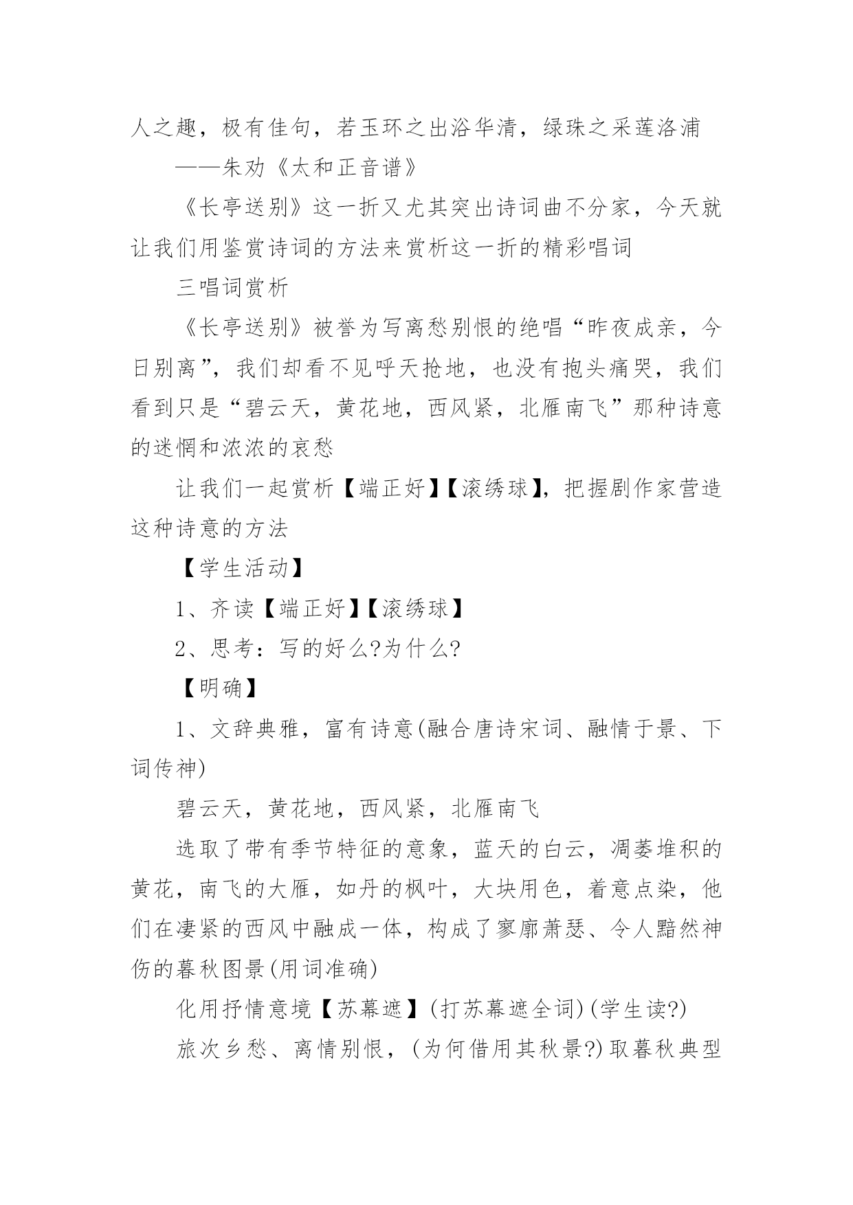 《送别》教学设计《送别》教学设计作为一名为他人授业解惑的教育工作者,编写教学设计是必不可少的,教学设计是实现教学目标的计划性和决策性活动。我们应该怎么写教学设计呢?以下是小编为大家整理的《送别》教学设计,欢迎阅读,希望大家能够喜欢。《送别》教学设计1教学目标:1.了解元杂剧的特点和成就,了解《西厢记》的艺术成就2.了解本课“花间美人”的艺术风格,鉴赏剧作典雅艳丽的唱词语言,体味剧作情景交融的艺术境界,学习本文运用多种修辞表现人物性格特征的写法教学重点:鉴赏情景交融的艺术境界和多种修辞方法对表情达意的作用教学设想:1、以诵读为基础,以文学鉴赏为纽带,带动词句的理解和思想内容的分析及艺术手法的鉴赏2、为突出重点,突破难点,应在疏理剧情的基础上,重点赏读曲词,通过诵读、比较,让学生掌握有关知识,进行文学鉴赏的训练3、重视诵读,背诵开头一曲与结尾两曲教学过程:一导语有一部戏曲演了几百年,仍长盛不衰,剧中的故事流传了几百年,至今读来仍让后人柔肠百转,不忍释怀,这就是王实甫的元曲《西厢记》拥有高贵地位的相国千金崔莺莺,和书剑飘零的布衣书生张珙一见钟情,他们以清风明月为证,私订终生但是,这却让崔莺莺的母亲恼怒不已,这样门不当、户不对的婚姻是她万万不能接受的,她以崔家三代不招白衣秀才为由,逼张生进京赶考,中得状元才能成婚莺莺无奈,只得在长亭送别张生“昨夜成亲,今日别离”,此时的她会有怎样的一番滋味在心头呢?今天就让我们一起来走进《西厢记》,走进《长亭送别》,感受这部爱情诗剧的优美动人二解题1、关于元曲元曲是元代特有的文学艺术形式,它分为散曲和杂剧两部分散曲包括小令和套数两种,小令是不成套的散曲套数是统属于一个宫调的成套的散曲小令和散套都要按一定的宫调来演唱,2、关于元杂剧元杂剧是以当时在北方流行的曲调来演唱的,因此又称为北曲杂剧或北杂剧在结构上,一本杂剧通常由四折组成一折相当于现代剧的一幕或一场,四折一般分别是故事的开端、发展、高潮和结局四折之外可以加一个楔子(楔子一般放在第一折之前,介绍剧情,类似现代剧中的序幕;也有的放在两折之间,相当于后来的过场戏)但也有少数杂剧突破了一本四折的形式,如《西厢记》是五本二十一折的连本戏,是元杂剧中独有的长篇在音乐上,杂剧的每折用同一宫调的若干曲牌组成套曲宫调就是调式,(类似于今天乐曲的C大调、D小调等)元杂剧常用的宫调有九个,就是五宫四调:正宫、中吕宫、南吕宫、仙吕宫、黄钟宫、大石调、双调、商调、越调每一个宫调都有它的音律风格(如【正宫】惆怅悲壮)曲牌,俗称“牌子”,和词牌一样,是曲的音乐谱式比如【端正好】【滚绣球】【叨叨令】等等,每一个曲牌,在韵上必然属于一种宫调不同的曲牌在字数、平仄、押韵上往往不同曲词是按照一定的曲牌填写的文字,一般要押韵,讲究对仗3、关于《西厢记》元末明初,《西厢记》已被誉为“天下夺魁”被尊为“春秋”能获得这么高的赞誉,不仅是因为崔莺莺与张生的爱情故事千古佳传,张生的钟情,莺莺的痴情,红娘的热情洋溢着人性之美,更因为其富于文采的曲词王实甫之词,如花间美人(浓丽典雅)铺叙委婉,深得骚人之趣,极有佳句,若玉环之出浴华清,绿珠之采莲洛浦——朱劝《太和正音谱》《长亭送别》这一折又尤其突出诗词曲不分家,今天就让我们用鉴赏诗词的方法来赏析这一折的精彩唱词三唱词赏析《长亭送别》被誉为写离愁别恨的绝唱“昨夜成亲,今日别离”,我们却看不见呼天抢地,也没有抱头痛哭,我们看到只是“碧云天,黄花地,西风紧,北雁南飞”那种诗意的迷惘和浓浓的哀愁让我们一起赏析【端正好】【滚绣球】,把握剧作家营造这种诗意的方法【学生活动】1、齐读【端正好】【滚绣球】2、思考:写的好么?为什么?【明确】1、文辞典雅,富有诗意(融合唐诗宋词、融情于景、下词传神)碧云天,黄花地,西风紧,北雁南飞选取了带有季节特征的意象,蓝天的白云,凋萎堆积的黄花,南飞的大雁,如丹的枫叶,大块用色,着意点染,他们在凄紧的西风中融成一体,构成了寥廓萧瑟、令人黯然神伤的暮秋图景(用词准确)化用抒情意境【苏幕遮】(打苏幕遮全词)(学生读?)旅次乡愁、离情别恨,(为何借用其秋景?)取暮秋典型意象,用萧瑟凄凉的意境,以烘托送别的凄冷氛围(两者表现离愁别绪方面有异曲同工之妙)这段曲词句句是景,只一“泪”字是情衬托出莺莺为离别所烦恼的痛苦压抑心情(借用意境,还要将之与剧情融合,剧作家下词就必须极为讲究)西风紧“猛”?不好,还有停歇的时候,只是客观状态,“紧”,一阵紧接着一阵,没有停歇,凉风阵阵,吹得人心头渐凉,(难过之时)心头发紧,契合离别的心境;若不是风凄紧,蓝天白云黄花红叶,归雁成阵,莺莺所见,一派俊爽空灵的景象,不合情理,“紧”表现出暮秋图的凄迷萧瑟,以烘托出主人公悲凉的心境晓来谁染霜林醉?总是离人泪(离人的泪水将枫叶打红)“抹”?不好,表层的,“染”,