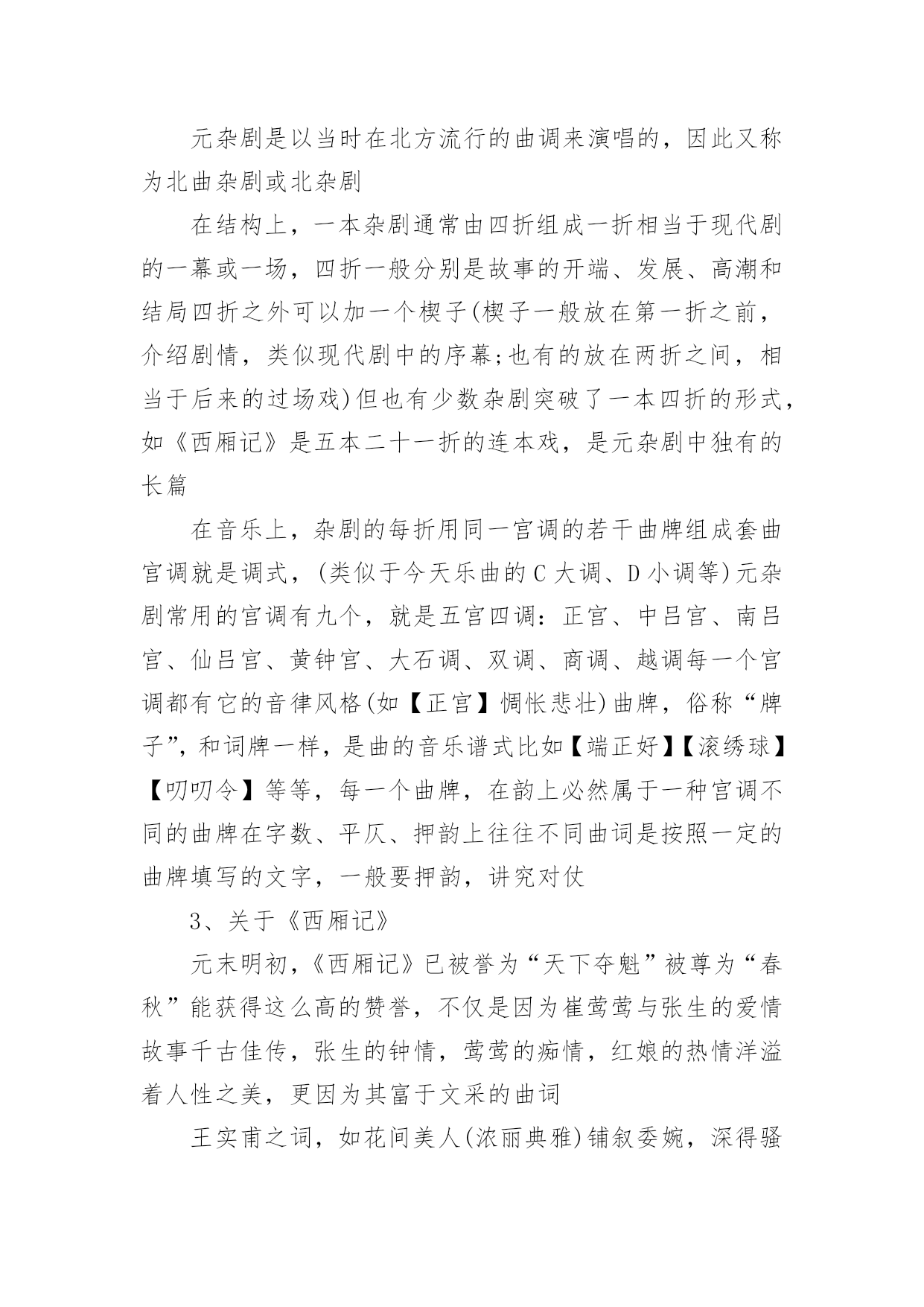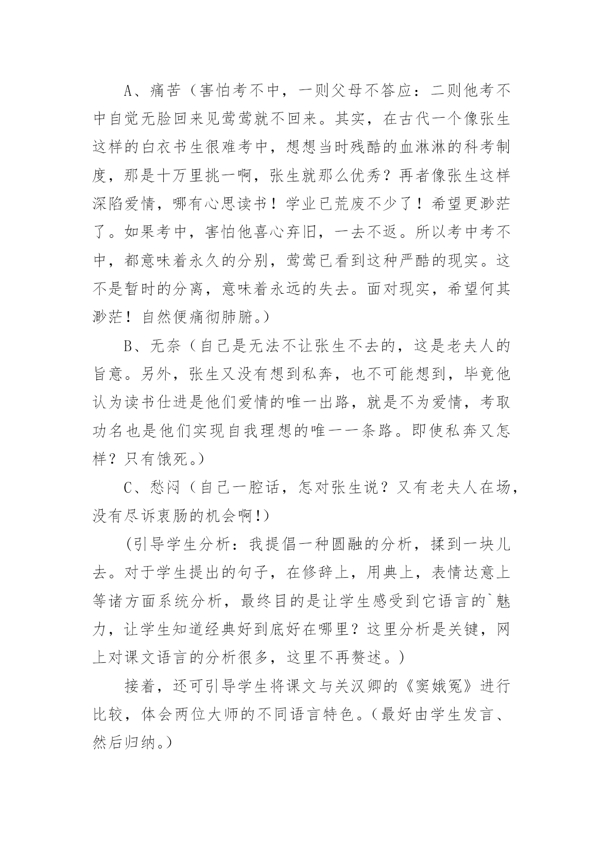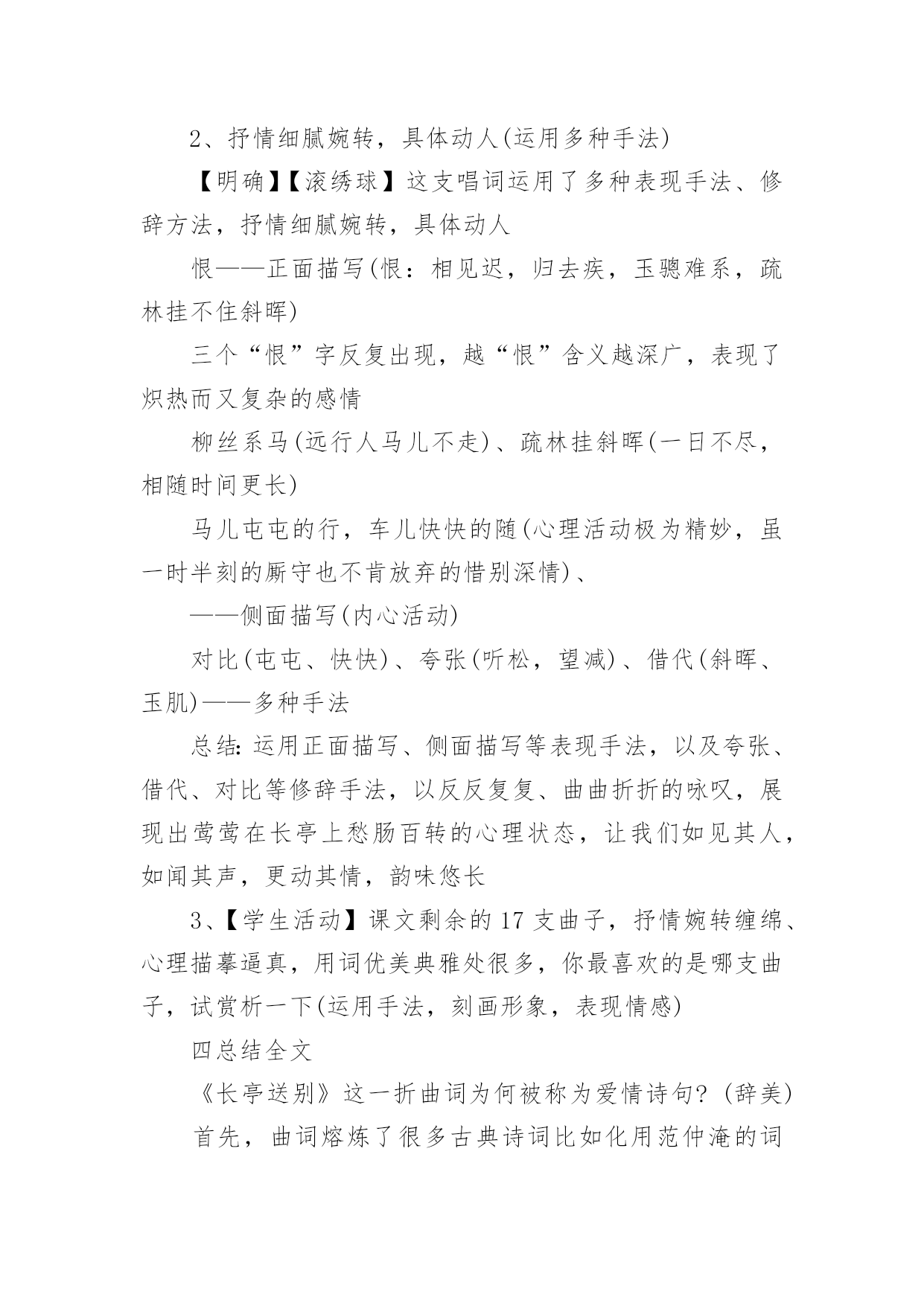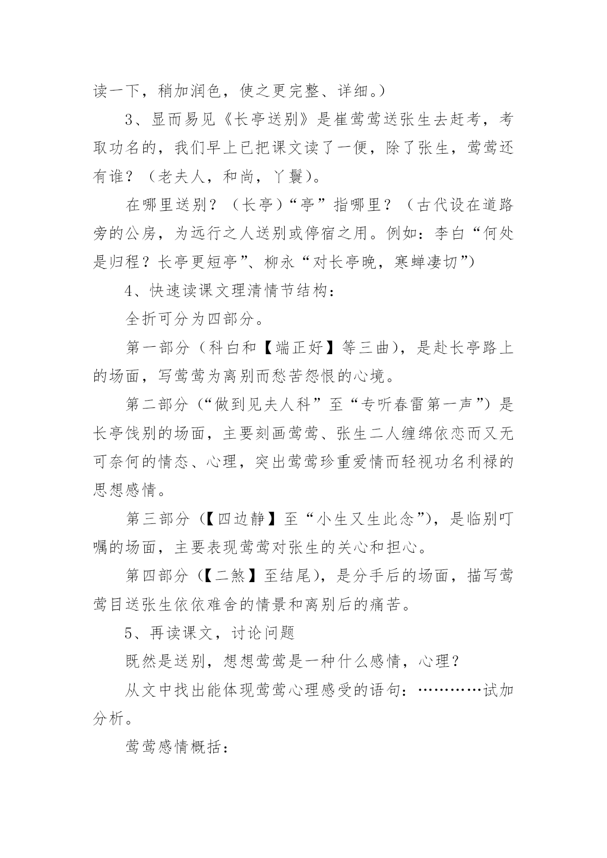 《送别》教学设计《送别》教学设计作为一名为他人授业解惑的教育工作者,编写教学设计是必不可少的,教学设计是实现教学目标的计划性和决策性活动。我们应该怎么写教学设计呢?以下是小编为大家整理的《送别》教学设计,欢迎阅读,希望大家能够喜欢。《送别》教学设计1教学目标:1.了解元杂剧的特点和成就,了解《西厢记》的艺术成就2.了解本课“花间美人”的艺术风格,鉴赏剧作典雅艳丽的唱词语言,体味剧作情景交融的艺术境界,学习本文运用多种修辞表现人物性格特征的写法教学重点:鉴赏情景交融的艺术境界和多种修辞方法对表情达意的作用教学设想:1、以诵读为基础,以文学鉴赏为纽带,带动词句的理解和思想内容的分析及艺术手法的鉴赏2、为突出重点,突破难点,应在疏理剧情的基础上,重点赏读曲词,通过诵读、比较,让学生掌握有关知识,进行文学鉴赏的训练3、重视诵读,背诵开头一曲与结尾两曲教学过程:一导语有一部戏曲演了几百年,仍长盛不衰,剧中的故事流传了几百年,至今读来仍让后人柔肠百转,不忍释怀,这就是王实甫的元曲《西厢记》拥有高贵地位的相国千金崔莺莺,和书剑飘零的布衣书生张珙一见钟情,他们以清风明月为证,私订终生但是,这却让崔莺莺的母亲恼怒不已,这样门不当、户不对的婚姻是她万万不能接受的,她以崔家三代不招白衣秀才为由,逼张生进京赶考,中得状元才能成婚莺莺无奈,只得在长亭送别张生“昨夜成亲,今日别离”,此时的她会有怎样的一番滋味在心头呢?今天就让我们一起来走进《西厢记》,走进《长亭送别》,感受这部爱情诗剧的优美动人二解题1、关于元曲元曲是元代特有的文学艺术形式,它分为散曲和杂剧两部分散曲包括小令和套数两种,小令是不成套的散曲套数是统属于一个宫调的成套的散曲小令和散套都要按一定的宫调来演唱,2、关于元杂剧元杂剧是以当时在北方流行的曲调来演唱的,因此又称为北曲杂剧或北杂剧在结构上,一本杂剧通常由四折组成一折相当于现代剧的一幕或一场,四折一般分别是故事的开端、发展、高潮和结局四折之外可以加一个楔子(楔子一般放在第一折之前,介绍剧情,类似现代剧中的序幕;也有的放在两折之间,相当于后来的过场戏)但也有少数杂剧突破了一本四折的形式,如《西厢记》是五本二十一折的连本戏,是元杂剧中独有的长篇在音乐上,杂剧的每折用同一宫调的若干曲牌组成套曲宫调就是调式,(类似于今天乐曲的C大调、D小调等)元杂剧常用的宫调有九个,就是五宫四调:正宫、中吕宫、南吕宫、仙吕宫、黄钟宫、大石调、双调、商调、越调每一个宫调都有它的音律风格(如【正宫】惆怅悲壮)曲牌,俗称“牌子”,和词牌一样,是曲的音乐谱式比如【端正好】【滚绣球】【叨叨令】等等,每一个曲牌,在韵上必然属于一种宫调不同的曲牌在字数、平仄、押韵上往往不同曲词是按照一定的曲牌填写的文字,一般要押韵,讲究对仗3、关于《西厢记》元末明初,《西厢记》已被誉为“天下夺魁”被尊为“春秋”能获得这么高的赞誉,不仅是因为崔莺莺与张生的爱情故事千古佳传,张生的钟情,莺莺的痴情,红娘的热情洋溢着人性之美,更因为其富于文采的曲词王实甫之词,如花间美人(浓丽典雅)铺叙委婉,深得骚人之趣,极有佳句,若玉环之出浴华清,绿珠之采莲洛浦——朱劝《太和正音谱》《长亭送别》这一折又尤其突出诗词曲不分家,今天就让我们用鉴赏诗词的方法来赏析这一折的精彩唱词三唱词赏析《长亭送别》被誉为写离愁别恨的绝唱“昨夜成亲,今日别离”,我们却看不见呼天抢地,也没有抱头痛哭,我们看到只是“碧云天,黄花地,西风紧,北雁南飞”那种诗意的迷惘和浓浓的哀愁让我们一起赏析【端正好】【滚绣球】,把握剧作家营造这种诗意的方法【学生活动】1、齐读【端正好】【滚绣球】2、思考:写的好么?为什么?【明确】1、文辞典雅,富有诗意(融合唐诗宋词、融情于景、下词传神)碧云天,黄花地,西风紧,北雁南飞选取了带有季节特征的意象,蓝天的白云,凋萎堆积的黄花,南飞的大雁,如丹的枫叶,大块用色,着意点染,他们在凄紧的西风中融成一体,构成了寥廓萧瑟、令人黯然神伤的暮秋图景(用词准确)化用抒情意境【苏幕遮】(打苏幕遮全词)(学生读?)旅次乡愁、离情别恨,(为何借用其秋景?)取暮秋典型意象,用萧瑟凄凉的意境,以烘托送别的凄冷氛围(两者表现离愁别绪方面有异曲同工之妙)这段曲词句句是景,只一“泪”字是情衬托出莺莺为离别所烦恼的痛苦压抑心情(借用意境,还要将之与剧情融合,剧作家下词就必须极为讲究)西风紧“猛”?不好,还有停歇的时候,只是客观状态,“紧”,一阵紧接着一阵,没有停歇,凉风阵阵,吹得人心头渐凉,(难过之时)心头发紧,契合离别的心境;若不是风凄紧,蓝天白云黄花红叶,归雁成阵,莺莺所见,一派俊爽空灵的景象,不合情理,“紧”表现出暮秋图的凄迷萧瑟,以烘托出主人公悲凉的心境晓来谁染霜林醉?总是离人泪(离人的泪水将枫叶打红)“抹”?不好,表层的,“染”,