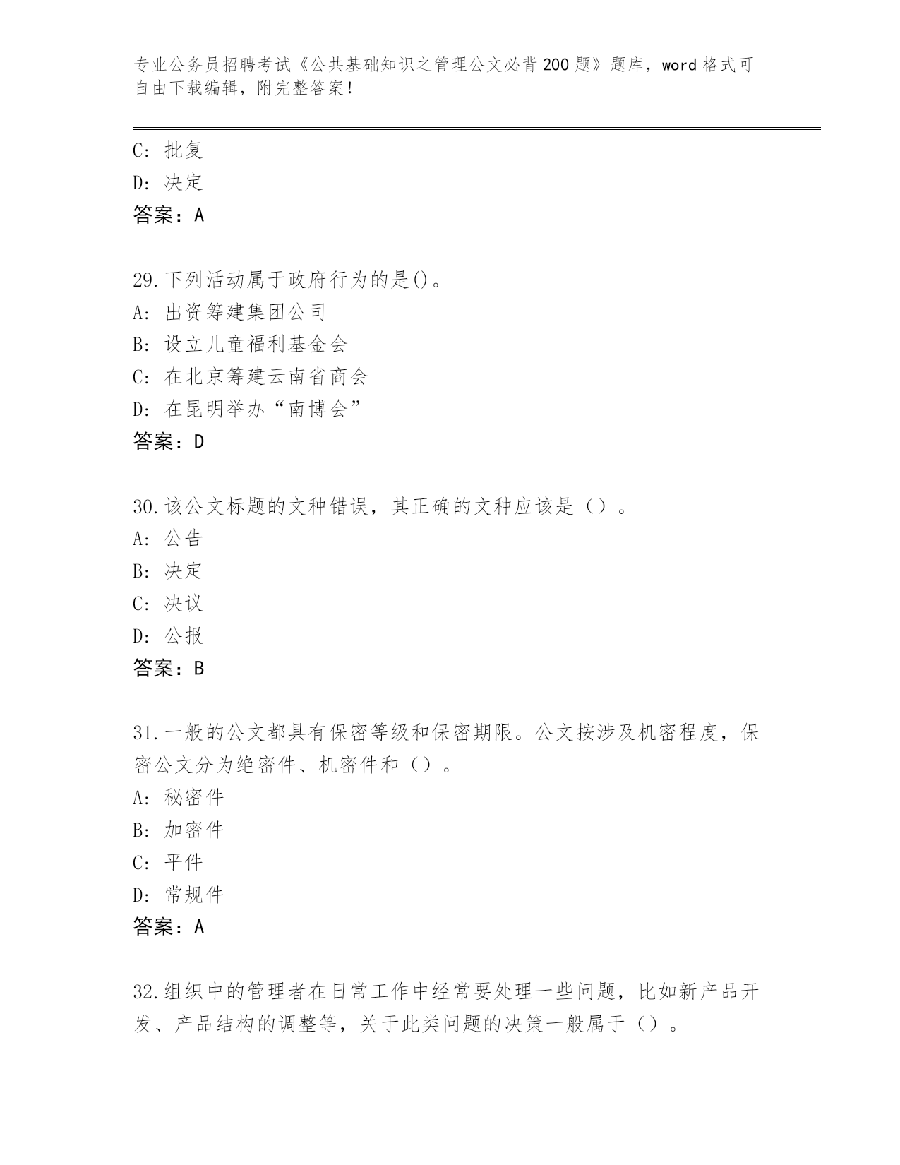 河北省青县2024年公务员招聘考试《公共基础知识之管理公文必背200题》内部题库【培优A卷】
