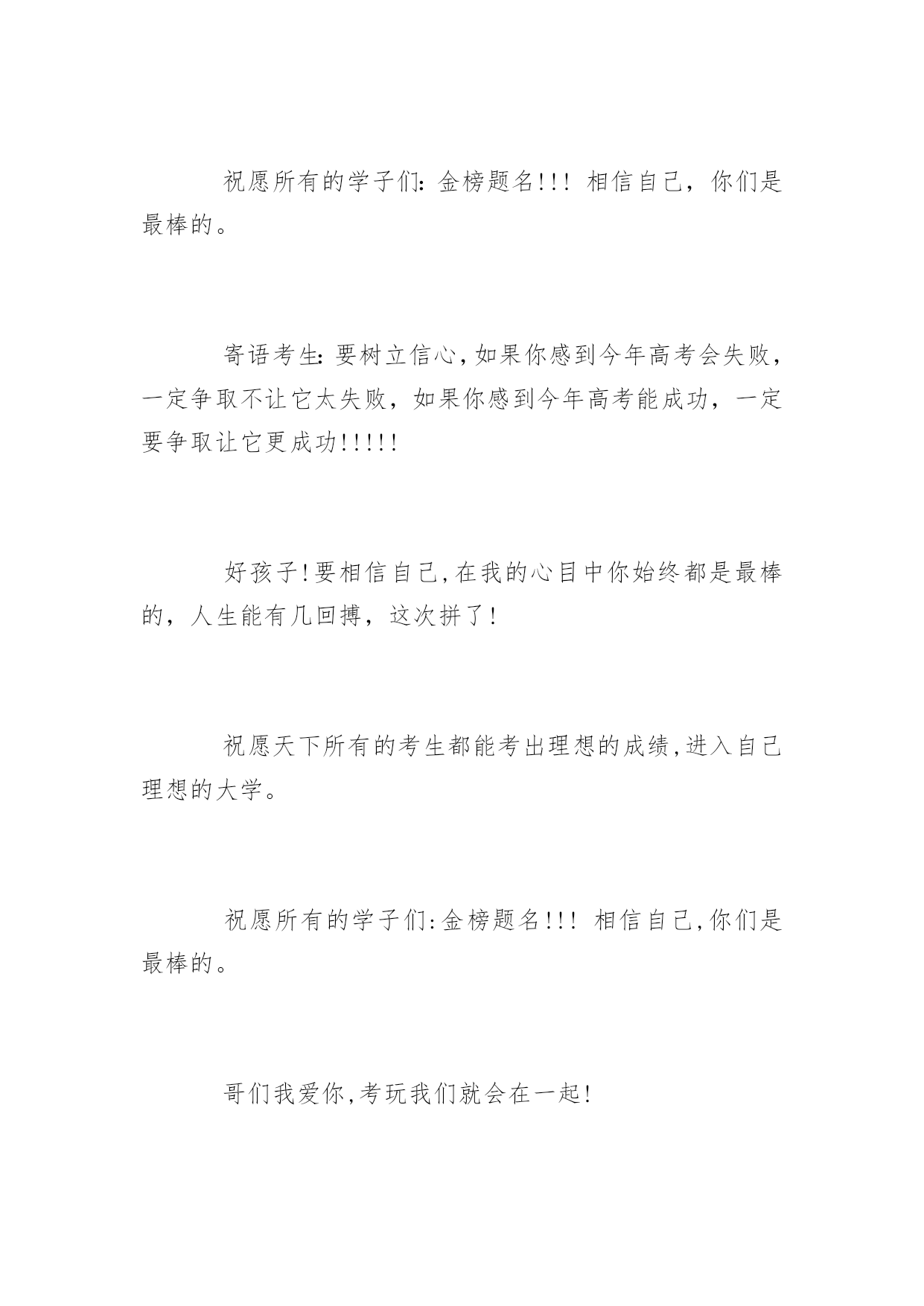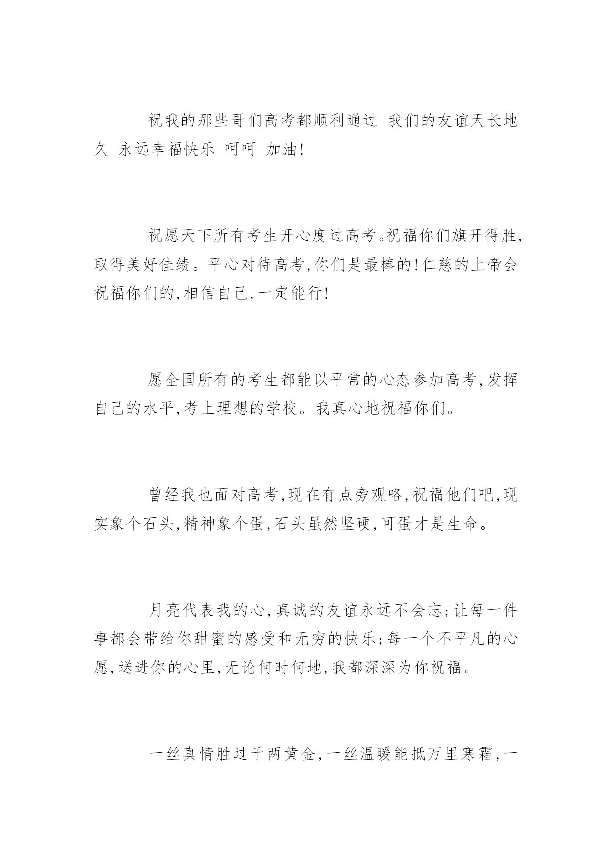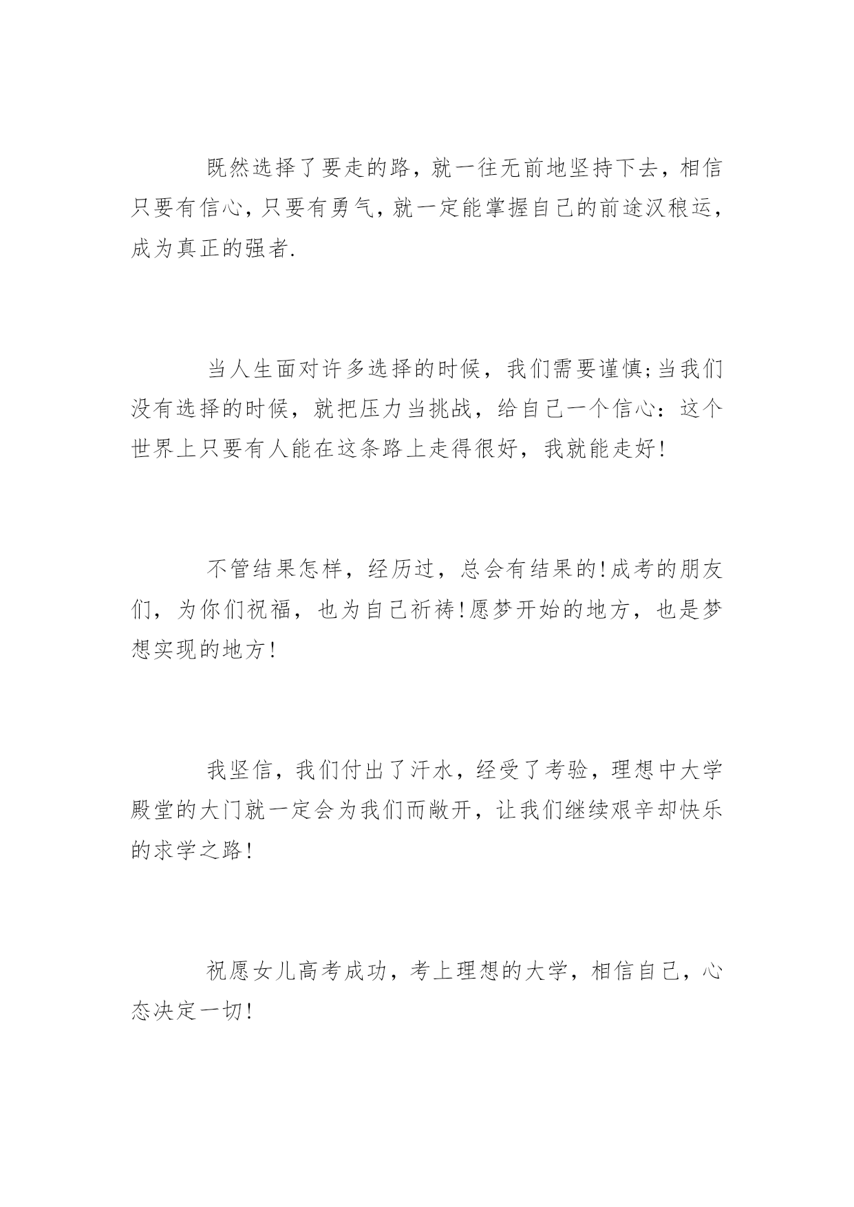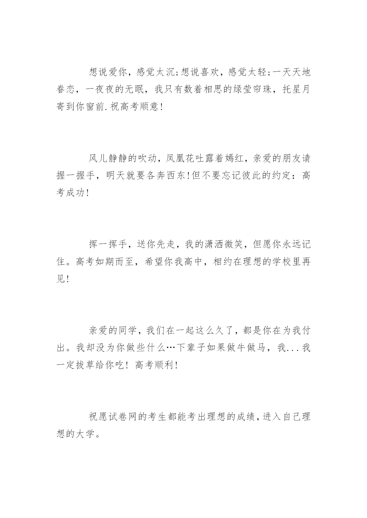 祝福高考成功的祝愿语上帝总是会垂青付出汗水的人!相信你可以进入理想的大学。祝愿天下所有考生开心度过成考。祝福你们旗开得胜,取得美好佳绩。平心对待成考,你们是最棒的!仁慈的上帝会祝福你们的,相信自己,一定能行!愿全国所有的考生都能以平常的心态参加成考,发挥自己的水平,考上理想的学校。我真心地祝福你们。路始终要走不必回头都是天空下的孩子都是四季绽放的花儿风雨中都是一张张美丽的脸愿你的双眸在我深处停留你是我的兄长是我的姊妹。十年寒窗苦读日,只盼金榜题名时,祝你成考拿高分,鲤鱼跳龙门!加油既然选择了要走的路,就一往无前地坚持下去,相信只要有信心,只要有勇气,就一定能掌握自己的前途汉稂运,成为真正的强者.当人生面对许多选择的时候,我们需要谨慎;当我们没有选择的时候,就把压力当挑战,给自己一个信心:这个世界上只要有人能在这条路上走得很好,我就能走好!不管结果怎样,经历过,总会有结果的!成考的朋友们,为你们祝福,也为自己祈祷!愿梦开始的地方,也是梦想实现的地方!我坚信,我们付出了汗水,经受了考验,理想中大学殿堂的大门就一定会为我们而敞开,让我们继续艰辛却快乐的求学之路!祝愿女儿高考成功,考上理想的大学,相信自己,心态决定一切!想说爱你,感觉太沉;想说喜欢,感觉太轻;一天天地眷恋,一夜夜的无眠,我只有数着相思的绿莹帘珠,托星月寄到你窗前.祝高考顺意!风儿静静的吹动,凤凰花吐露着嫣红,亲爱的朋友请握一握手,明天就要各奔西东!但不要忘记彼此的约定:高考成功!挥一挥手,送你先走,我的潇洒微笑,但愿你永远记住。高考如期而至,希望你我高中,相约在理想的学校里再见!亲爱的同学,我们在一起这么久了,都是你在为我付出。我却没为你做些什么…下辈子如果做牛做马,我...我一定拔草给你吃!高考顺利!祝愿试卷网的考生都能考出理想的成绩,进入自己理想的大学。祝愿所有的学子们:金榜题名!!!相信自己,你们是最棒的。寄语考生:要树立信心,如果你感到今年高考会失败,一定争取不让它太失败,如果你感到今年高考能成功,一定要争取让它更成功!!!!!好孩子!要相信自己,在我的心目中你始终都是最棒的,人生能有几回搏,这次拼了!祝愿天下所有的考生都能考出理想的成绩,进入自己理想的大学。祝愿所有的学子们:金榜题名!!!相信自己,你们是最棒的。哥们我爱你,考玩我们就会在一起!祝我的那些哥们高考都顺利通过我们的友谊天长地久永远幸福快乐呵呵加油!祝愿天下所有考生开心度过高考。祝福你们旗开得胜,取得美好佳绩。平心对待高考,你们是最棒的!仁慈的上帝会祝福你们的,相信自己,一定能行!愿全国所有的考生都能以平常的心态参加高考,发挥自己的水平,考上理想的学校。我真心地祝福你们。曾经我也面对高考,现在有点旁观咯,祝福他们吧,现实象个石头,精神象个蛋,石头虽然坚硬,可蛋才是生命。月亮代表我的心,真诚的友谊永远不会忘;让每一件事都会带给你甜蜜的感受和无穷的快乐;每一个不平凡的心愿,送进你的心里,无论何时何地,我都深深为你祝福。一丝真情胜过千两黄金,一丝温暖能抵万里寒霜,一声问候送来温馨甜蜜,一条短信捎去我万般心意,忙碌的日子好好照顾自己。