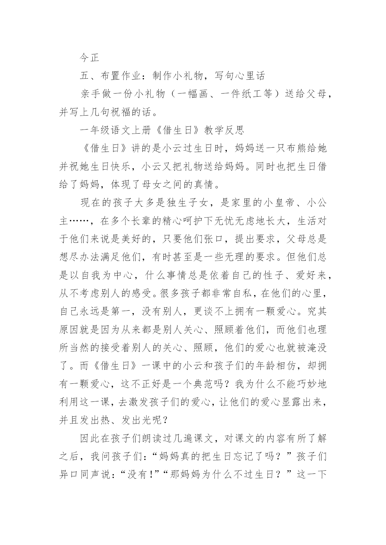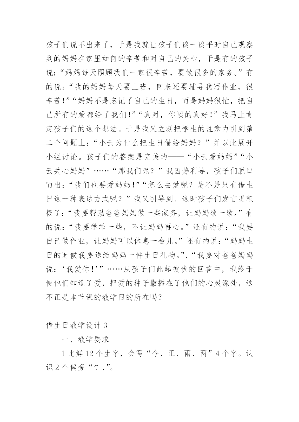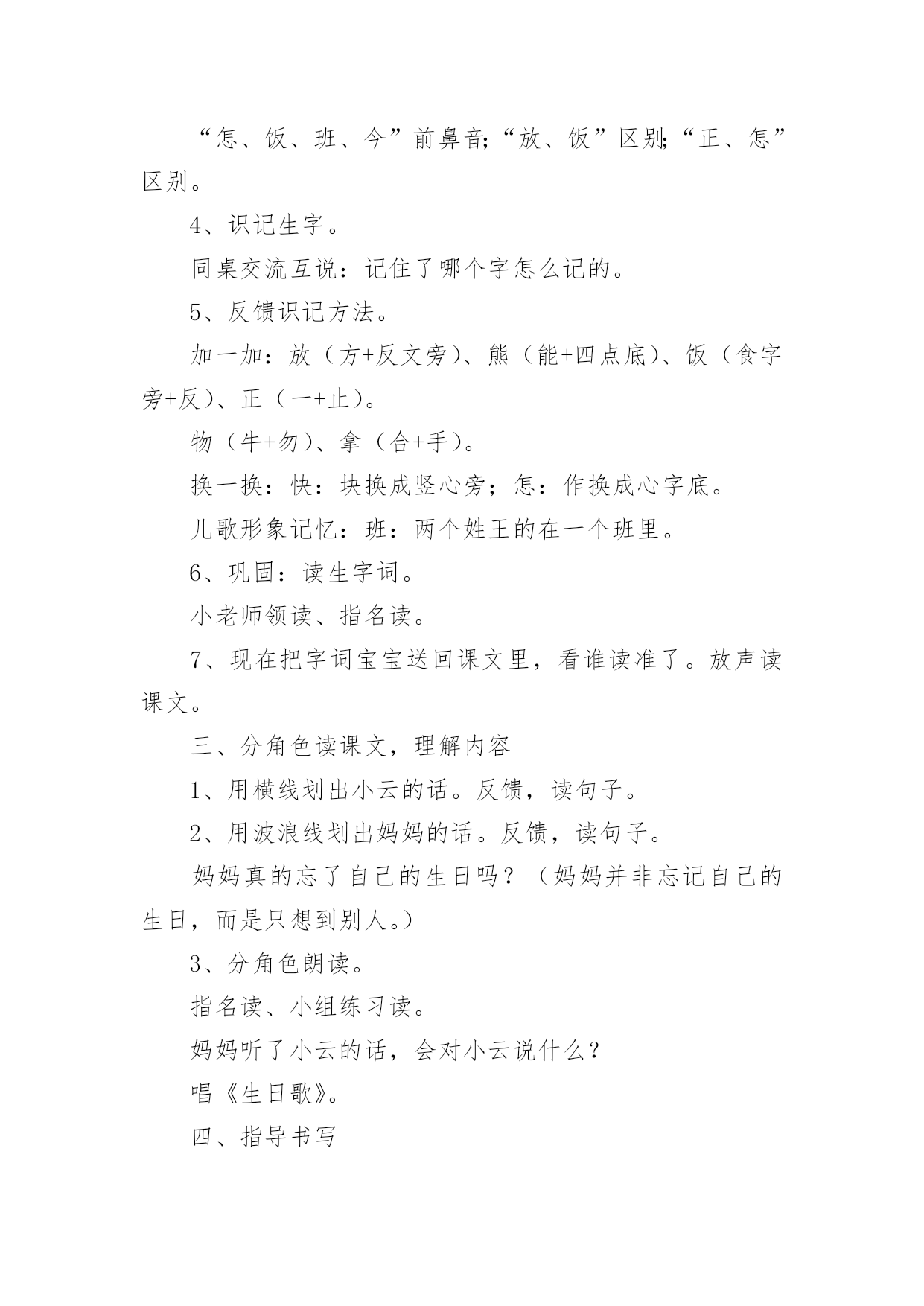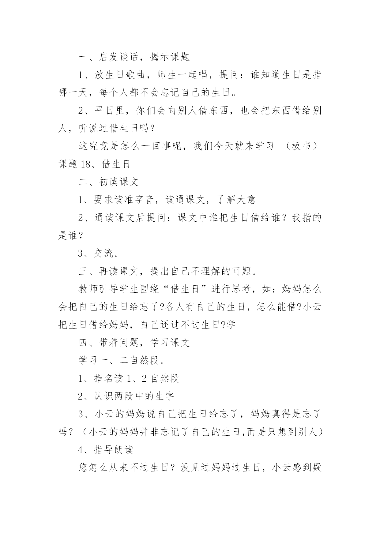 借生日教学设计作为一名辛苦耕耘的教育工作者,常常需要准备教学设计,教学设计是实现教学目标的计划性和决策性活动。那么写教学设计需要注意哪些问题呢?以下是小编收集整理的借生日教学设计,供大家参考借鉴,希望可以帮助到有需要的朋友。借生日教学设计1教学目标:1、认识12个生字,会写今、正、雨、两4个字。认识2个偏旁饣、牛2、正确、流利、有感情地朗读课文3、理解课文内容,知道小云借生日给妈妈的原因教学重点、难点:认识本课的生字和朗读课文,从故事中了解母女间的情感教学准备:1、《生日歌》《天下的妈妈都是一样的》歌曲录音带。2、要求学生问问家长什么叫生日,记住父、母亲的生日。教学课时:2课时教学过程:第一课时一、启发谈话,揭示课题1、放生日歌曲,师生一起唱,提问:谁知道生日是指哪一天,每个人都不会忘记自己的生日。2、平日里,你们会向别人借东西,也会把东西借给别人,听说过借生日吗?这究竟是怎么一回事呢,我们今天就来学习(板书)课题18、借生日二、初读课文1、要求读准字音,读通课文,了解大意2、通读课文后提问:课文中谁把生日借给谁?我指的是谁?3、交流。三、再读课文,提出自己不理解的问题。教师引导学生围绕“借生日”进行思考,如:妈妈怎么会把自己的生日给忘了?各人有自己的生日,怎么能借?小云把生日借给妈妈,自己还过不过生日?学四、带着问题,学习课文学习一、二自然段。1、指名读1、2自然段2、认识两段中的生字3、小云的妈妈说自己把生日给忘了,妈妈真得是忘了吗?(小云的妈妈并非忘记了自己的生日,而是只想到别人)4、指导朗读您怎么从来不过生日?没见过妈妈过生日,小云感到疑惑,要突出从来,读出纳闷的语气。学习三、四自然段1、指名接读三、四自然段2、小云把生日借给妈妈前,心里会想些什么?(大家讨论后,明白小云在妈妈的影响下,懂得了关心妈妈,同学们应该向她学习)3、指导朗读最后两句话是她经过思考想出的办法,要读出肯定的语气,表现出小云的天真可爱。五、全文朗读1、分角色朗读课文,师生读,同学与同学读2、配《天下的妈妈都是一样的》音乐读第二课时一、复习导入。1、有感情地朗读课文2、抽读生字卡。二、识记生字。要求:1、读准字音,注意正、怎、饭、拿等字的读音2、分析字形,用不同的办法来记忆1、学生用自己喜欢的符号标出课文中不认识的字词2、小组合作,互相帮助认读生字3、教师出示生字卡,请学生帮老师认读,并说说是运用什么方法或通过什么途径记住这些字词的4、大声朗读生字词5、出示贴字的花盆图片,请学生用生字组词,并将组好的词写在花形图片上6、评选花开得又多又好的一组7、大声朗读词语三、指导写字今:撇尖低,捺脚稍高,开口度大,撇捺相接处,点和横收笔都在竖中线上。正:注意横,竖的长度,第二横是长横的一半,左竖是右竖的一半,最后一横长,稍凸起托连竖。雨:冂要宽,蹭的竖,不出框,最后四点两两对称,如隔窗看檐下的雨水均匀滴下。两:冂内两个人字分布均匀,人的捺均变为点。3、学生写字,老师巡回指导四、复习巩固1、复习课文内容,完成课后练习题⑴先让学生自己说一说提示:红花中的字可以做词头,也可做词尾2、分小组比赛3、每组选出代表,全班比赛作业设计:1、制作小礼物送给父母,写句心里话2、记住本课书写的生字。板书设计:借生日教学设计2教学目标:1、认识12个生字,认识2个偏旁"饣、牛"。2、正确、流利地朗读课文。3、会写“今、正”2个生字。教学重点:认识12个生字,认识2个偏旁"饣、牛"。教学难点:正确、流利地朗读课文。教学过程:一、谈话揭题1、板书:生日。小朋友记得自己的生日吗?讲讲你的生日是怎么过的。2、今天,有一位小朋友,她叫小云,她要把自己的生日借给妈妈。板书完课题:借生日。读课题。你平时向别人借过什么东西?3、质疑:生日怎么借啊?小云为什么要把生日借给妈妈呢?我们一起到课文中去看看吧!二、初读课文,认识生字1、听电脑范读课文。2、自己认真读。3、指名分小节读。随机出示生字,读准字音。“放、熊、正”后鼻音。“怎、饭、班、今”前鼻音;“放、饭”区别;“正、怎”区别。4、识记生字。同桌交流互说:记住了哪个字怎么记的。5、反馈识记方法。加一加:放(方+反文旁)、熊(能+四点底)、饭(食字旁+反)、正(一+止)。物(牛+勿)、拿(合+手)。换一换:快:块换成竖心旁;怎:作换成心字底。儿歌形象记忆:班:两个姓王的在一个班里。6、巩固:读生字词。小老师领读、指名读。7、现在把字词宝宝送回课文里,看谁读准了。放声读课文。三、分角色读课文,理解内容1、用横线划出小云的话。反馈,读句子。2、用波浪线划出妈妈的话。反馈,读句子。妈妈真的忘了自己的生日吗?(妈妈并非忘记自己的生日,而是只想到别人。)3、分角色朗读。指名读、小组练习读。妈妈听了小云的话,会对小云说什么?唱《生日歌》。四、指导书写今正五、