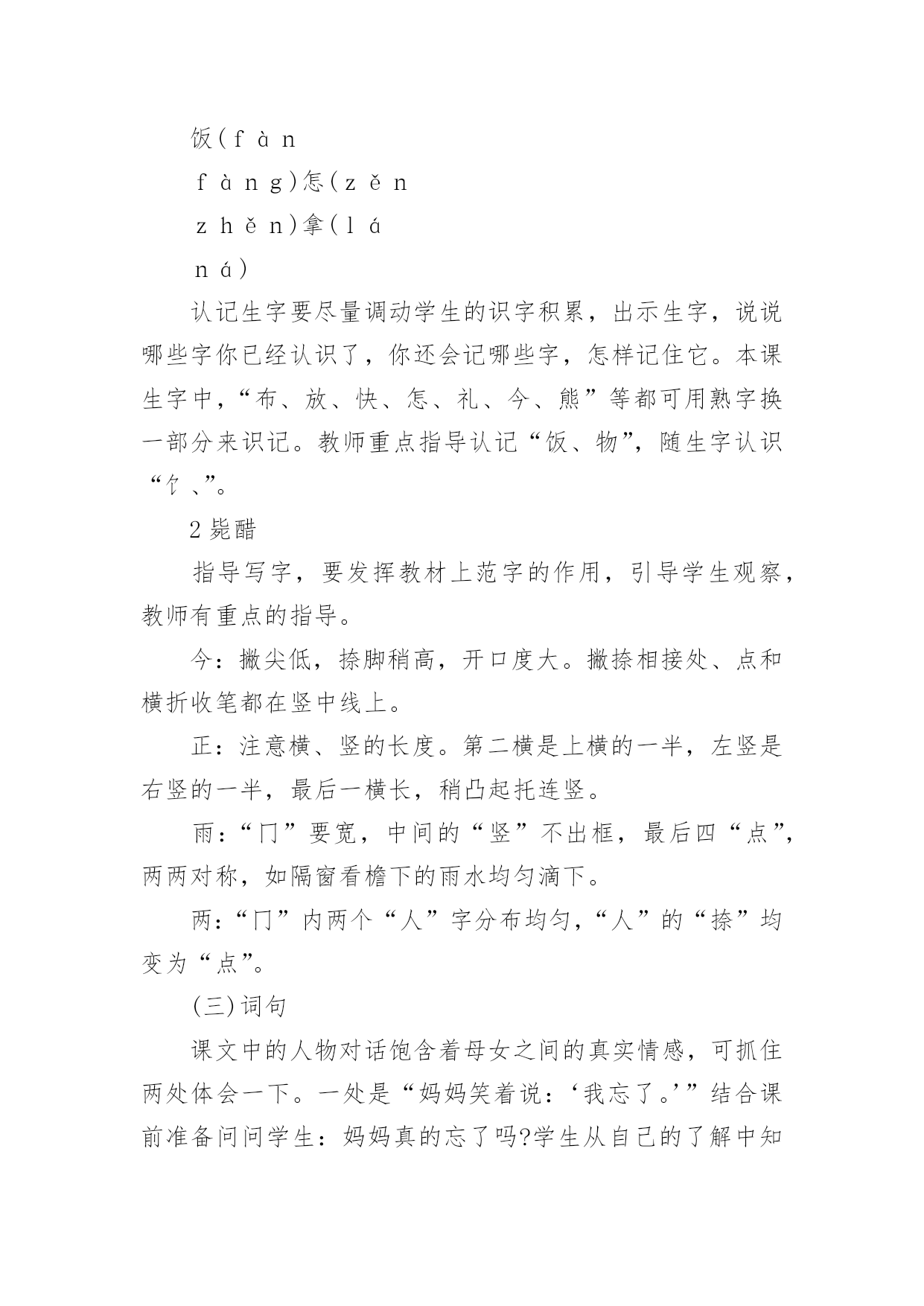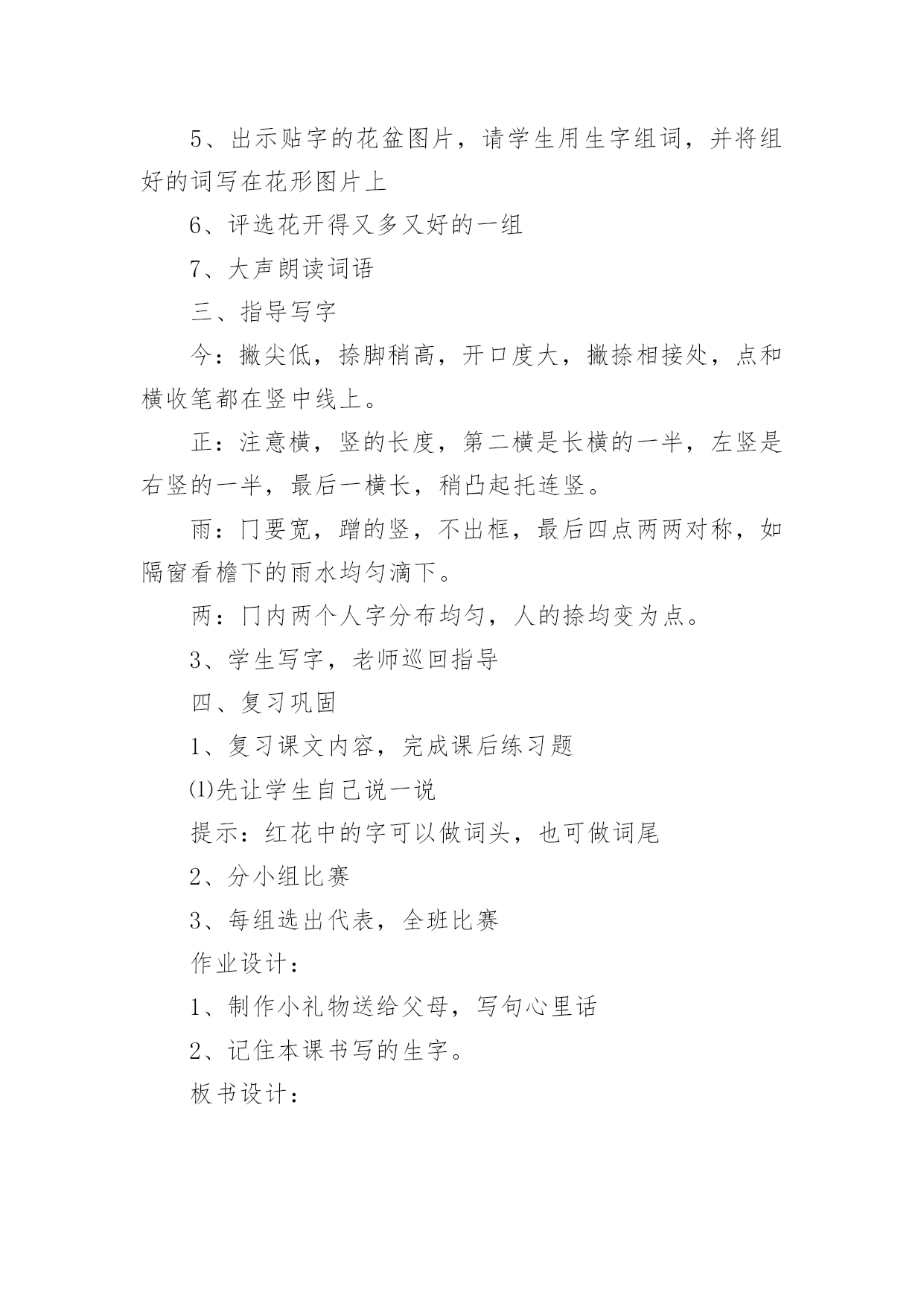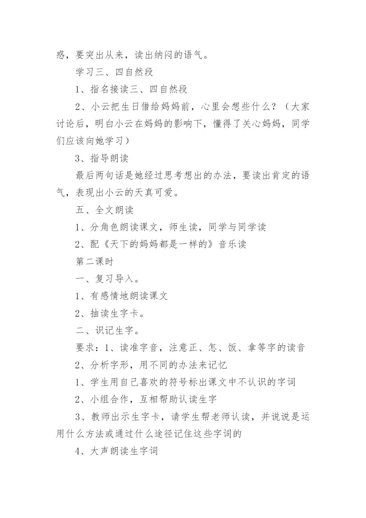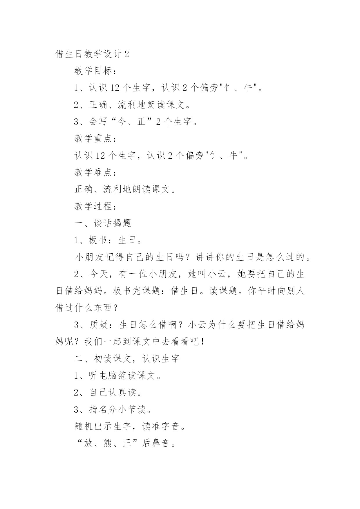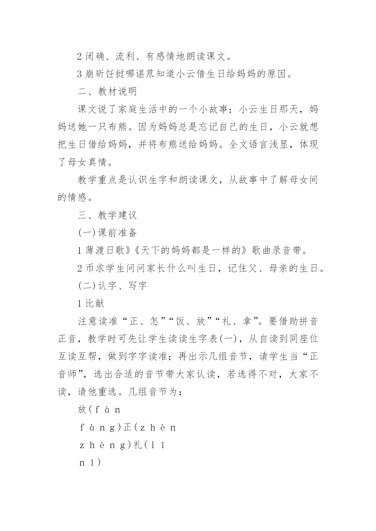借生日教学设计作为一名辛苦耕耘的教育工作者,常常需要准备教学设计,教学设计是实现教学目标的计划性和决策性活动。那么写教学设计需要注意哪些问题呢?以下是小编收集整理的借生日教学设计,供大家参考借鉴,希望可以帮助到有需要的朋友。借生日教学设计1教学目标:1、认识12个生字,会写今、正、雨、两4个字。认识2个偏旁饣、牛2、正确、流利、有感情地朗读课文3、理解课文内容,知道小云借生日给妈妈的原因教学重点、难点:认识本课的生字和朗读课文,从故事中了解母女间的情感教学准备:1、《生日歌》《天下的妈妈都是一样的》歌曲录音带。2、要求学生问问家长什么叫生日,记住父、母亲的生日。教学课时:2课时教学过程:第一课时一、启发谈话,揭示课题1、放生日歌曲,师生一起唱,提问:谁知道生日是指哪一天,每个人都不会忘记自己的生日。2、平日里,你们会向别人借东西,也会把东西借给别人,听说过借生日吗?这究竟是怎么一回事呢,我们今天就来学习(板书)课题18、借生日二、初读课文1、要求读准字音,读通课文,了解大意2、通读课文后提问:课文中谁把生日借给谁?我指的是谁?3、交流。三、再读课文,提出自己不理解的问题。教师引导学生围绕“借生日”进行思考,如:妈妈怎么会把自己的生日给忘了?各人有自己的生日,怎么能借?小云把生日借给妈妈,自己还过不过生日?学四、带着问题,学习课文学习一、二自然段。1、指名读1、2自然段2、认识两段中的生字3、小云的妈妈说自己把生日给忘了,妈妈真得是忘了吗?(小云的妈妈并非忘记了自己的生日,而是只想到别人)4、指导朗读您怎么从来不过生日?没见过妈妈过生日,小云感到疑惑,要突出从来,读出纳闷的语气。学习三、四自然段1、指名接读三、四自然段2、小云把生日借给妈妈前,心里会想些什么?(大家讨论后,明白小云在妈妈的影响下,懂得了关心妈妈,同学们应该向她学习)3、指导朗读最后两句话是她经过思考想出的办法,要读出肯定的语气,表现出小云的天真可爱。五、全文朗读1、分角色朗读课文,师生读,同学与同学读2、配《天下的妈妈都是一样的》音乐读第二课时一、复习导入。1、有感情地朗读课文2、抽读生字卡。二、识记生字。要求:1、读准字音,注意正、怎、饭、拿等字的读音2、分析字形,用不同的办法来记忆1、学生用自己喜欢的符号标出课文中不认识的字词2、小组合作,互相帮助认读生字3、教师出示生字卡,请学生帮老师认读,并说说是运用什么方法或通过什么途径记住这些字词的4、大声朗读生字词5、出示贴字的花盆图片,请学生用生字组词,并将组好的词写在花形图片上6、评选花开得又多又好的一组7、大声朗读词语三、指导写字今:撇尖低,捺脚稍高,开口度大,撇捺相接处,点和横收笔都在竖中线上。正:注意横,竖的长度,第二横是长横的一半,左竖是右竖的一半,最后一横长,稍凸起托连竖。雨:冂要宽,蹭的竖,不出框,最后四点两两对称,如隔窗看檐下的雨水均匀滴下。两:冂内两个人字分布均匀,人的捺均变为点。3、学生写字,老师巡回指导四、复习巩固1、复习课文内容,完成课后练习题⑴先让学生自己说一说提示:红花中的字可以做词头,也可做词尾2、分小组比赛3、每组选出代表,全班比赛作业设计:1、制作小礼物送给父母,写句心里话2、记住本课书写的生字。板书设计:借生日教学设计2教学目标:1、认识12个生字,认识2个偏旁"饣、牛"。2、正确、流利地朗读课文。3、会写“今、正”2个生字。教学重点:认识12个生字,认识2个偏旁"饣、牛"。教学难点:正确、流利地朗读课文。教学过程:一、谈话揭题1、板书:生日。小朋友记得自己的生日吗?讲讲你的生日是怎么过的。2、今天,有一位小朋友,她叫小云,她要把自己的生日借给妈妈。板书完课题:借生日。读课题。你平时向别人借过什么东西?3、质疑:生日怎么借啊?小云为什么要把生日借给妈妈呢?我们一起到课文中去看看吧!二、初读课文,认识生字1、听电脑范读课文。2、自己认真读。3、指名分小节读。随机出示生字,读准字音。“放、熊、正”后鼻音。“怎、饭、班、今”前鼻音;“放、饭”区别;“正、怎”区别。4、识记生字。同桌交流互说:记住了哪个字怎么记的。5、反馈识记方法。加一加:放(方+反文旁)、熊(能+四点底)、饭(食字旁+反)、正(一+止)。物(牛+勿)、拿(合+手)。换一换:快:块换成竖心旁;怎:作换成心字底。儿歌形象记忆:班:两个姓王的在一个班里。6、巩固:读生字词。小老师领读、指名读。7、现在把字词宝宝送回课文里,看谁读准了。放声读课文。三、分角色读课文,理解内容1、用横线划出小云的话。反馈,读句子。2、用波浪线划出妈妈的话。反馈,读句子。妈妈真的忘了自己的生日吗?(妈妈并非忘记自己的生日,而是只想到别人。)3、分角色朗读。指名读、小组练习读。妈妈听了小云的话,会对小云说什么?唱《生日歌》。四、指导书写今正五、