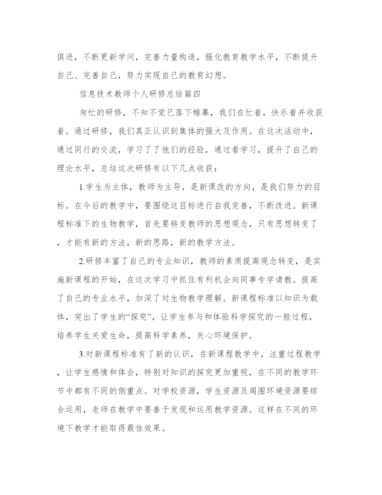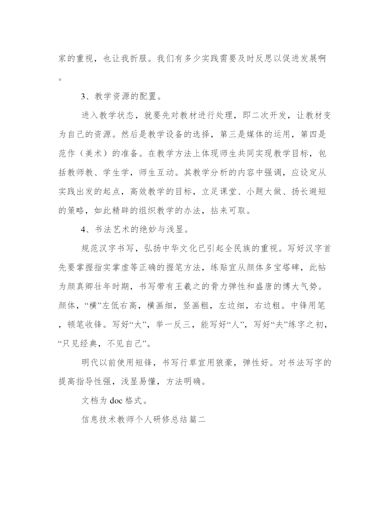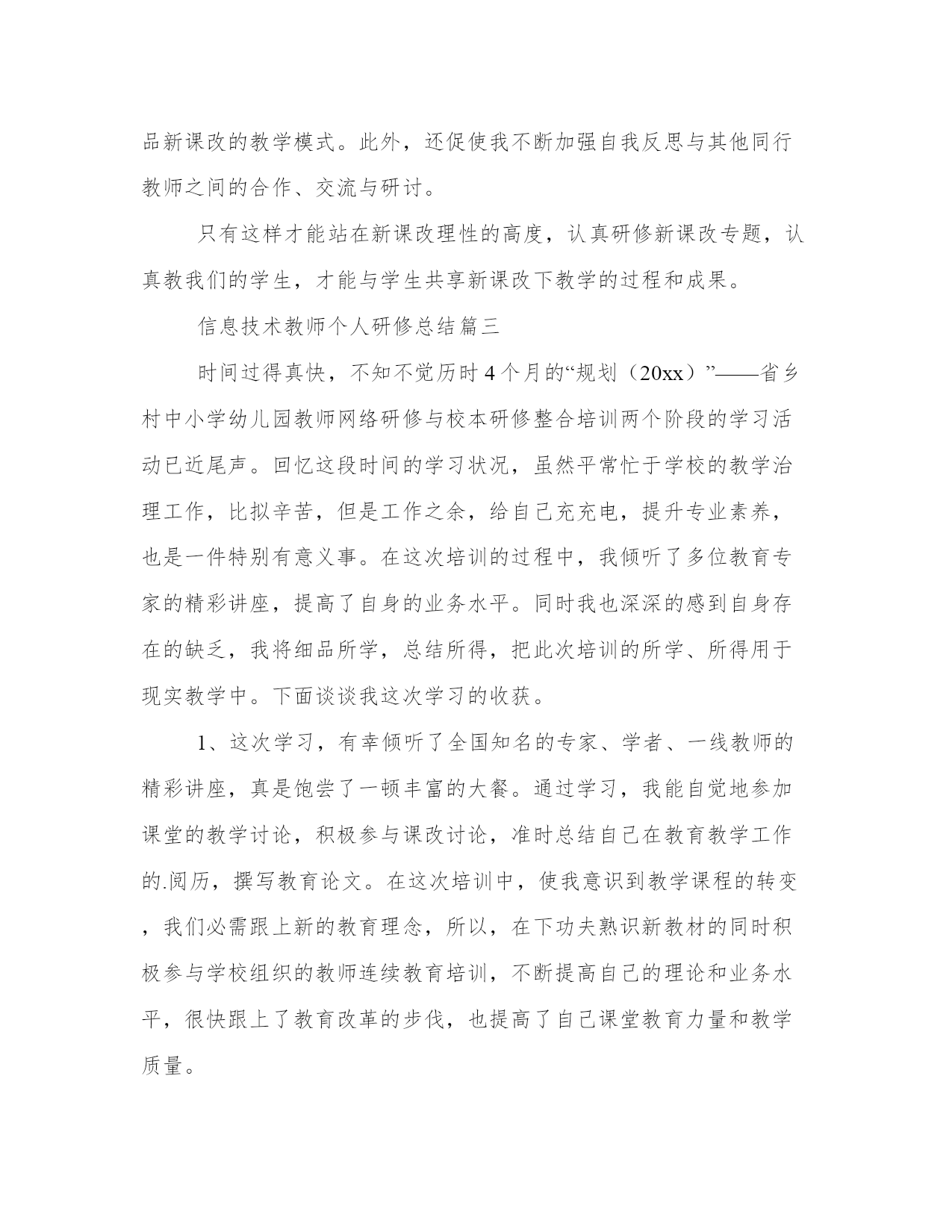 信息技术教师个人研修总结(优秀18篇)总结,是对前一阶段工作的经验、教训的分析分析,借此上升到理论的高度,并从中提炼出有规律性的东西,从而提高认识,以正确的认识来把握客观事物,更好地指导今后的实际工作。总结怎么写才能发挥它最大的作用呢?以下是小编收集整理的工作总结书范文,仅供参考,希望能够帮助到大家。信息技术教师个人研修总结篇一曾几何时,带着追寻艺术的梦想,我踏上了美术探索之路。从素描、色彩的基本功,从无限热情地带领学生感受美术,一步步走来,多少汗水凝结多少荣誉,学生长大了奋飞了,我也在版画、山水画的艺术风格的表达上拥有了更多建树。版画使我尽早参加地区画展,走入艺术展示的殿堂,山水画创作使我奠定了如今的自我艺术取向。在选择更广阔的艺术视野,探究更深邃的美术理念的时候,我参加了20xx年国培计划xx大学开办的xx农村中小学美术教师研修培训,为期3个月。正如入学手册所说,90天不短,因为暂别熟悉的家园,90天不长,因为每一天都是新鲜。从上海师范大学著名专家黎加厚教授的走向创造性教育的畅谈,到全国十佳优秀班主任段惠民老师的做智慧班主任,再到华东师大教学分析所吴刚平教授的教学方式变革的知识基础,首都师范大学夏鹏翔教授的高效课堂,南京师范大学教授中国美术教育副主编崔卫的美术教学实践与分析方法,新师大教授中国书法家协会xx书法考级中心主任李鸿仪的书法教学方法与指导,再有新师大武君老师、美术班班主任李晓峰老师以及乌鲁木齐市教研成就突出的中学老师的新课程培训??着实让我大开眼界。有几个引起我重视的话题,特别吸引我的注意力。1、创感时代的到来。现今的信息时代,如此迅猛发展,不过是为人们的创造提供更便捷的工具。创造力,再融入人的共情感、意义感,充分的人文思想,这一全新思维理念成为社会主流,成为时代的引领。将科学与艺术完美结合,放之教学则是创感素养的培养。所幸,我在教学美术。黎加厚大量展示生动可感的资料,风趣的语言引导,引用最新科研成果,使我们倍感亲切,听课一点不觉疲劳。2、强调反思的重要意义。建立良好的师生关系,发现和赏识每一位学生的点滴进步,善于倾听,和蔼可亲,积极与家长沟通,所有这一切,离不开教师反思,以归纳总结,以改进教育教学。最新教师专业标准的基本理念解读为师德为先,学生为本,能力为重,终身学习。其能力方面则进一步强调教学、分析和反思等环节相结合。教学问题的分析方式解决,需分析、讨论、设计、行动、观察、反思。就是这个反思,越来越引起专家的重视,也让我折服。我们有多少实践需要及时反思以促进发展啊。3、教学资源的配置。进入教学状态,就要先对教材进行处理,即二次开发,让教材变为自己的资源。然后是教学设备的选择,第三是媒体的运用,第四是范作(美术)的准备。在教学方法上体现师生共同实现教学目标,包括教师教、学生学,师生互动。其教学分析的内容中强调,应设定从实践出发的起点,高效教学的目标,立足课堂、小题大做、扬长避短的策略,如此精辟的组织教学的办法,拈来可取。4、书法艺术的绝妙与浅显。规范汉字书写,弘扬中华文化已引起全民族的重视。写好汉字首先要掌握指实掌虚等正确的握笔方法,练贴宜从颜体多宝塔碑,此帖为颜真卿壮年时期,书写带有王羲之的骨力弹性和盛唐的博大气势。颜体,“横”左低右高,横画细,竖画粗,左边细,右边粗。中锋用笔,顿笔收锋。写好“大”,举一反三,能写好“人”,写好“夫”练字之初,“只见经典,不见自己”。明代以前使用短锋,书写行草宜用狼豪,弹性好。对书法写字的提高指导性强,浅显易懂,方法明确。文档为doc格式。信息技术教师个人研修总结篇二通过这次研修,促使自己不断反思,对于今后的教学工作起到了积极的促进作用,也对教学有了一种新的理解。一、这次研修时间紧任务重,一边要上课,晚上还要下班辅导,只能每天挤时间进行网上学习,通过学习,使自己在师德修养、教育理念、教学方法等各方面有了很大的提升,驾驭课堂、把握教材、交流沟通、教学设计、班级管理、教学反思等方面也有很多启示,同时更新了教育理论,丰富了教学经验,为今后从事思品教学工作,进一步提高课堂教学效率打下了良好的基础。同时也结识了许多优秀的教师,开阔了视野,充实了自己。二、通过这次研修,让我深深体会到了,只有经常性的进行研修,肯下苦工夫,勤于钻研,才能有所收获。这次远程研修,教会大家敢于面对困难。让大家认识到,其实教学过程也是一样,要想在教育领域里有所贡献,你一定要敢于面对困难并通过不懈的努力,你才会有所成就。同时还要带动其他老师积极参与,以促进教师的全面发展。同大家一起在网络研修中健康、快乐的成长!通过这样研修让我认识到,在今后的教学过程中,要把新课程理念运用到自己的教学实践中。不断学习,总结教学经验,选择恰当的行之有效的教学方法、教学手段,自觉运用探究的学