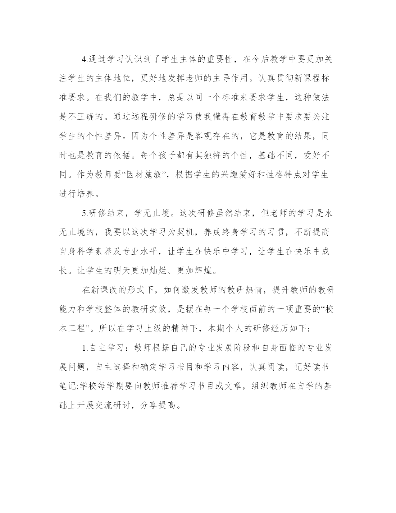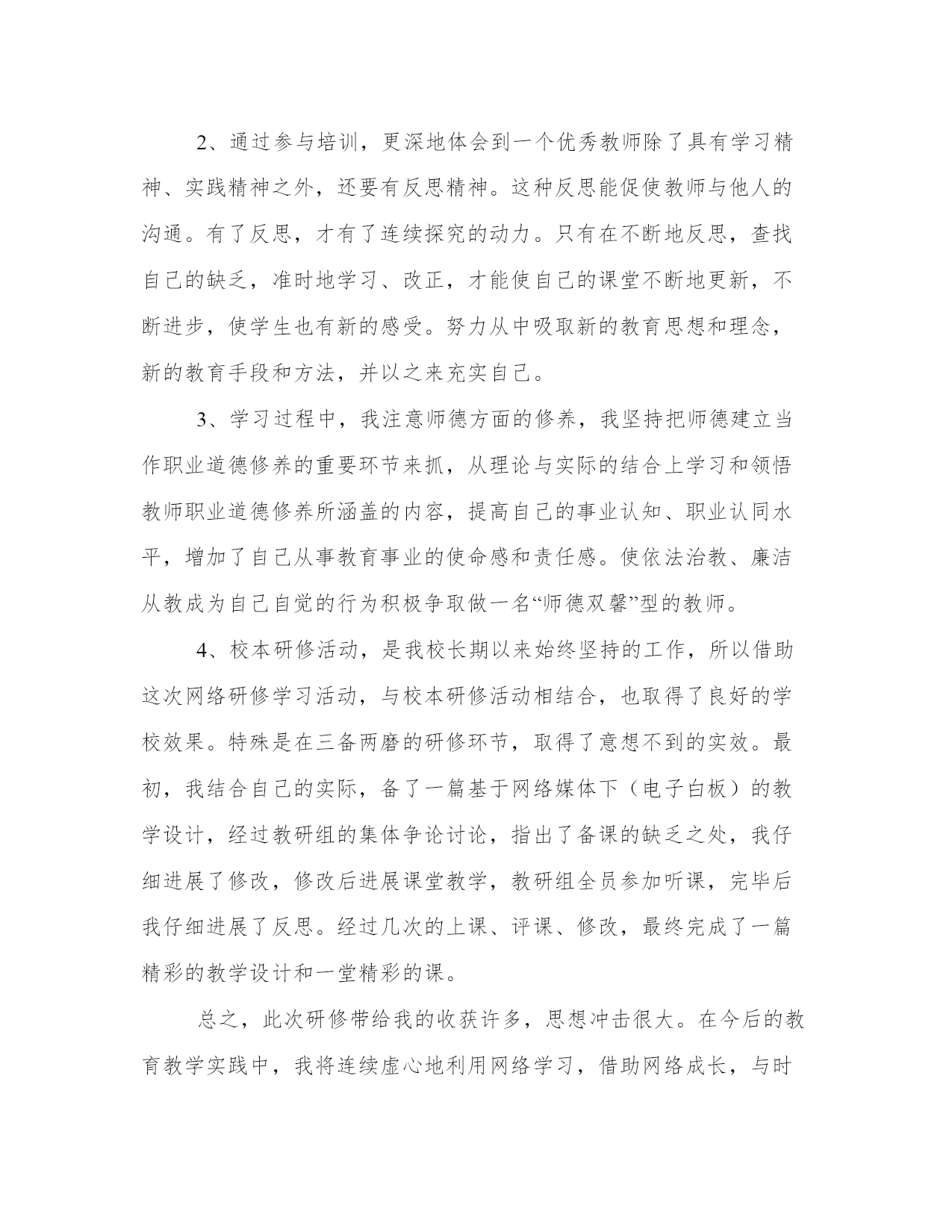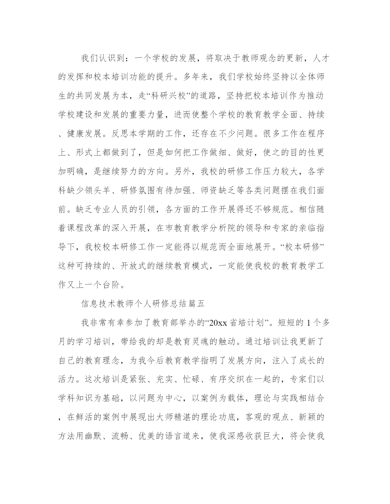 信息技术教师个人研修总结(优秀18篇)总结,是对前一阶段工作的经验、教训的分析分析,借此上升到理论的高度,并从中提炼出有规律性的东西,从而提高认识,以正确的认识来把握客观事物,更好地指导今后的实际工作。总结怎么写才能发挥它最大的作用呢?以下是小编收集整理的工作总结书范文,仅供参考,希望能够帮助到大家。信息技术教师个人研修总结篇一曾几何时,带着追寻艺术的梦想,我踏上了美术探索之路。从素描、色彩的基本功,从无限热情地带领学生感受美术,一步步走来,多少汗水凝结多少荣誉,学生长大了奋飞了,我也在版画、山水画的艺术风格的表达上拥有了更多建树。版画使我尽早参加地区画展,走入艺术展示的殿堂,山水画创作使我奠定了如今的自我艺术取向。在选择更广阔的艺术视野,探究更深邃的美术理念的时候,我参加了20xx年国培计划xx大学开办的xx农村中小学美术教师研修培训,为期3个月。正如入学手册所说,90天不短,因为暂别熟悉的家园,90天不长,因为每一天都是新鲜。从上海师范大学著名专家黎加厚教授的走向创造性教育的畅谈,到全国十佳优秀班主任段惠民老师的做智慧班主任,再到华东师大教学分析所吴刚平教授的教学方式变革的知识基础,首都师范大学夏鹏翔教授的高效课堂,南京师范大学教授中国美术教育副主编崔卫的美术教学实践与分析方法,新师大教授中国书法家协会xx书法考级中心主任李鸿仪的书法教学方法与指导,再有新师大武君老师、美术班班主任李晓峰老师以及乌鲁木齐市教研成就突出的中学老师的新课程培训??着实让我大开眼界。有几个引起我重视的话题,特别吸引我的注意力。1、创感时代的到来。现今的信息时代,如此迅猛发展,不过是为人们的创造提供更便捷的工具。创造力,再融入人的共情感、意义感,充分的人文思想,这一全新思维理念成为社会主流,成为时代的引领。将科学与艺术完美结合,放之教学则是创感素养的培养。所幸,我在教学美术。黎加厚大量展示生动可感的资料,风趣的语言引导,引用最新科研成果,使我们倍感亲切,听课一点不觉疲劳。2、强调反思的重要意义。建立良好的师生关系,发现和赏识每一位学生的点滴进步,善于倾听,和蔼可亲,积极与家长沟通,所有这一切,离不开教师反思,以归纳总结,以改进教育教学。最新教师专业标准的基本理念解读为师德为先,学生为本,能力为重,终身学习。其能力方面则进一步强调教学、分析和反思等环节相结合。教学问题的分析方式解决,需分析、讨论、设计、行动、观察、反思。就是这个反思,越来越引起专家的重视,也让我折服。我们有多少实践需要及时反思以促进发展啊。3、教学资源的配置。进入教学状态,就要先对教材进行处理,即二次开发,让教材变为自己的资源。然后是教学设备的选择,第三是媒体的运用,第四是范作(美术)的准备。在教学方法上体现师生共同实现教学目标,包括教师教、学生学,师生互动。其教学分析的内容中强调,应设定从实践出发的起点,高效教学的目标,立足课堂、小题大做、扬长避短的策略,如此精辟的组织教学的办法,拈来可取。4、书法艺术的绝妙与浅显。规范汉字书写,弘扬中华文化已引起全民族的重视。写好汉字首先要掌握指实掌虚等正确的握笔方法,练贴宜从颜体多宝塔碑,此帖为颜真卿壮年时期,书写带有王羲之的骨力弹性和盛唐的博大气势。颜体,“横”左低右高,横画细,竖画粗,左边细,右边粗。中锋用笔,顿笔收锋。写好“大”,举一反三,能写好“人”,写好“夫”练字之初,“只见经典,不见自己”。明代以前使用短锋,书写行草宜用狼豪,弹性好。对书法写字的提高指导性强,浅显易懂,方法明确。文档为doc格式。信息技术教师个人研修总结篇二通过这次研修,促使自己不断反思,对于今后的教学工作起到了积极的促进作用,也对教学有了一种新的理解。一、这次研修时间紧任务重,一边要上课,晚上还要下班辅导,只能每天挤时间进行网上学习,通过学习,使自己在师德修养、教育理念、教学方法等各方面有了很大的提升,驾驭课堂、把握教材、交流沟通、教学设计、班级管理、教学反思等方面也有很多启示,同时更新了教育理论,丰富了教学经验,为今后从事思品教学工作,进一步提高课堂教学效率打下了良好的基础。同时也结识了许多优秀的教师,开阔了视野,充实了自己。二、通过这次研修,让我深深体会到了,只有经常性的进行研修,肯下苦工夫,勤于钻研,才能有所收获。这次远程研修,教会大家敢于面对困难。让大家认识到,其实教学过程也是一样,要想在教育领域里有所贡献,你一定要敢于面对困难并通过不懈的努力,你才会有所成就。同时还要带动其他老师积极参与,以促进教师的全面发展。同大家一起在网络研修中健康、快乐的成长!通过这样研修让我认识到,在今后的教学过程中,要把新课程理念运用到自己的教学实践中。不断学习,总结教学经验,选择恰当的行之有效的教学方法、教学手段,自觉运用探究的学