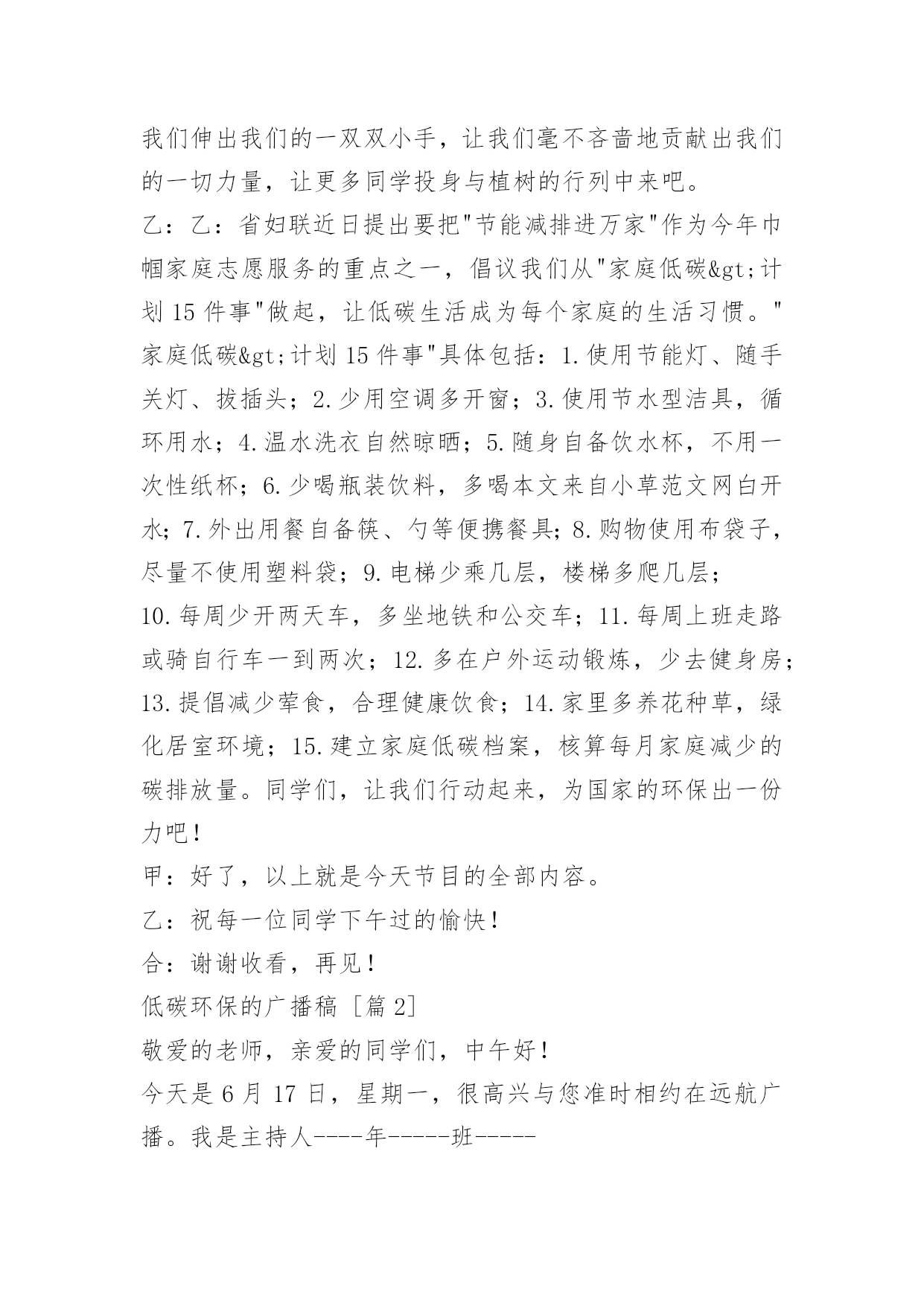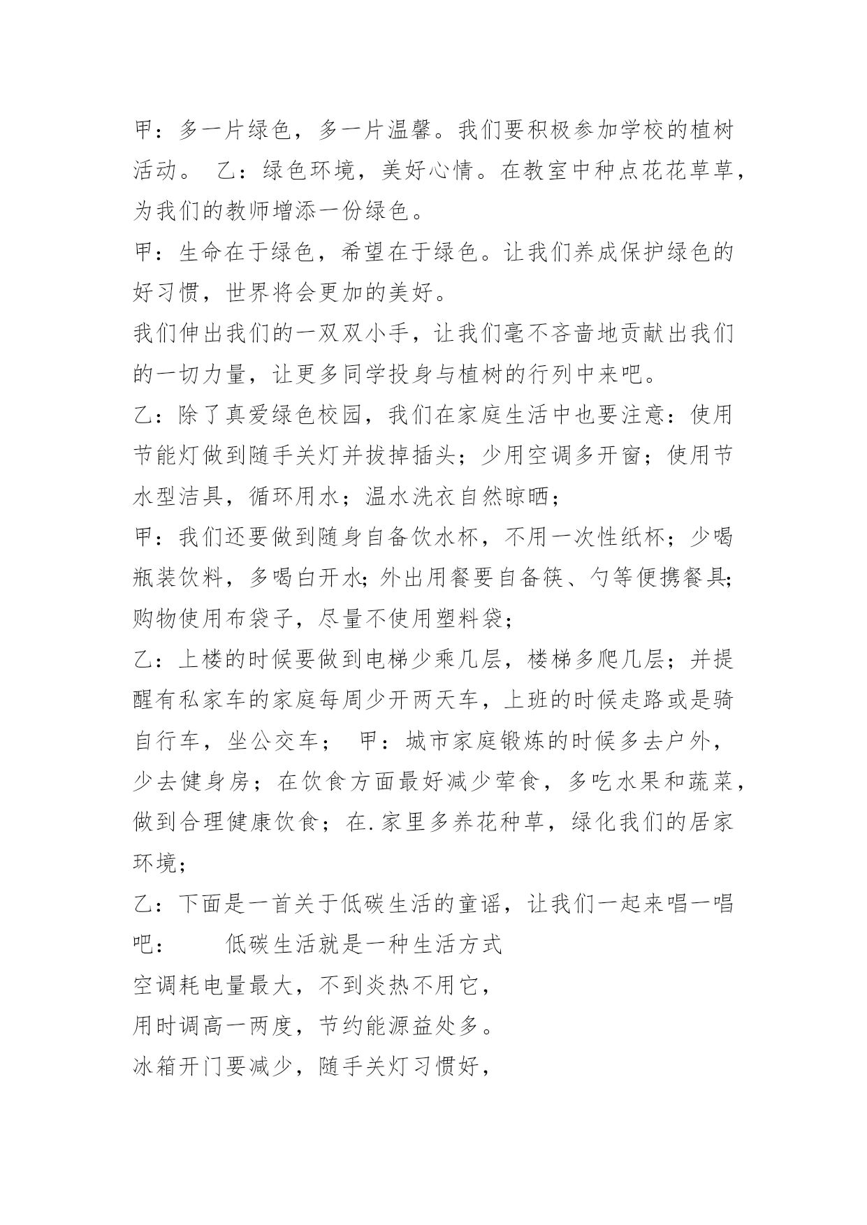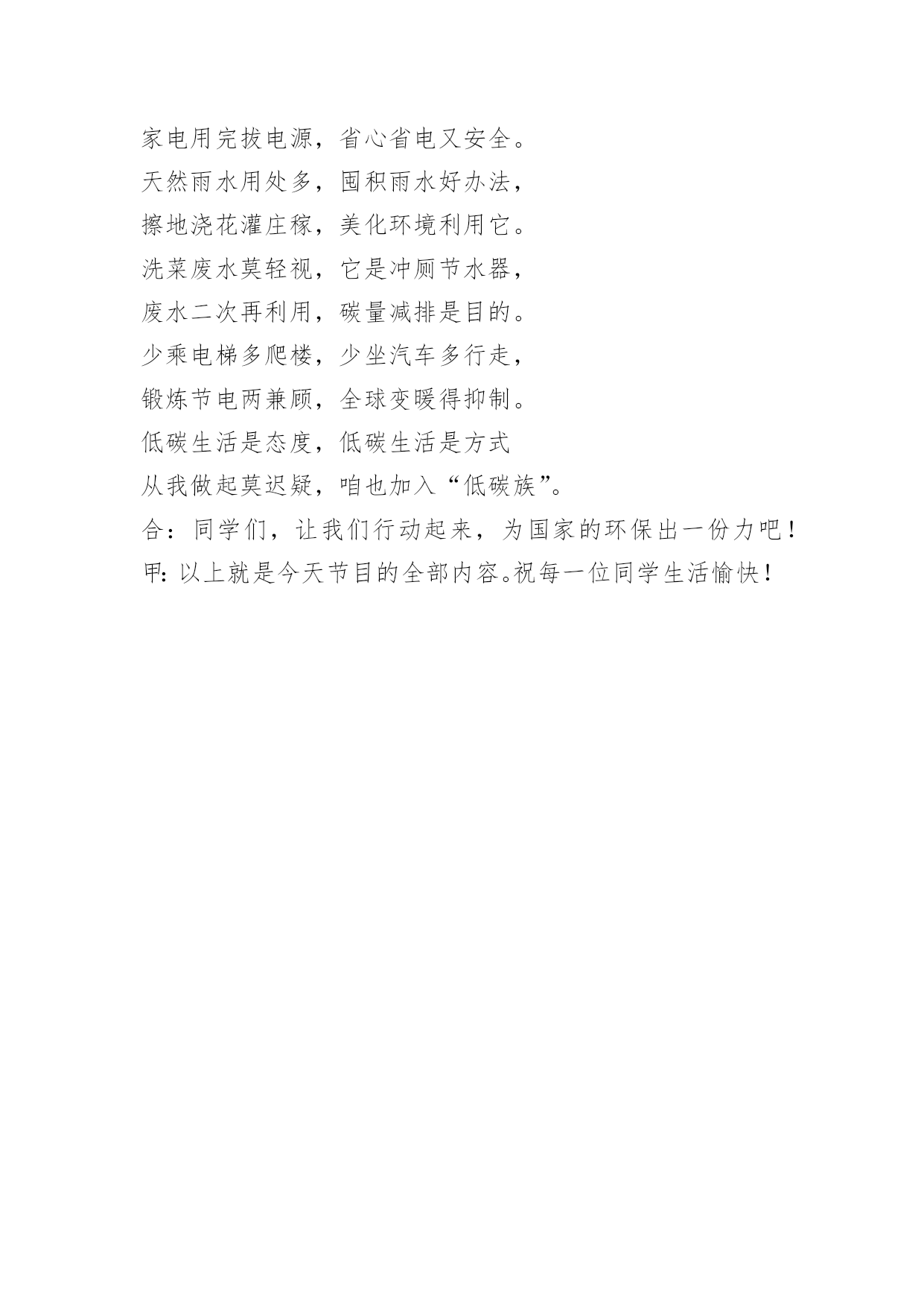 低碳环保的广播稿合:敬爱的老师,亲爱的同学们,下午好!甲:今天是11日,星期四,很高兴与您准时相约在校园电视台。我是主持人XX。乙:我是主持人XX。甲:绚烂色彩,缤纷校园,了解最新校园动态、聚焦点滴新闻,尽在新闻袋袋库。乙:低碳,是一种时尚的生活新方式,更是每个公民的责任。9日上午,"2015低碳环保植树公益行"在公园拉开帷幕。截至9日上午十一时,2015低碳环本文来自小草范文网保公益活动共辐射88万用户,种子短信转发30970条,种子彩信共转发22765条,环保彩拍参与客户共347户,订购植树节主题曲彩铃的客户共1098户,有千名社会各界人士参与了活动,种植了200棵树。甲:明天我们又将迎来一年一度的植树节,在此我们呼吁亲爱的同学们做到以下几点:1、珍爱绿色,珍爱我们绿色的校园。不踩踏草坪,不攀折鲜花。2、多一片绿色,多一片温馨。积极参加学校的植树活动。3、绿色环境,美好心情。在教室中种点花花草草,增添一份绿色。4、生命在于绿色,希望在于绿色。让我们养成保护绿色的好习惯,世界将会更加的美好。我们伸出我们的一双双小手,让我们毫不吝啬地贡献出我们的一切力量,让更多同学投身与植树的行列中来吧。乙:乙:省妇联近日提出要把"节能减排进万家"作为今年巾帼家庭志愿服务的重点之一,倡议我们从"家庭低碳>计划15件事"做起,让低碳生活成为每个家庭的生活习惯。"家庭低碳>计划15件事"具体包括:1.使用节能灯、随手关灯、拔插头;2.少用空调多开窗;3.使用节水型洁具,循环用水;4.温水洗衣自然晾晒;5.随身自备饮水杯,不用一次性纸杯;6.少喝瓶装饮料,多喝本文来自小草范文网白开水;7.外出用餐自备筷、勺等便携餐具;8.购物使用布袋子,尽量不使用塑料袋;9.电梯少乘几层,楼梯多爬几层;10.每周少开两天车,多坐地铁和公交车;11.每周上班走路或骑自行车一到两次;12.多在户外运动锻炼,少去健身房;13.提倡减少荤食,合理健康饮食;14.家里多养花种草,绿化居室环境;15.建立家庭低碳档案,核算每月家庭减少的碳排放量。同学们,让我们行动起来,为国家的环保出一份力吧!甲:好了,以上就是今天节目的全部内容。乙:祝每一位同学下午过的愉快!合:谢谢收看,再见!低碳环保的广播稿[篇2]敬爱的老师,亲爱的同学们,中午好!今天是6月17日,星期一,很高兴与您准时相约在远航广播。我是主持人----年-----班-----绚烂色彩,缤纷校园。低碳生活,大家一起来:节约是一种美好的生活态度,也是一种良好的工作态度,更是一份社会责任。低碳生活是一种低能量、低消耗、低开支的生活方式。在学习和生活中,每次的.举手之劳,都可以显露出低碳生活。低碳,是一种时尚的生活新方式,更是每个公民的责任。让我们毫不吝啬地贡献出我们的一切力量,让更多同学投身低碳生活的行列中来吧。倡议我们从“家庭低碳计划15件事”做起,让低碳生活成为每个家庭的生活习惯。“家庭低碳计划15件事”具体包括:1.使用节能灯、随手关灯、拔插头;2.少用风扇空调多开窗;3.使用节水型洁具,循环用水;4.温水洗衣自然晾晒;5.随身自备饮水杯,不用一次性纸杯;6.少喝瓶装饮料,多喝白开水;7.外出用餐自备筷、勺等便携餐具;8.购物使用布袋子,尽量不使用塑料袋;9.电梯少乘几层,楼梯多爬几层;10.多骑自行车,多坐公交车;11家里多养花种草,绿化居室环境;12.多在户外运动锻炼,少去健身房;13.提倡减少荤食,合理健康饮食;14.家用电器及时关15.建立家庭低碳档案,核算每月家庭减少的碳排放量。同学们,让我们行动起来,为国家的环保出一份力吧!低碳生活要从现在做起,从自己做起,从节约每一度电、每一滴水、每一张纸、每一粒米的点滴小事做起,“不积跬步,无以至千里;不积小流,无以成江海。”希望通过我们的努力,把“低碳生活”的理念传递给每一个家庭。低碳生活人人有份,让我们立即行动起来,从我做起,从日常生活做起,以新的生活理念和生活方式,积极投入到全民低碳生活行动中去,为建设绿色文明国家贡献自己的一份力量!节约是一种美好的生活态度,也是一种良好的工作态度,更是一份社会责任。低碳生活是一种低能量、低消耗、低开支的生活方式。在工作和生活中,每次的举手之劳,都可以显露出健康、自然、安全、返璞归真的生活态度,为建设资源节约型社会贡献自己力所能及的力量。所谓低碳生活就是一种绿色、健康、环保的生活方式。它呼唤人们,从生活的各个细节出发,节约地球上的有限资源,保护地球环境,关心地球健康。当全球变暖威胁人类生存环境,当狂风、暴雨、地震、高温、严寒等各种极端气候事件在全球频繁出现,人们开始意识到人类活动对地球生态环境的巨大影响。自工业革命以来,人类不断消耗石油资源,产生大量二氧化碳,造成了全球变暖。而对森林的破坏,更加剧了全球变暖的速度。