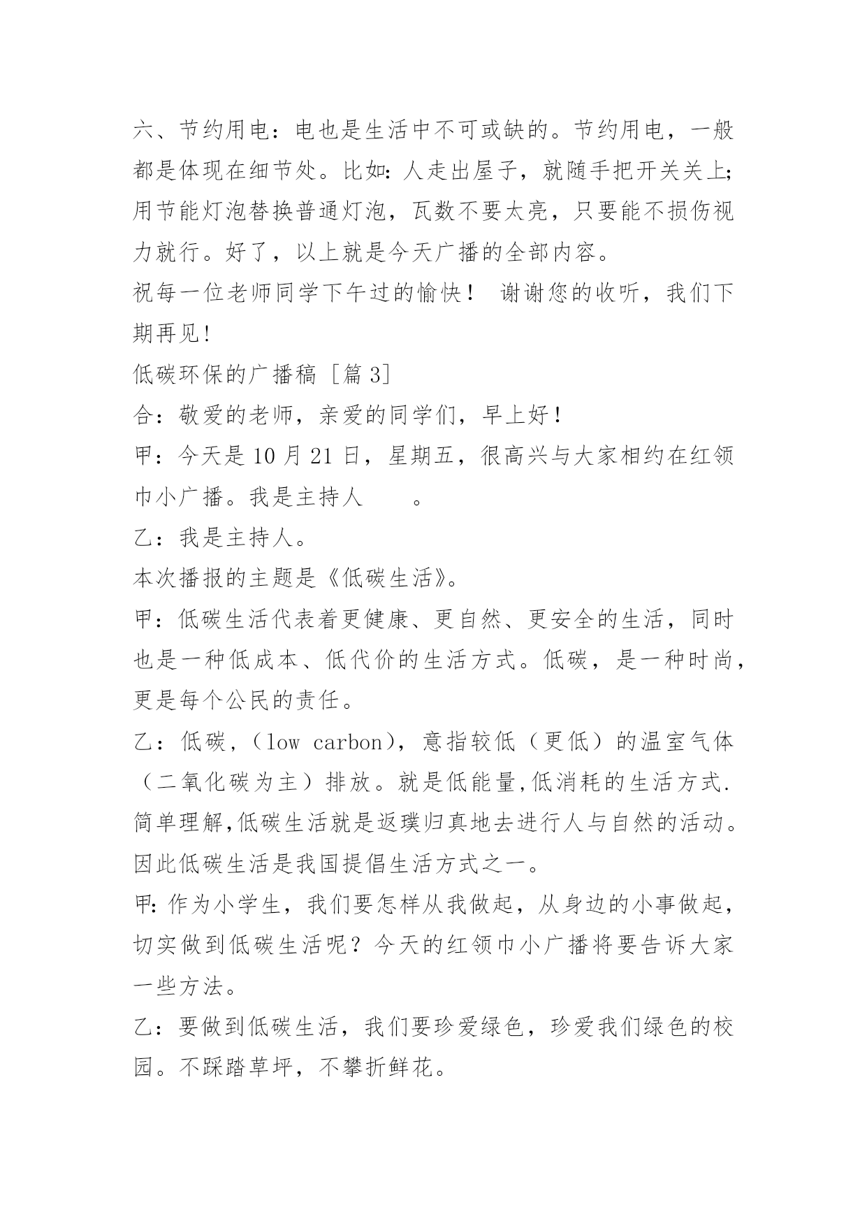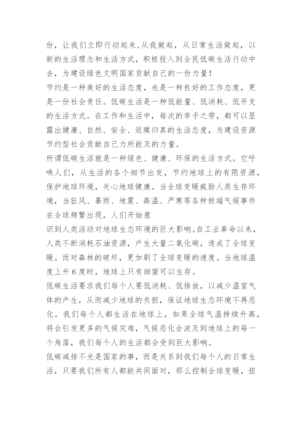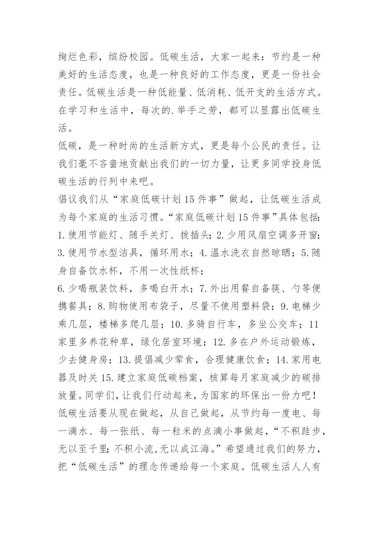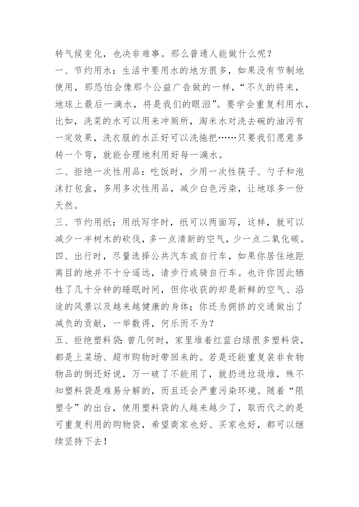 低碳环保的广播稿合:敬爱的老师,亲爱的同学们,下午好!甲:今天是11日,星期四,很高兴与您准时相约在校园电视台。我是主持人XX。乙:我是主持人XX。甲:绚烂色彩,缤纷校园,了解最新校园动态、聚焦点滴新闻,尽在新闻袋袋库。乙:低碳,是一种时尚的生活新方式,更是每个公民的责任。9日上午,"2015低碳环保植树公益行"在公园拉开帷幕。截至9日上午十一时,2015低碳环本文来自小草范文网保公益活动共辐射88万用户,种子短信转发30970条,种子彩信共转发22765条,环保彩拍参与客户共347户,订购植树节主题曲彩铃的客户共1098户,有千名社会各界人士参与了活动,种植了200棵树。甲:明天我们又将迎来一年一度的植树节,在此我们呼吁亲爱的同学们做到以下几点:1、珍爱绿色,珍爱我们绿色的校园。不踩踏草坪,不攀折鲜花。2、多一片绿色,多一片温馨。积极参加学校的植树活动。3、绿色环境,美好心情。在教室中种点花花草草,增添一份绿色。4、生命在于绿色,希望在于绿色。让我们养成保护绿色的好习惯,世界将会更加的美好。我们伸出我们的一双双小手,让我们毫不吝啬地贡献出我们的一切力量,让更多同学投身与植树的行列中来吧。乙:乙:省妇联近日提出要把"节能减排进万家"作为今年巾帼家庭志愿服务的重点之一,倡议我们从"家庭低碳>计划15件事"做起,让低碳生活成为每个家庭的生活习惯。"家庭低碳>计划15件事"具体包括:1.使用节能灯、随手关灯、拔插头;2.少用空调多开窗;3.使用节水型洁具,循环用水;4.温水洗衣自然晾晒;5.随身自备饮水杯,不用一次性纸杯;6.少喝瓶装饮料,多喝本文来自小草范文网白开水;7.外出用餐自备筷、勺等便携餐具;8.购物使用布袋子,尽量不使用塑料袋;9.电梯少乘几层,楼梯多爬几层;10.每周少开两天车,多坐地铁和公交车;11.每周上班走路或骑自行车一到两次;12.多在户外运动锻炼,少去健身房;13.提倡减少荤食,合理健康饮食;14.家里多养花种草,绿化居室环境;15.建立家庭低碳档案,核算每月家庭减少的碳排放量。同学们,让我们行动起来,为国家的环保出一份力吧!甲:好了,以上就是今天节目的全部内容。乙:祝每一位同学下午过的愉快!合:谢谢收看,再见!低碳环保的广播稿[篇2]敬爱的老师,亲爱的同学们,中午好!今天是6月17日,星期一,很高兴与您准时相约在远航广播。我是主持人----年-----班-----绚烂色彩,缤纷校园。低碳生活,大家一起来:节约是一种美好的生活态度,也是一种良好的工作态度,更是一份社会责任。低碳生活是一种低能量、低消耗、低开支的生活方式。在学习和生活中,每次的.举手之劳,都可以显露出低碳生活。低碳,是一种时尚的生活新方式,更是每个公民的责任。让我们毫不吝啬地贡献出我们的一切力量,让更多同学投身低碳生活的行列中来吧。倡议我们从“家庭低碳计划15件事”做起,让低碳生活成为每个家庭的生活习惯。“家庭低碳计划15件事”具体包括:1.使用节能灯、随手关灯、拔插头;2.少用风扇空调多开窗;3.使用节水型洁具,循环用水;4.温水洗衣自然晾晒;5.随身自备饮水杯,不用一次性纸杯;6.少喝瓶装饮料,多喝白开水;7.外出用餐自备筷、勺等便携餐具;8.购物使用布袋子,尽量不使用塑料袋;9.电梯少乘几层,楼梯多爬几层;10.多骑自行车,多坐公交车;11家里多养花种草,绿化居室环境;12.多在户外运动锻炼,少去健身房;13.提倡减少荤食,合理健康饮食;14.家用电器及时关15.建立家庭低碳档案,核算每月家庭减少的碳排放量。同学们,让我们行动起来,为国家的环保出一份力吧!低碳生活要从现在做起,从自己做起,从节约每一度电、每一滴水、每一张纸、每一粒米的点滴小事做起,“不积跬步,无以至千里;不积小流,无以成江海。”希望通过我们的努力,把“低碳生活”的理念传递给每一个家庭。低碳生活人人有份,让我们立即行动起来,从我做起,从日常生活做起,以新的生活理念和生活方式,积极投入到全民低碳生活行动中去,为建设绿色文明国家贡献自己的一份力量!节约是一种美好的生活态度,也是一种良好的工作态度,更是一份社会责任。低碳生活是一种低能量、低消耗、低开支的生活方式。在工作和生活中,每次的举手之劳,都可以显露出健康、自然、安全、返璞归真的生活态度,为建设资源节约型社会贡献自己力所能及的力量。所谓低碳生活就是一种绿色、健康、环保的生活方式。它呼唤人们,从生活的各个细节出发,节约地球上的有限资源,保护地球环境,关心地球健康。当全球变暖威胁人类生存环境,当狂风、暴雨、地震、高温、严寒等各种极端气候事件在全球频繁出现,人们开始意识到人类活动对地球生态环境的巨大影响。自工业革命以来,人类不断消耗石油资源,产生大量二氧化碳,造成了全球变暖。而对森林的破坏,更加剧了全球变暖的速度。