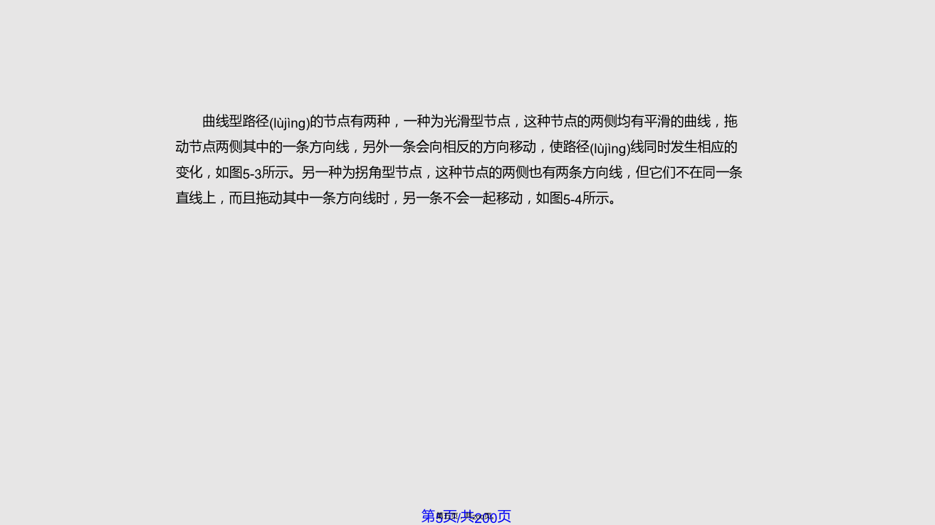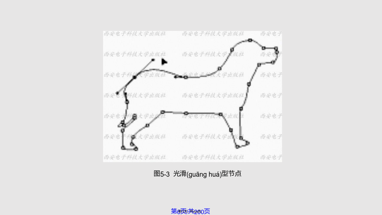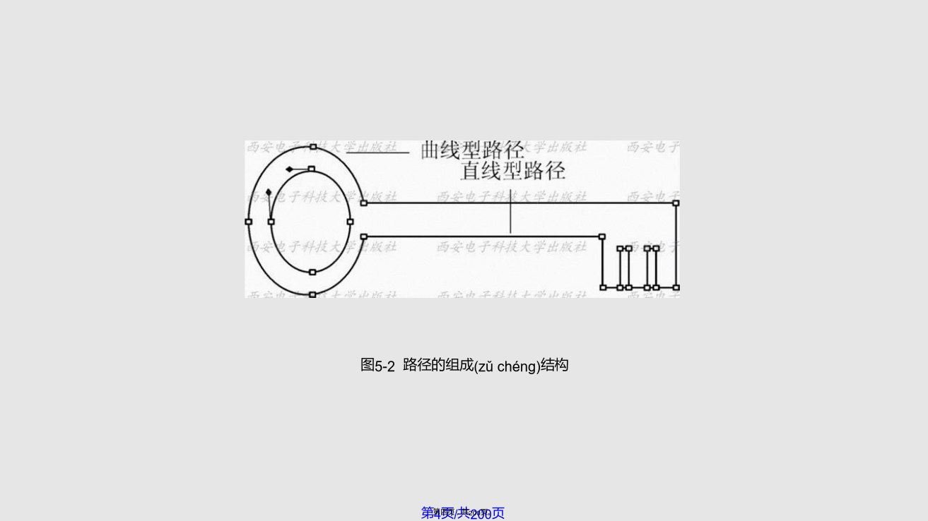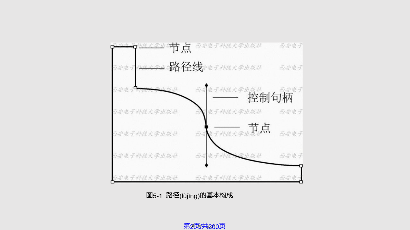 5.1路 径 的 创 建虽然Photoshop是一个标准的位图软件,但仍然具有较强的矢量线条描绘功能,即运用路径和形状(xíngzhuàn)的绘制与编辑功能。利用“路径”可以绘制出线条化的图像,还可以制作出精确的选择区域。大部分路径是由钢笔工具或形状(xíngzhuàn)工具绘制得到的,路径的基本构成包括路径线、节点和控制句柄,如图5-1所示。图5-1路径(lùjìng)的基本构成路径包括直线型路径、曲线型路径和混合型路径三种类型,图5-2所示的“钥匙”路径就是一个包括直线和曲线型路径的混合型路径。路径的类型由其所具有的节点所决定(juédìng),直线型路径的节点没有方向线,因此其两侧的线段为直线。图5-2路径的组成(zǔchénɡ)结构曲线型路径(lùjìng)的节点有两种,一种为光滑型节点,这种节点的两侧均有平滑的曲线,拖动节点两侧其中的一条方向线,另外一条会向相反的方向移动,使路径(lùjìng)线同时发生相应的变化,如图5-3所示。另一种为拐角型节点,这种节点的两侧也有两条方向线,但它们不在同一条直线上,而且拖动其中一条方向线时,另一条不会一起移动,如图5-4所示。图5-3光滑(guānghuá)型节点图5-4拐角(guǎijiǎo)型节点5.1.1使用钢笔工具创建路径钢笔工具是绘制路径的最基本工具。它既可用来绘制形状图层,又可用来绘制工作路径,习惯上人们都使用它建立工作路径。1.钢笔工具选项栏设置“钢笔”工具选项栏如图5-5所示,其参数设置如下:(1)点击“形状图层”按钮,可在绘制路径的同时,建立一个(yīɡè)形状图层,创建的路径内区域将被填入前景色。(2)点击“路径”按钮,只绘出“工作(gōngzuò)路径”,而不会同时创建一个“形状图层”。(3)点击“填充像素”按钮,将直接在路径内的区域填入前景色。(4)“工具类型”这6个按钮的作用与工具箱里“形状工具组”中的各按钮功能相同,在这6个按钮上单击,即可切换选择不同的创建路径和矢量图像的工具。在选择钢笔工具状态下,单击6个按钮后的三角形,会弹出一个选项面板,如图5-6所示,当选择“橡皮带”时,在图像上单击后移动光标,将在单击出与移动的光标之间出现一条虚拟的线,再次单击鼠标后,这条线才会被确定下来。图5-5钢笔(gāngbǐ)工具选项栏(5)选中“自动添加/删除”复选框,在已有的路径上单击鼠标,可在路径上的单击处增加一个锚点,而在已有的锚点上单击,可以将此锚点删除。如果没有选中此复选框,在路径上单击鼠标不能实现增加或删除锚点的功能。(6)“创建(chuàngjiàn)方式”按钮的功能与选框工具中的4种选取方式相同,从左到右各个按钮的含义如下:①选择“创建(chuàngjiàn)新形状”图层按钮时,每次操作都将创建(chuàngjiàn)一个新的形状图层。②选择“添加到形状区域”按钮时,可将新建的路径或图形添加到当前的路径或图形中去。③选择(xuǎnzé)“从形状区域中减去”按钮时,将从新建的路径或图形中去除与原有的路径或图形交替的区域。④选择(xuǎnzé)“交叉形状区域”按钮时,将保留新建路径或图形与原有路径或图形的交叠区域。⑤选择(xuǎnzé)“重叠区域除外”按钮时,将去除新建路径或图形与原有路径或图形的交叠区域。2.使用钢笔具绘制(huìzhì)路径的工作步骤(1)新建图像文件,单击工具箱中的钢笔工具,将光标移到图像中的一个位置上单击并拖动,在两点之间连接出一条曲线,如图5-7所示。(2)将光标移动到图像中的另一个位置并拖动,再画出一条曲线,如图5-8所示。(3)重复前两个步骤,完成其它线段的绘制(huìzhì)。(4)绘制(huìzhì)结束时,如果要创建闭合路径,只要将光标放在起点上,当钢笔光标下面显示一个小圆点时单击,即可闭合路径,如图5-9所示。图5-7两点间的曲线(qūxiàn)路径图5-9闭合(bìhé)路径5.1.2使用自由钢笔工具创建路径点击钢笔工具,会弹出如图5-10所示的菜单,选中“自由钢笔工具”选项,即可绘制任意路径。自由钢笔工具的使用方法类似于铅笔工具,与铅笔工具不同的是,使用自由钢笔工具绘制图形时,得到的是路径。利用自由钢笔工具,可直接在图像中拖动创建所需要的路径形状(xíngzhuàn)。若要得到闭合路径,可将光标最后回放至起点上,当光标下面显示为时单击即可,或者可以通过双击鼠标闭合路径。图5-10钢笔(gāngbǐ)工具组单击工具选项栏上的几何选项下拉列表,弹出如图5-11示的自由钢笔(gāngbǐ)几何选项面板,在此可以设置自由钢笔(gāngbǐ)工具的各种参数:(1)“曲线拟合”参数控制绘制路径时对鼠标移动的敏感性。输入的数值越高,所创建的路径节点越少,路径也越光滑。(2)选中“