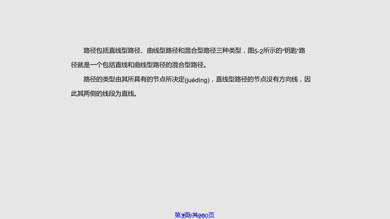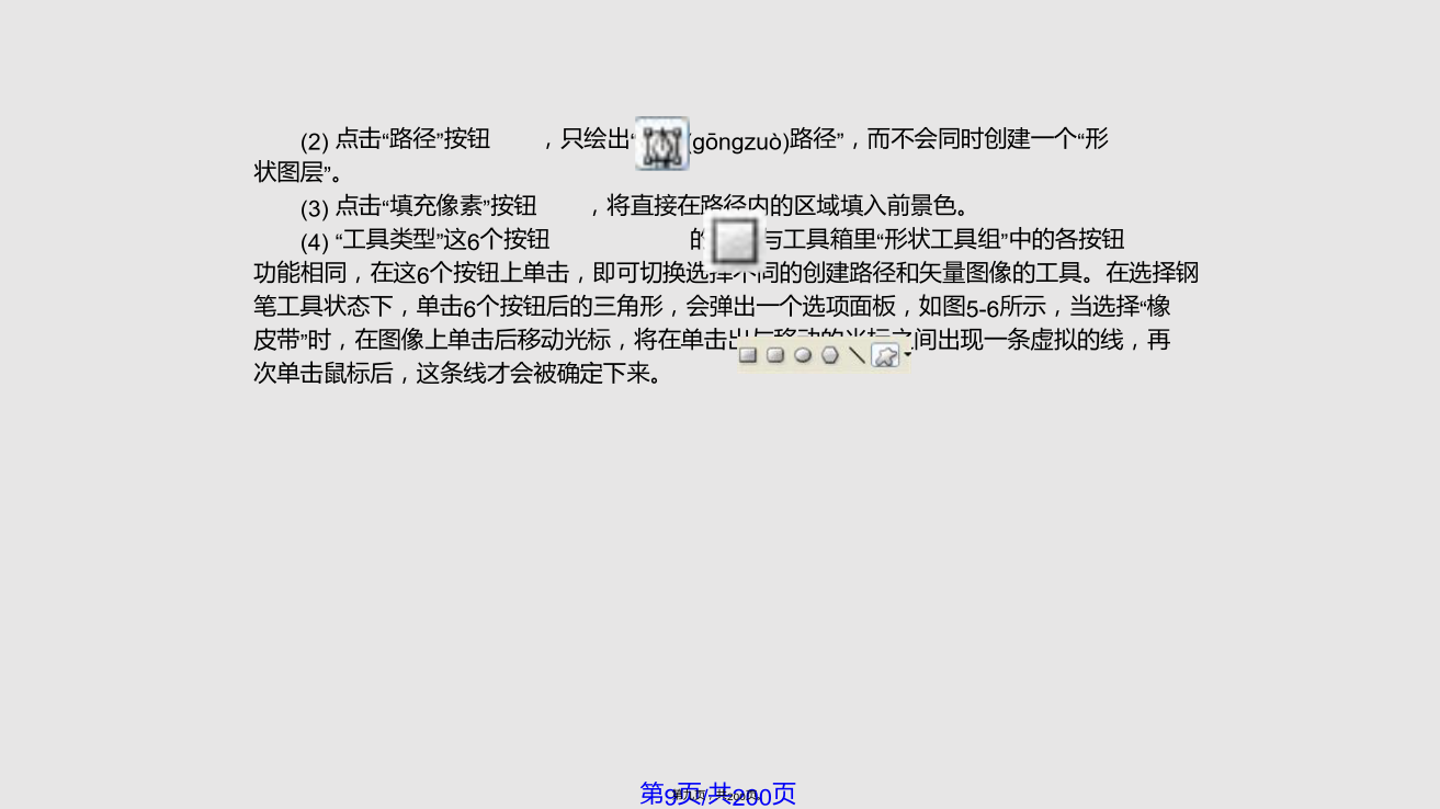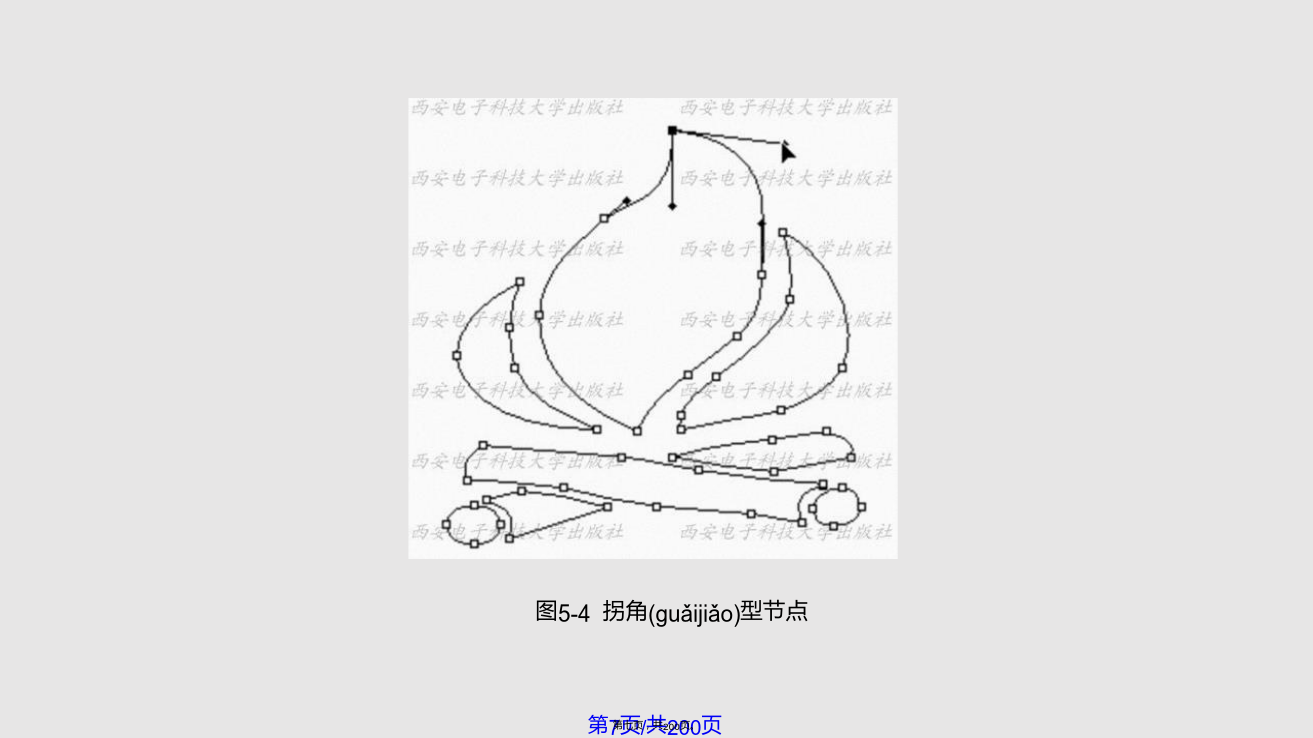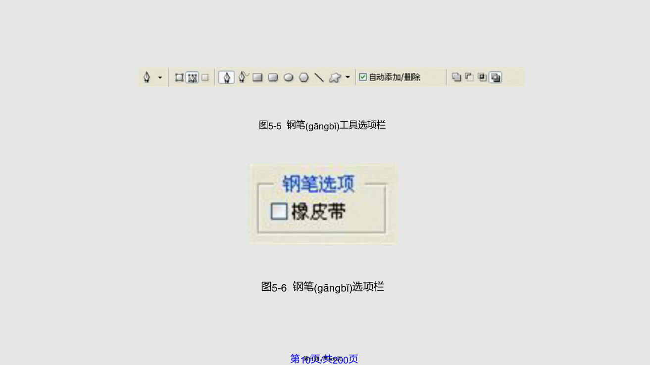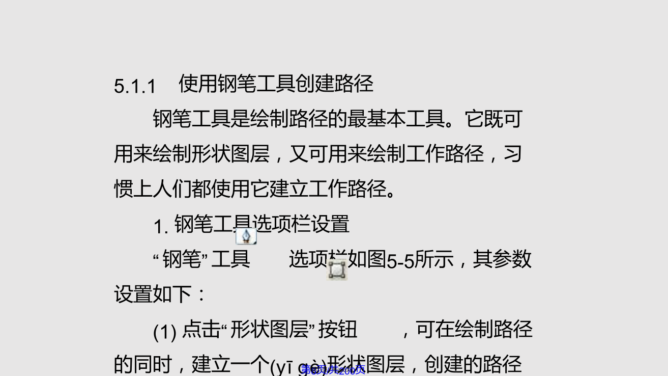 5.1路 径 的 创 建虽然Photoshop是一个标准的位图软件,但仍然具有较强的矢量线条描绘功能,即运用路径和形状(xíngzhuàn)的绘制与编辑功能。利用“路径”可以绘制出线条化的图像,还可以制作出精确的选择区域。大部分路径是由钢笔工具或形状(xíngzhuàn)工具绘制得到的,路径的基本构成包括路径线、节点和控制句柄,如图5-1所示。图5-1路径(lùjìng)的基本构成路径包括直线型路径、曲线型路径和混合型路径三种类型,图5-2所示的“钥匙”路径就是一个包括直线和曲线型路径的混合型路径。路径的类型由其所具有的节点所决定(juédìng),直线型路径的节点没有方向线,因此其两侧的线段为直线。图5-2路径的组成(zǔchénɡ)结构曲线型路径(lùjìng)的节点有两种,一种为光滑型节点,这种节点的两侧均有平滑的曲线,拖动节点两侧其中的一条方向线,另外一条会向相反的方向移动,使路径(lùjìng)线同时发生相应的变化,如图5-3所示。另一种为拐角型节点,这种节点的两侧也有两条方向线,但它们不在同一条直线上,而且拖动其中一条方向线时,另一条不会一起移动,如图5-4所示。图5-3光滑(guānghuá)型节点图5-4拐角(guǎijiǎo)型节点5.1.1使用钢笔工具创建路径钢笔工具是绘制路径的最基本工具。它既可用来绘制形状图层,又可用来绘制工作路径,习惯上人们都使用它建立工作路径。1.钢笔工具选项栏设置“钢笔”工具选项栏如图5-5所示,其参数设置如下:(1)点击“形状图层”按钮,可在绘制路径的同时,建立一个(yīɡè)形状图层,创建的路径内区域将被填入前景色。(2)点击“路径”按钮,只绘出“工作(gōngzuò)路径”,而不会同时创建一个“形状图层”。(3)点击“填充像素”按钮,将直接在路径内的区域填入前景色。(4)“工具类型”这6个按钮的作用与工具箱里“形状工具组”中的各按钮功能相同,在这6个按钮上单击,即可切换选择不同的创建路径和矢量图像的工具。在选择钢笔工具状态下,单击6个按钮后的三角形,会弹出一个选项面板,如图5-6所示,当选择“橡皮带”时,在图像上单击后移动光标,将在单击出与移动的光标之间出现一条虚拟的线,再次单击鼠标后,这条线才会被确定下来。图5-5钢笔(gāngbǐ)工具选项栏(5)选中“自动添加/删除”复选框,在已有的路径上单击鼠标,可在路径上的单击处增加一个锚点,而在已有的锚点上单击,可以将此锚点删除。如果没有选中此复选框,在路径上单击鼠标不能实现增加或删除锚点的功能。(6)“创建(chuàngjiàn)方式”按钮的功能与选框工具中的4种选取方式相同,从左到右各个按钮的含义如下:①选择“创建(chuàngjiàn)新形状”图层按钮时,每次操作都将创建(chuàngjiàn)一个新的形状图层。②选择“添加到形状区域”按钮时,可将新建的路径或图形添加到当前的路径或图形中去。③选择(xuǎnzé)“从形状区域中减去”按钮时,将从新建的路径或图形中去除与原有的路径或图形交替的区域。④选择(xuǎnzé)“交叉形状区域”按钮时,将保留新建路径或图形与原有路径或图形的交叠区域。⑤选择(xuǎnzé)“重叠区域除外”按钮时,将去除新建路径或图形与原有路径或图形的交叠区域。2.使用钢笔具绘制(huìzhì)路径的工作步骤(1)新建图像文件,单击工具箱中的钢笔工具,将光标移到图像中的一个位置上单击并拖动,在两点之间连接出一条曲线,如图5-7所示。(2)将光标移动到图像中的另一个位置并拖动,再画出一条曲线,如图5-8所示。(3)重复前两个步骤,完成其它线段的绘制(huìzhì)。(4)绘制(huìzhì)结束时,如果要创建闭合路径,只要将光标放在起点上,当钢笔光标下面显示一个小圆点时单击,即可闭合路径,如图5-9所示。图5-7两点间的曲线(qūxiàn)路径图5-9闭合(bìhé)路径5.1.2使用自由钢笔工具创建路径点击钢笔工具,会弹出如图5-10所示的菜单,选中“自由钢笔工具”选项,即可绘制任意路径。自由钢笔工具的使用方法类似于铅笔工具,与铅笔工具不同的是,使用自由钢笔工具绘制图形时,得到的是路径。利用自由钢笔工具,可直接在图像中拖动创建所需要的路径形状(xíngzhuàn)。若要得到闭合路径,可将光标最后回放至起点上,当光标下面显示为时单击即可,或者可以通过双击鼠标闭合路径。图5-10钢笔(gāngbǐ)工具组单击工具选项栏上的几何选项下拉列表,弹出如图5-11示的自由钢笔(gāngbǐ)几何选项面板,在此可以设置自由钢笔(gāngbǐ)工具的各种参数:(1)“曲线拟合”参数控制绘制路径时对鼠标移动的敏感性。输入的数值越高,所创建的路径节点越少,路径也越光滑。(2)选中“