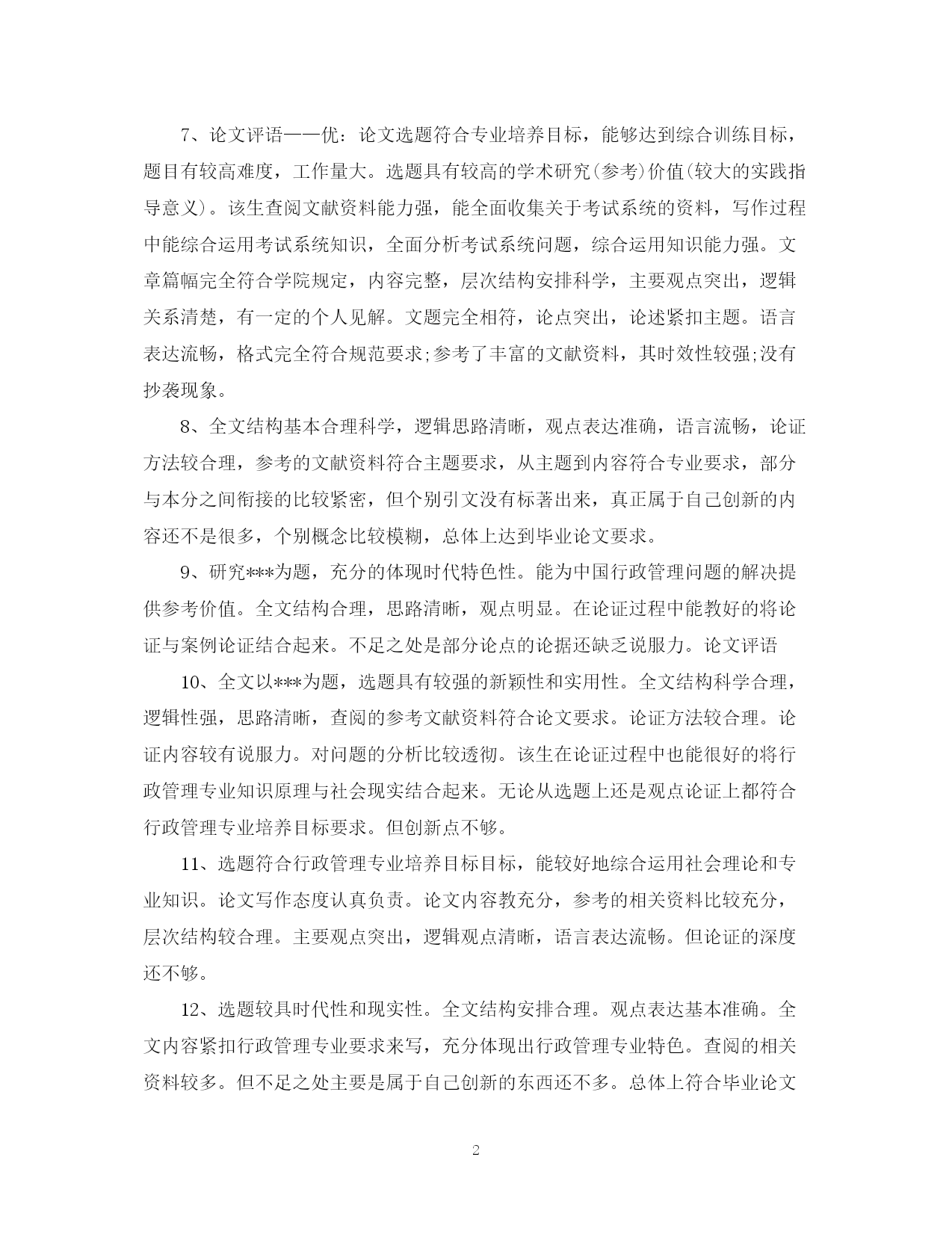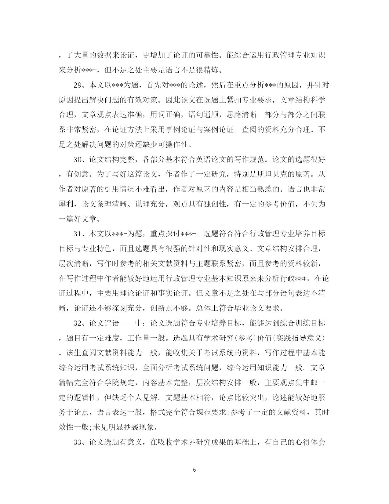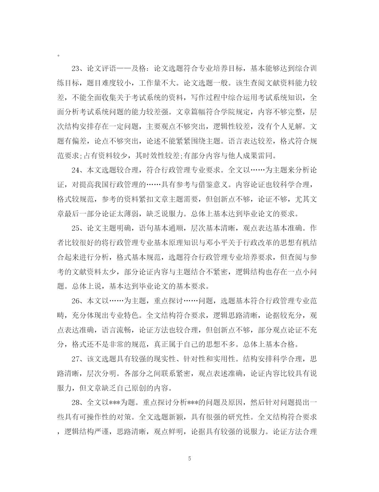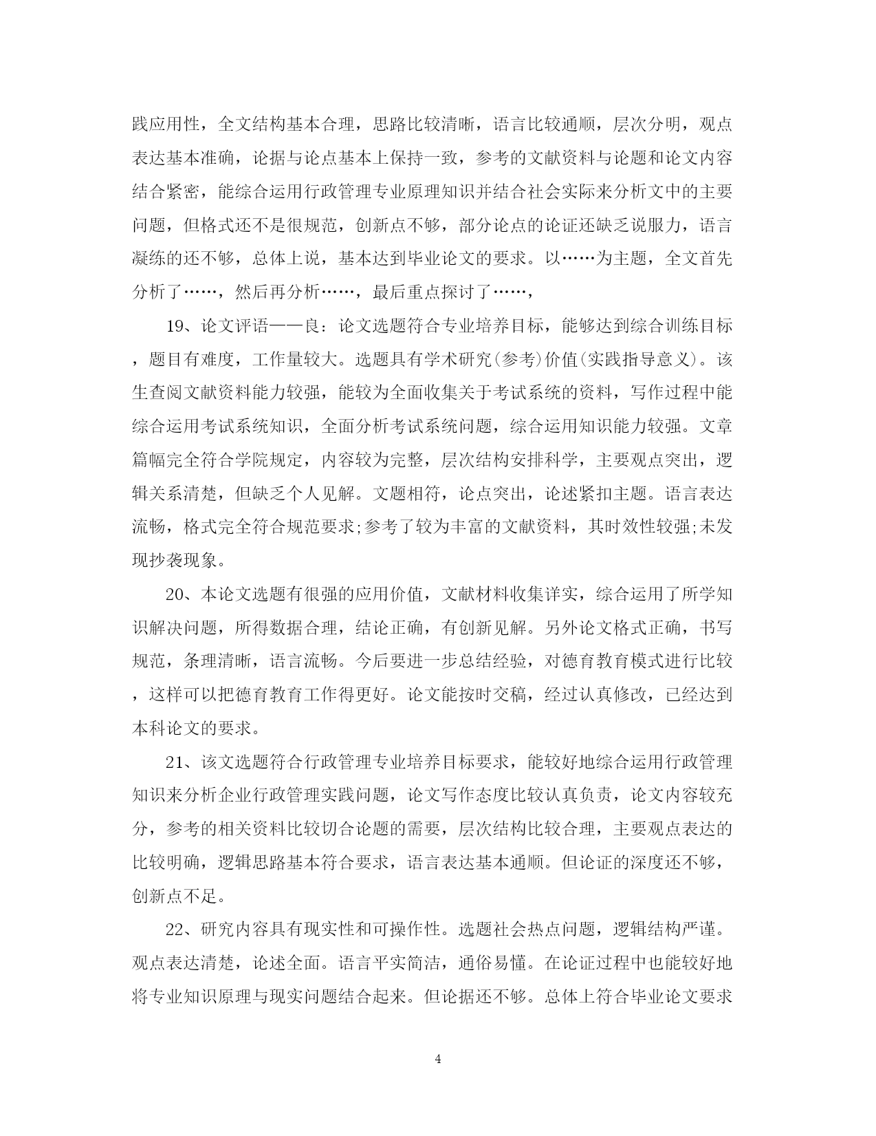 此资料由网络收集而来,如有侵权请告知上传者立即删除。资料共分享,我们负责传递知识。PAGEPAGE13导师对研究生论文评语学位论文答辩是评价研究生学位论文质量的方法之一,那么对论文答辩的评语怎么写呢?下面是有导师对研究生论文评语,欢迎参阅。导师对研究生论文评语1、本文以官员问责制为题进行研究,能为解决我国官员问责制存在的问题提供参考和借鉴作用。在全文结构中,首先对官员问责制的现实意义进行了分析,然后再对我国官员问责制2、以***为题进行研究。能为解决***-的问题提供参考和借鉴作用。在全文结构中,首先要调整基本概念提出问题,然后在对问题进行深入的分析,最后为**提出有效的建议。全文体现专业特色要求,部分与本分之间衔接的比较紧密,真正属于自己创新的内容还不是很多。总体上达到毕业论文要求。3、全文以***为题。重点探讨出***的问题,然后针对问题提出有效的建议。全文结构符合要求,逻辑思路清晰,论据较充分,观点表达准确,语言流畅,论证方法教合理。参考的资料与主题结合紧密。4、的困境进行深入的分析,最后提出化解困境的有效建议。全文体现专业特色要求,符合行政管理专业培养要求,参考的文献资料符合论文观点与主题的需要,实践论证还不够,但,真正属于自己创新的内容还不是很多。总体上达到毕业论文要求。5、论文思路清晰,语句通顺。能很好的调查***-存在的问题。作者对于论文内容有一定的了解和熟悉。思路清晰,层次清晰,逻辑结构合理。观点表达准确。研究原理采用恰当。在论证过程中能有效的将专业原理与要研究的主题结合起来。个别地方论证的观点不是很明确,总体上达到毕业论文要求。6、本文以官员问责制为题进行研究,能为解决我国官员问责制存在的问题提供参考和借鉴作用。在全文结构中,首先对官员问责制的基本原理问题进行了分析,然后再对我国官员问责制存在的问题进行深入的分析,最后为解决前面的问题提出有效的建议。全文体现专业特色要求,部分与本分之间衔接的比较紧密,真正属于自己创新的内容还不是很多。总体上达到毕业论文要求。7、论文评语——优:论文选题符合专业培养目标,能够达到综合训练目标,题目有较高难度,工作量大。选题具有较高的学术研究(参考)价值(较大的实践指导意义)。该生查阅文献资料能力强,能全面收集关于考试系统的资料,写作过程中能综合运用考试系统知识,全面分析考试系统问题,综合运用知识能力强。文章篇幅完全符合学院规定,内容完整,层次结构安排科学,主要观点突出,逻辑关系清楚,有一定的个人见解。文题完全相符,论点突出,论述紧扣主题。语言表达流畅,格式完全符合规范要求;参考了丰富的文献资料,其时效性较强;没有抄袭现象。8、全文结构基本合理科学,逻辑思路清晰,观点表达准确,语言流畅,论证方法较合理,参考的文献资料符合主题要求,从主题到内容符合专业要求,部分与本分之间衔接的比较紧密,但个别引文没有标著出来,真正属于自己创新的内容还不是很多,个别概念比较模糊,总体上达到毕业论文要求。9、研究***为题,充分的体现时代特色性。能为中国行政管理问题的解决提供参考价值。全文结构合理,思路清晰,观点明显。在论证过程中能教好的将论证与案例论证结合起来。不足之处是部分论点的论据还缺乏说服力。论文评语10、全文以***为题,选题具有较强的新颖性和实用性。全文结构科学合理,逻辑性强,思路清晰,查阅的参考文献资料符合论文要求。论证方法较合理。论证内容较有说服力。对问题的分析比较透彻。该生在论证过程中也能很好的将行政管理专业知识原理与社会现实结合起来。无论从选题上还是观点论证上都符合行政管理专业培养目标要求。但创新点不够。11、选题符合行政管理专业培养目标目标,能较好地综合运用社会理论和专业知识。论文写作态度认真负责。论文内容教充分,参考的相关资料比较充分,层次结构较合理。主要观点突出,逻辑观点清晰,语言表达流畅。但论证的深度还不够。12、选题较具时代性和现实性。全文结构安排合理。观点表达基本准确。全文内容紧扣行政管理专业要求来写,充分体现出行政管理专业特色。查阅的相关资料较多。但不足之处主要是属于自己创新的东西还不多。总体上符合毕业论文要求。13、选题较具时代性和现实性,全文结构安排合理,观点表达基本准确,思路基本清晰,全文内容基本上按照行政管理专业培养要求来写,查阅的相关资料也较多,但行政管理专业特色体现的还不够充分,属于自己创新的东西也还不多。总体上符合毕业论文要求。14、本文以***为主题,选题具有很强的现实性和应用性且符合行政管理专业培养目标要求。该论文结构基本合理,全文共分***大部分。其中第一部分***,在此基础上重点探讨***-。在论证过程中,该生的参考文献资料与所要论证的观点及内容结合紧密,运用的研究方法主要是理论研究与事例研究法