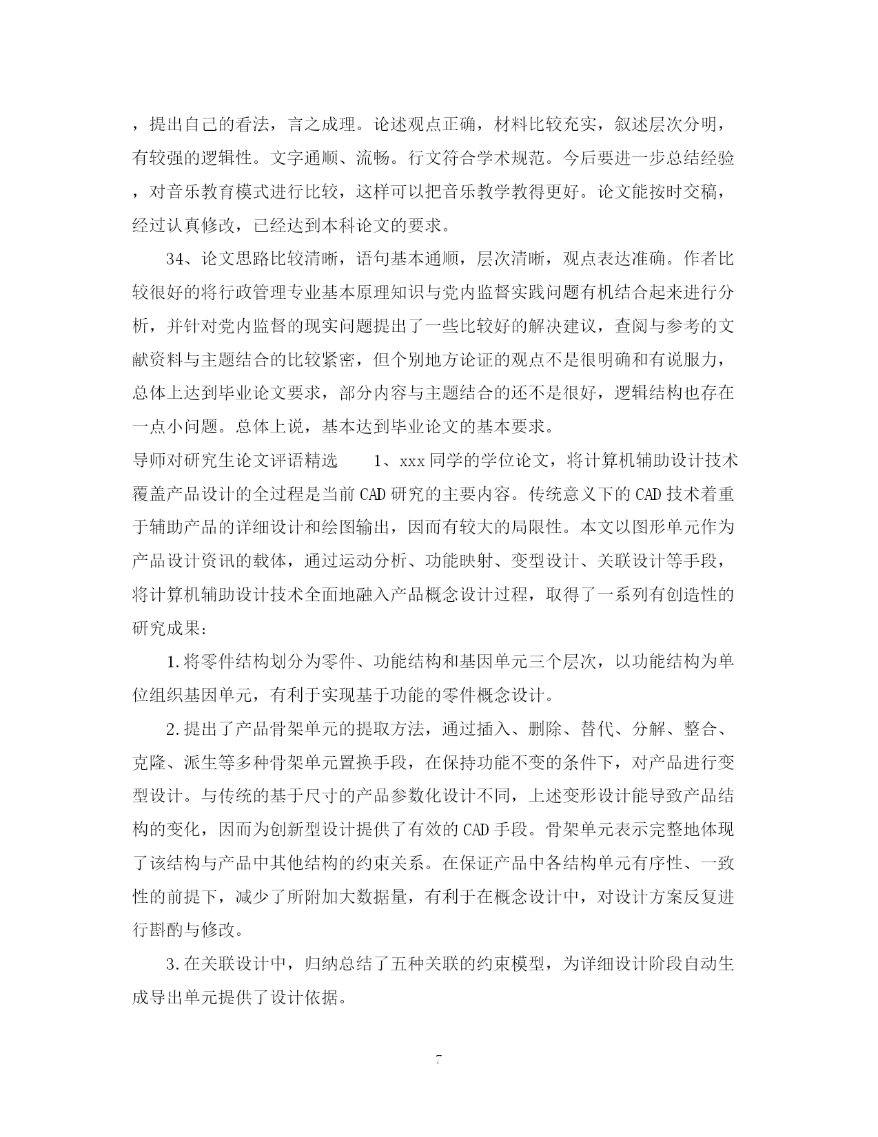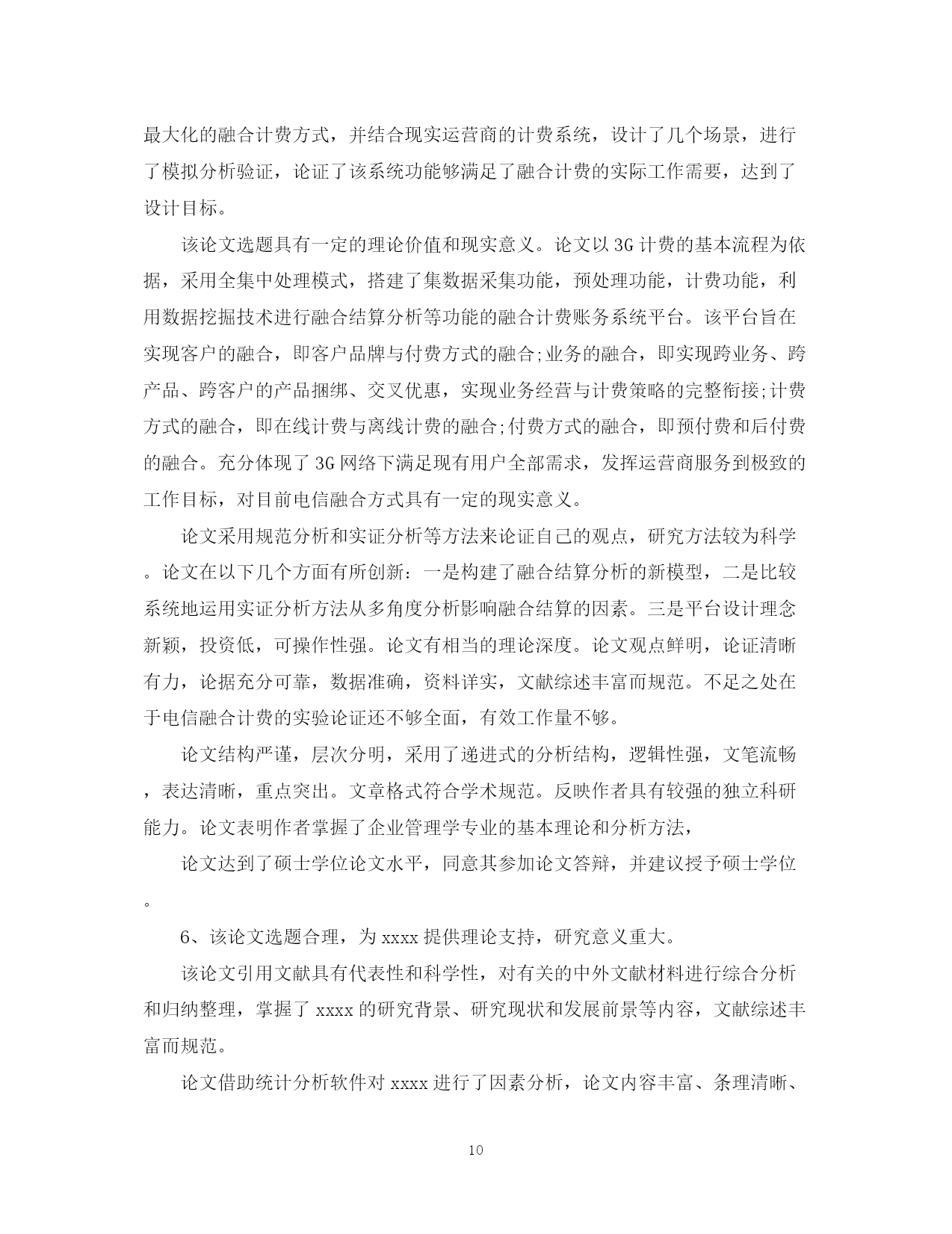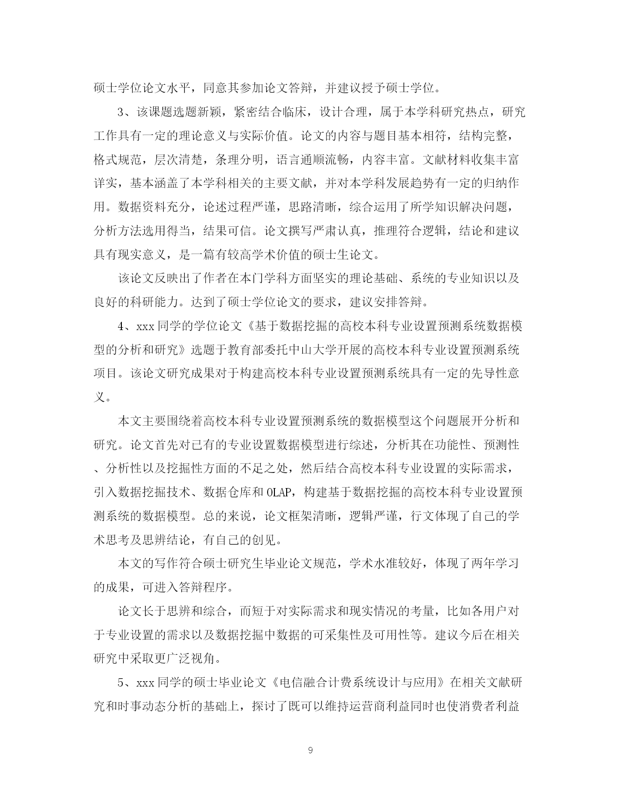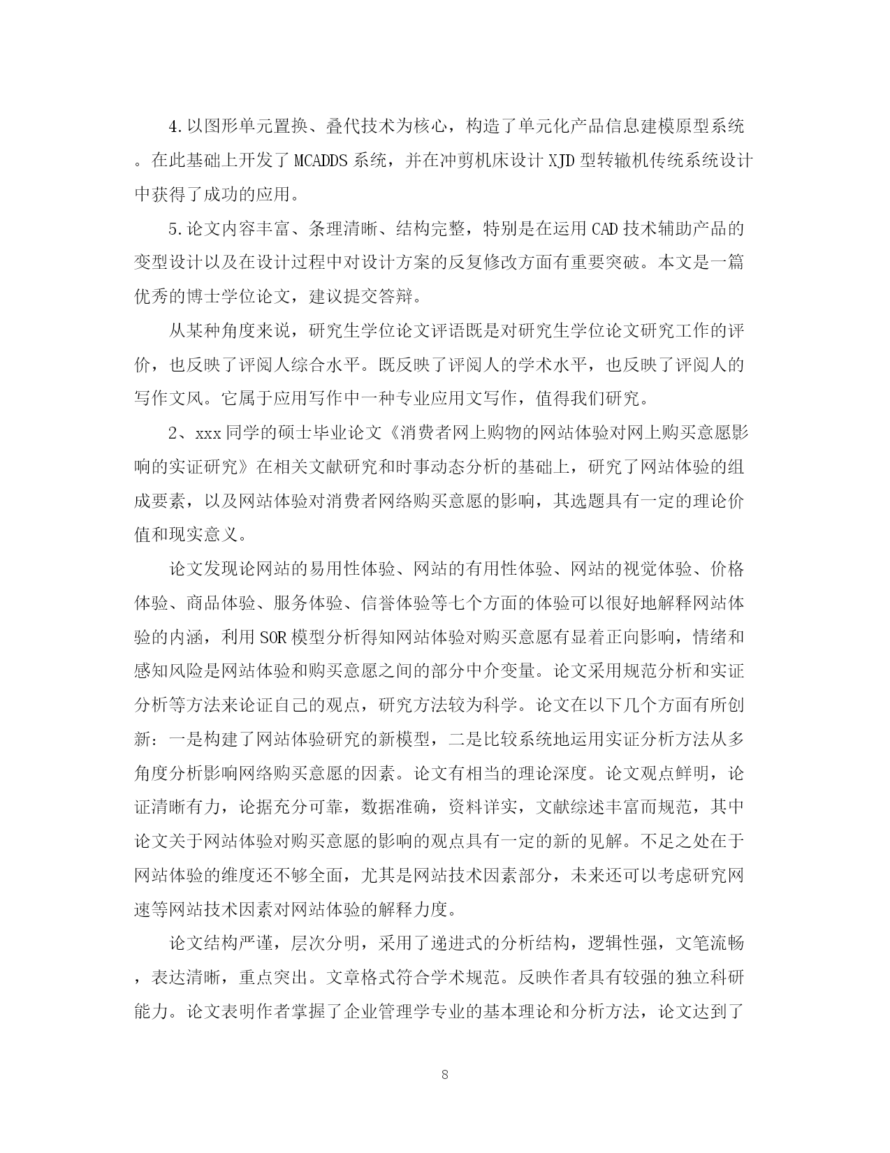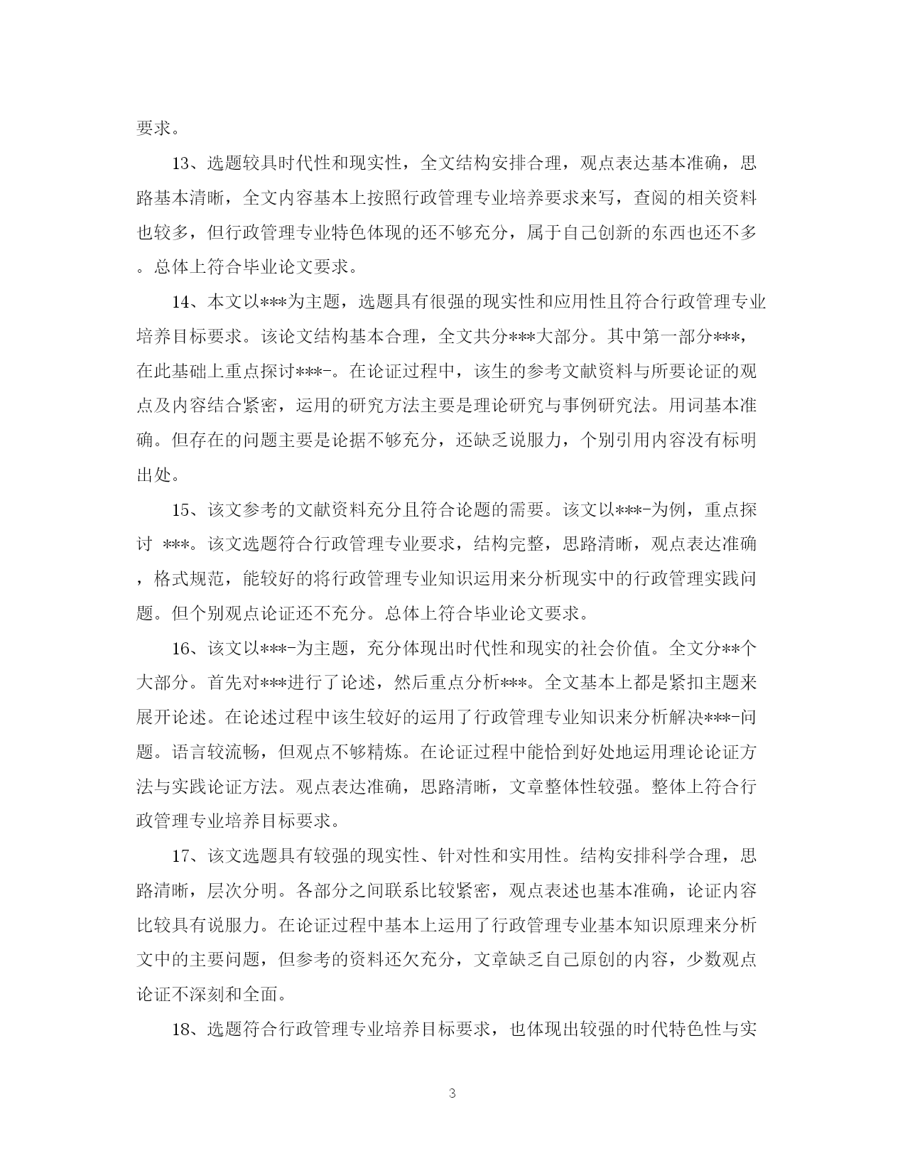此资料由网络收集而来,如有侵权请告知上传者立即删除。资料共分享,我们负责传递知识。PAGEPAGE13导师对研究生论文评语学位论文答辩是评价研究生学位论文质量的方法之一,那么对论文答辩的评语怎么写呢?下面是有导师对研究生论文评语,欢迎参阅。导师对研究生论文评语1、本文以官员问责制为题进行研究,能为解决我国官员问责制存在的问题提供参考和借鉴作用。在全文结构中,首先对官员问责制的现实意义进行了分析,然后再对我国官员问责制2、以***为题进行研究。能为解决***-的问题提供参考和借鉴作用。在全文结构中,首先要调整基本概念提出问题,然后在对问题进行深入的分析,最后为**提出有效的建议。全文体现专业特色要求,部分与本分之间衔接的比较紧密,真正属于自己创新的内容还不是很多。总体上达到毕业论文要求。3、全文以***为题。重点探讨出***的问题,然后针对问题提出有效的建议。全文结构符合要求,逻辑思路清晰,论据较充分,观点表达准确,语言流畅,论证方法教合理。参考的资料与主题结合紧密。4、的困境进行深入的分析,最后提出化解困境的有效建议。全文体现专业特色要求,符合行政管理专业培养要求,参考的文献资料符合论文观点与主题的需要,实践论证还不够,但,真正属于自己创新的内容还不是很多。总体上达到毕业论文要求。5、论文思路清晰,语句通顺。能很好的调查***-存在的问题。作者对于论文内容有一定的了解和熟悉。思路清晰,层次清晰,逻辑结构合理。观点表达准确。研究原理采用恰当。在论证过程中能有效的将专业原理与要研究的主题结合起来。个别地方论证的观点不是很明确,总体上达到毕业论文要求。6、本文以官员问责制为题进行研究,能为解决我国官员问责制存在的问题提供参考和借鉴作用。在全文结构中,首先对官员问责制的基本原理问题进行了分析,然后再对我国官员问责制存在的问题进行深入的分析,最后为解决前面的问题提出有效的建议。全文体现专业特色要求,部分与本分之间衔接的比较紧密,真正属于自己创新的内容还不是很多。总体上达到毕业论文要求。7、论文评语——优:论文选题符合专业培养目标,能够达到综合训练目标,题目有较高难度,工作量大。选题具有较高的学术研究(参考)价值(较大的实践指导意义)。该生查阅文献资料能力强,能全面收集关于考试系统的资料,写作过程中能综合运用考试系统知识,全面分析考试系统问题,综合运用知识能力强。文章篇幅完全符合学院规定,内容完整,层次结构安排科学,主要观点突出,逻辑关系清楚,有一定的个人见解。文题完全相符,论点突出,论述紧扣主题。语言表达流畅,格式完全符合规范要求;参考了丰富的文献资料,其时效性较强;没有抄袭现象。8、全文结构基本合理科学,逻辑思路清晰,观点表达准确,语言流畅,论证方法较合理,参考的文献资料符合主题要求,从主题到内容符合专业要求,部分与本分之间衔接的比较紧密,但个别引文没有标著出来,真正属于自己创新的内容还不是很多,个别概念比较模糊,总体上达到毕业论文要求。9、研究***为题,充分的体现时代特色性。能为中国行政管理问题的解决提供参考价值。全文结构合理,思路清晰,观点明显。在论证过程中能教好的将论证与案例论证结合起来。不足之处是部分论点的论据还缺乏说服力。论文评语10、全文以***为题,选题具有较强的新颖性和实用性。全文结构科学合理,逻辑性强,思路清晰,查阅的参考文献资料符合论文要求。论证方法较合理。论证内容较有说服力。对问题的分析比较透彻。该生在论证过程中也能很好的将行政管理专业知识原理与社会现实结合起来。无论从选题上还是观点论证上都符合行政管理专业培养目标要求。但创新点不够。11、选题符合行政管理专业培养目标目标,能较好地综合运用社会理论和专业知识。论文写作态度认真负责。论文内容教充分,参考的相关资料比较充分,层次结构较合理。主要观点突出,逻辑观点清晰,语言表达流畅。但论证的深度还不够。12、选题较具时代性和现实性。全文结构安排合理。观点表达基本准确。全文内容紧扣行政管理专业要求来写,充分体现出行政管理专业特色。查阅的相关资料较多。但不足之处主要是属于自己创新的东西还不多。总体上符合毕业论文要求。13、选题较具时代性和现实性,全文结构安排合理,观点表达基本准确,思路基本清晰,全文内容基本上按照行政管理专业培养要求来写,查阅的相关资料也较多,但行政管理专业特色体现的还不够充分,属于自己创新的东西也还不多。总体上符合毕业论文要求。14、本文以***为主题,选题具有很强的现实性和应用性且符合行政管理专业培养目标要求。该论文结构基本合理,全文共分***大部分。其中第一部分***,在此基础上重点探讨***-。在论证过程中,该生的参考文献资料与所要论证的观点及内容结合紧密,运用的研究方法主要是理论研究与事例研究法