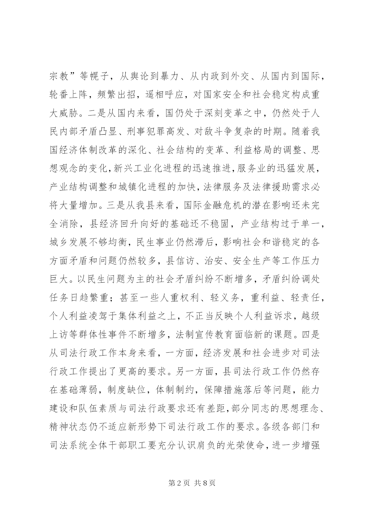 第PAGE\*Arabic\*MERGEFORMAT8页共NUMPAGES\*MERGEFORMAT8页副县长在司法表彰会发言同志们一、充分肯定成绩。进一步增强做好司法行政工作的紧迫感和责任感县委、县政府的正确领导下,过去的一年。各乡镇各部门积极做好人民调解工作,推进依法治县进程,着力化解社会矛盾、维护社会稳定,为全县经济社会突破发展营造了良好环境,五五”普法工作受到市委、市政府表彰。全县司法行政系统积极履行职能职责,全面加强人民调解、法制宣传、法律援助、刑释解教人员安置帮教工作,基层基础建设各项工作快速推进,公正廉洁执法执业能力显著提升,社会不安定因素明显减少,预防化解社会矛盾的作用进一步彰显,省级示范司法所建设等多项工作走在全市前列。县总的形势是好的经济发展,当前。政治稳定,社会进步,各项事业兴旺发达,改革开放力度持续加大,城市综合功能日臻完善,人民生活水平大幅提升,和谐建设成效显著,为依法治县和司法行政工作提供了宽松的外部环境,奠定了良好的工作基础。但从国际国内形势看,司法行政工作仍面临很多挑战和压力:一是从国际来看,西方敌对势力对我国实施“西化”分化”战略企图没有变,支持“东突”台独”藏独”法轮功”等分裂势力的反华破坏活动从未减弱,各种敌对势力打着“人权”民主”民族”宗教”等幌子,从舆论到暴力、从内政到外交、从国内到国际,轮番上阵,频繁出招,遥相呼应,对国家安全和社会稳定构成重大威胁。二是从国内来看,国仍处于深刻变革之中,仍然处于人民内部矛盾凸显、刑事犯罪高发、对敌斗争复杂的时期。随着我国经济体制改革的深化、社会结构的变革、利益格局的调整、思想观念的变化,新兴工业化进程的迅速推进,服务业的迅猛发展,产业结构调整和城镇化进程的加快,法律服务及法律援助需求必将大量增加。三是从我县来看,国际金融危机的潜在影响还未完全消除,县经济回升向好的基础还不稳固,产业结构过于单一,城乡发展不够均衡,民生事业仍然滞后,影响社会和谐稳定的各方面矛盾和问题仍然较多,县信访、治安、安全生产等工作压力巨大。以民生问题为主的社会矛盾纠纷不断增多,矛盾纠纷调处任务日趋繁重;甚至一些人重权利、轻义务,重利益、轻责任,个人利益凌驾于集体利益之上,不正当反映个人利益诉求,越级上访等群体性事件不断增多,法制宣传教育面临新的课题。四是从司法行政工作本身来看,一方面,经济发展和社会进步对司法行政工作提出了更高的要求。另一方面,县司法行政工作仍然存在基础薄弱,制度缺位,体制制约,保障措施落后等问题,能力建设和队伍素质与司法行政要求还有差距,部分同志的思想理念、精神状态仍不适应新形势下司法行政工作的要求。各级各部门和司法系统全体干部职工要充分认识肩负的光荣使命,进一步增强做好依法治县和司法行政工作的紧迫感和责任感,准确把握形势,积极探索进取,充分发挥人民调解和司法行政职能作用,努力为加快我县经济社会突破发展保驾护航。二、突出工作重点。努力开创司法行政工作新局面保护人民合法权益,司法行政工作的天职就是预防和消除矛盾纠纷。维护社会大局稳定。各乡镇各有关部门要切实明确职责,突出重点,强化措施,狠抓落实,努力抓好司法行政各项工作,为经济建设营造持续和谐稳定的社会环境。努力预防和化解社会矛盾。维护社会和谐稳定,一要坚持调解优先原则。司法行政机关的第一责任。坚持调解优先,预防和化解社会矛盾,构建和谐社会的基础性工作,也是维护社会稳定的第一道防线。要认真学习贯彻实施人民调解法,以人民调解法正式施行为契机,贯彻调解优先原则,进一步健全完善人民调解、行政调解、司法调解“三调联动”大调解工作格局,做到有效衔接、三调联动,提高人民调解工作水平,形成矛盾纠纷化解的合力,努力实现案结事了要坚持“抓早、抓小、抓苗头”工作原则,准确地掌握可能发生矛盾纠纷的倾向性问题,及时进行调解,把问题解决在基层,化解在萌芽状态。要拓宽人民调解领域,不仅要继续做好婚姻、家庭、邻里等传统矛盾纠纷的调解,而且要广泛参与劳动保障、土地、经济、医疗、食品安全、环境保护、安全事故以及各类矛盾纠纷的排查化解,有效防止和制止违法上访、越级上访、集体上访和群体性事件的发生,确保社会大局稳定。积极推进社会管理创新。安置帮教是司法行政工作的重要方面。刑释解教人员回归后,二要加强刑释解教人员管理。思想不稳定,经济比较困难,多数对象还要面对家人与社会的歧视,成为影响社会稳定的潜在隐患。各乡镇、相关部门要切实履行职责,动员社会力量,齐心协力,齐抓共管,共同做好安置帮教工作,着力构建“大帮教”工作格局。要切实抓好刑释解教人员安置帮教数据库管理与应用工作,指定专人负责,保证劳教人员从监所开始,刑释解教后的安置帮教工作全程网上动态管理,真正实现对刑释解教人员可查、可控、可帮,使之成为预防和减少重新违法犯罪的一项重要的