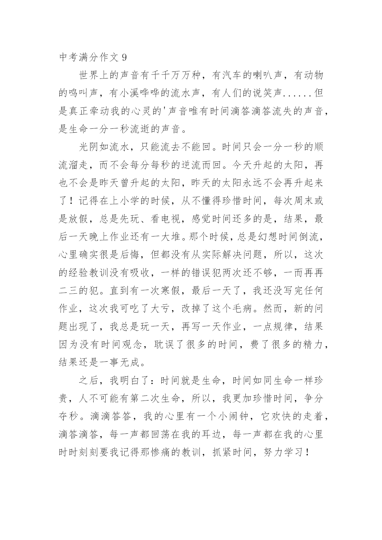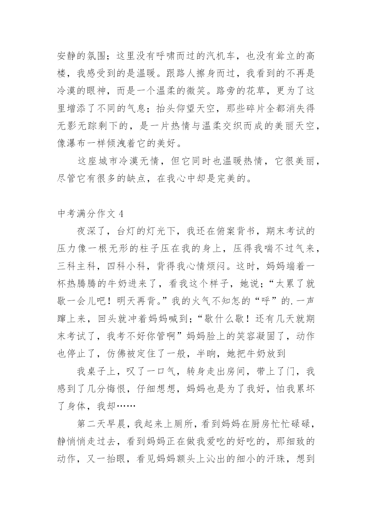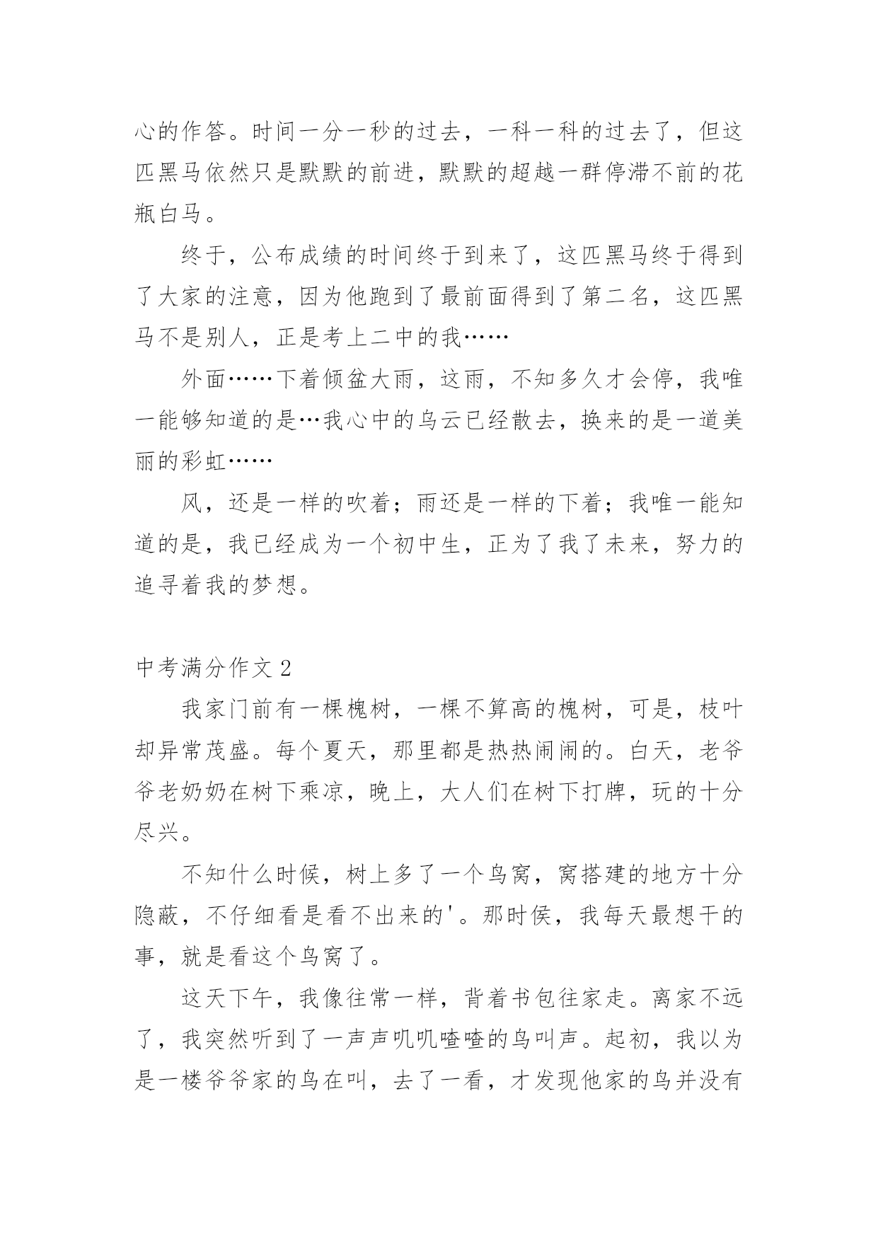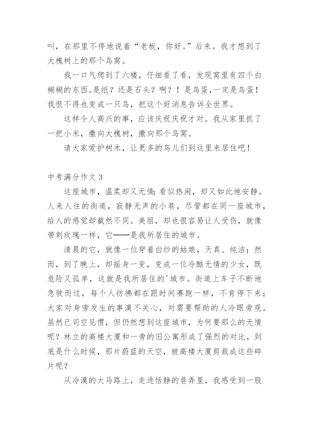 中考满分作文【经典】中考满分作文在日常学习、工作或生活中,说到作文,大家肯定都不陌生吧,作文可分为小学作文、中学作文、大学作文(论文)。那么一般作文是怎么写的呢?下面是小编帮大家整理的中考满分作文,仅供参考,欢迎大家阅读。中考满分作文1十八点的整点报时照常响起了,没了补习,也没了压力,更没有考试。但我并没有得到快乐,换来的是,另一个阶段的痛苦。突然,一阵风徐徐的吹来,“是啊!”我对着自己大叫,“这不是当初的梦想吗?”当初不就希望自己能考上法律系吗?想着想着,时光开始逆流,我回到了三个月前,一个为了考试而奋战的时期。自考试倒数进入100天后,学校老师们停止了复习课程,转而开始开放自习时间供同学提问和针对自己的弱点进行一次又一次的练习,没有人料的到,一匹大黑马正在后面虎视眈眈的`看着前面,等待时机来临之时。终于,考试到来了,老师也大致的预估了一下大家的成绩,这匹大黑马,依然不是大家视为的强将。但这匹黑马并没有想太多,把各式各样求来的物品摆在桌上后,便开始耐心的作答。时间一分一秒的过去,一科一科的过去了,但这匹黑马依然只是默默的前进,默默的超越一群停滞不前的花瓶白马。终于,公布成绩的时间终于到来了,这匹黑马终于得到了大家的注意,因为他跑到了最前面得到了第二名,这匹黑马不是别人,正是考上二中的我……外面……下着倾盆大雨,这雨,不知多久才会停,我唯一能够知道的是…我心中的乌云已经散去,换来的是一道美丽的彩虹……风,还是一样的吹着;雨还是一样的下着;我唯一能知道的是,我已经成为一个初中生,正为了我了未来,努力的追寻着我的梦想。中考满分作文2我家门前有一棵槐树,一棵不算高的槐树,可是,枝叶却异常茂盛。每个夏天,那里都是热热闹闹的。白天,老爷爷老奶奶在树下乘凉,晚上,大人们在树下打牌,玩的十分尽兴。不知什么时候,树上多了一个鸟窝,窝搭建的地方十分隐蔽,不仔细看是看不出来的'。那时侯,我每天最想干的事,就是看这个鸟窝了。这天下午,我像往常一样,背着书包往家走。离家不远了,我突然听到了一声声叽叽喳喳的鸟叫声。起初,我以为是一楼爷爷家的鸟在叫,去了一看,才发现他家的鸟并没有叫,在那里不停地说着“老板,你好。”后来。我才想到了大槐树上的那个鸟窝。我一口气爬到了六楼,仔细看了看,发现窝里有四个白糊糊的东西。是纸?还是石头?啊?!是鸟蛋,一定是鸟蛋!我恨不得也变成一只鸟,把这个好消息告诉全世界。这样令人高兴的事,应该庆祝庆祝才对。我从家里抓了一把小米,撒向大槐树,撒向那个鸟窝。请大家爱护树木,让更多的鸟儿们到这里来居住吧!中考满分作文3这座城市,温柔却又无情;看似热闹,却又如此地安静。人来人往的街道,寂静无声的小巷,尽管都在同一座城市,给人的感觉却截然不同。美丽,却也很容易让人受伤,就像带刺玫瑰一样,它──是我所居住的城市。清晨的它,就像一位穿着白纱的姑娘,天真、纯洁;然而,到了晚上,却摇身一变,变成一位冷酷无情的少女,既危险又孤单,这就是我所居住的'城市。街道上车子不断地急驶而过,每个人彷彿都在跟时间赛跑一样,不肯停下来;大家对身旁发生的事漠不关心,对需要帮助的人冷眼旁观。虽然已司空见惯,但仍然想到这座城市,为何要那么的无情呢?林立的高楼大厦和一旁的旧公寓形成了强烈的对比,到底是什么时候,那片蔚蓝的天空,被高楼大厦剪裁成这些碎片呢?从冷漠的大马路上,走进恬静的巷弄里,我感受到一股安静的氛围;这里没有呼啸而过的汽机车,也没有耸立的高楼,我感受到的是温暖。跟路人擦身而过,我看到的不再是冷漠的眼神,而是一个温柔的微笑。路旁的花草,更为了这里增添了不同的气息;抬头仰望天空,那些碎片全都消失得无影无踪剩下的,是一片热情与温柔交织而成的美丽天空,像瀑布一样倾洩着它的美好。这座城市冷漠无情,但它同时也温暖热情,它很美丽,尽管它有很多的缺点,在我心中却是完美的。中考满分作文4夜深了,台灯的灯光下,我还在俯案背书,期末考试的压力像一根无形的柱子压在我的身上,压得我喘不过气来,三科主科,四科小科,背得我心情烦闷。这时,妈妈端着一杯热腾腾的牛奶进来了,看我这个样子,她说;“太累了就歇一会儿吧!明天再背。”我的火气不知怎的“呼”的.一声蹿上来,回头就冲着妈妈喊到;“歇什么歇!还有几天就期末考试了,我考不好你管啊”妈妈脸上的笑容凝固了,动作也停止了,仿佛被定住了一般,半晌,她把牛奶放到我桌子上,叹了一口气,转身走出房间,带上了门,我感到了几分悔恨,仔细想想,妈妈也是为了我好,怕我累坏了身体,我却……第二天早晨,我起来上厕所,看到妈妈在厨房忙忙碌碌,静悄悄走过去,看到妈妈正在做我爱吃的好吃的,那细致的动作,又一抬眼,看见妈妈额头上沁出的细小的汗珠,想到昨晚我那样对妈妈,泪水不知不觉滑落下来,妈妈听到了动静,回头一看,连忙把我拉回床上,帮我盖好被子,告诉我;“不要着凉了,再睡会