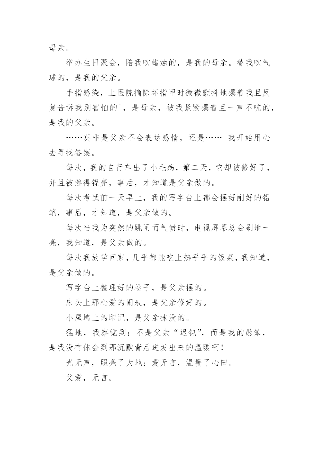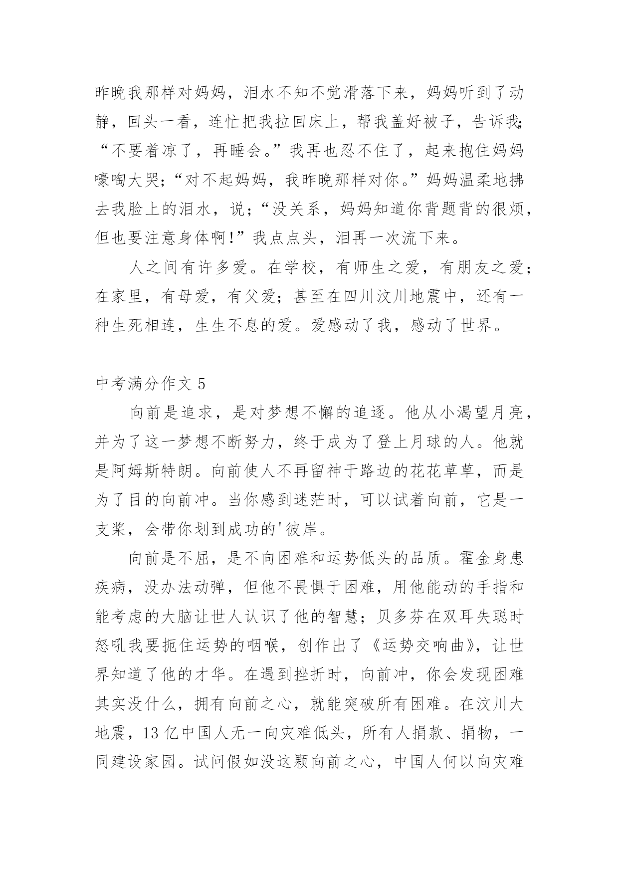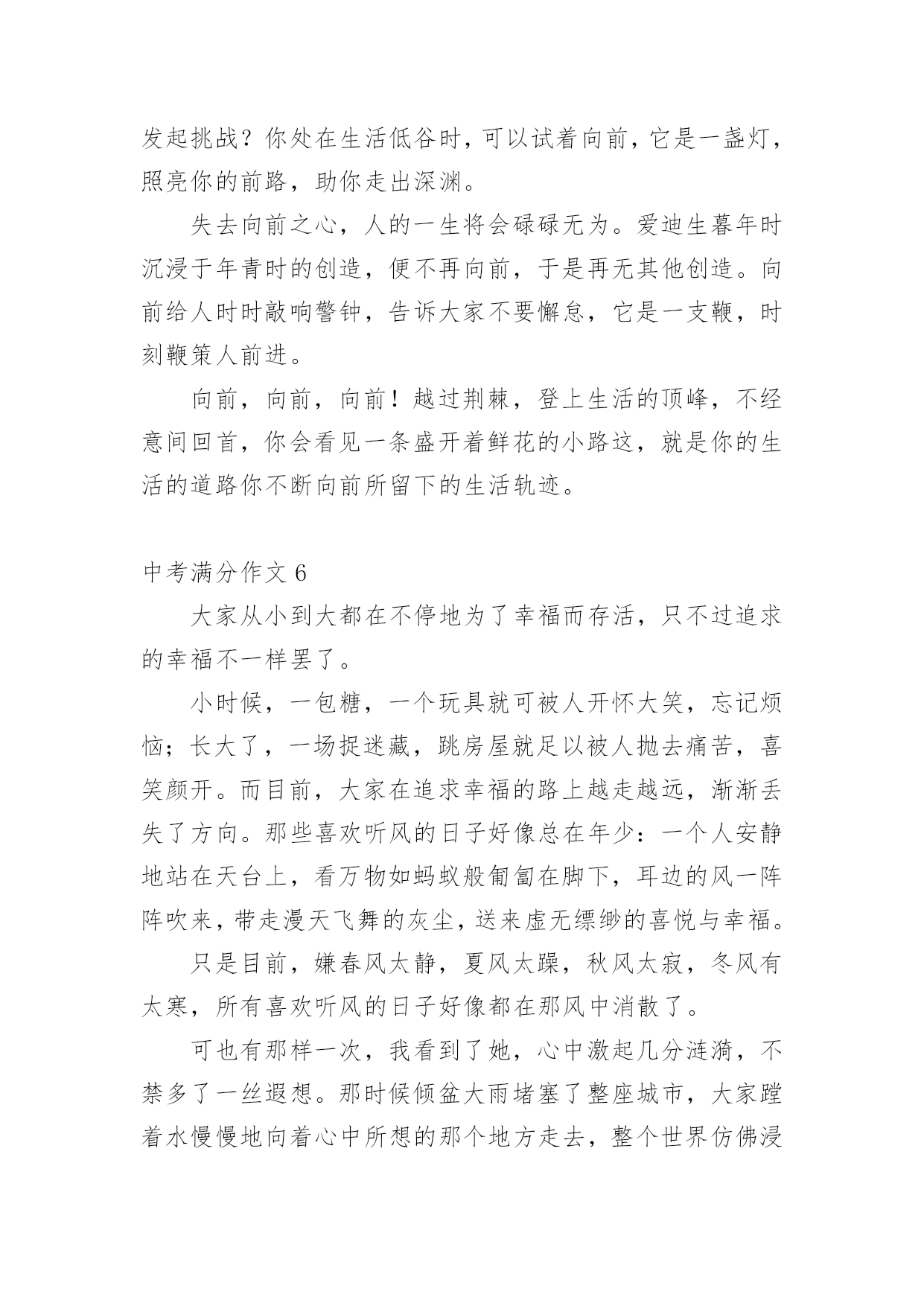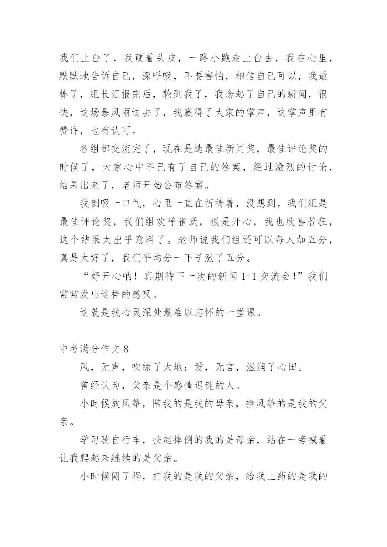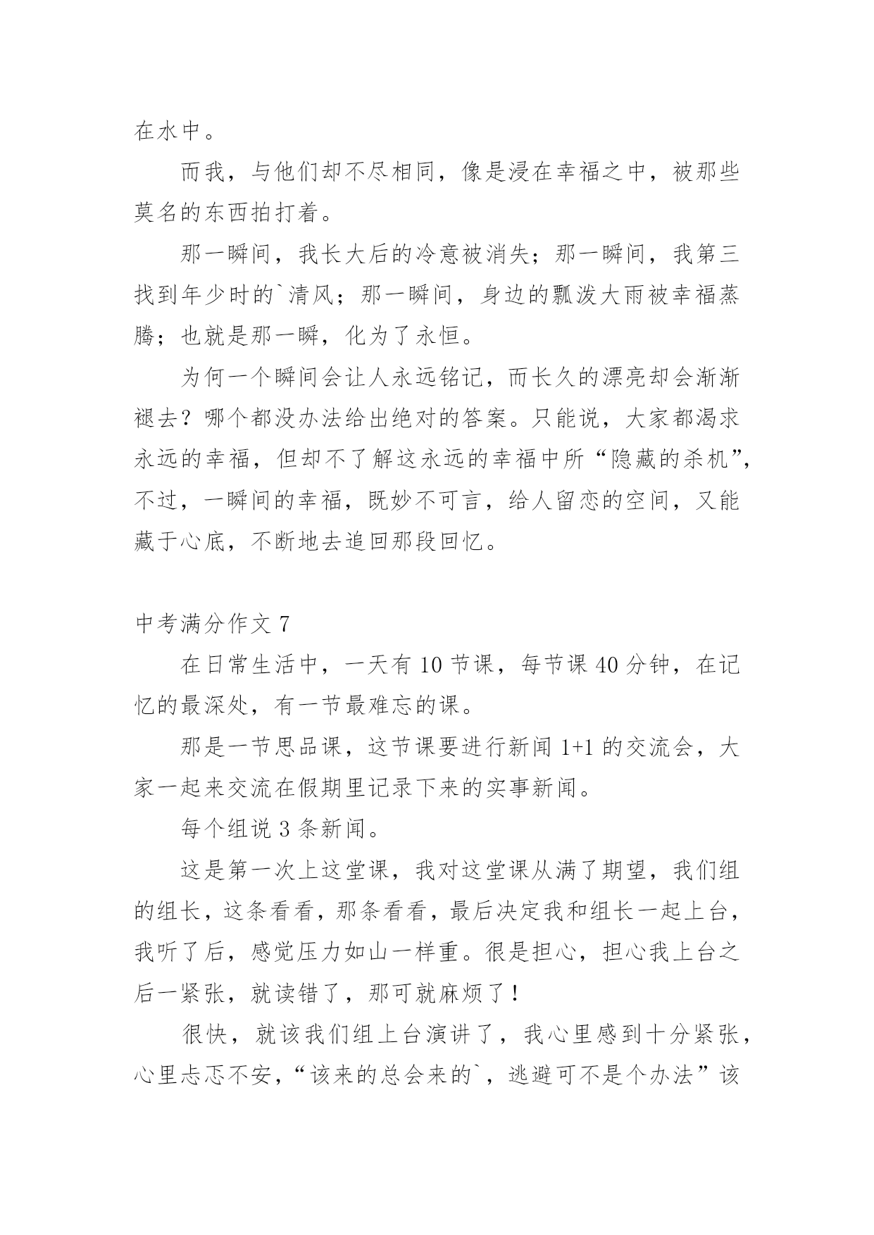 中考满分作文【经典】中考满分作文在日常学习、工作或生活中,说到作文,大家肯定都不陌生吧,作文可分为小学作文、中学作文、大学作文(论文)。那么一般作文是怎么写的呢?下面是小编帮大家整理的中考满分作文,仅供参考,欢迎大家阅读。中考满分作文1十八点的整点报时照常响起了,没了补习,也没了压力,更没有考试。但我并没有得到快乐,换来的是,另一个阶段的痛苦。突然,一阵风徐徐的吹来,“是啊!”我对着自己大叫,“这不是当初的梦想吗?”当初不就希望自己能考上法律系吗?想着想着,时光开始逆流,我回到了三个月前,一个为了考试而奋战的时期。自考试倒数进入100天后,学校老师们停止了复习课程,转而开始开放自习时间供同学提问和针对自己的弱点进行一次又一次的练习,没有人料的到,一匹大黑马正在后面虎视眈眈的`看着前面,等待时机来临之时。终于,考试到来了,老师也大致的预估了一下大家的成绩,这匹大黑马,依然不是大家视为的强将。但这匹黑马并没有想太多,把各式各样求来的物品摆在桌上后,便开始耐心的作答。时间一分一秒的过去,一科一科的过去了,但这匹黑马依然只是默默的前进,默默的超越一群停滞不前的花瓶白马。终于,公布成绩的时间终于到来了,这匹黑马终于得到了大家的注意,因为他跑到了最前面得到了第二名,这匹黑马不是别人,正是考上二中的我……外面……下着倾盆大雨,这雨,不知多久才会停,我唯一能够知道的是…我心中的乌云已经散去,换来的是一道美丽的彩虹……风,还是一样的吹着;雨还是一样的下着;我唯一能知道的是,我已经成为一个初中生,正为了我了未来,努力的追寻着我的梦想。中考满分作文2我家门前有一棵槐树,一棵不算高的槐树,可是,枝叶却异常茂盛。每个夏天,那里都是热热闹闹的。白天,老爷爷老奶奶在树下乘凉,晚上,大人们在树下打牌,玩的十分尽兴。不知什么时候,树上多了一个鸟窝,窝搭建的地方十分隐蔽,不仔细看是看不出来的'。那时侯,我每天最想干的事,就是看这个鸟窝了。这天下午,我像往常一样,背着书包往家走。离家不远了,我突然听到了一声声叽叽喳喳的鸟叫声。起初,我以为是一楼爷爷家的鸟在叫,去了一看,才发现他家的鸟并没有叫,在那里不停地说着“老板,你好。”后来。我才想到了大槐树上的那个鸟窝。我一口气爬到了六楼,仔细看了看,发现窝里有四个白糊糊的东西。是纸?还是石头?啊?!是鸟蛋,一定是鸟蛋!我恨不得也变成一只鸟,把这个好消息告诉全世界。这样令人高兴的事,应该庆祝庆祝才对。我从家里抓了一把小米,撒向大槐树,撒向那个鸟窝。请大家爱护树木,让更多的鸟儿们到这里来居住吧!中考满分作文3这座城市,温柔却又无情;看似热闹,却又如此地安静。人来人往的街道,寂静无声的小巷,尽管都在同一座城市,给人的感觉却截然不同。美丽,却也很容易让人受伤,就像带刺玫瑰一样,它──是我所居住的城市。清晨的它,就像一位穿着白纱的姑娘,天真、纯洁;然而,到了晚上,却摇身一变,变成一位冷酷无情的少女,既危险又孤单,这就是我所居住的'城市。街道上车子不断地急驶而过,每个人彷彿都在跟时间赛跑一样,不肯停下来;大家对身旁发生的事漠不关心,对需要帮助的人冷眼旁观。虽然已司空见惯,但仍然想到这座城市,为何要那么的无情呢?林立的高楼大厦和一旁的旧公寓形成了强烈的对比,到底是什么时候,那片蔚蓝的天空,被高楼大厦剪裁成这些碎片呢?从冷漠的大马路上,走进恬静的巷弄里,我感受到一股安静的氛围;这里没有呼啸而过的汽机车,也没有耸立的高楼,我感受到的是温暖。跟路人擦身而过,我看到的不再是冷漠的眼神,而是一个温柔的微笑。路旁的花草,更为了这里增添了不同的气息;抬头仰望天空,那些碎片全都消失得无影无踪剩下的,是一片热情与温柔交织而成的美丽天空,像瀑布一样倾洩着它的美好。这座城市冷漠无情,但它同时也温暖热情,它很美丽,尽管它有很多的缺点,在我心中却是完美的。中考满分作文4夜深了,台灯的灯光下,我还在俯案背书,期末考试的压力像一根无形的柱子压在我的身上,压得我喘不过气来,三科主科,四科小科,背得我心情烦闷。这时,妈妈端着一杯热腾腾的牛奶进来了,看我这个样子,她说;“太累了就歇一会儿吧!明天再背。”我的火气不知怎的“呼”的.一声蹿上来,回头就冲着妈妈喊到;“歇什么歇!还有几天就期末考试了,我考不好你管啊”妈妈脸上的笑容凝固了,动作也停止了,仿佛被定住了一般,半晌,她把牛奶放到我桌子上,叹了一口气,转身走出房间,带上了门,我感到了几分悔恨,仔细想想,妈妈也是为了我好,怕我累坏了身体,我却……第二天早晨,我起来上厕所,看到妈妈在厨房忙忙碌碌,静悄悄走过去,看到妈妈正在做我爱吃的好吃的,那细致的动作,又一抬眼,看见妈妈额头上沁出的细小的汗珠,想到昨晚我那样对妈妈,泪水不知不觉滑落下来,妈妈听到了动静,回头一看,连忙把我拉回床上,帮我盖好被子,告诉我;“不要着凉了,再睡会