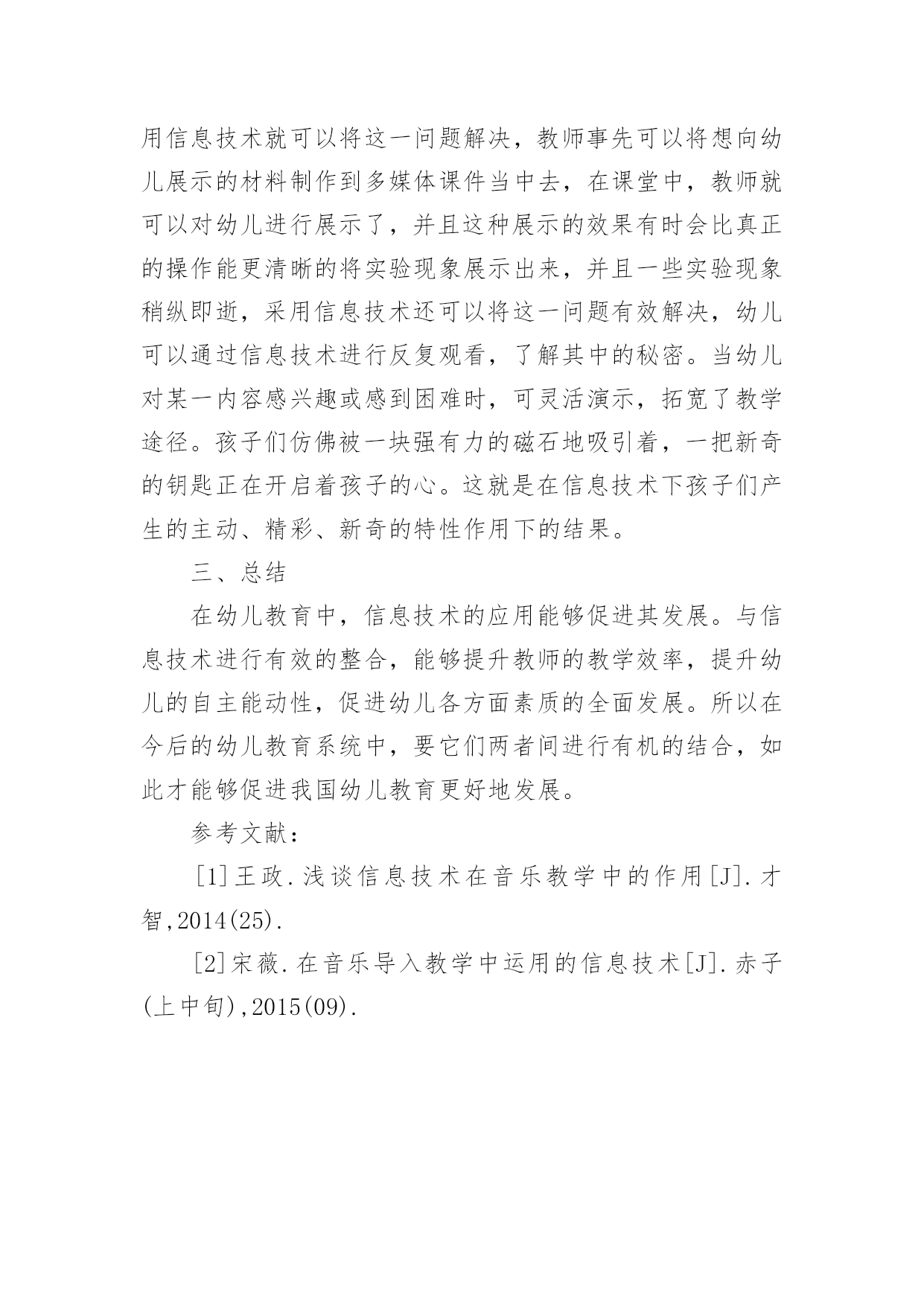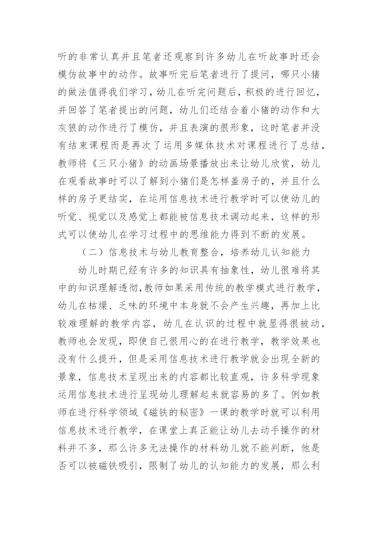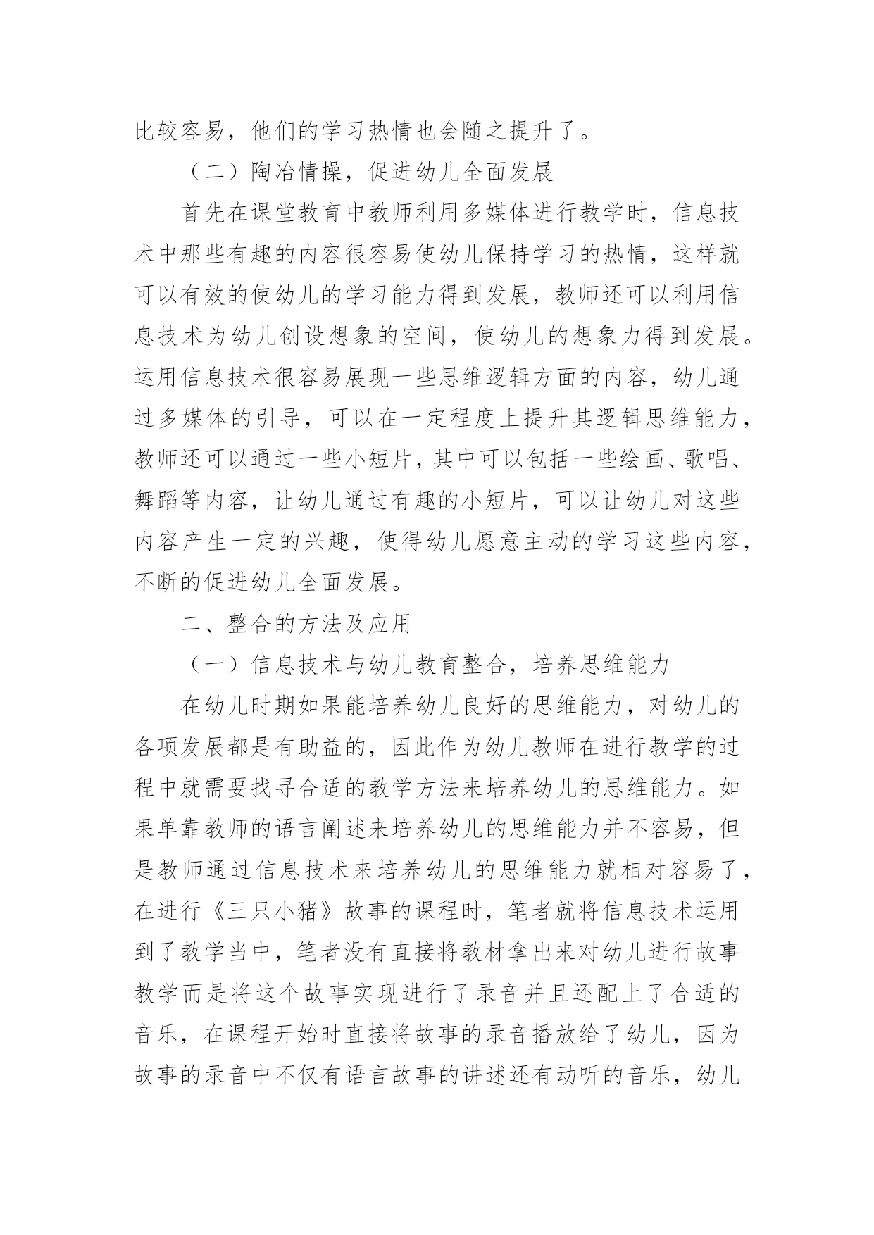 信息技术与幼儿教育的整合探析论文摘要:幼儿教育质量的好坏对孩子一生的发展有着重要影响,因此在进行幼儿教育时就需要不断的进行创新改革,才能保证幼儿得到更好的发展,现在许多幼儿园都采用了信息技术来与与幼儿教育进行整合,可见其对幼儿教育有重要作用。信息技术的出现在许多方面都能促进幼儿的发展,文章就二者的整合进行简要分析。关键词:信息技术;幼儿教育;整合一、整合优势(一)提升学习热情孩子在幼儿时期普遍有着这样的特点,注意力集中时间较短、对新奇的事物更能产生兴趣等,因此在幼儿教育与信息技术进行整合就可以有效的提升幼儿学习兴趣,传统的幼儿教学中,教师仅仅去根据设定的好的教学内容去进行讲解,并且讲解的相对枯燥,因为幼儿好动的特性,在课堂内容没有吸引力时,课堂气氛就会较为混乱,这种教育形式,幼儿很难产生学习的热情,面对这样的情况不仅不会使幼儿的学习热情得到提升,学习能力不会提高,而且在一定程度上还会阻碍幼儿的发展。然而在在进行幼儿教育时与信息技术进行整合就可以有效的解决这一问题,因为信息技术有较强的灵活性,在进行教学中内容的设定也能更加丰富,并且呈现出的动画、图片很容易吸引幼儿的注意力,并且能延长注意的时间,动画视频直观的将教学内容进行呈现幼儿理解起来比较容易,他们的学习热情也会随之提升了。(二)陶冶情操,促进幼儿全面发展首先在课堂教育中教师利用多媒体进行教学时,信息技术中那些有趣的内容很容易使幼儿保持学习的热情,这样就可以有效的使幼儿的学习能力得到发展,教师还可以利用信息技术为幼儿创设想象的空间,使幼儿的想象力得到发展。运用信息技术很容易展现一些思维逻辑方面的内容,幼儿通过多媒体的引导,可以在一定程度上提升其逻辑思维能力,教师还可以通过一些小短片,其中可以包括一些绘画、歌唱、舞蹈等内容,让幼儿通过有趣的小短片,可以让幼儿对这些内容产生一定的兴趣,使得幼儿愿意主动的学习这些内容,不断的促进幼儿全面发展。二、整合的方法及应用(一)信息技术与幼儿教育整合,培养思维能力在幼儿时期如果能培养幼儿良好的思维能力,对幼儿的各项发展都是有助益的,因此作为幼儿教师在进行教学的过程中就需要找寻合适的教学方法来培养幼儿的思维能力。如果单靠教师的语言阐述来培养幼儿的思维能力并不容易,但是教师通过信息技术来培养幼儿的思维能力就相对容易了,在进行《三只小猪》故事的课程时,笔者就将信息技术运用到了教学当中,笔者没有直接将教材拿出来对幼儿进行故事教学而是将这个故事实现进行了录音并且还配上了合适的音乐,在课程开始时直接将故事的录音播放给了幼儿,因为故事的录音中不仅有语言故事的讲述还有动听的音乐,幼儿听的非常认真并且笔者还观察到许多幼儿在听故事时还会模仿故事中的动作。故事听完后笔者进行了提问,哪只小猪的做法值得我们学习,幼儿在听完问题后,积极的进行回忆,并回答了笔者提出的问题,幼儿们还结合着小猪的动作和大灰狼的动作进行了模仿,并且表演的很形象,这时笔者并没有结束课程而是再次了运用多媒体技术对课程进行了总结,教师将《三只小猪》的动画场景播放出来让幼儿欣赏,幼儿在观看故事时可以了解到小猪们是怎样盖房子的,并且什么样的房子更结实,在运用信息技术进行教学时可以使幼儿的听觉、视觉以及感觉上都能被信息技术调动起来,这样的形式可以使幼儿在学习过程中的思维能力得到不断的发展。(二)信息技术与幼儿教育整合,培养幼儿认知能力幼儿时期已经有许多的知识具有抽象性,幼儿很难将其中的知识理解透彻,教师如果采用传统的教学模式进行教学,幼儿在枯燥、乏味的环境中本身就不会产生兴趣,再加上比较难理解的教学内容,幼儿在认识的过程中就显得很被动,教师也会发现,即使自己很用心的在进行教学,教学效果也没有什么提升,但是采用信息技术进行教学就会出现全新的景象,信息技术呈现出来的内容都比较直观,许多科学现象运用信息技术进行呈现幼儿理解起来就容易的多了。例如教师在进行科学领域《磁铁的秘密》一课的教学时就可以利用信息技术进行教学,在课堂上真正能让幼儿去动手操作的材料并不多,那么许多无法操作的材料幼儿就不能判断,他是否可以被磁铁吸引,限制了幼儿的认知能力的发展,那么利用信息技术就可以将这一问题解决,教师事先可以将想向幼儿展示的材料制作到多媒体课件当中去,在课堂中,教师就可以对幼儿进行展示了,并且这种展示的效果有时会比真正的操作能更清晰的将实验现象展示出来,并且一些实验现象稍纵即逝,采用信息技术还可以将这一问题有效解决,幼儿可以通过信息技术进行反复观看,了解其中的秘密。当幼儿对某一内容感兴趣或感到困难时,可灵活演示,拓宽了教学途径。孩子们仿佛被一块强有力的磁石地吸引着,一把新奇的钥匙正在开启着孩子的心。这就是在信息技术下孩子们产生的主动、精彩、新奇的特性作用下的结果。三、总结在幼儿教育中,信息技术的应用能够促进其发展。与信息技