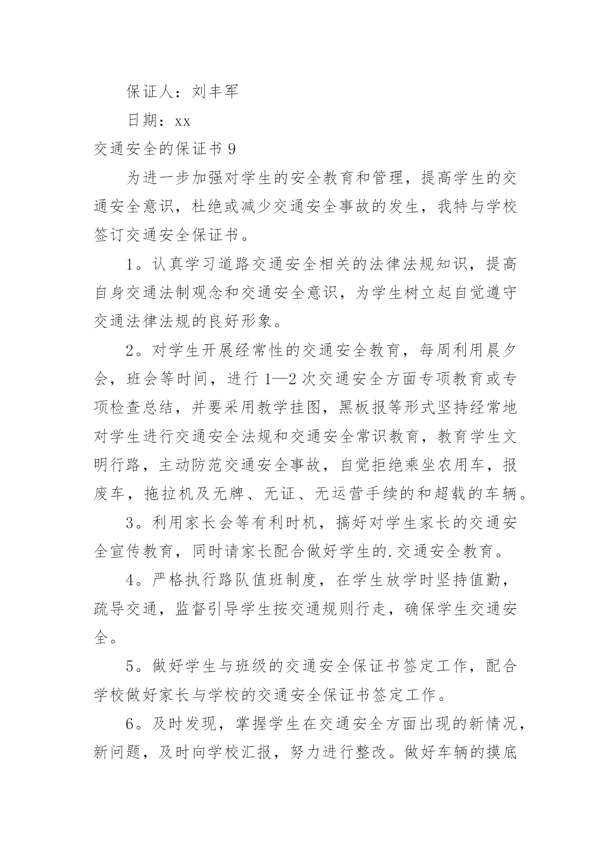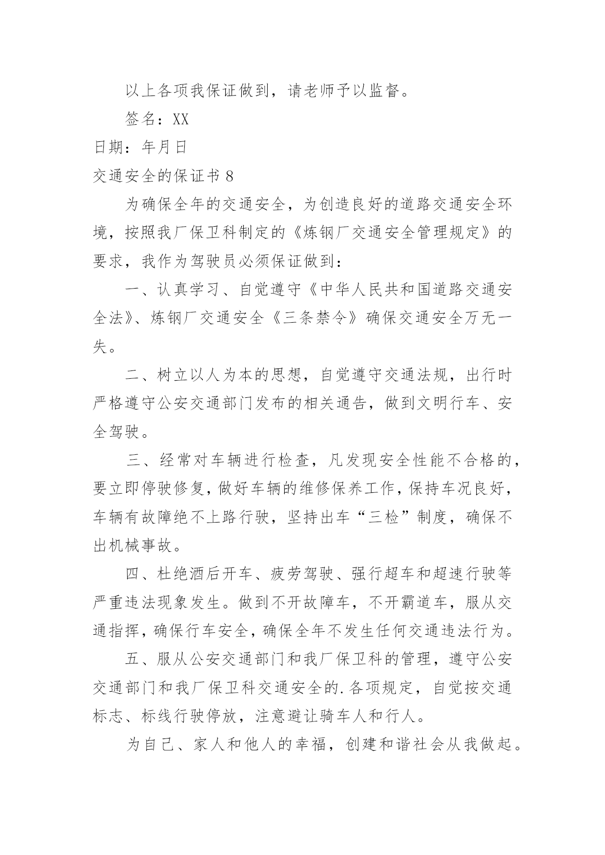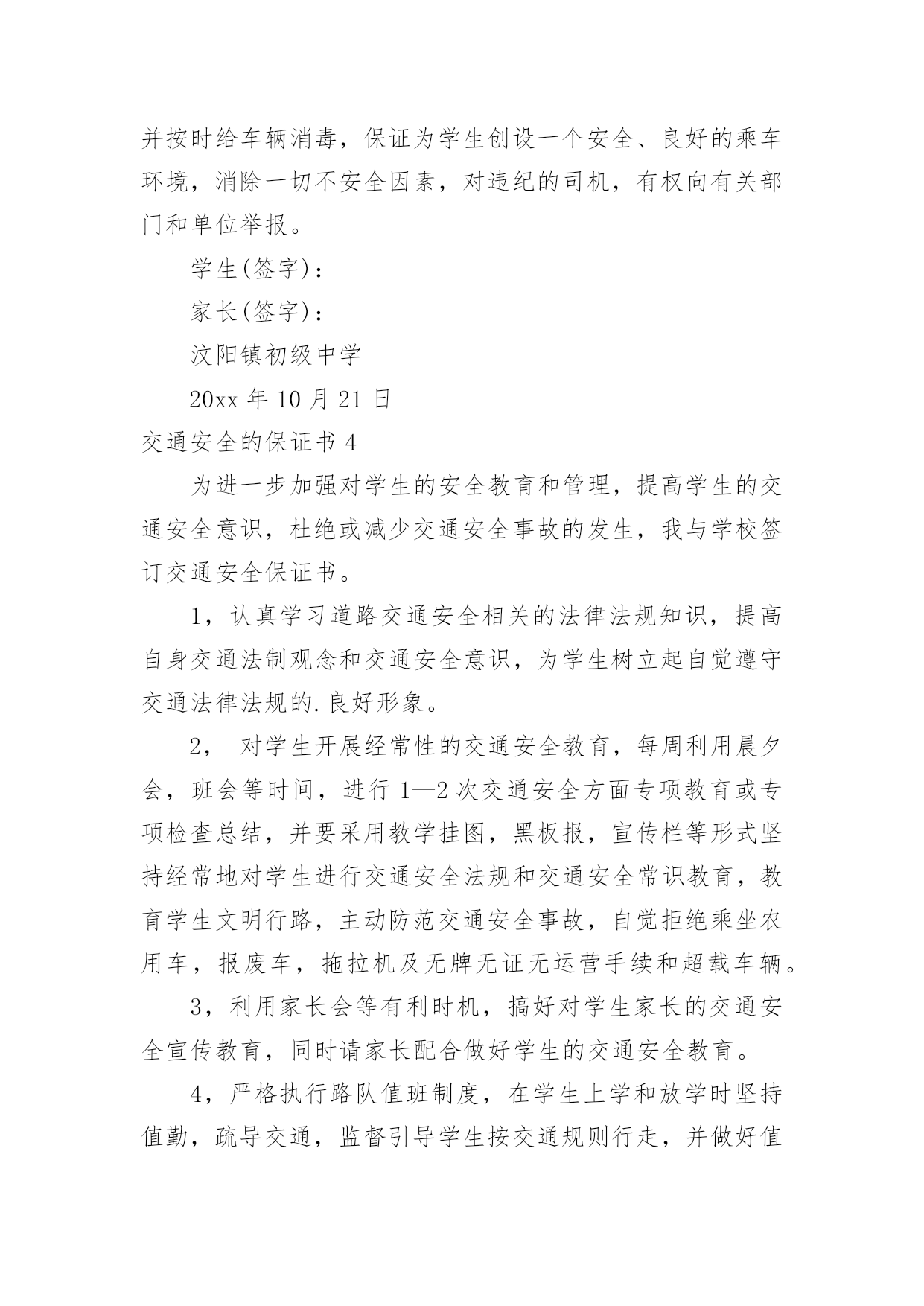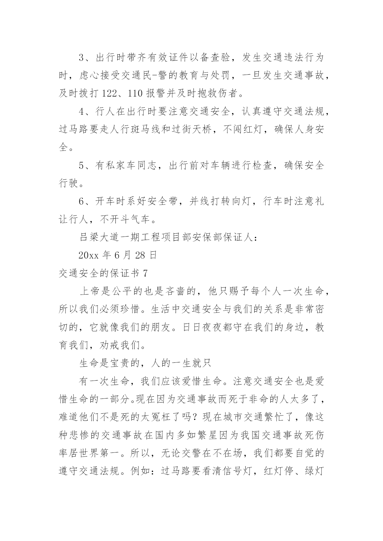 交通安全的保证书交通安全的保证书15篇在现在社会,接触并使用保证书的人越来越多,保证书具有单方的特证。那么什么样的保证书才是有效的呢?以下是小编帮大家整理的交通安全的保证书,仅供参考,希望能够帮助到大家。交通安全的保证书1成都市公安局交通管理局科技规划处:我单位共有职工交通班车共辆,为共创我市文明交通环境,共同维护我市道路交通的有序、安全与畅通,特承诺如下:一、建立并完善交通安全规章制度,严格对单位驾驶人员的教育培训和管理考核,落实安全责任。二、严格遵守道路交通安全法律法规,文明行车,配合交通民警的指挥管理,驾驶车辆不超员、不超速、不饮酒后驾驶机动车、不违反交通信号通行。在设置公交专用车道的'道路上在专用车道内通行。三、对公安交通管理部门抄告的驾驶人员交通违法行为,严格按照本单位的安全责任规章制度,追究安全管理责任人和驾驶人员的责任。四、我单位职工交通班车使用情况发生变化,不再作为职工交通班车时,及时向公安机关交通管理部门通报备案,并交回公交专用车道通行证。单位法定代表人签字:(单位公章)20xx年月日交通安全的保证书2为进一步加强对学生的安全教育和管理,提高学生的交通安全意识,杜绝或减少交通安全事故的发生,我特与学校签订交通安全保证书.1.认真学习道路交通安全相关的法律法规知识,提高自身交通法制观念和交通安全意识,为学生树立起自觉遵守交通法律法规的良好形象。2.对学生开展经常性的交通安全教育,每周利用晨夕会,班会等时间,进行1-2次交通安全方面专项教育或专项检查总结,并要采用教学挂图,黑板报等形式坚持经常地对学生进行交通安全法规和交通安全常识教育,教育学生文明行路,主动防范交通安全事故,自觉拒绝乘坐农用车,报废车,拖拉机及无牌、无证、无运营手续的和超载的车辆。3.利用家长会等有利时机,搞好对学生家长的交通安全宣传教育,同时请家长配合做好学生的交通安全教育。4.严格执行路队值班制度,在学生放学时坚持值勤,疏导交通,监督引导学生按交通规则行走,确保学生交通安全。5.做好学生与班级的.交通安全保证书签定工作,配合学校做好家长与学校的交通安全保证书签定工作。6.及时发现,掌握学生在交通安全方面出现的新情况,新问题,及时向学校汇报,努力进行整改.做好车辆的摸底排查工作,发动学生及学生家长向学校和有关部门进行举报。以上各项我保证做到,请领导进行监督。XX市___________小学(章)班主任(签字):校长(签字):20xx年9交通安全的保证书3为保证学生的交通安全,我保证做到:一、认真教育孩子,自觉遵守交通法规,养成良好的行为习惯.不在公路上踢球、游玩、戏闹。上学、放学时时处处注意交通安全。二、教育孩子乘车时要遵守秩序,注意乘车安全。三、作为孩子的第一监护人,我保证孩子不乘坐无标识、无证、无牌或不合手续的报废车、农用车及个别私自组织的无运营手续的违规车辆。否则发生问题,后果自负。四、教育孩子文明乘车,不拥挤,不抢座,不打架,自觉遵守乘车纪律,确保乘车期间的人身安全。五、现在个别接送学生的车辆超员严重,保证自己的孩子不乘坐超员的车辆。否则由此引发的'各种问题,后果由自负。]六、监督孩子在规定的时间内到指定的地点等车、坐车。不得提前出门,更不得在大街上跑闹。七、监督司机,使其驾车时不饮酒、不违章、不超员,并按时给车辆消毒,保证为学生创设一个安全、良好的乘车环境,消除一切不安全因素,对违纪的司机,有权向有关部门和单位举报。学生(签字):家长(签字):汶阳镇初级中学20xx年10月21日交通安全的保证书4为进一步加强对学生的安全教育和管理,提高学生的交通安全意识,杜绝或减少交通安全事故的发生,我与学校签订交通安全保证书。1,认真学习道路交通安全相关的法律法规知识,提高自身交通法制观念和交通安全意识,为学生树立起自觉遵守交通法律法规的.良好形象。2,对学生开展经常性的交通安全教育,每周利用晨夕会,班会等时间,进行1—2次交通安全方面专项教育或专项检查总结,并要采用教学挂图,黑板报,宣传栏等形式坚持经常地对学生进行交通安全法规和交通安全常识教育,教育学生文明行路,主动防范交通安全事故,自觉拒绝乘坐农用车,报废车,拖拉机及无牌无证无运营手续和超载车辆。3,利用家长会等有利时机,搞好对学生家长的交通安全宣传教育,同时请家长配合做好学生的交通安全教育。4,严格执行路队值班制度,在学生上学和放学时坚持值勤,疏导交通,监督引导学生按交通规则行走,并做好值班记录,确保学生交通安全。5,做好学生与班级的交通安全保证书签定工作,配合学校做好家长与学校的交通安全保证书签定工作。6,及时发现,掌握学生在交通安全方面出现的新情况,新问题,及时向学校汇报,努力进行整改。做好车辆的摸底排查工作,发动学生及学生家长向学校和有关部门进行举报。以上各项我保证做到,请领导进行