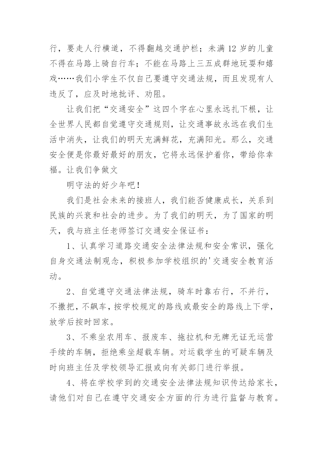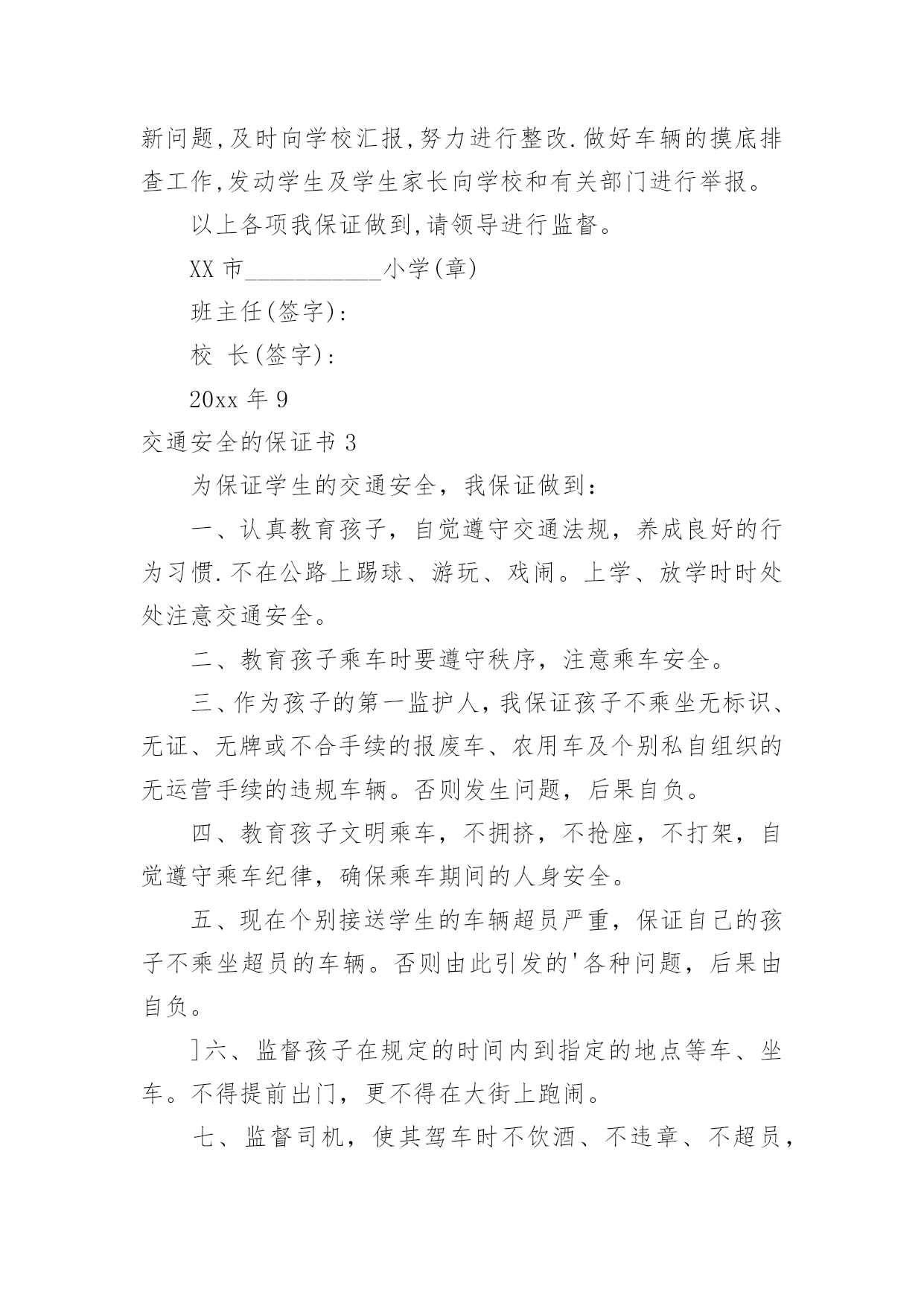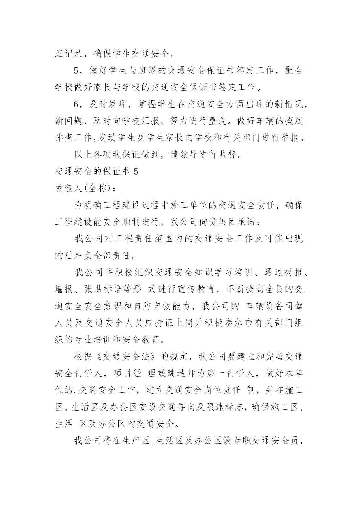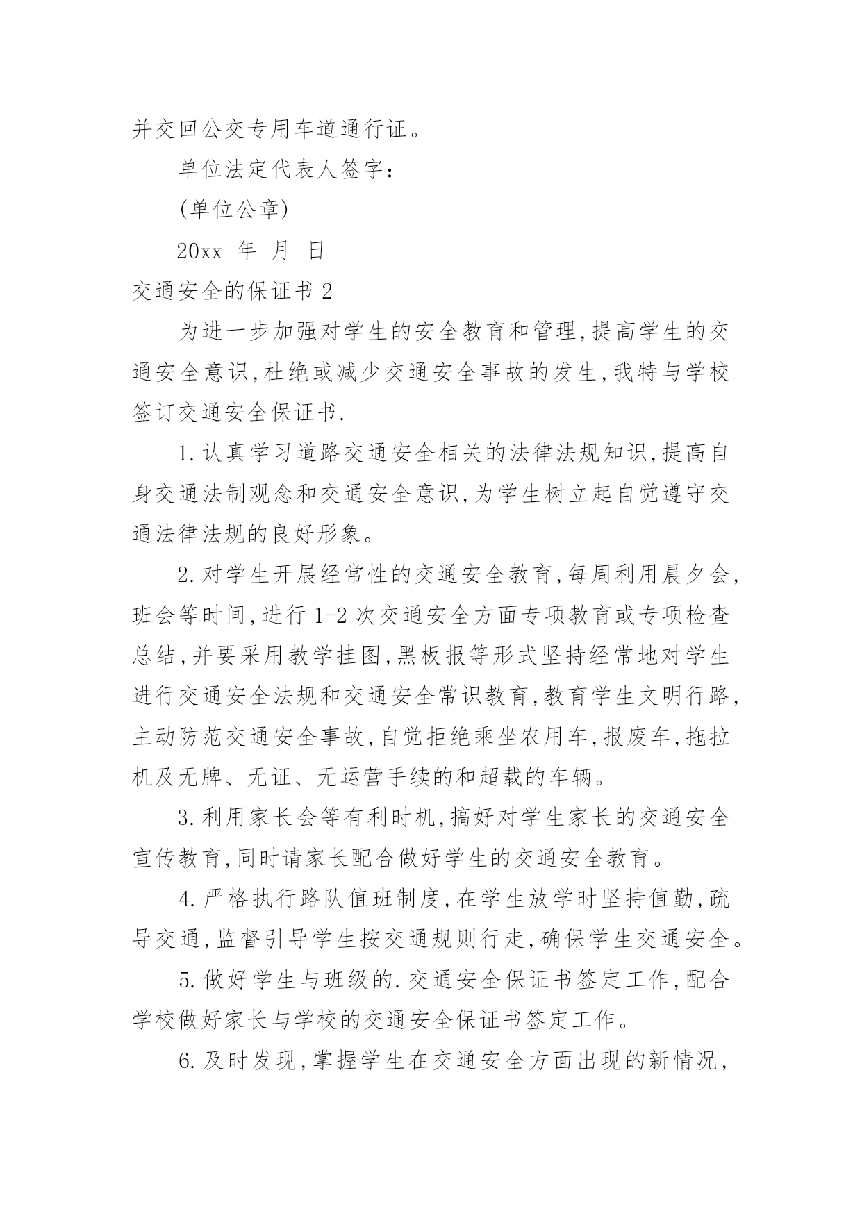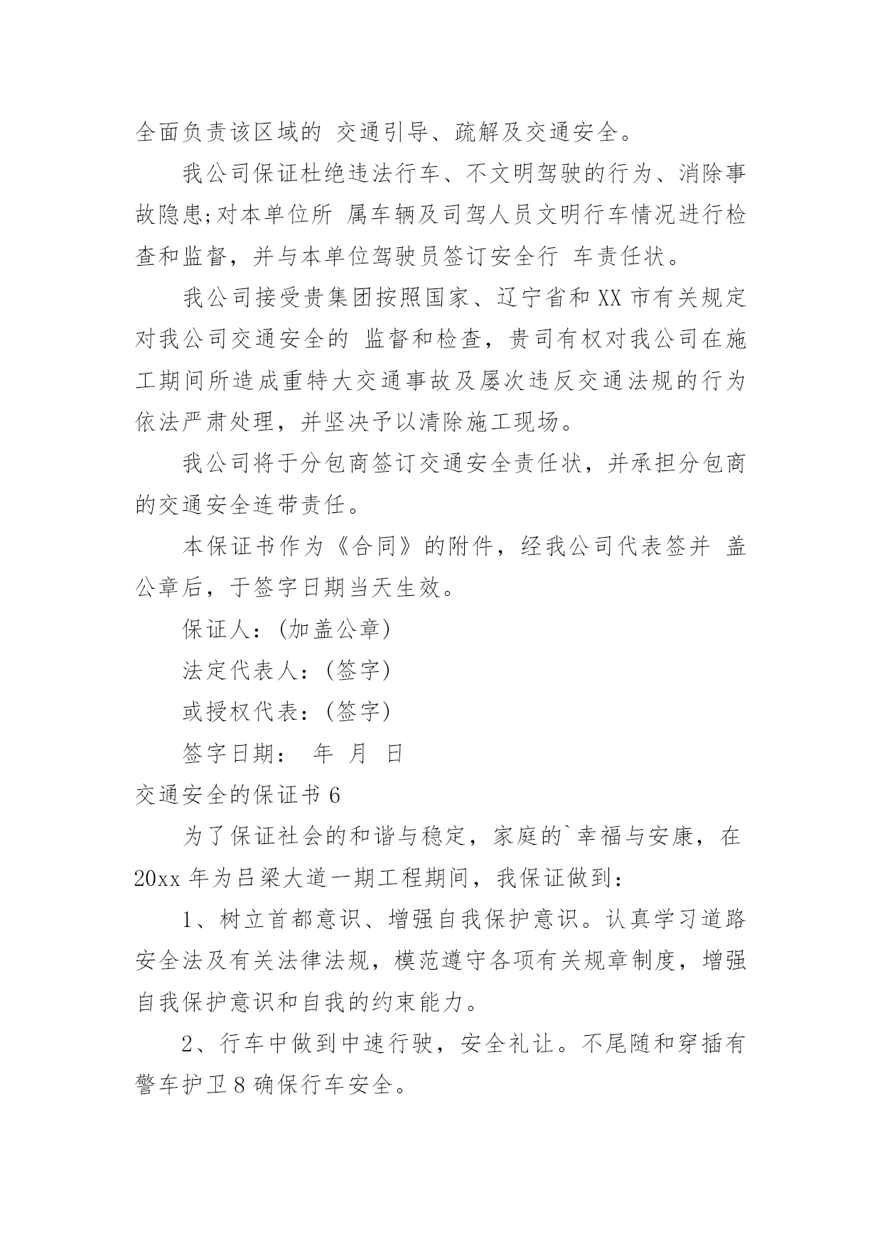 交通安全的保证书交通安全的保证书15篇在现在社会,接触并使用保证书的人越来越多,保证书具有单方的特证。那么什么样的保证书才是有效的呢?以下是小编帮大家整理的交通安全的保证书,仅供参考,希望能够帮助到大家。交通安全的保证书1成都市公安局交通管理局科技规划处:我单位共有职工交通班车共辆,为共创我市文明交通环境,共同维护我市道路交通的有序、安全与畅通,特承诺如下:一、建立并完善交通安全规章制度,严格对单位驾驶人员的教育培训和管理考核,落实安全责任。二、严格遵守道路交通安全法律法规,文明行车,配合交通民警的指挥管理,驾驶车辆不超员、不超速、不饮酒后驾驶机动车、不违反交通信号通行。在设置公交专用车道的'道路上在专用车道内通行。三、对公安交通管理部门抄告的驾驶人员交通违法行为,严格按照本单位的安全责任规章制度,追究安全管理责任人和驾驶人员的责任。四、我单位职工交通班车使用情况发生变化,不再作为职工交通班车时,及时向公安机关交通管理部门通报备案,并交回公交专用车道通行证。单位法定代表人签字:(单位公章)20xx年月日交通安全的保证书2为进一步加强对学生的安全教育和管理,提高学生的交通安全意识,杜绝或减少交通安全事故的发生,我特与学校签订交通安全保证书.1.认真学习道路交通安全相关的法律法规知识,提高自身交通法制观念和交通安全意识,为学生树立起自觉遵守交通法律法规的良好形象。2.对学生开展经常性的交通安全教育,每周利用晨夕会,班会等时间,进行1-2次交通安全方面专项教育或专项检查总结,并要采用教学挂图,黑板报等形式坚持经常地对学生进行交通安全法规和交通安全常识教育,教育学生文明行路,主动防范交通安全事故,自觉拒绝乘坐农用车,报废车,拖拉机及无牌、无证、无运营手续的和超载的车辆。3.利用家长会等有利时机,搞好对学生家长的交通安全宣传教育,同时请家长配合做好学生的交通安全教育。4.严格执行路队值班制度,在学生放学时坚持值勤,疏导交通,监督引导学生按交通规则行走,确保学生交通安全。5.做好学生与班级的.交通安全保证书签定工作,配合学校做好家长与学校的交通安全保证书签定工作。6.及时发现,掌握学生在交通安全方面出现的新情况,新问题,及时向学校汇报,努力进行整改.做好车辆的摸底排查工作,发动学生及学生家长向学校和有关部门进行举报。以上各项我保证做到,请领导进行监督。XX市___________小学(章)班主任(签字):校长(签字):20xx年9交通安全的保证书3为保证学生的交通安全,我保证做到:一、认真教育孩子,自觉遵守交通法规,养成良好的行为习惯.不在公路上踢球、游玩、戏闹。上学、放学时时处处注意交通安全。二、教育孩子乘车时要遵守秩序,注意乘车安全。三、作为孩子的第一监护人,我保证孩子不乘坐无标识、无证、无牌或不合手续的报废车、农用车及个别私自组织的无运营手续的违规车辆。否则发生问题,后果自负。四、教育孩子文明乘车,不拥挤,不抢座,不打架,自觉遵守乘车纪律,确保乘车期间的人身安全。五、现在个别接送学生的车辆超员严重,保证自己的孩子不乘坐超员的车辆。否则由此引发的'各种问题,后果由自负。]六、监督孩子在规定的时间内到指定的地点等车、坐车。不得提前出门,更不得在大街上跑闹。七、监督司机,使其驾车时不饮酒、不违章、不超员,并按时给车辆消毒,保证为学生创设一个安全、良好的乘车环境,消除一切不安全因素,对违纪的司机,有权向有关部门和单位举报。学生(签字):家长(签字):汶阳镇初级中学20xx年10月21日交通安全的保证书4为进一步加强对学生的安全教育和管理,提高学生的交通安全意识,杜绝或减少交通安全事故的发生,我与学校签订交通安全保证书。1,认真学习道路交通安全相关的法律法规知识,提高自身交通法制观念和交通安全意识,为学生树立起自觉遵守交通法律法规的.良好形象。2,对学生开展经常性的交通安全教育,每周利用晨夕会,班会等时间,进行1—2次交通安全方面专项教育或专项检查总结,并要采用教学挂图,黑板报,宣传栏等形式坚持经常地对学生进行交通安全法规和交通安全常识教育,教育学生文明行路,主动防范交通安全事故,自觉拒绝乘坐农用车,报废车,拖拉机及无牌无证无运营手续和超载车辆。3,利用家长会等有利时机,搞好对学生家长的交通安全宣传教育,同时请家长配合做好学生的交通安全教育。4,严格执行路队值班制度,在学生上学和放学时坚持值勤,疏导交通,监督引导学生按交通规则行走,并做好值班记录,确保学生交通安全。5,做好学生与班级的交通安全保证书签定工作,配合学校做好家长与学校的交通安全保证书签定工作。6,及时发现,掌握学生在交通安全方面出现的新情况,新问题,及时向学校汇报,努力进行整改。做好车辆的摸底排查工作,发动学生及学生家长向学校和有关部门进行举报。以上各项我保证做到,请领导进行