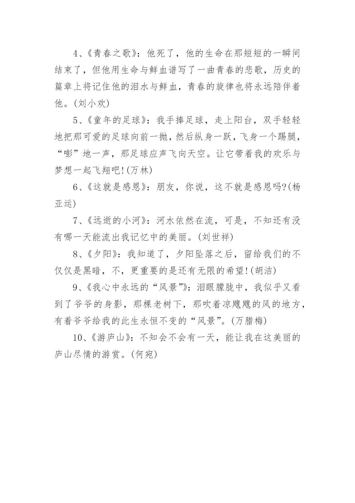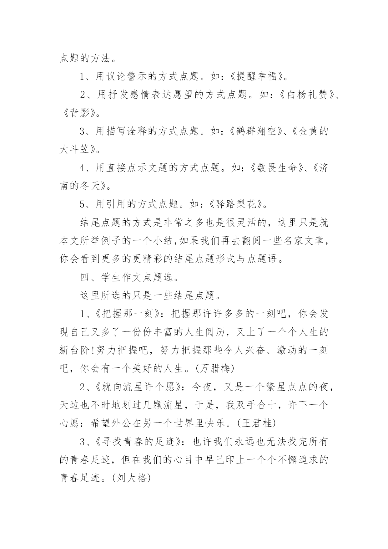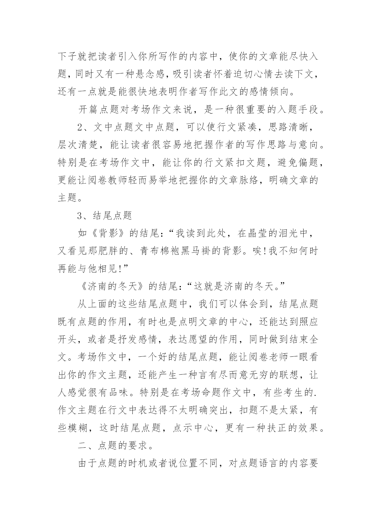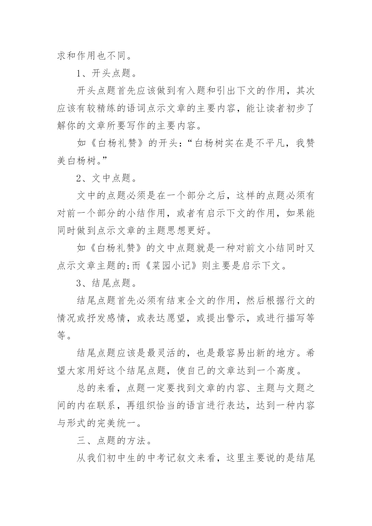 中考语文作文考前辅导中考语文作文考前辅导在初中语文课本中,有很多巧妙的点题很值得玩味。首推当是简媜的《夏之绝句》,结尾一段:“而每年每年,蝉声依旧,依旧像一首绝句,平平仄仄平。”这个结尾并没有说到蝉声有什么深奥的内含,只是说“蝉声依旧,依旧像一首绝句,平平仄仄平”,一个“平平仄仄平”就是一种绝句的节奏,是一种韵味,这真是一种近乎完美的点题,完全就是一种音乐的节奏感,不需要用语言的意义来表达什么,只需要你用自己的心灵去昤听,去感受夏日那种生命紧凑而又明快的节奏感,就是一种美的享受。当然,还有很多其它的点题,先就不一一举例。这里我们要讨论的是就初中生考场记叙文应该如何做好点题。一、点题的时机。在一篇文章中如何点题,什么时机点题一要看作者对整篇文章的构思,还要看行文的需要,更重要的是看作者本身的语言组织能力,能否将点题与文章的内容做到有机的结合,达到一种完美的统一。也并不是想什么时候点题就什么时候点题的。点得好,相得益彰,点得不好,弄巧成拙。1、开头点题。如《背影》开头:“我与父亲不相见已二年了,我最不能忘记的是他的背影。”开篇点题,我们可以体会到开篇点题既有开门见山,一下子就把读者引入你所写作的内容中,使你的文章能尽快入题,同时又有一种悬念感,吸引读者怀着迫切心情去读下文,还有一点就是能很快地表明作者写作此文的感情倾向。开篇点题对考场作文来说,是一种很重要的入题手段。2、文中点题文中点题,可以使行文紧凑,思路清晰,层次清楚,能让读者很容易地把握作者的写作思路与意向。特别是在考场作文中,能让你的行文紧扣文题,避免偏题,更能让阅卷教师轻而易举地把握你的文章脉络,明确文章的主题。3、结尾点题如《背影》的结尾:“我读到此处,在晶莹的泪光中,又看见那肥胖的、青布棉袍黑马褂的背影。唉!我不知何时再能与他相见!”《济南的冬天》的结尾:“这就是济南的冬天。”从上面的这些结尾点题中,我们可以体会到,结尾点题既有点题的作用,有时也是点明文章的中心,还能达到照应开头,或者是抒发感情,表达愿望的作用,同时做到结束全文。考场作文中,一个好的结尾点题,能让阅卷老师一眼看出你的作文主题,还能产生一种言有尽而意无穷的联想,让人感觉很有品味。特别是在考场命题作文中,有些考生的.作文主题在行文中表达得不太明确突出,扣题不是太紧,有些模糊,这时结尾点题,点示中心,更有一种扶正的效果。二、点题的要求。由于点题的时机或者说位置不同,对点题语言的内容要求和作用也不同。1、开头点题。开头点题首先应该做到有入题和引出下文的作用,其次应该有较精练的语词点示文章的主要内容,能让读者初步了解你的文章所要写作的主要内容。如《白杨礼赞》的开头:“白杨树实在是不平凡,我赞美白杨树。”2、文中点题。文中的点题必须是在一个部分之后,这样的点题必须有对前一个部分的小结作用,或者有启示下文的作用,如果能同时做到点示文章的主题思想更好。如《白杨礼赞》的文中点题就是一种对前文小结同时又点示文章主题的;而《菜园小记》则主要是启示下文。3、结尾点题。结尾点题首先必须有结束全文的作用,然后根据行文的情况或抒发感情,或表达愿望,或提出警示,或进行描写等等。结尾点题应该是最灵活的,也是最容易出新的地方。希望大家用好这个结尾点题,使自己的文章达到一个高度。总的来看,点题一定要找到文章的内容、主题与文题之间的内在联系,再组织恰当的语言进行表达,达到一种内容与形式的完美统一。三、点题的方法。从我们初中生的中考记叙文来看,这里主要说的是结尾点题的方法。1、用议论警示的方式点题。如:《提醒幸福》。2、用抒发感情表达愿望的方式点题。如:《白杨礼赞》、《背影》。3、用描写诠释的方式点题。如:《鹤群翔空》、《金黄的大斗笠》。4、用直接点示文题的方式点题。如:《敬畏生命》、《济南的冬天》。5、用引用的方式点题。如:《驿路梨花》。结尾点题的方式是非常之多也是很灵活的,这里只是就本文所举例子的一个小结,如果我们再去翻阅一些名家文章,你会看到更多的更精彩的结尾点题形式与点题语。四、学生作文点题选。这里所选的只是一些结尾点题。1、《把握那一刻》:把握那许许多多的一刻吧,你会发现自己又多了一份份丰富的人生阅历,又上了一个个人生的新台阶!努力把握吧,努力把握那些令人兴奋、激动的一刻吧,你会有一个美好的人生。(万腊梅)2、《就向流星许个愿》:今夜,又是一个繁星点点的夜,天边也不时地划过几颗流星,于是,我双手合十,许下一个心愿:希望外公在另一个世界里快乐。(王君桂)3、《寻找青春的足迹》:也许我们永远也无法找完所有的青春足迹,但在我们的心目中早已印上一个个不懈追求的青春足迹。(刘大格)4、《青春之歌》:他死了,他的生命在那短短的一瞬间结束了,但他用生命与鲜血谱写了一曲青春的悲歌,历史的篇章上将记住他的泪水与鲜血,青春的旋律也将永远陪伴着他。