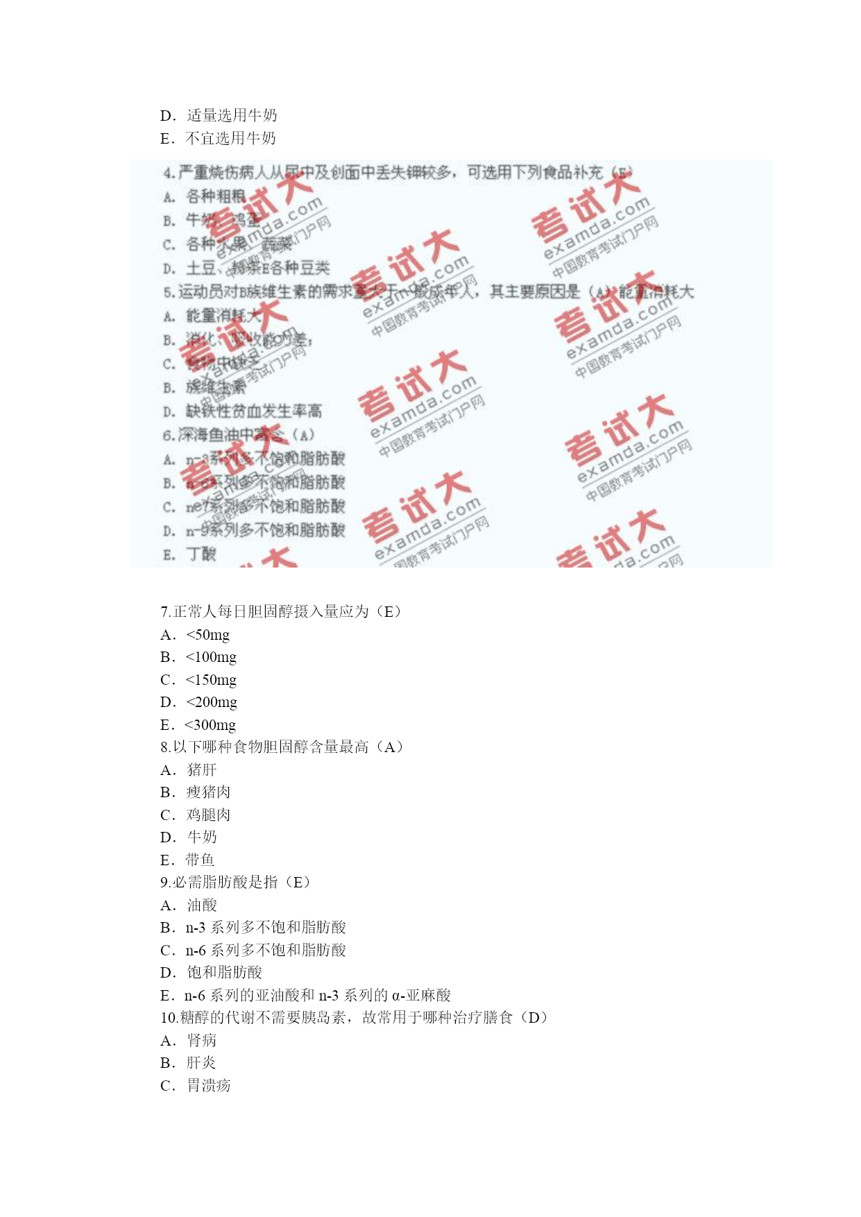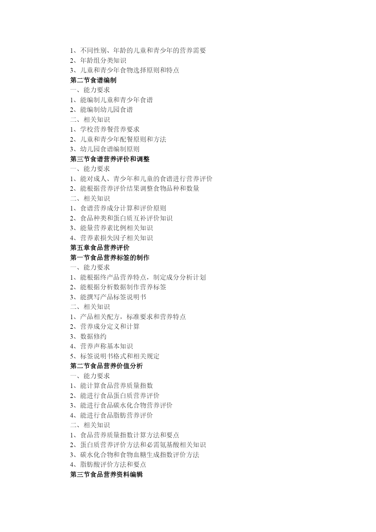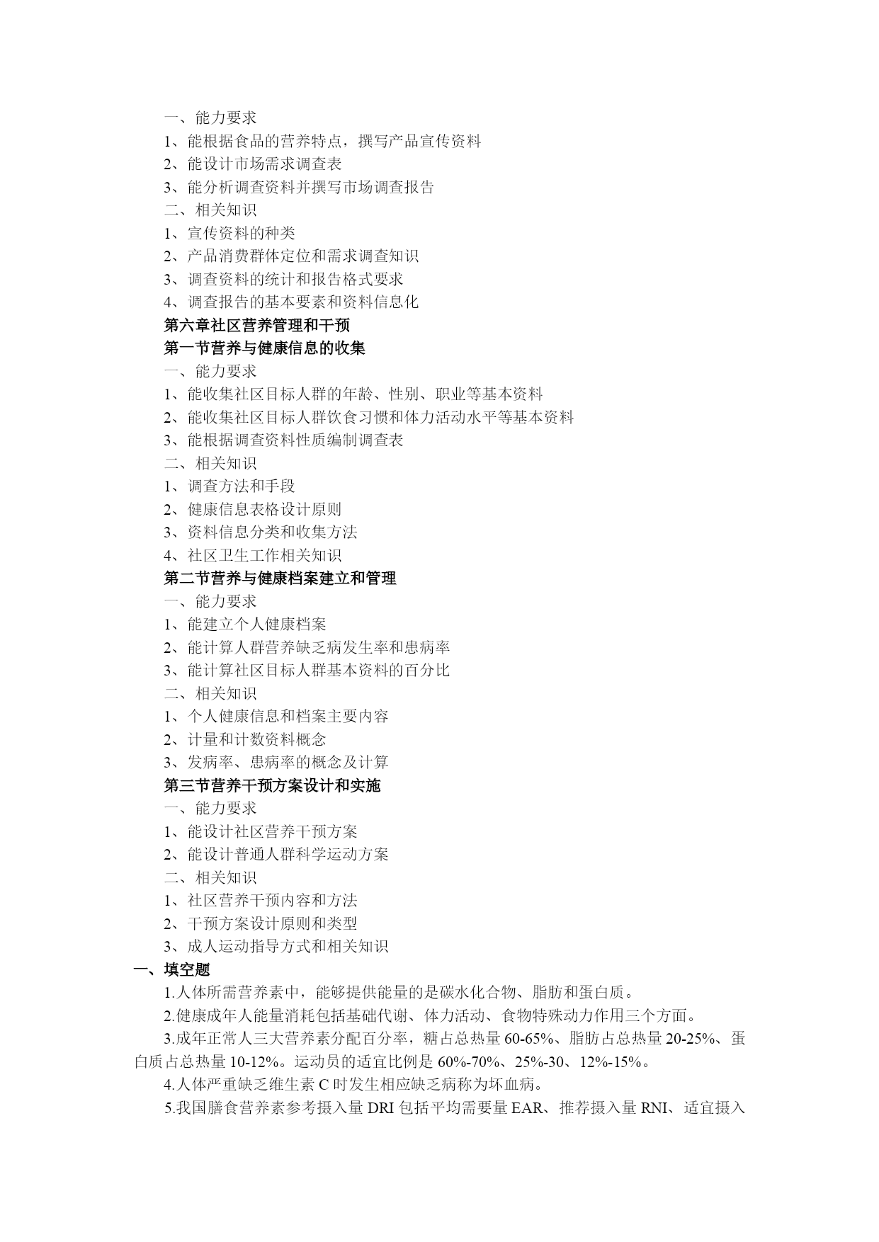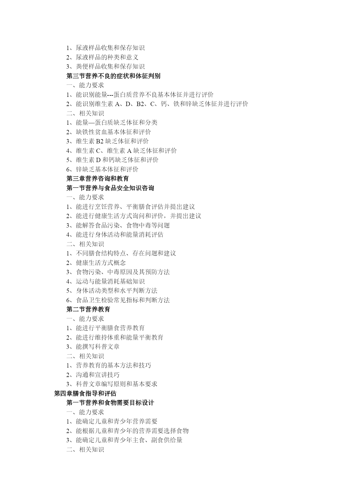 公共营养师考试大纲三级技能第一章膳食调查和评价第一节食物摄入量调查一、能力要求1、能设计回顾法和记账法食物量登记表2、能用记账法进行人群食物消耗量调查3、能用24小时回顾法进行食物摄入量调查4、能进行标准人系数和人日数换算HYPERLINK"http://bbs.examda.com/"考试大论坛5、能用记账法资料计算食物和营养素摄入量6、能用回顾法资料计算食物和营养素摄入量二、相关知识1、回顾法和记账法表格设计要点以及记账法的使用范围及优缺点2、食物消耗量记录要点采集者退散3、回顾法基本要求和技术要点4、记账法基本要求和技术要点第二节膳食调查结果的计算与评价一、能力要求1、能评价和分析膳食能量2、能分析和评价膳食营养素摄入量3、能进行膳食模式的分析评价和报告4、能建立膳食调查数据库二、相关知识1、人日数换算要点2、进餐人数登记要点和标准人系数计算3、食物实际消耗量计算来源:HYPERLINK"http://www.examda.com/"www.examda.com4、能量和营养素摄入量、来源分布计算要点5、数据库相关知识第二章人体营养状况测定和评价第一节人体体格测量一、能力要求1、能测量婴幼儿身长、胸围、上臂围和坐高2、能使用皮褶计测量肱二头肌、肱三头肌、皮褶厚度二、相关知识1、体格测量方法和意义2、体格测量的标准化3、卧式量板、量床使用方法HYPERLINK"http://www.examda.com/"www.Examda.CoM考试就到考试大4、皮褶计使用方法5、肱二头肌、肱三头肌解剖定位知识第二节实验室指标收集和判断一、能力要求1、能对尿液样品进行收集、保存2、能对粪便样品进行收集、保存和处理二、相关知识1、尿液样品收集和保存知识2、尿液样品的种类和意义3、粪便样品收集和保存知识第三节营养不良的症状和体征判别一、能力要求采集者退散1、能识别能量---蛋白质营养不良基本体征并进行评价2、能识别维生素A、D、B2、C、钙、铁和锌缺乏体征并进行评价二、相关知识1、能量—蛋白质缺乏体征和分类2、缺铁性贫血基本体征和评价3、维生素B2缺乏体征和评价4、维生素C、维生素A缺乏体征和评价5、维生素D和钙缺乏体征和评价6、锌缺乏基本体征和评价第三章营养咨询和教育第一节营养与食品安全知识咨询一、能力要求1、能进行烹饪营养、平衡膳食评估并提出建议2、能进行健康生活方式询问和评价,并提出建议3、能解答食品污染、食物中毒等问题4、能进行身体活动和能量消耗评估二、相关知识1、不同膳食结构特点、存在问题和建议2、健康生活方式概念3、食物污染、中毒原因及其预防方法4、运动与能量消耗基础知识来源:HYPERLINK"http://www.examda.com/"www.examda.com5、身体活动类型和水平判断方法6、食品卫生检验常见指标和判断方法第二节营养教育一、能力要求1、能进行平衡膳食营养教育2、能进行维持体重和能量平衡教育3、能撰写科普文章二、相关知识1、营养教育的基本方法和技巧2、沟通和宣讲技巧3、科普文章编写原则和基本要求第四章膳食指导和评估第一节营养和食物需要目标设计一、能力要求1、能确定儿童和青少年营养需要2、能根据儿童和青少年的营养需要选择食物3、能确定儿童和青少年主食、副食供给量二、相关知识1、不同性别、年龄的儿童和青少年的营养需要2、年龄组分类知识3、儿童和青少年食物选择原则和特点第二节食谱编制一、能力要求1、能编制儿童和青少年食谱2、能编制幼儿园食谱二、相关知识1、学校营养餐营养要求考试大-全国最大教育类网站(www.Examda。com)2、儿童和青少年配餐原则和方法3、幼儿园食谱编制原则第三节食谱营养评价和调整一、能力要求1、能对成人、青少年和儿童的食谱进行营养评价2、能根据营养评价结果调整食物品种和数量二、相关知识1、食谱营养成分计算和评价原则2、食品种类和蛋白质互补评价知识3、能量营养素比例相关知识4、营养素损失因子相关知识第五章食品营养评价第一节食品营养标签的制作一、能力要求HYPERLINK"http://www.examda.com/"www.Examda.CoM考试就到考试大1、能根据终产品营养特点,制定成分分析计划2、能根据分析数据制作营养标签3、能撰写产品标签说明书二、相关知识1、产品相关配方,标准要求和营养特点2、营养成分定义和计算3、数据修约4、营养声称基本知识5、标签说明书格式和相关规定第二节食品营养价值分析一、能力要求1、能计算食品营养质量指数2、能进行食品蛋白质营养评价3、能进行食品碳水化合物营养评价4、能进行食品脂肪营养评价二、相关知识1、食品营养质量指数计算方法和要点来源:考试大2、蛋白质营养评价方法和必需氨基酸相关知识3、碳水化合物和食物血糖生成指数