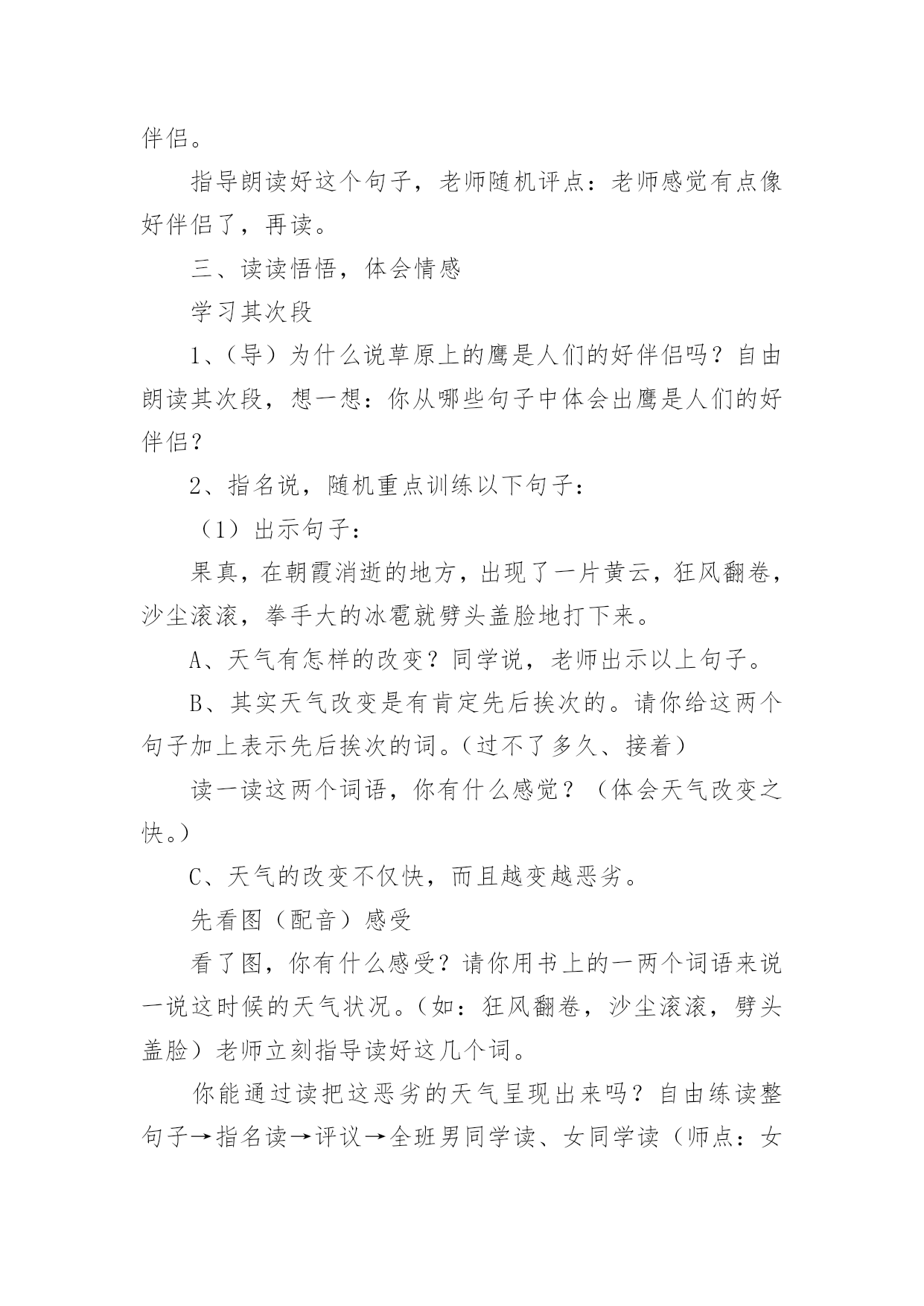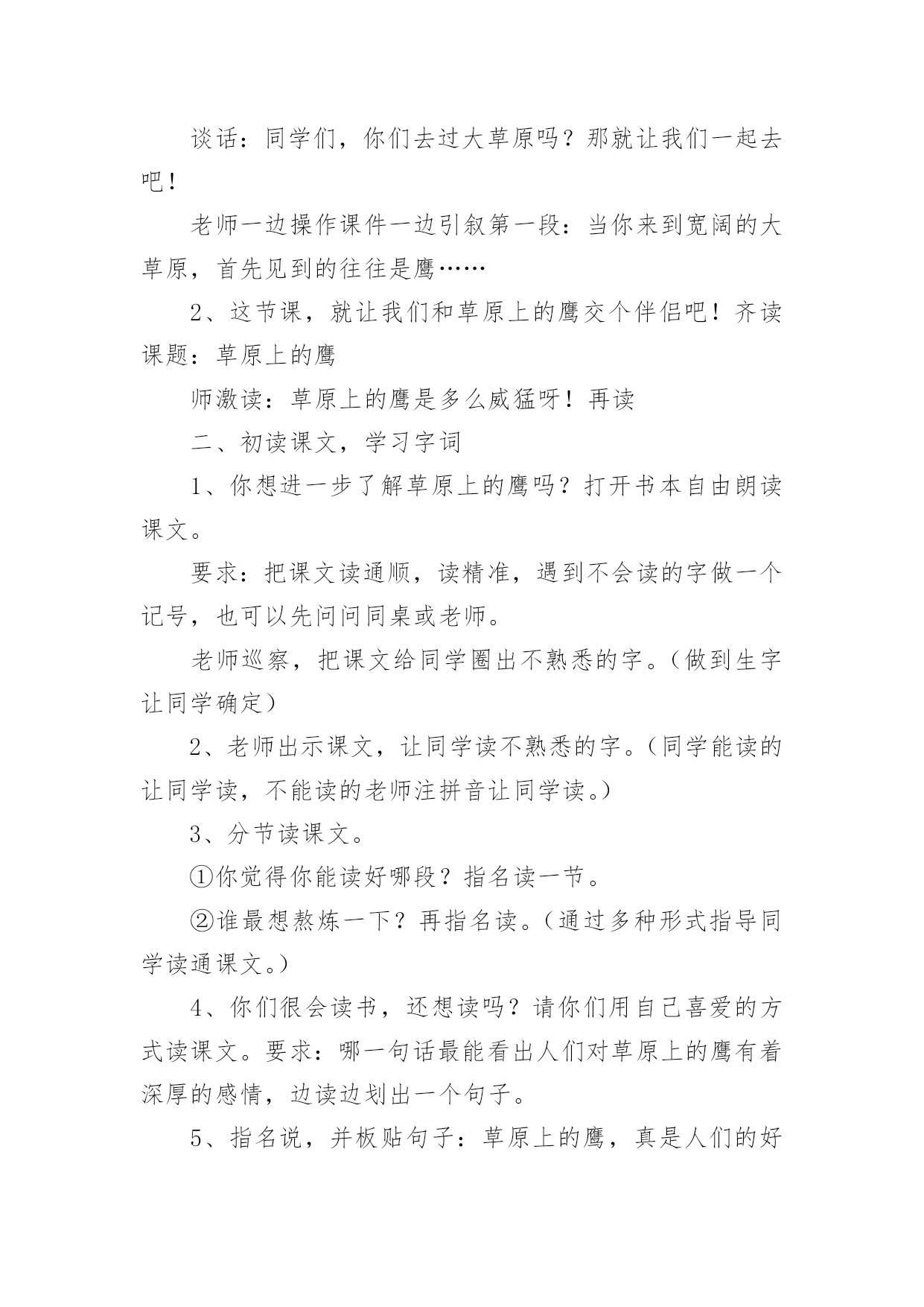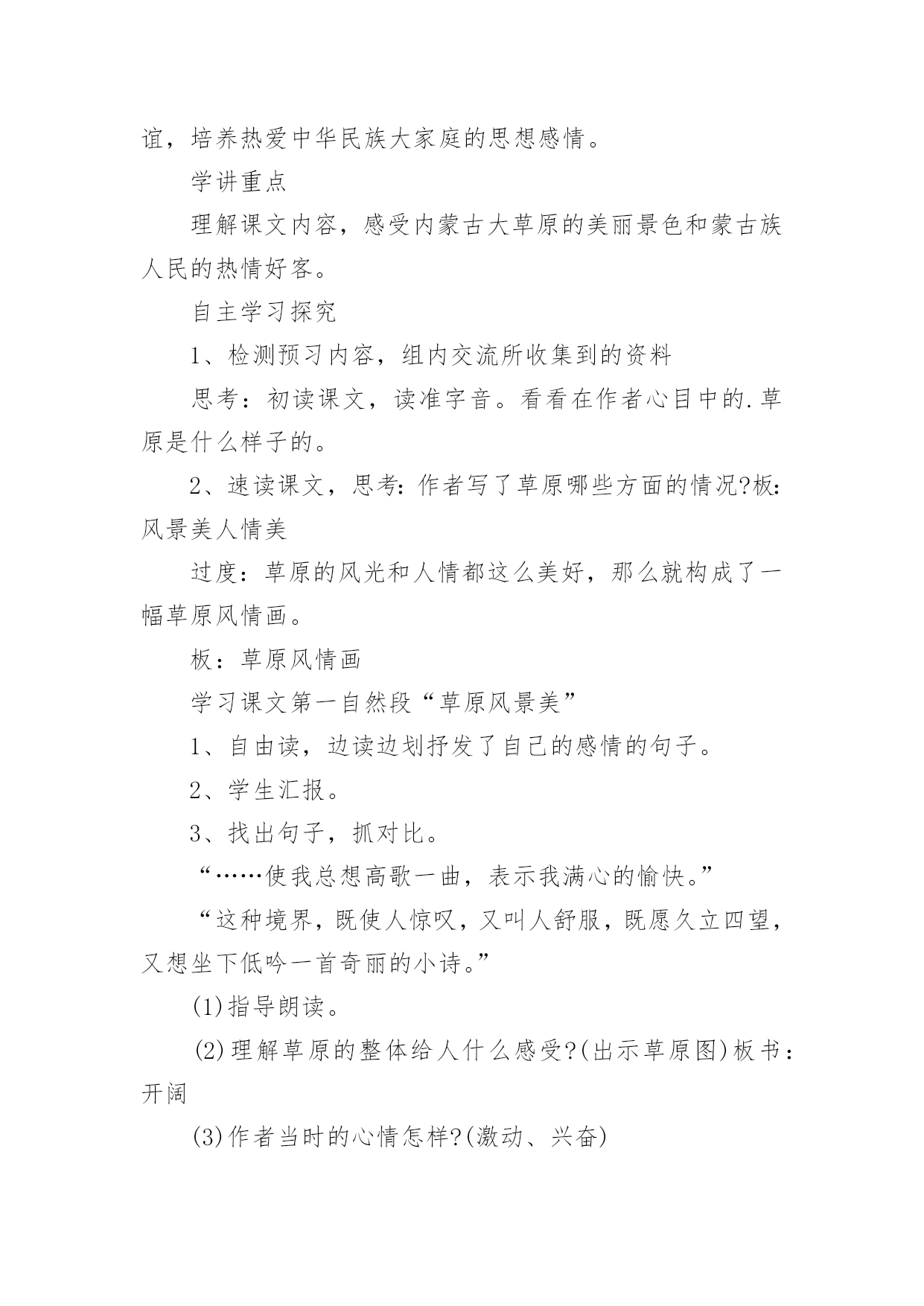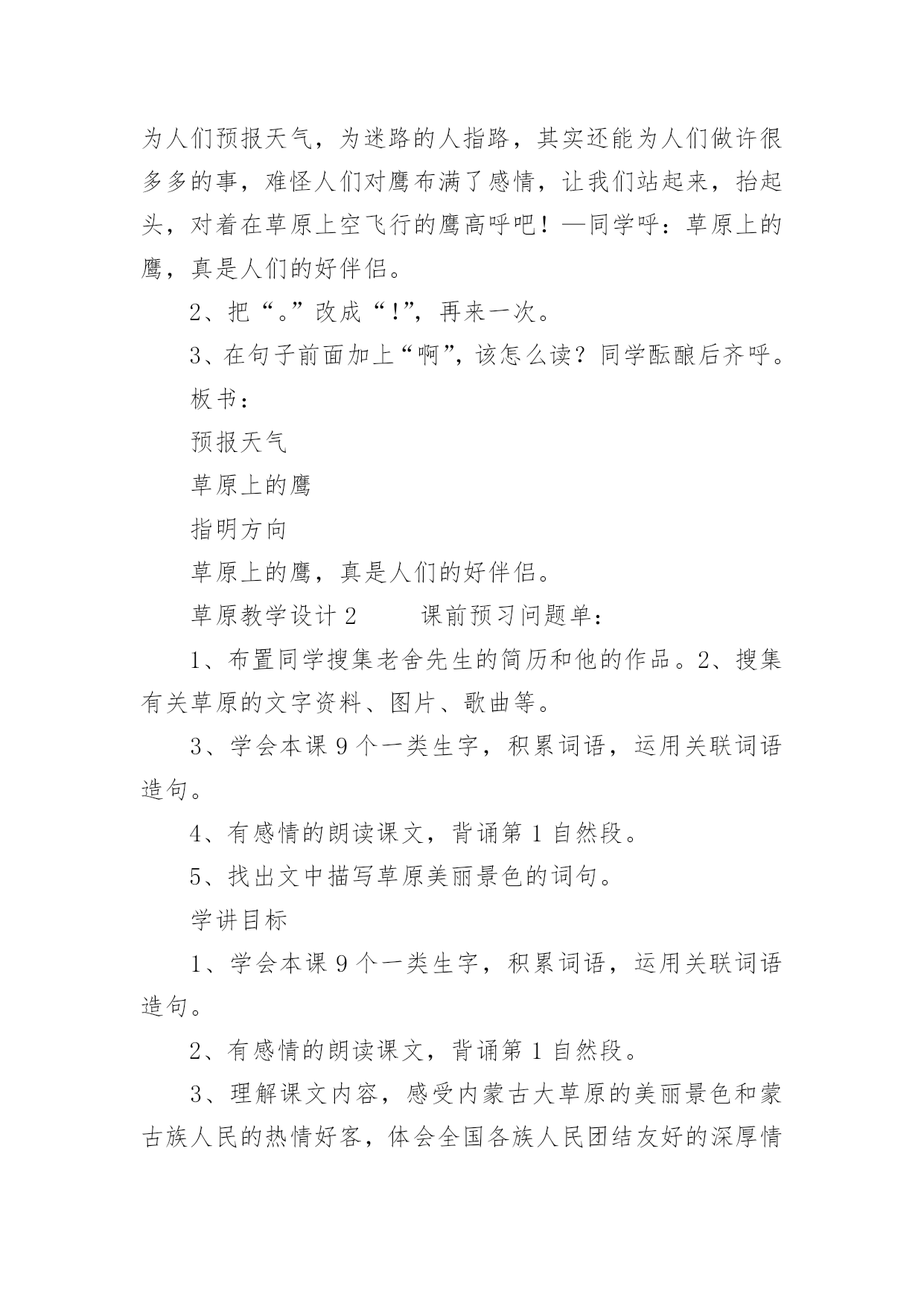 草原教学设计草原教学设计(20篇)作为一位优秀的人民教师,可能需要进行教学设计编写工作,教学设计是把教学原理转化为教学材料和教学活动的计划。我们应该怎么写教学设计呢?以下是小编帮大家整理的草原教学设计,欢迎大家分享。草原教学设计1(一)教学目标:1、读通课文,会读“旋、逝、尘、拳、雹、劈、卷、辽、阔、眺、潭”等生字,理解“狂风翻卷、沙尘滚滚、劈头盖脸”等词语。2、理解2、3两段,知道草原上的鹰能为人们做些什么事。3、体会草原上的鹰是人们的好伴侣。(二)教学重难点:知道草原上的鹰能为人们报告天气、指明方向,从而体会鹰是人们的好伴侣。(三)教法学法:多媒体帮助教学、读读悟悟、自主学习(四)课前预备:课件、课文重点句板贴卡片(五)教学过程:一、看图说话,提示课题1、播放课件:大草原和鹰,配上音乐《牧民新歌》。谈话:同学们,你们去过大草原吗?那就让我们一起去吧!老师一边操作课件一边引叙第一段:当你来到宽阔的大草原,首先见到的往往是鹰……2、这节课,就让我们和草原上的鹰交个伴侣吧!齐读课题:草原上的鹰师激读:草原上的鹰是多么威猛呀!再读二、初读课文,学习字词1、你想进一步了解草原上的鹰吗?打开书本自由朗读课文。要求:把课文读通顺,读精准,遇到不会读的字做一个记号,也可以先问问同桌或老师。老师巡察,把课文给同学圈出不熟悉的字。(做到生字让同学确定)2、老师出示课文,让同学读不熟悉的字。(同学能读的让同学读,不能读的老师注拼音让同学读。)3、分节读课文。①你觉得你能读好哪段?指名读一节。②谁最想熬炼一下?再指名读。(通过多种形式指导同学读通课文。)4、你们很会读书,还想读吗?请你们用自己喜爱的方式读课文。要求:哪一句话最能看出人们对草原上的鹰有着深厚的感情,边读边划出一个句子。5、指名说,并板贴句子:草原上的鹰,真是人们的好伴侣。指导朗读好这个句子,老师随机评点:老师感觉有点像好伴侣了,再读。三、读读悟悟,体会情感学习其次段1、(导)为什么说草原上的鹰是人们的好伴侣吗?自由朗读其次段,想一想:你从哪些句子中体会出鹰是人们的好伴侣?2、指名说,随机重点训练以下句子:(1)出示句子:果真,在朝霞消逝的地方,出现了一片黄云,狂风翻卷,沙尘滚滚,拳手大的冰雹就劈头盖脸地打下来。A、天气有怎样的改变?同学说,老师出示以上句子。B、其实天气改变是有肯定先后挨次的。请你给这两个句子加上表示先后挨次的词。(过不了多久、接着)读一读这两个词语,你有什么感觉?(体会天气改变之快。)C、天气的改变不仅快,而且越变越恶劣。先看图(配音)感受看了图,你有什么感受?请你用书上的一两个词语来说一说这时候的天气状况。(如:狂风翻卷,沙尘滚滚,劈头盖脸)老师立刻指导读好这几个词。你能通过读把这恶劣的天气呈现出来吗?自由练读整句子→指名读→评议→全班男同学读、女同学读(师点:女同学要是能通过朗读,把这恶劣的天气呈现出来,那真的很了不得)→齐读。D、第一次、引读重点句:鹰为人们预报了这么恶劣的天气,可以让人们早做预备,怪不得草原上的人们见到在草原上空飞行的鹰会说—同学齐读句子:草原上的鹰,真是人们的好伴侣。(2)你还从哪里体会出鹰是人们的好伴侣?指名说,再师生共同学习句子。A、先看图,老师、:瞧,月亮高高地挂在空中,清风阵阵地吹着,多漂亮的草原夜色,多安静的草原之夜呀!同学齐读句子:晚上,月亮高高地挂在空中,清风阵阵地吹着,草原上空时常传来鹰的长鸣,这是它在预报,明每天气肯定晴朗。(要是同学读不出来,老师再点拨:要是能再轻一点,老师会感觉草原之夜更安静更美)。B、指导朗读全段:男女同学分读“早晨”“晚上”两部分,特殊要留意读好这两种不同的意境。3、小结:草原上的鹰能为人们——引板:预报天气4、其次次、引读重点句:鹰为人们预报天气,给人们的生活带来多大的便利呀,草原上的人们只要一见到在草原上空飞行的鹰就会说:(齐读)草原上的鹰,真是人们的好伴侣。学习第三段1、你还从哪里体会出草原上的鹰是人们的好伴侣呢?2、指名说,并随机板书:指明方向3、这段话写得很美,老师读着读着就把它读成了一首诗,出示:蓝色的天涯闪动着的一些黑点就是鹰朝着鹰飞的方向走你或许能发觉遇到或许能找到(1)老师把最美的'部分留给你们补充!同学填空。(2)读读这首诗的其次节,你体会到了什么?(试图引导体会找到方向时越来越欣喜的感觉。)师生对读这首诗,读出诗的韵味。(3)齐读诗,并给诗加题目(4)第三次、引读重点句:鹰为我们指明白方向,在大草原迷路的我们最终找到了村庄,此时此刻,我们确定会不由自主地,感谢地对鹰说——同学齐读重点句:草原上的鹰,真是人们的好伴侣。四、课堂小结,升华情感1、总结,第四次、引读重点句,达到、:草原上的鹰能为人们预报天气,为迷路的人指路,其实还能为人们做许很多多的事,难怪人们对鹰布满了感情,
